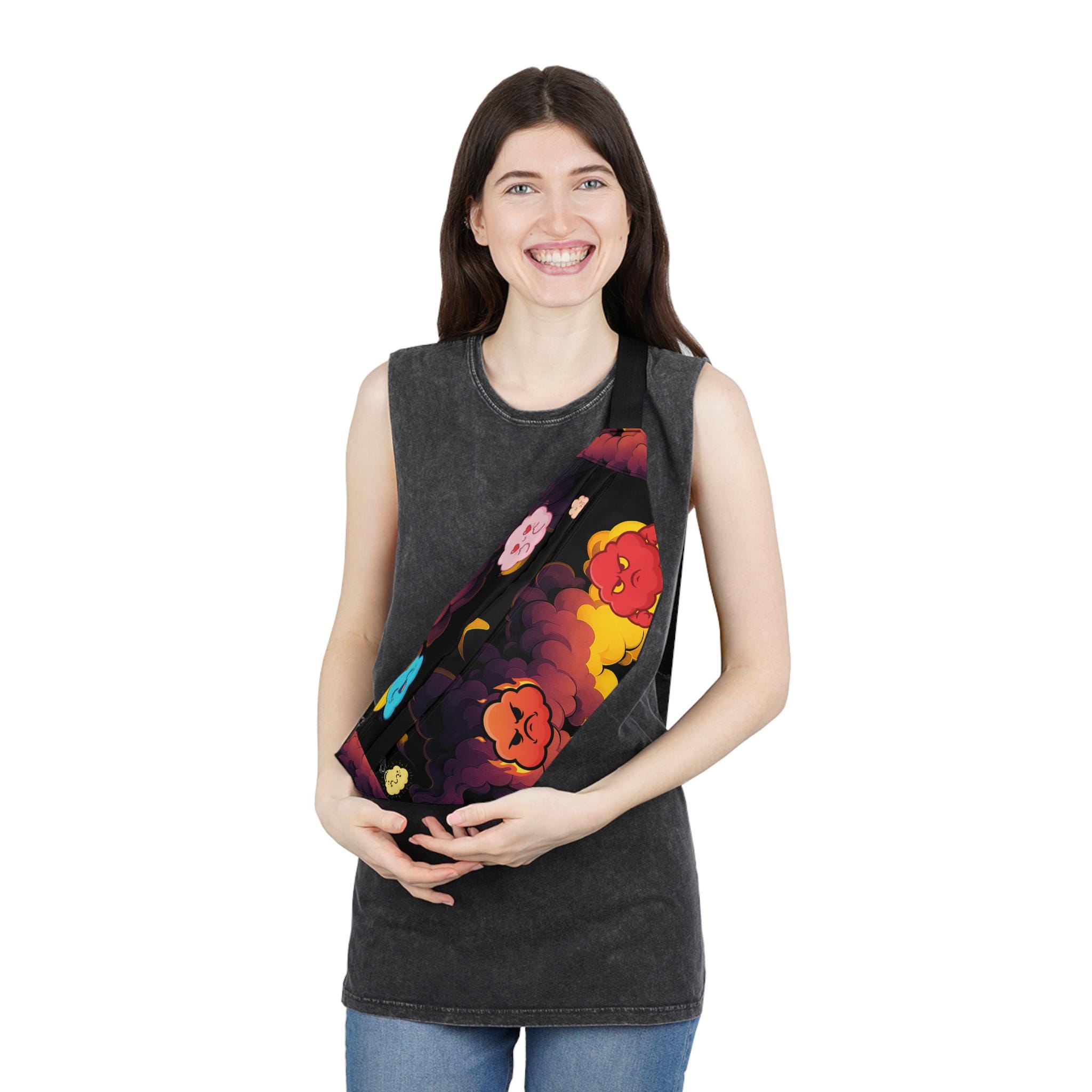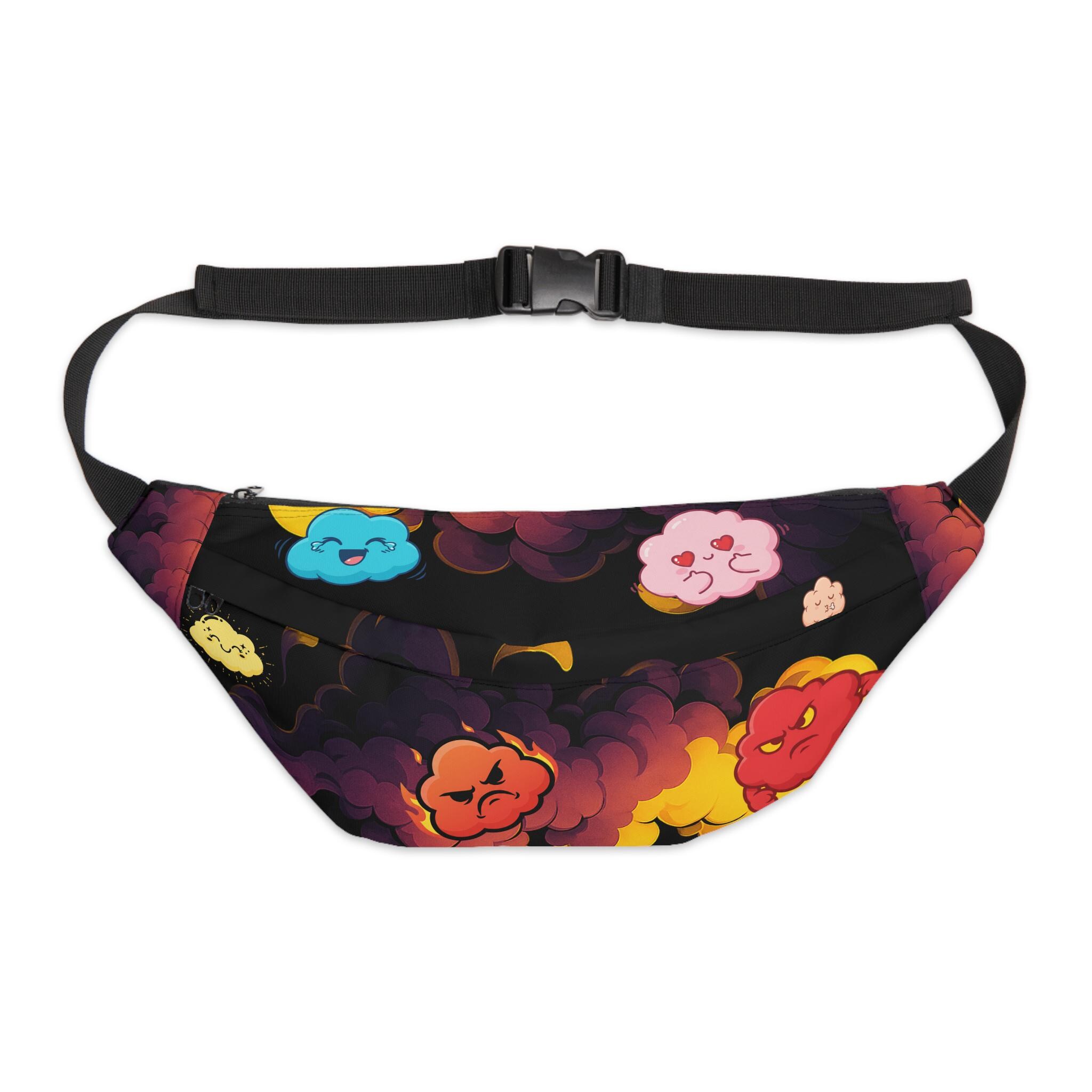 A roomy, colorful waist bag designed to carry your essentials with personality. Made from a fine-weave polyester canvas with a soft foamed lining, this fanny pack sits comfortably at the hip whether you wear it across your chest or around your waist. The vibrant printed exterior brings playful cloud-like characters and warm, sunset tones to life against a deep background. Inside you'll find a large main compartment plus three small interior pockets and two external zip compartments for secure, organized storage. An adjustable belt and durable buckle let you tailor the fit, while black interior lining and automatically matched thread keep the finish neat and durable. This pack blends bold, cheerful design with practical organization for everyday urban adventures.