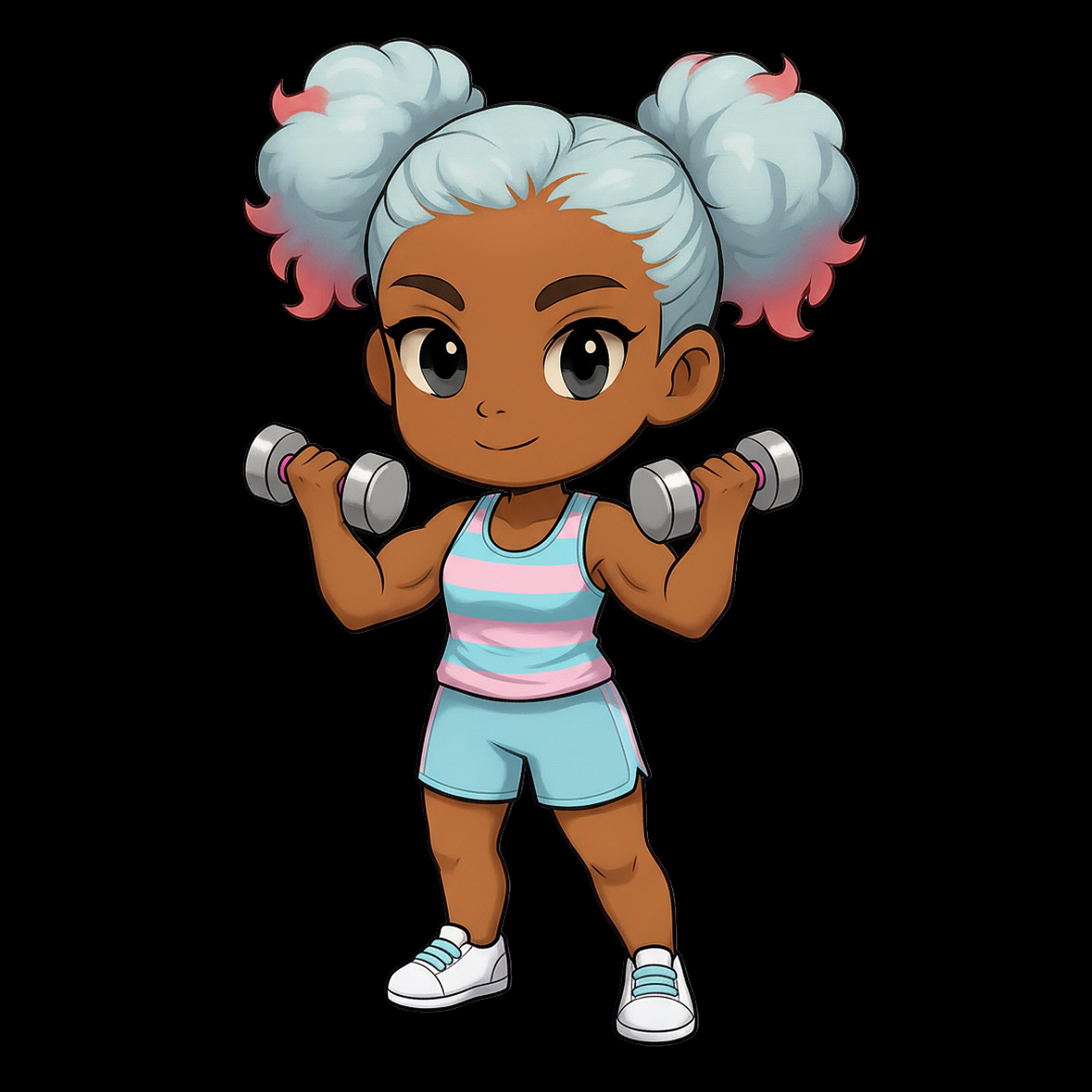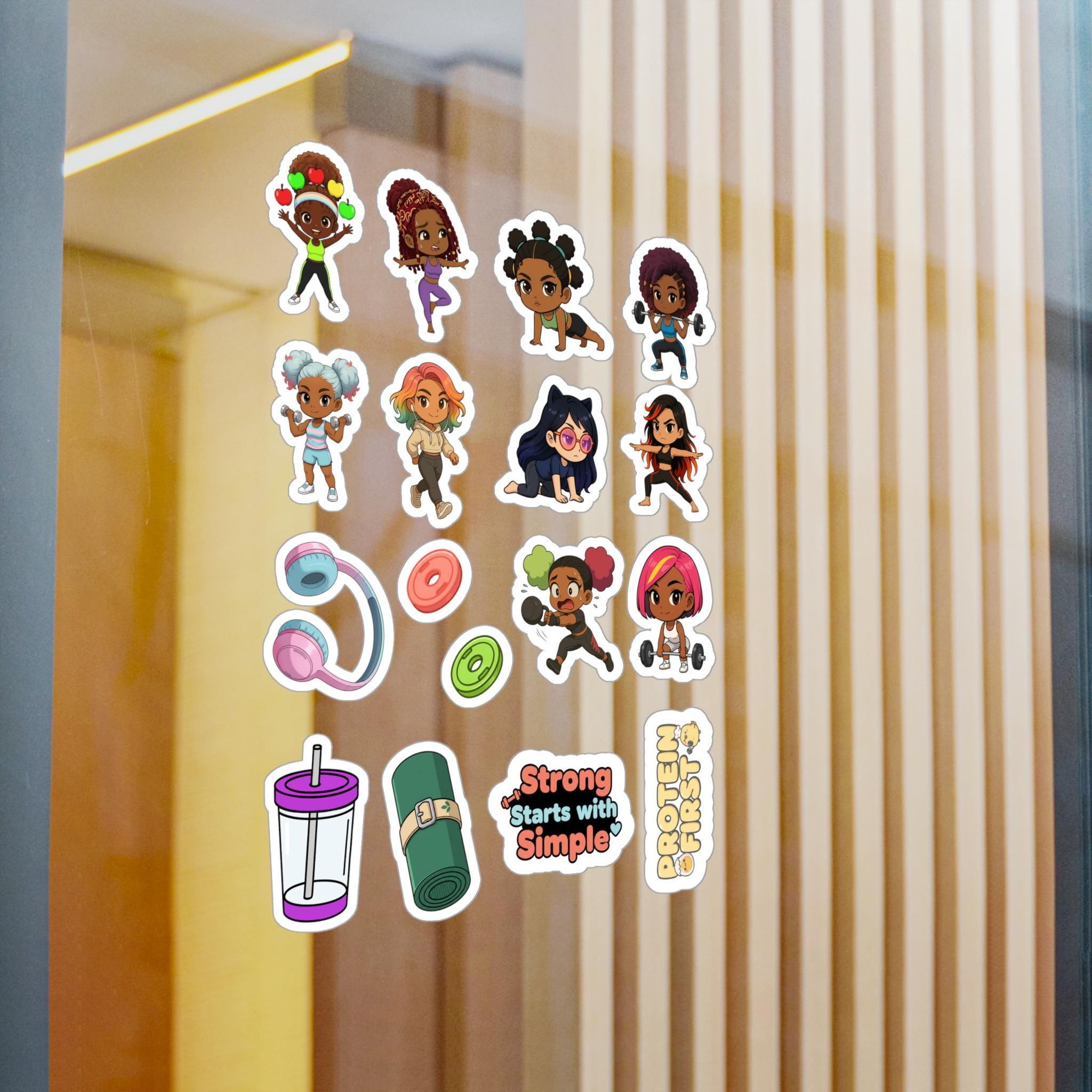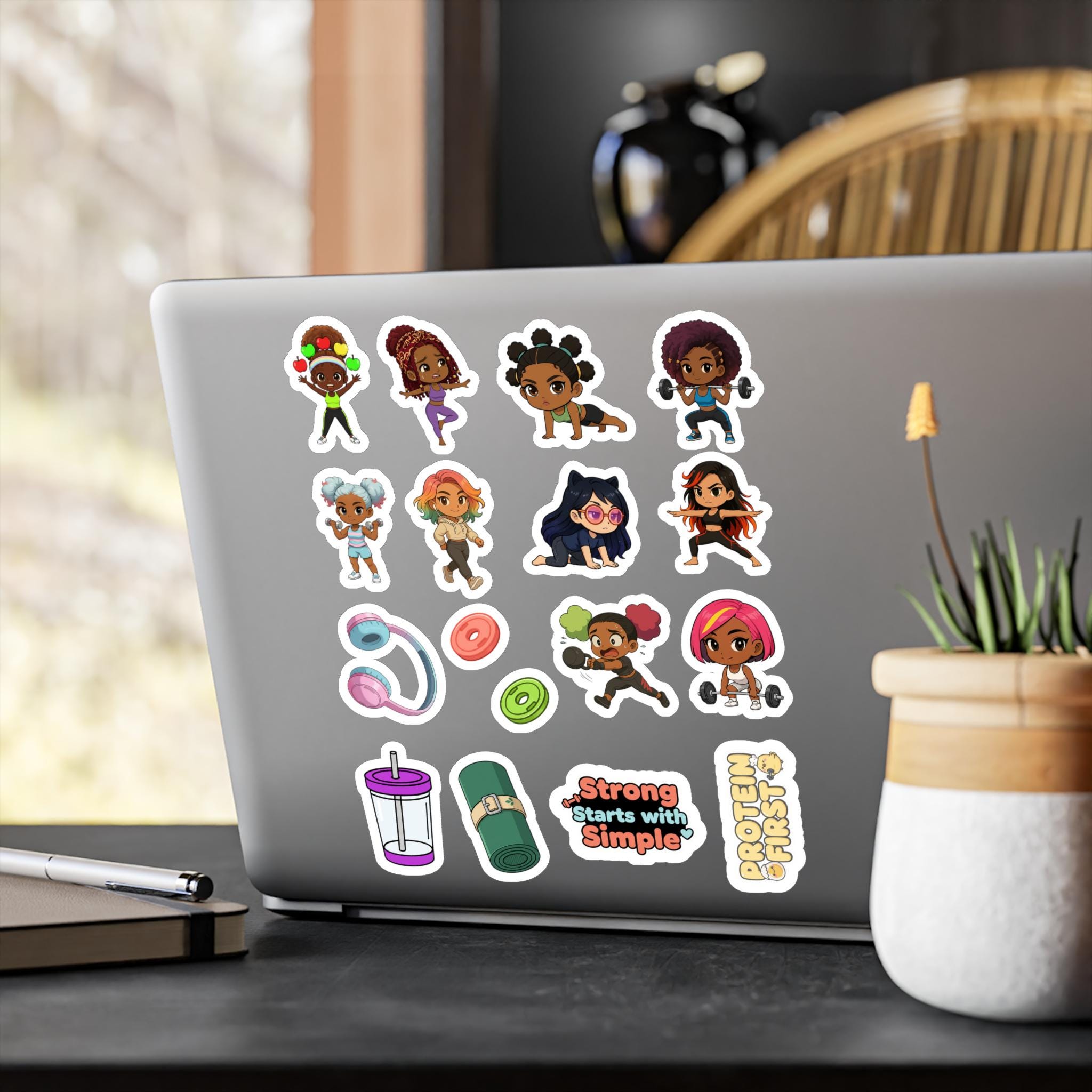 Bright, punchy kiss-cut vinyl decals made to bring personality to water bottles, laptops, planners, and gym gear. These small, satin-finish stickers feature energetic, fitness-themed chibi characters and bold slogan badges that hold up outdoors — water, scratch, and UV resistant for up to three years. Each sticker has a clean 1/8" white kiss-cut border to help the shapes pop against any surface, and the removable adhesive peels away without leaving residue. Whether you place them on a shaker cup, a yoga mat, or a locker, they add a playful, motivated vibe and travel well with your active days.