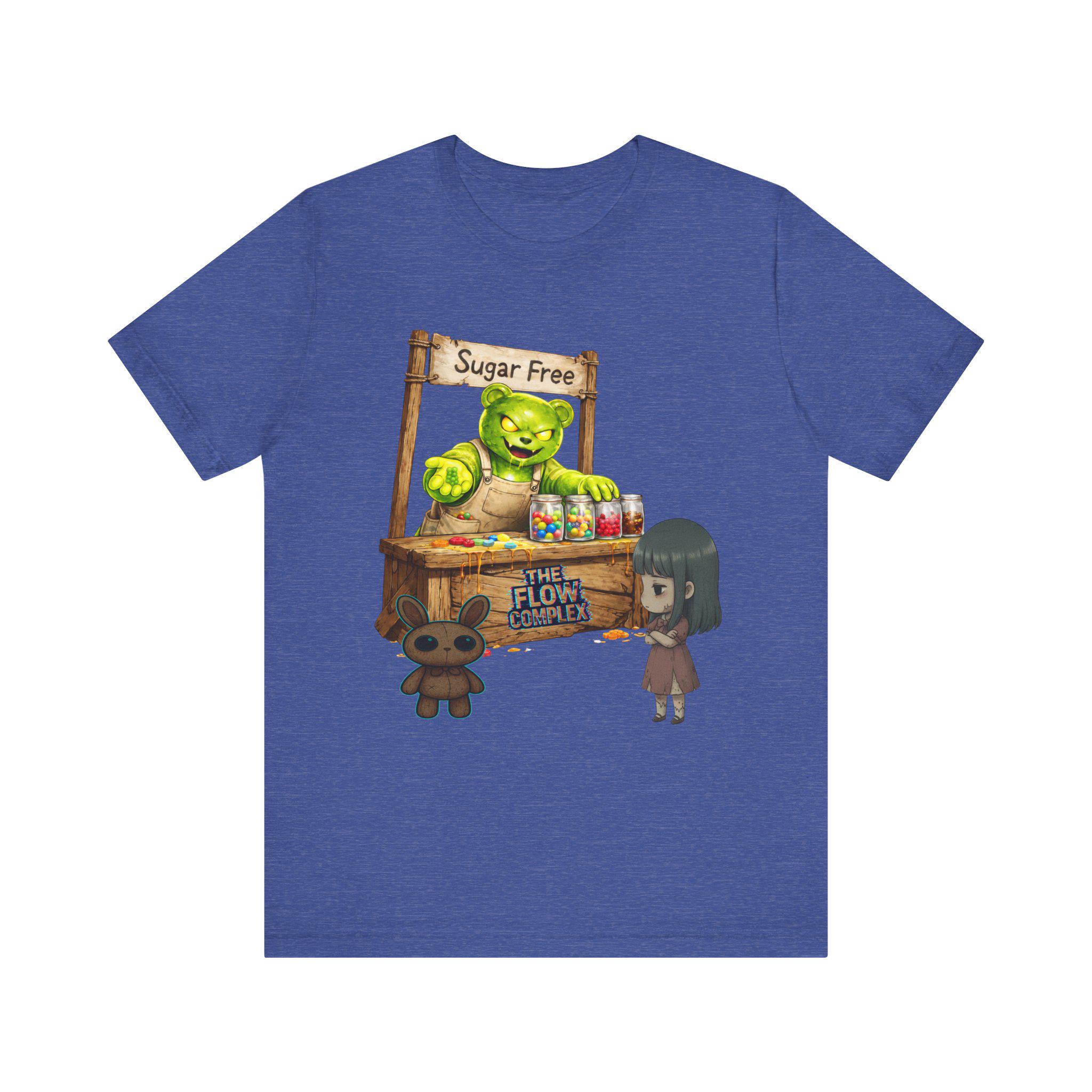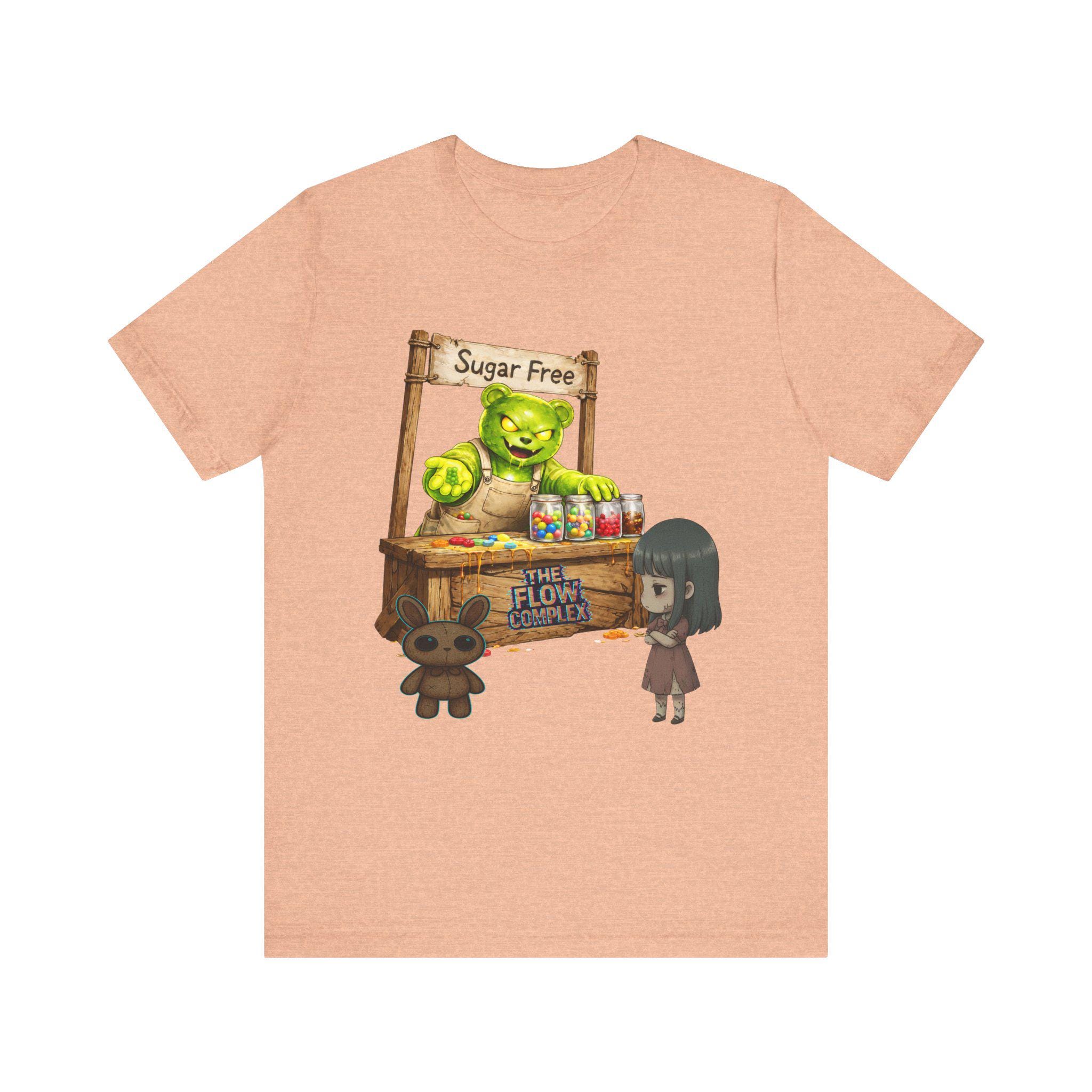 Soft, lightweight tee printed with whimsical, slightly eerie candy-cart characters—candy-selling creatures and a small, curious child—designed for fans of dark-cute and storybook horror aesthetics. The breathable Airlume cotton and retail crew neck make this shirt easy to layer under jackets or wear solo on cool evenings. Imagery sits on both front and back: a green candy vendor and girl vignette on the chest, and larger colorful characters across the back that add playful contrast. Wear it to comic meetups, late-night walks through neon streets, or cozy horror-movie nights—this tee brings a subtle, narrative-driven edge without feeling heavy. Durable stitching, stabilized shoulders, and crisp DTF/DTG printing keep the art bright wash after wash.