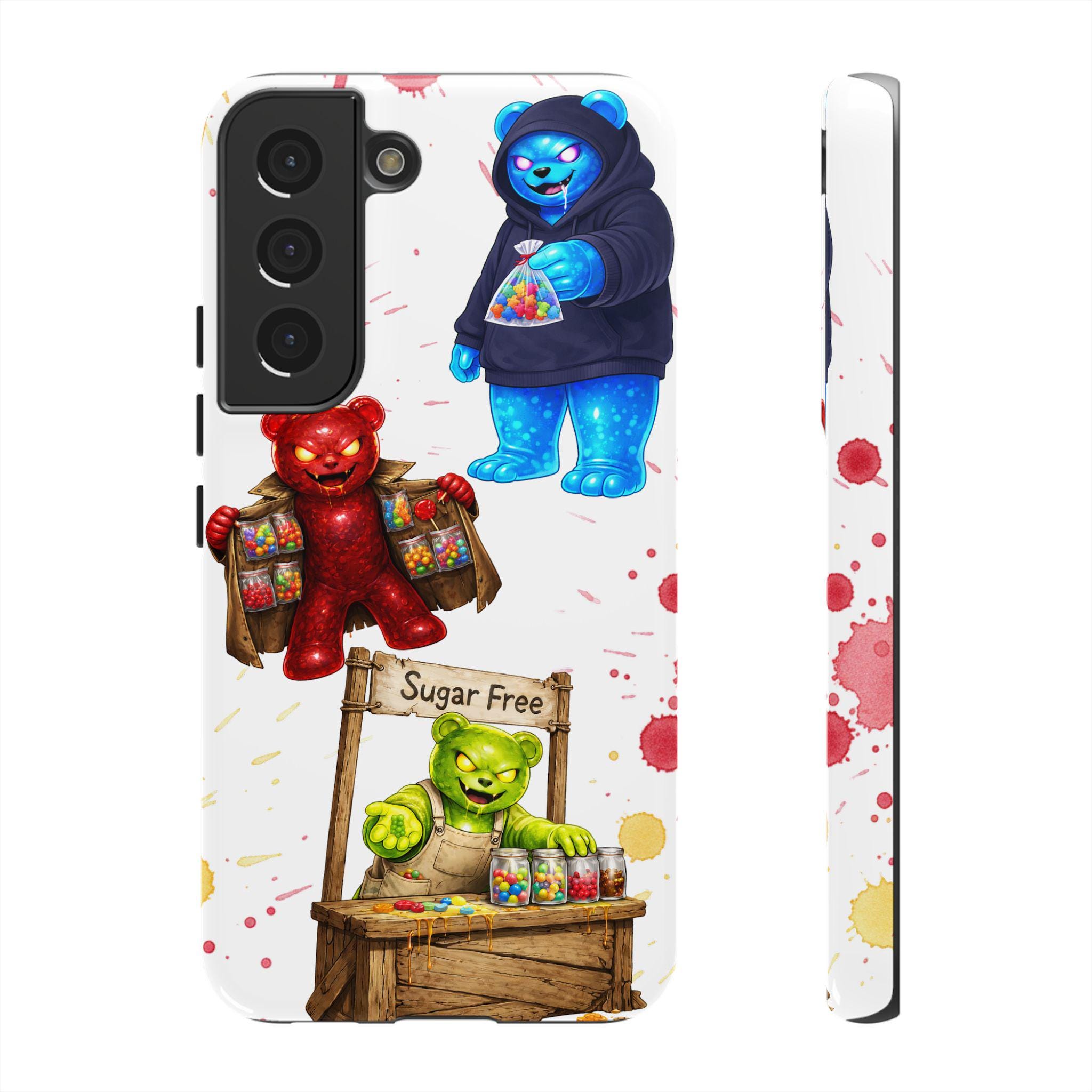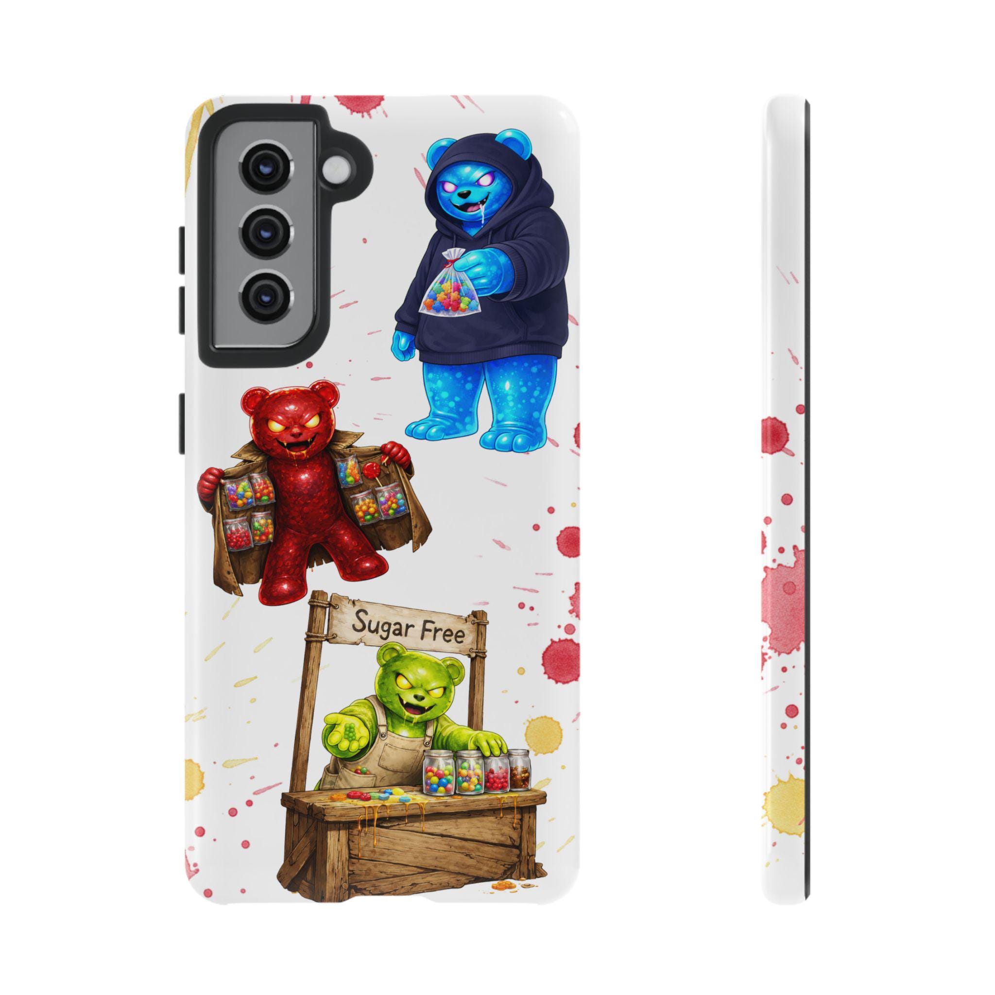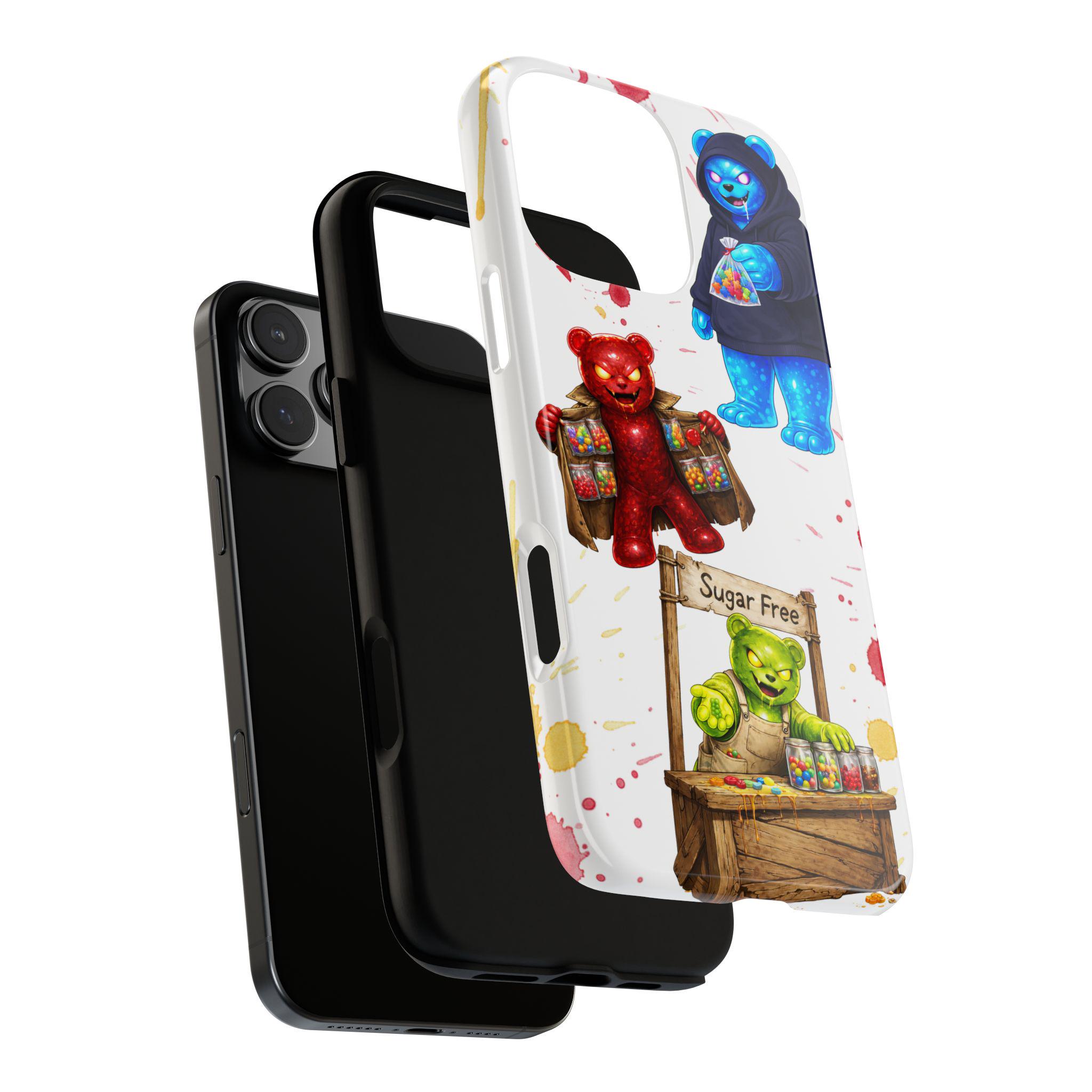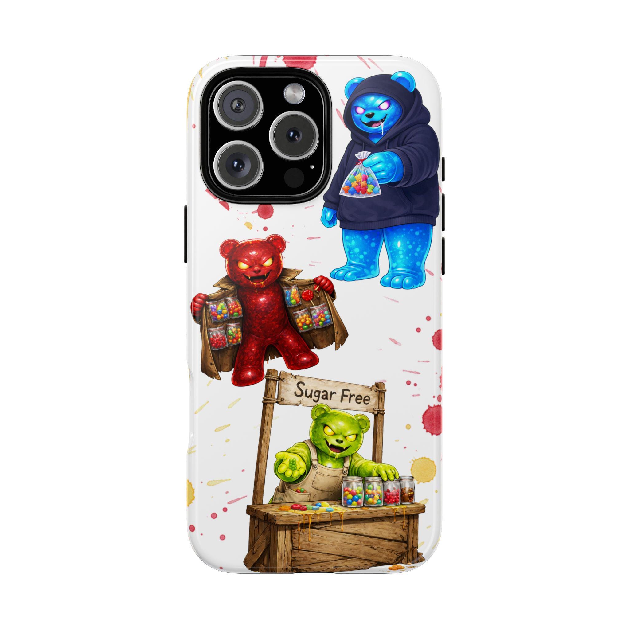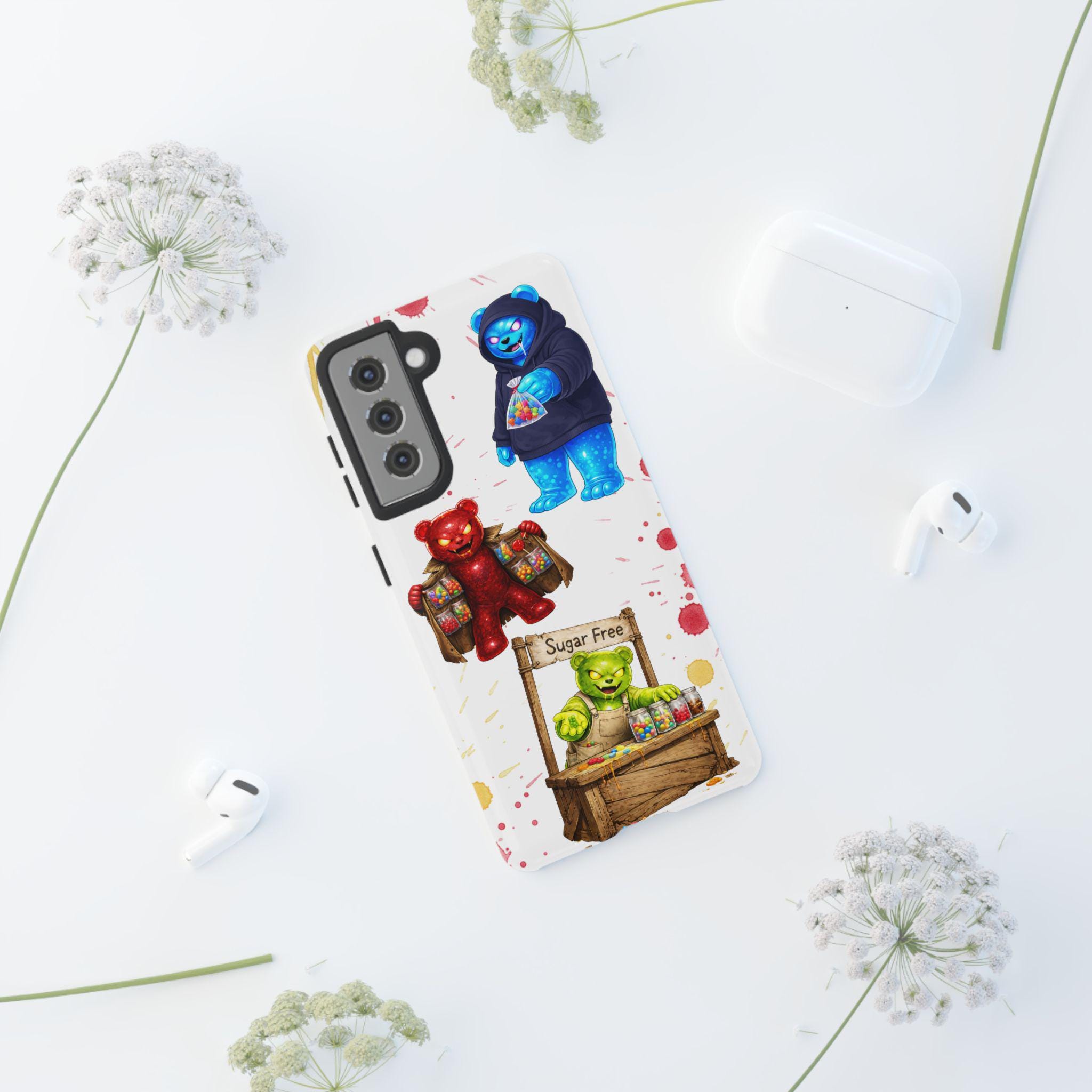 This protective phone case brings playful, hand-painted charm to your everyday carry. Illustrated gummy-bear characters — a cheerful vendor, a candy-slinging bear, and a cozy blue pal in a hoodie — dance across a clean white background splashed with painterly color spots. The dual-layer build cushions shocks while the glossy or matte printed shell keeps the artwork bright. It fits into a routine of quick errands, market mornings, and slow weekend strolls when you want your phone to reflect a bit of whimsy and humor. The slim profile keeps ports open and wireless charging available, so the case stays an easy companion whether you’re grabbing coffee, running to a pop-up, or sharing photos with friends.