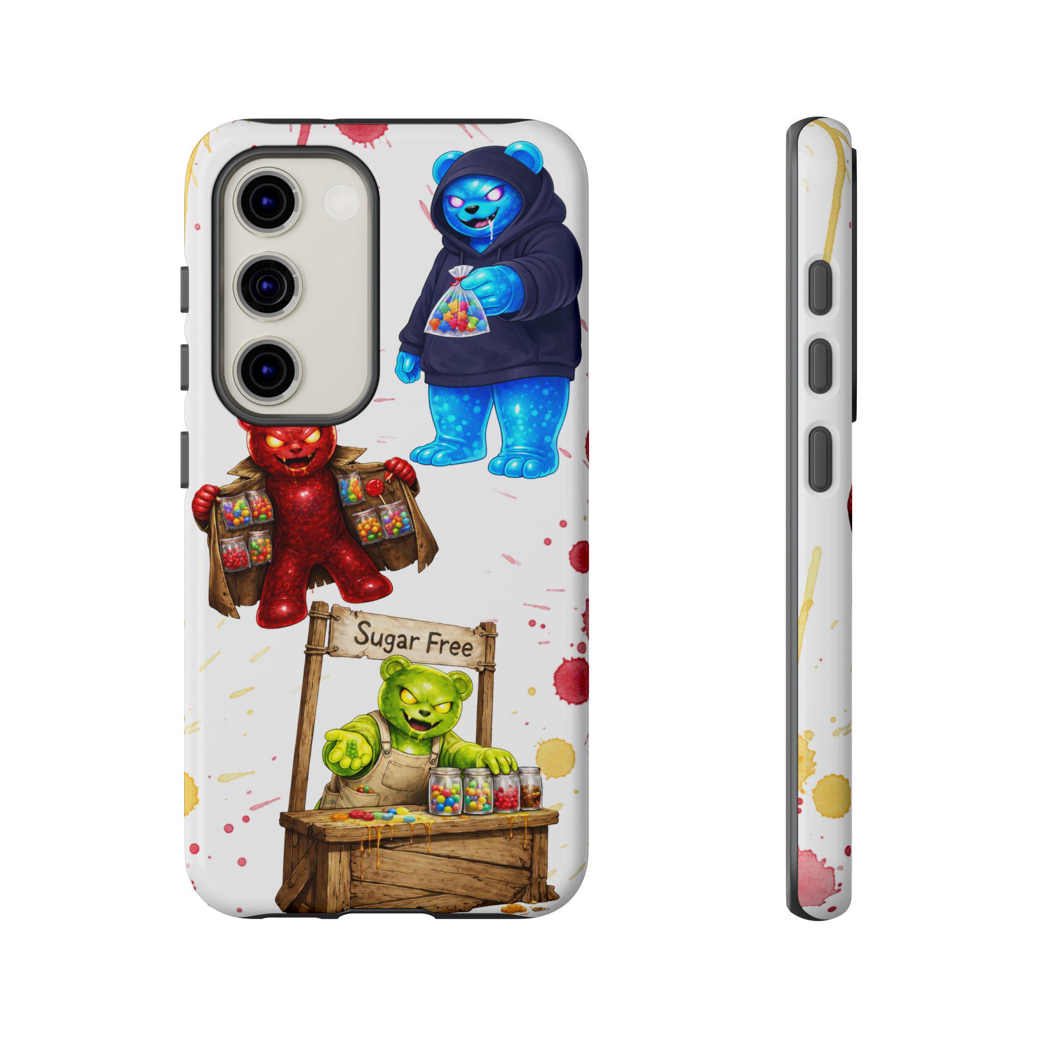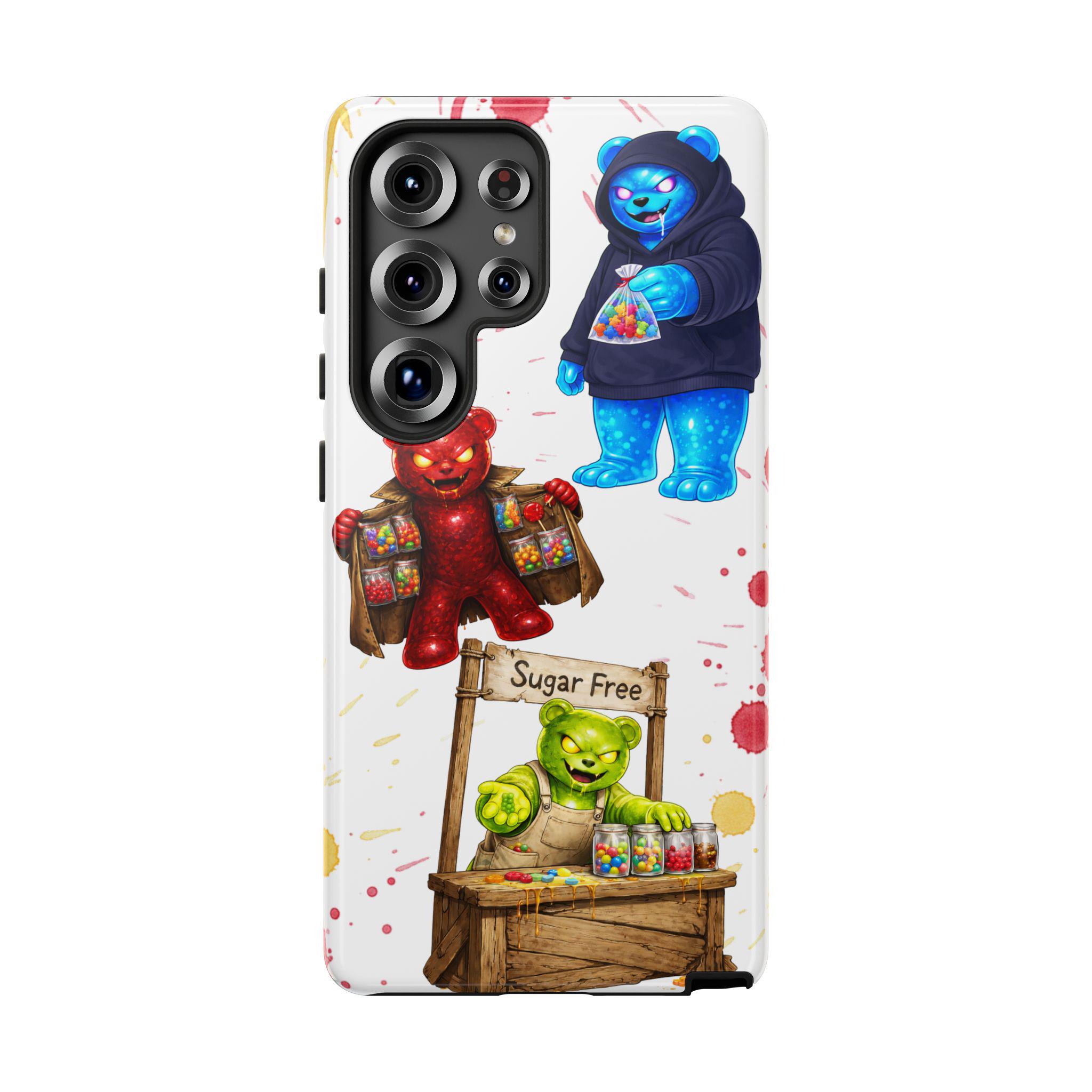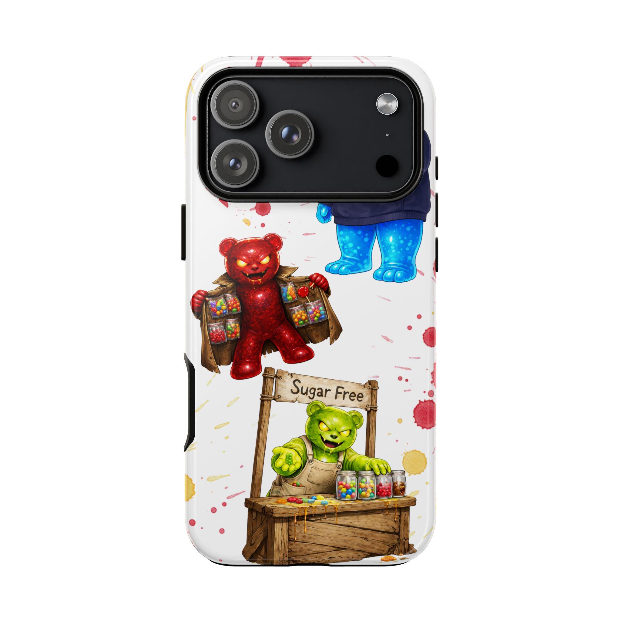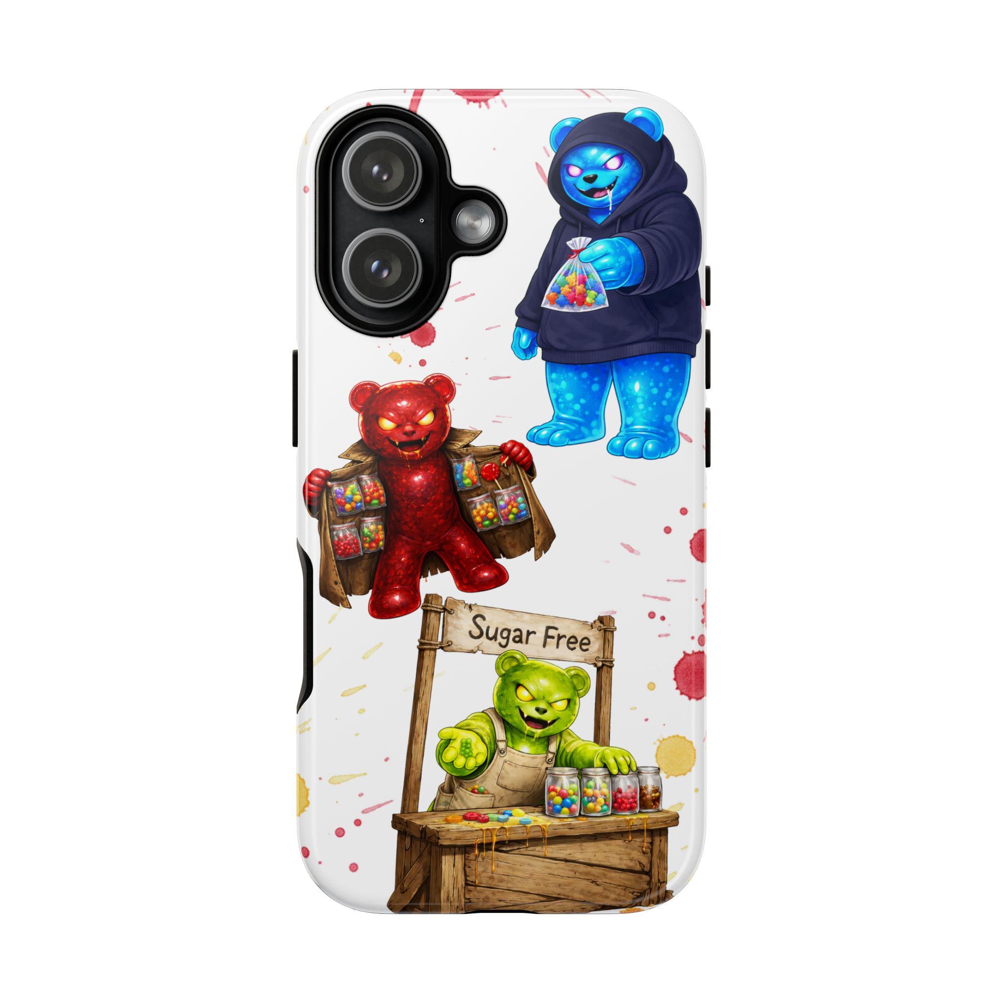 This protective phone case brings playful, hand-painted charm to your everyday carry. Illustrated gummy-bear characters — a cheerful vendor, a candy-slinging bear, and a cozy blue pal in a hoodie — dance across a clean white background splashed with painterly color spots. The dual-layer build cushions shocks while the glossy or matte printed shell keeps the artwork bright. It fits into a routine of quick errands, market mornings, and slow weekend strolls when you want your phone to reflect a bit of whimsy and humor. The slim profile keeps ports open and wireless charging available, so the case stays an easy companion whether you’re grabbing coffee, running to a pop-up, or sharing photos with friends.