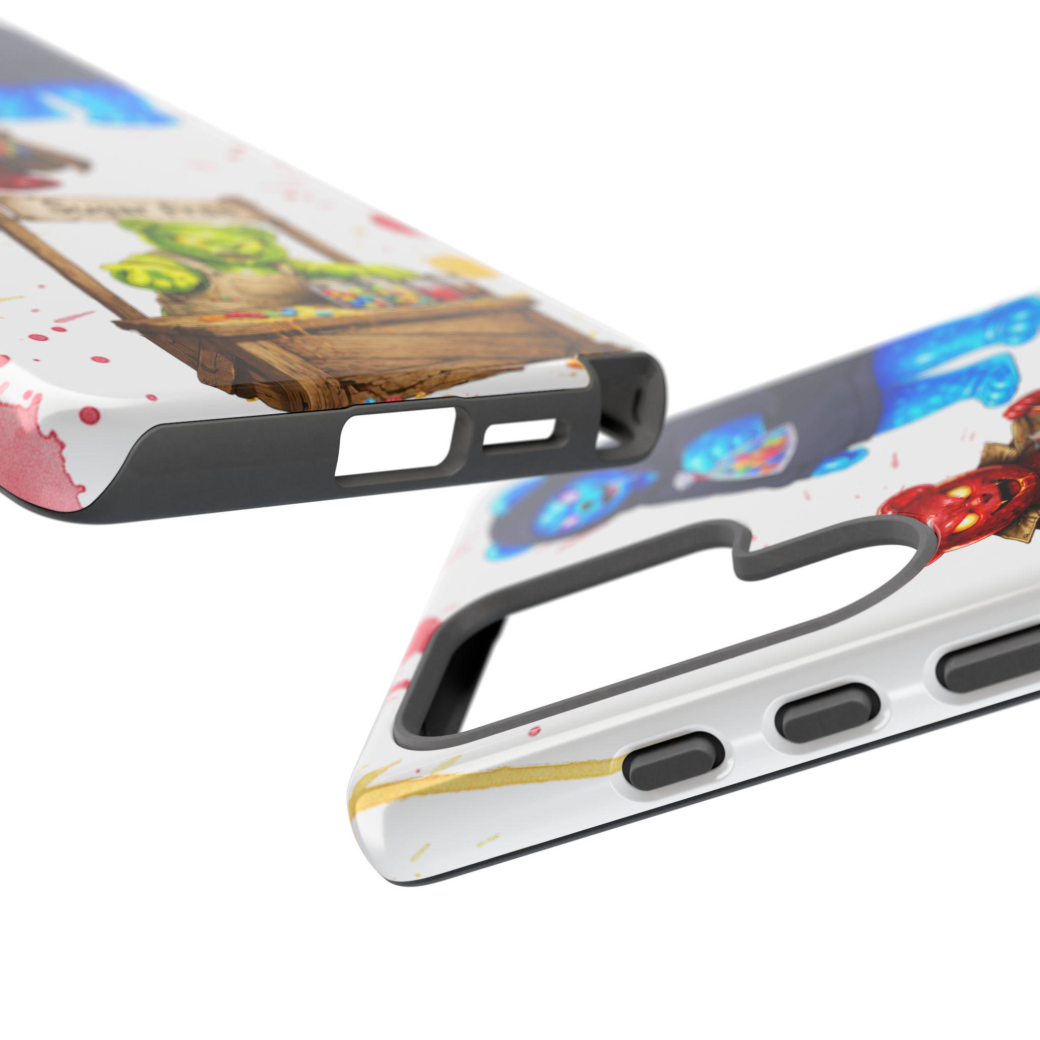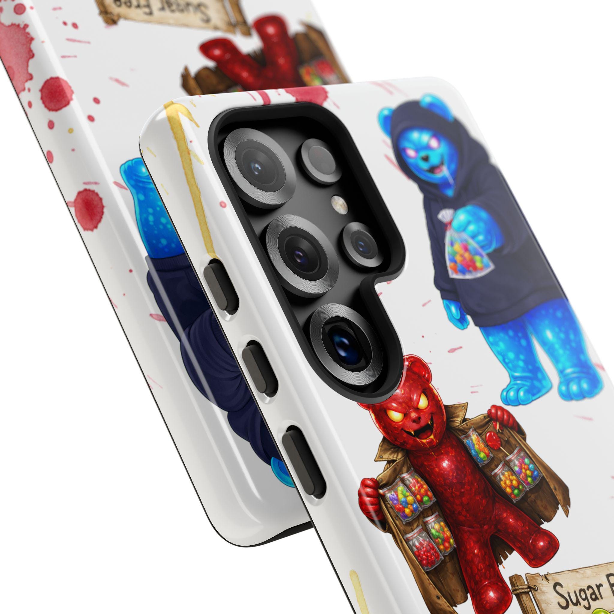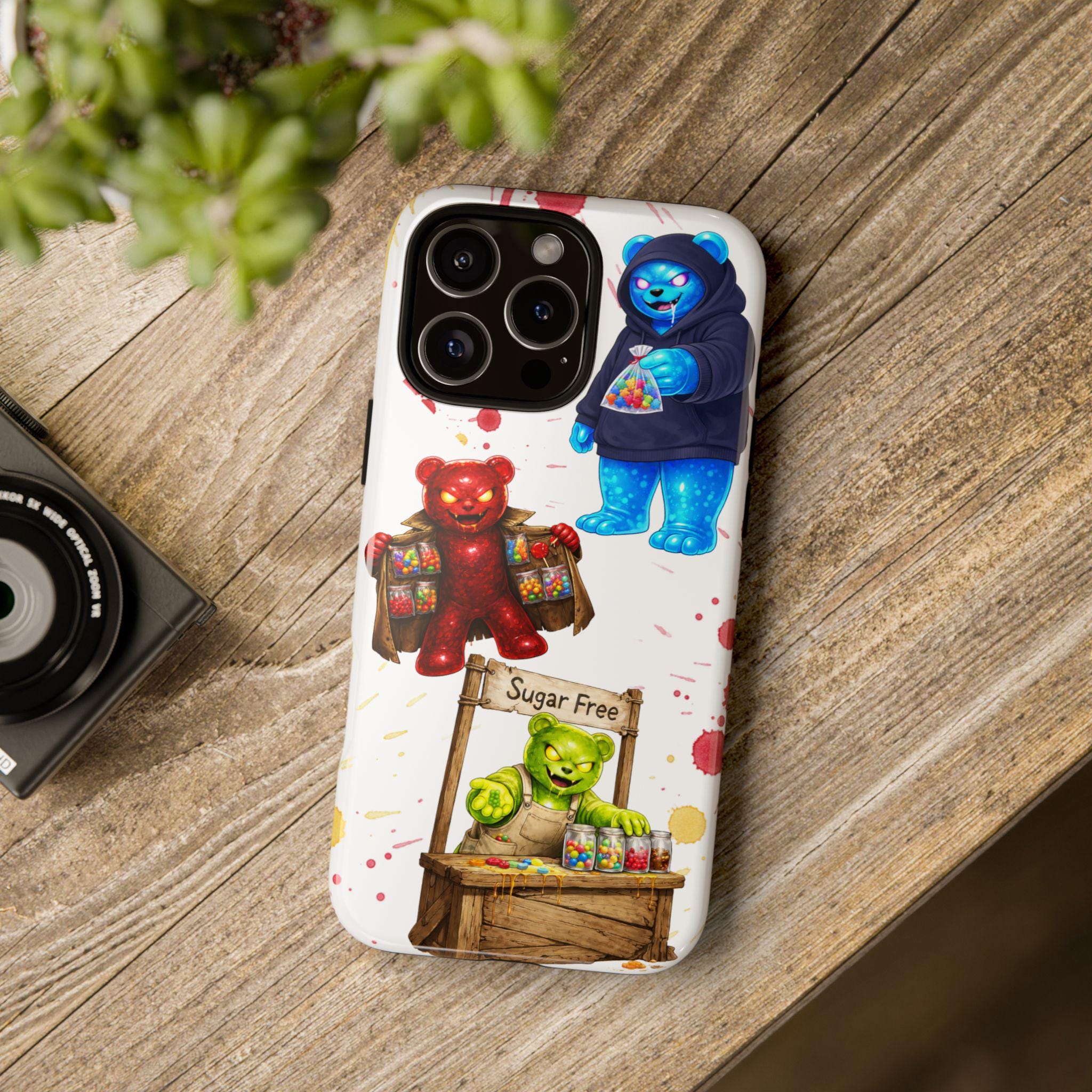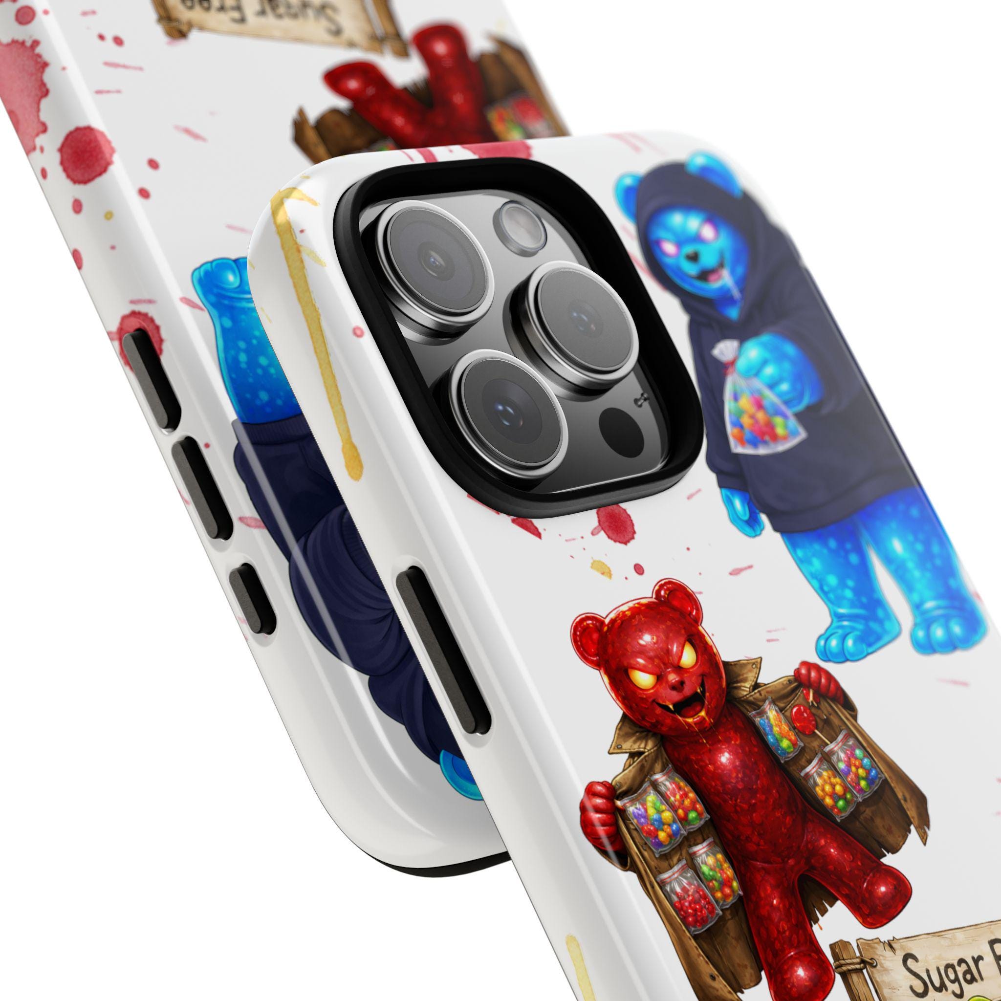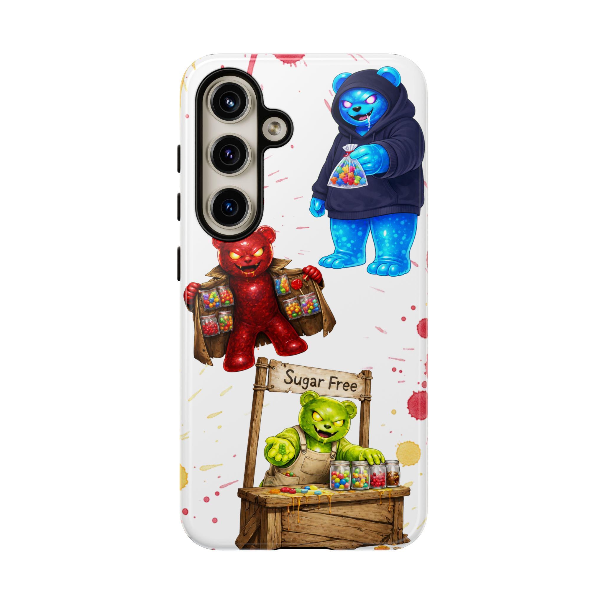 This protective phone case brings playful, hand-painted charm to your everyday carry. Illustrated gummy-bear characters — a cheerful vendor, a candy-slinging bear, and a cozy blue pal in a hoodie — dance across a clean white background splashed with painterly color spots. The dual-layer build cushions shocks while the glossy or matte printed shell keeps the artwork bright. It fits into a routine of quick errands, market mornings, and slow weekend strolls when you want your phone to reflect a bit of whimsy and humor. The slim profile keeps ports open and wireless charging available, so the case stays an easy companion whether you’re grabbing coffee, running to a pop-up, or sharing photos with friends.