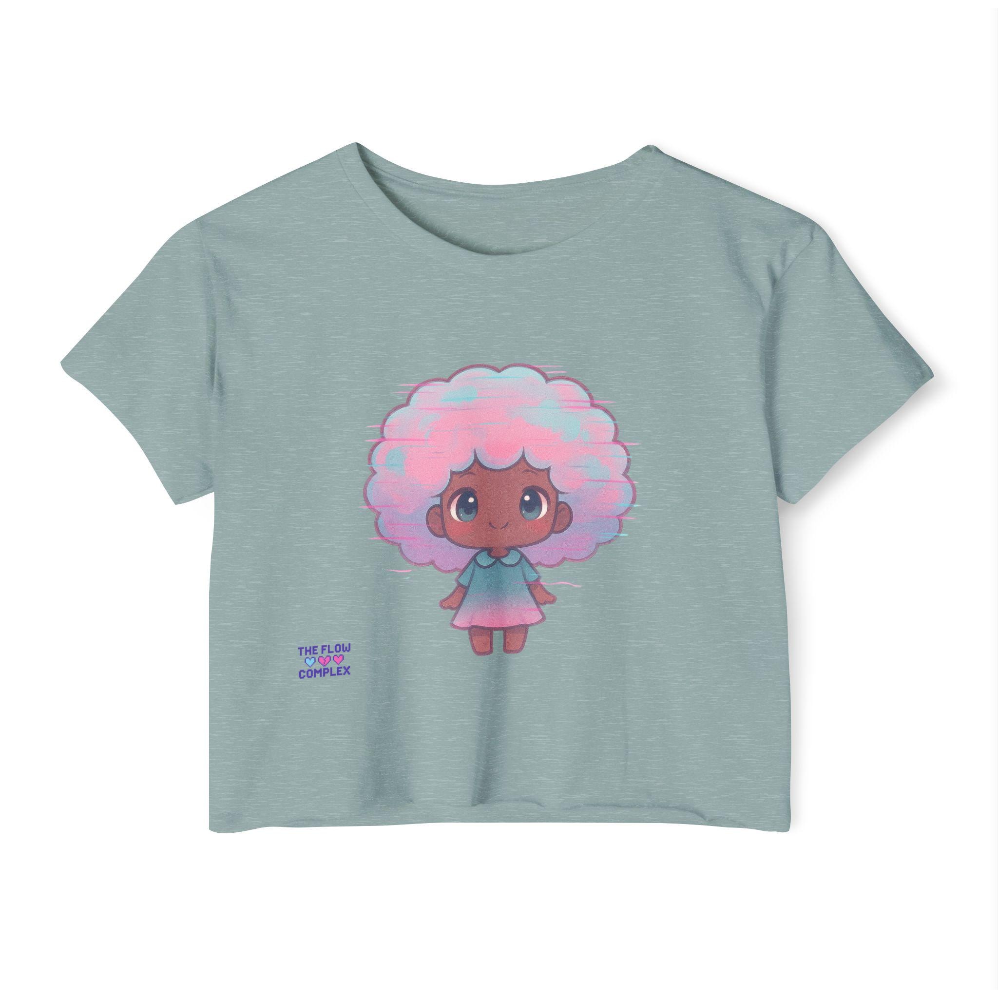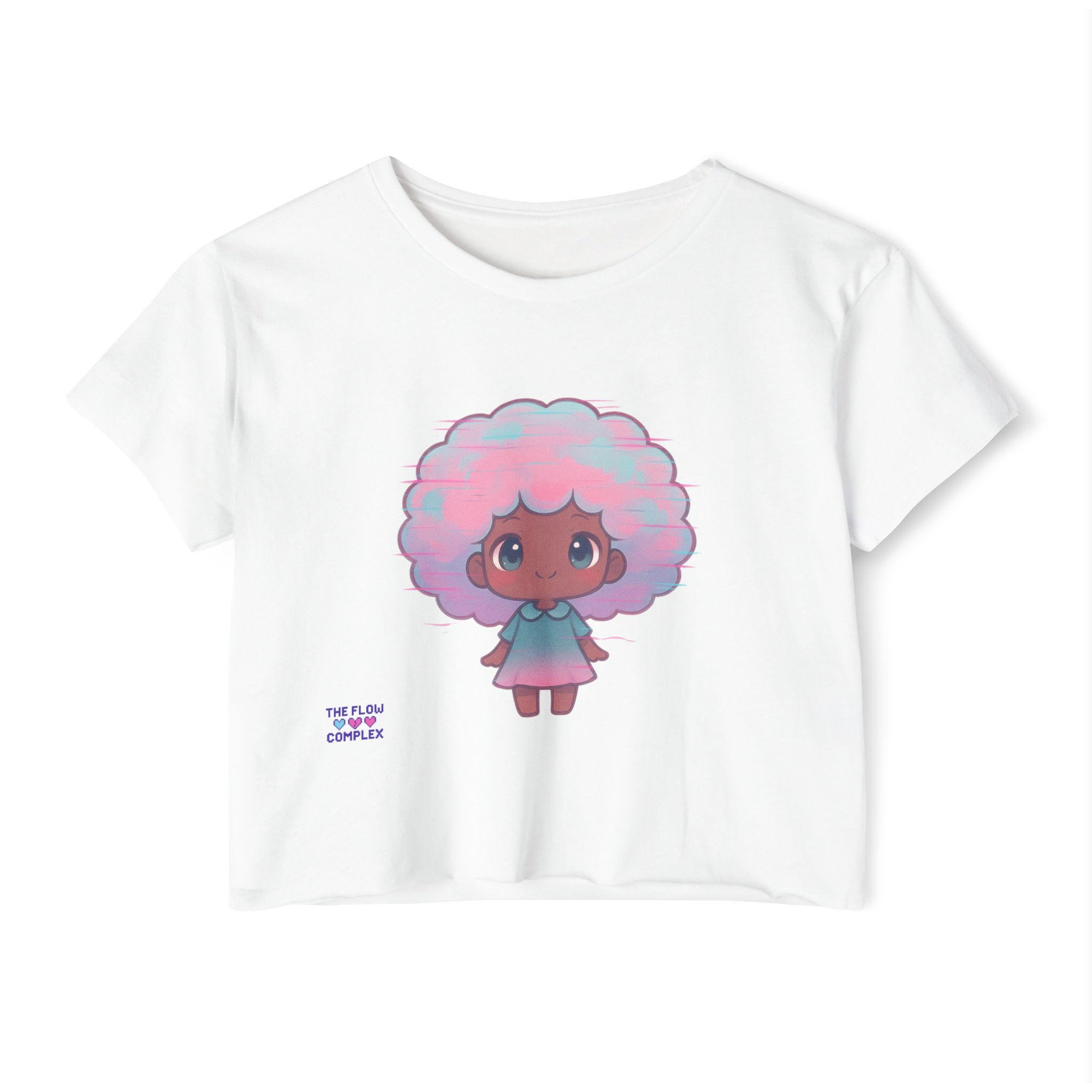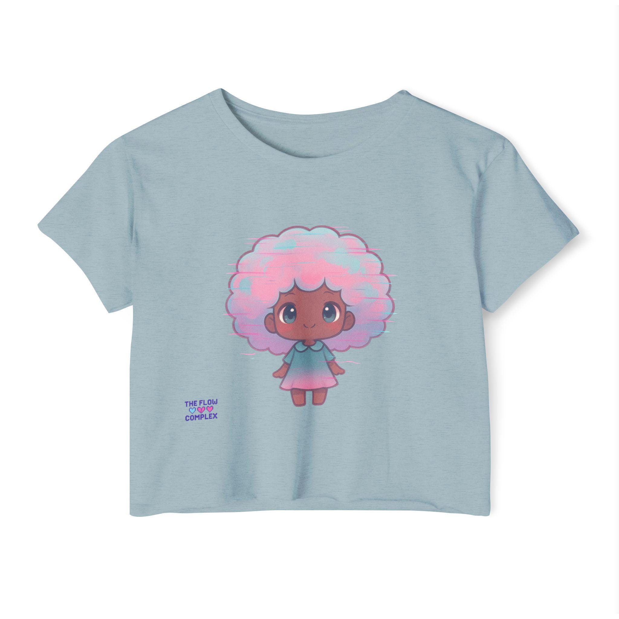 Float into sunny festival days with this airy crop top that blends soft pastel charm and easy, wearable style. The light, breathable fabric feels like a whisper against the skin while the scooped neckline and relaxed cut keep movement effortless. A whimsical, cotton-candy-haired character sits at the center—playful, gentle, and full of personality—so the top reads both nostalgic and modern. Wear it with high-waist denim, layered over a bralette, or under a sheer kimono to add a splash of innocent color to your setlist-ready outfit or weekend wanderings.