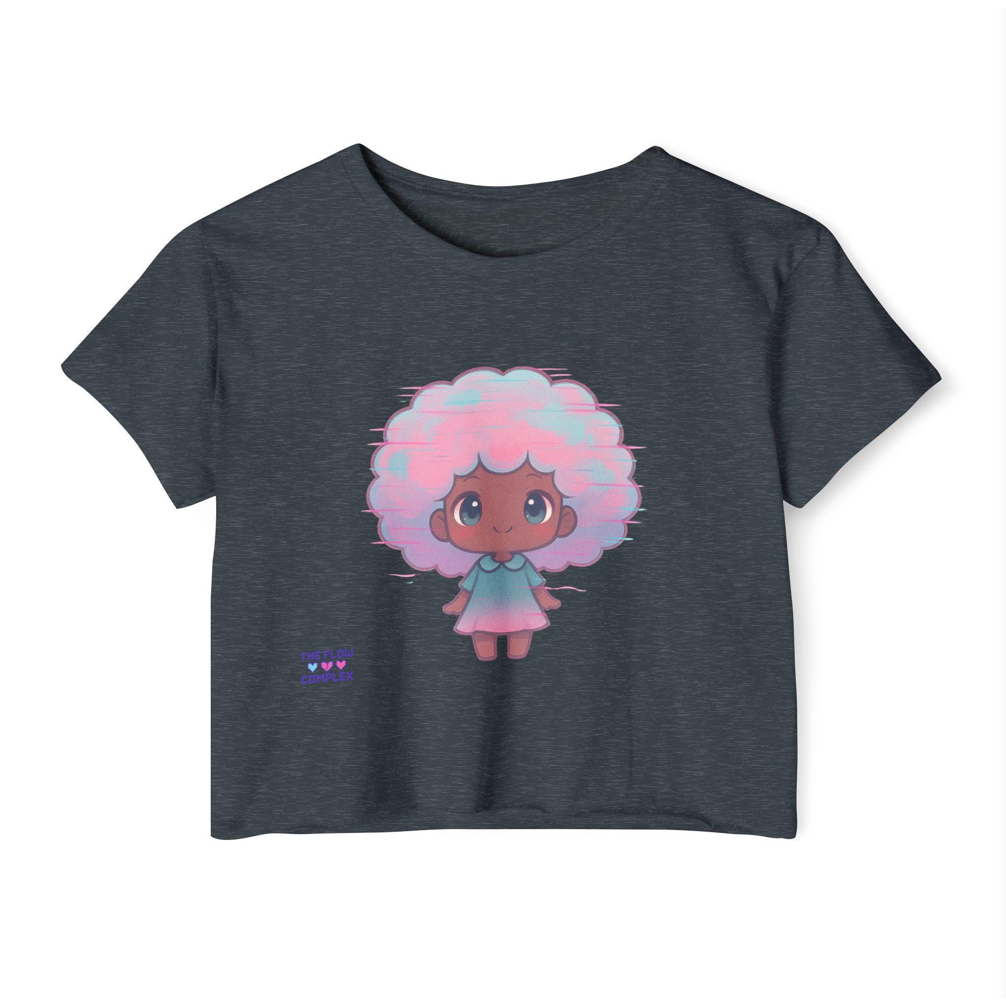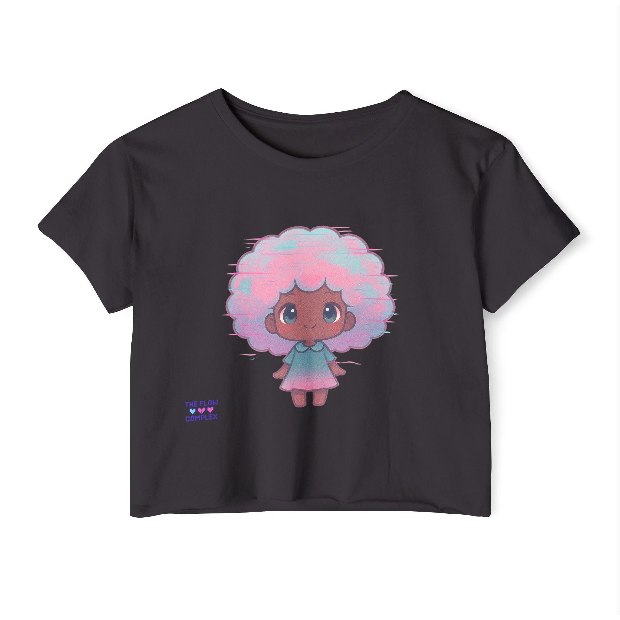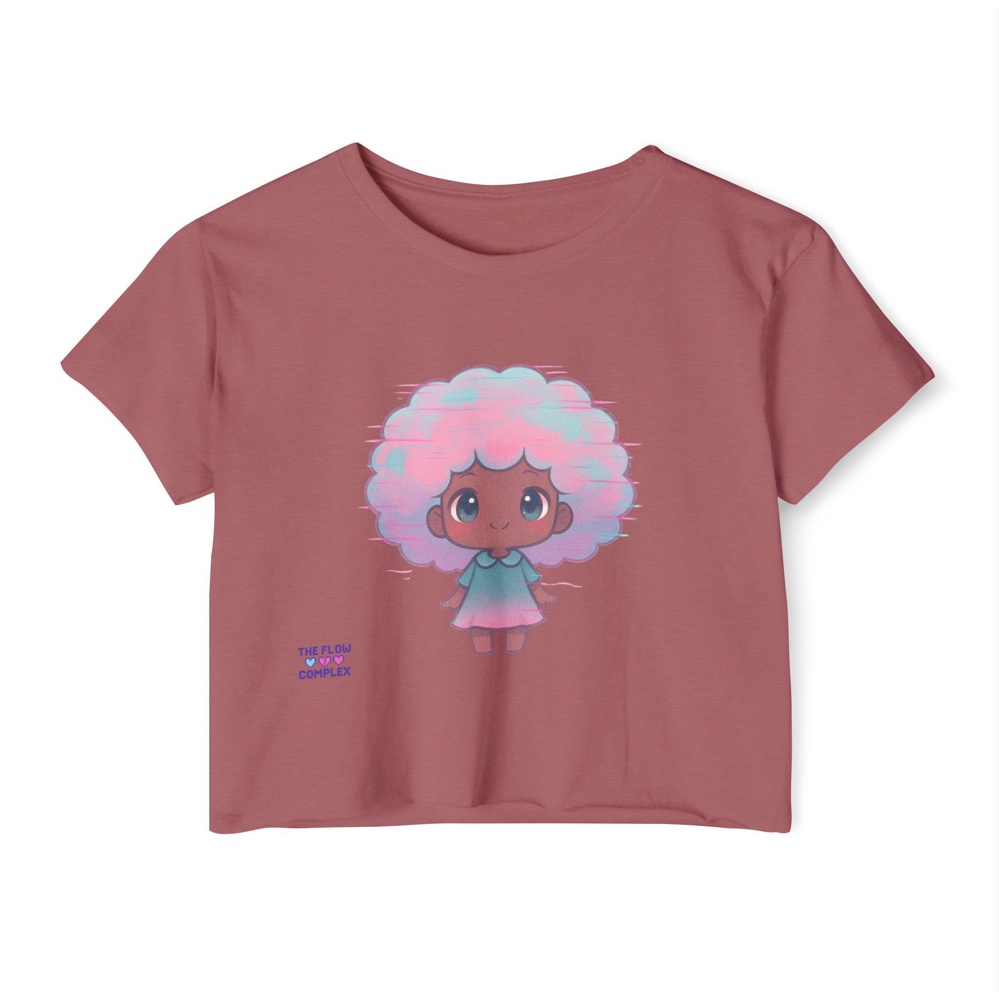 Float into sunny festival days with this airy crop top that blends soft pastel charm and easy, wearable style. The light, breathable fabric feels like a whisper against the skin while the scooped neckline and relaxed cut keep movement effortless. A whimsical, cotton-candy-haired character sits at the center—playful, gentle, and full of personality—so the top reads both nostalgic and modern. Wear it with high-waist denim, layered over a bralette, or under a sheer kimono to add a splash of innocent color to your setlist-ready outfit or weekend wanderings.