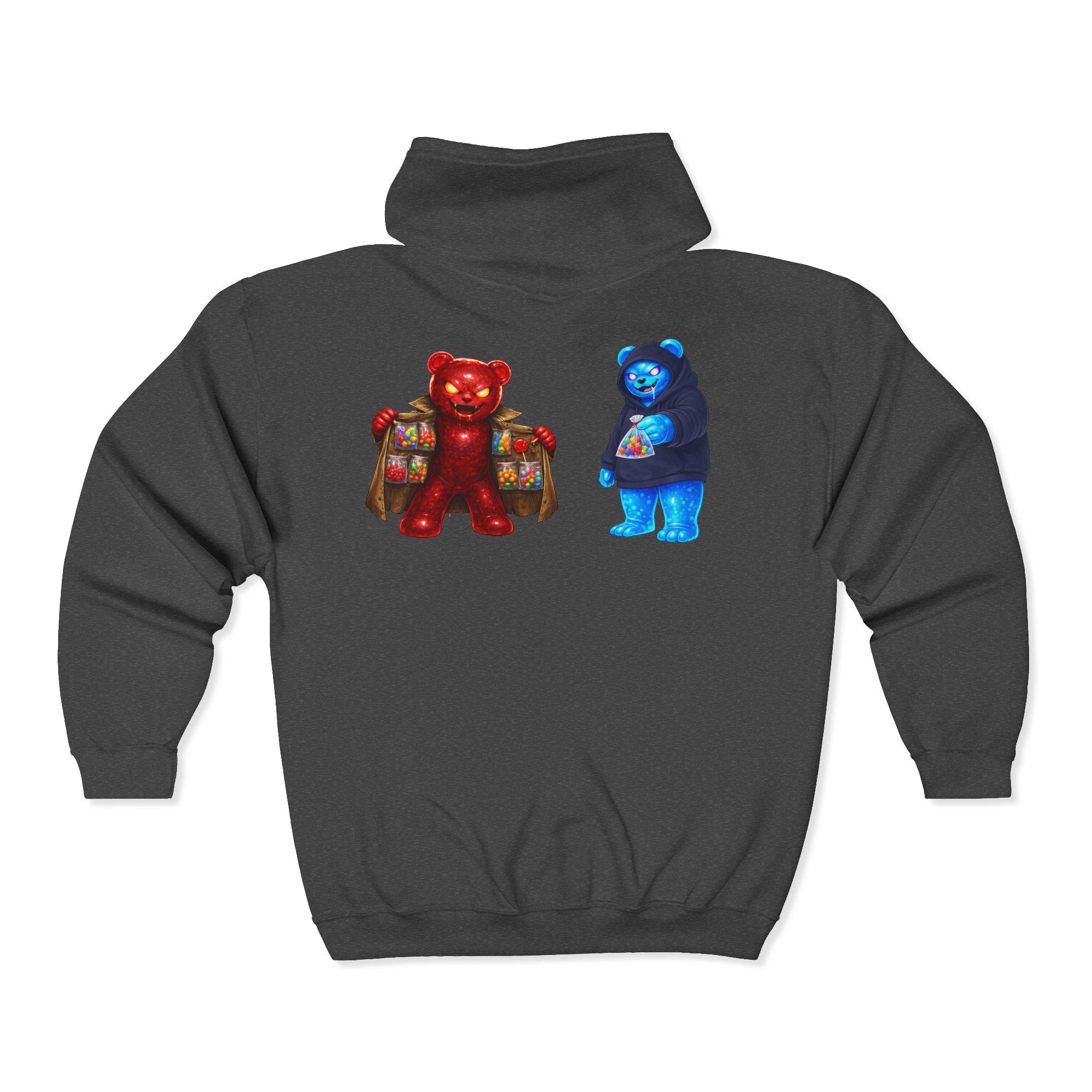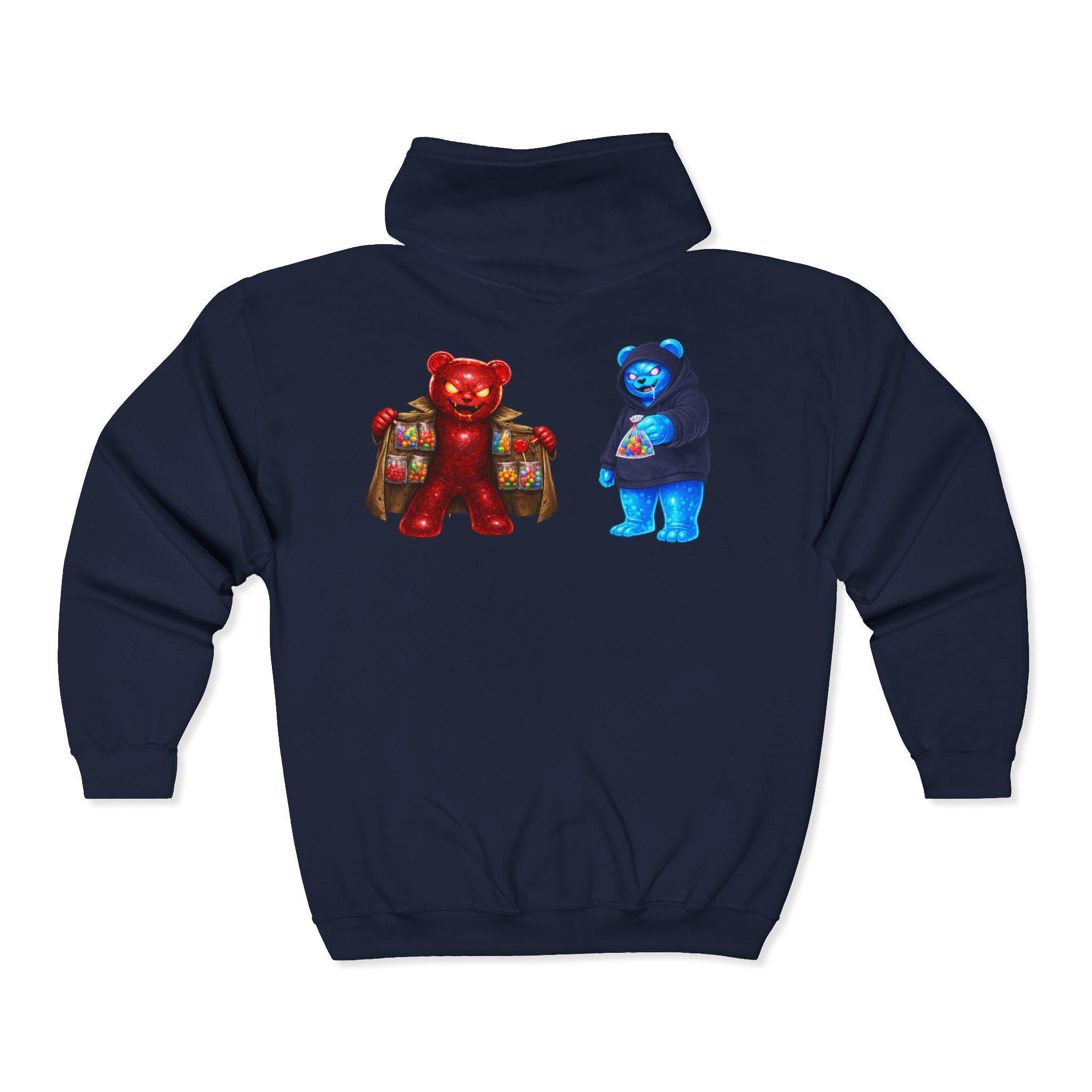 This zip-up hoodie feels like stepping into a cozy, late-night market run — warm, familiar, and a little nostalgic. The front chest shows a rustic crate of apples and subtle text that nods to small-town charm. On the back, two colorful gummy-bear characters carry tiny backpacks, adding a playful, slightly retro vibe that catches the eye without shouting. Wear it on cool evenings while wandering farmer’s stalls, hanging with friends at a local show, or when you want an easy layer that sparks conversation. The medium-heavy fabric holds the prints and embroidery well, and the roomy pockets keep your hands and essentials close. It’s for people who like comfort with a wink of whimsy — practical, wearable, and quietly fun.