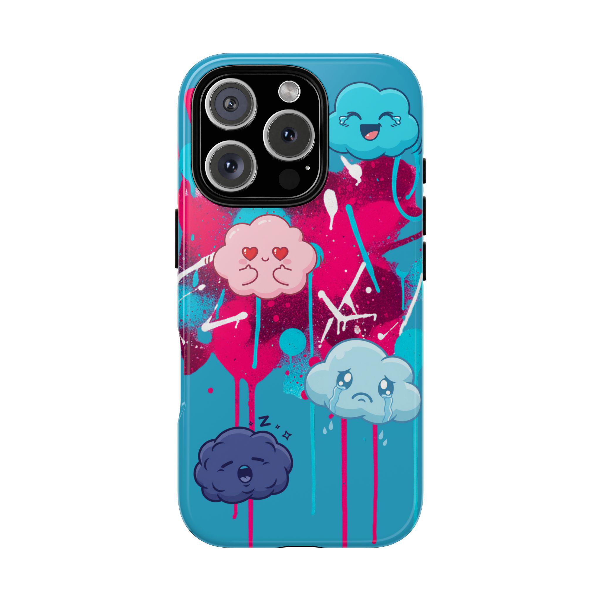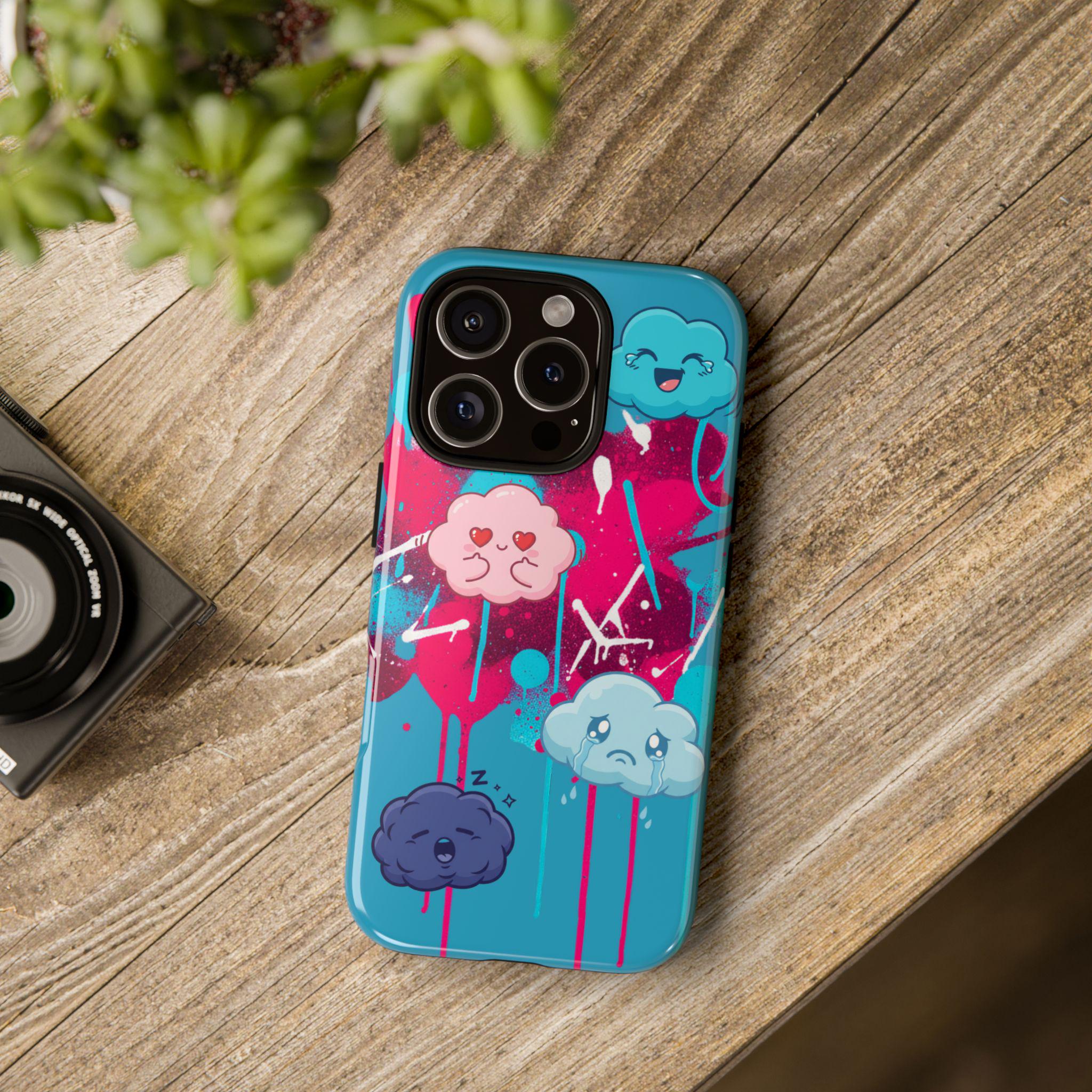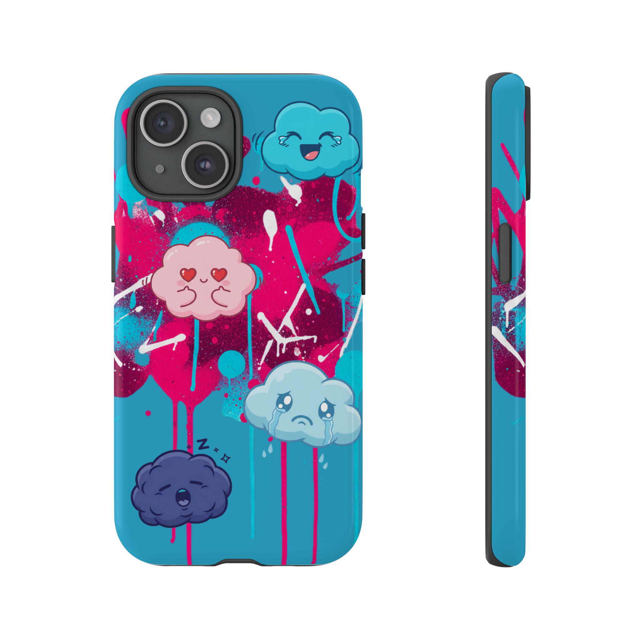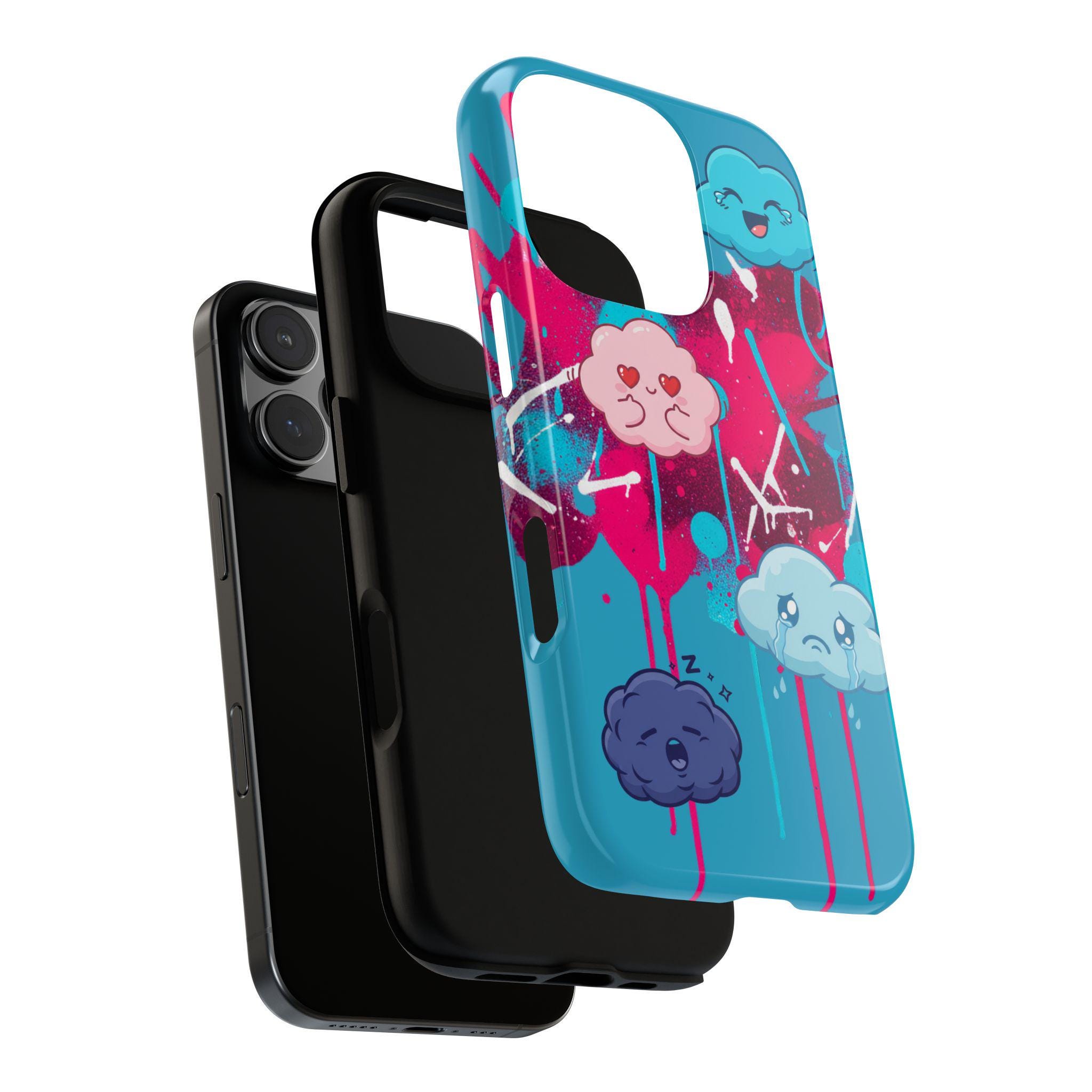 A protective phone case that blends playful illustration with rugged construction. Bright turquoise and magenta splashes set the stage for four expressive, cartoon cloud characters that feel both whimsical and slightly moody — a design that brings personality to everyday use. The case is dual-layer with a tough polycarbonate shell and a shock-absorbing TPU silicone liner, giving secure drop protection while keeping ports accessible. UV-resistant inks and a choice of glossy or matte finishes keep colors vibrant outdoors, while compliance certifications ensure safe materials. This case suits someone who wants durable protection without sacrificing bold, quirky style.
