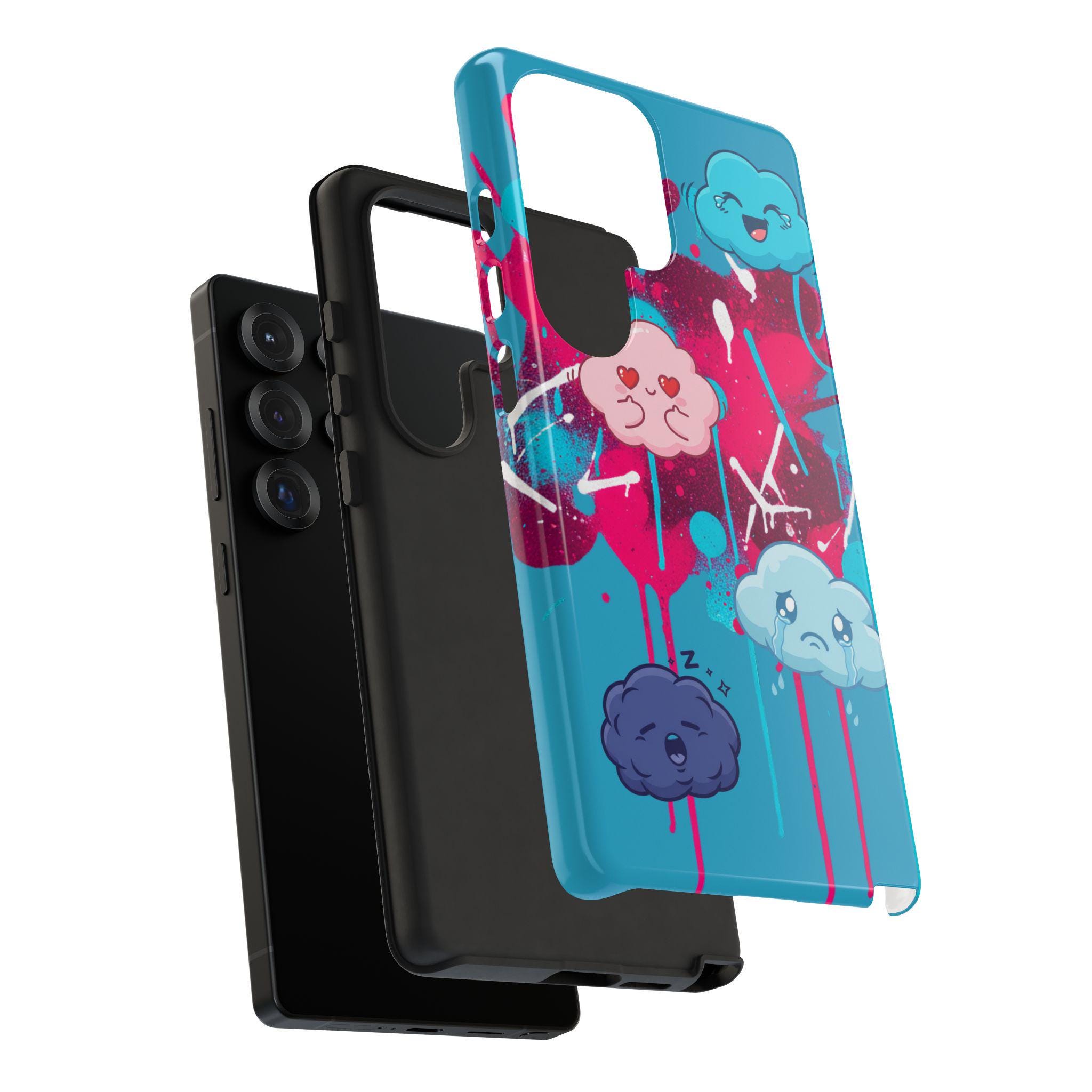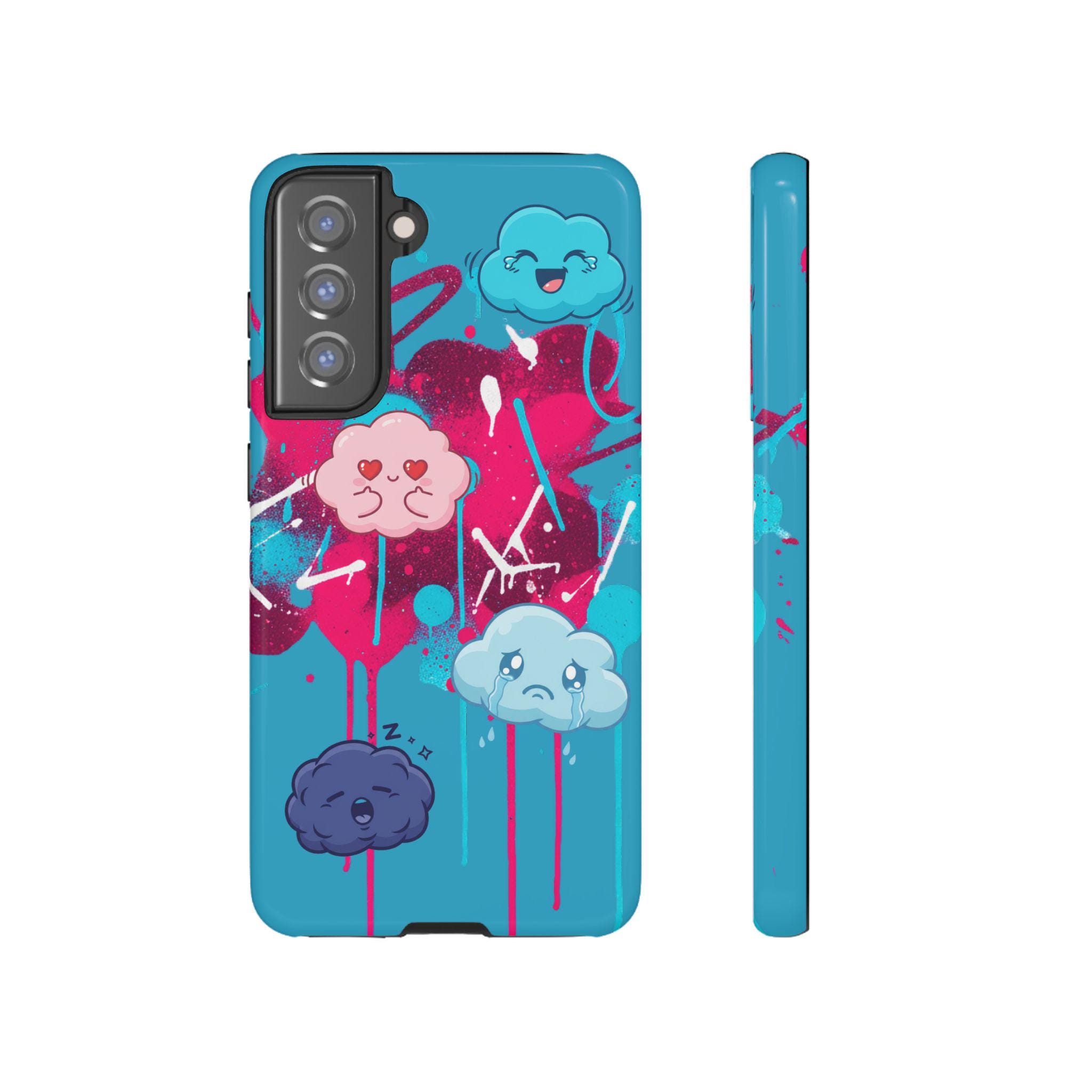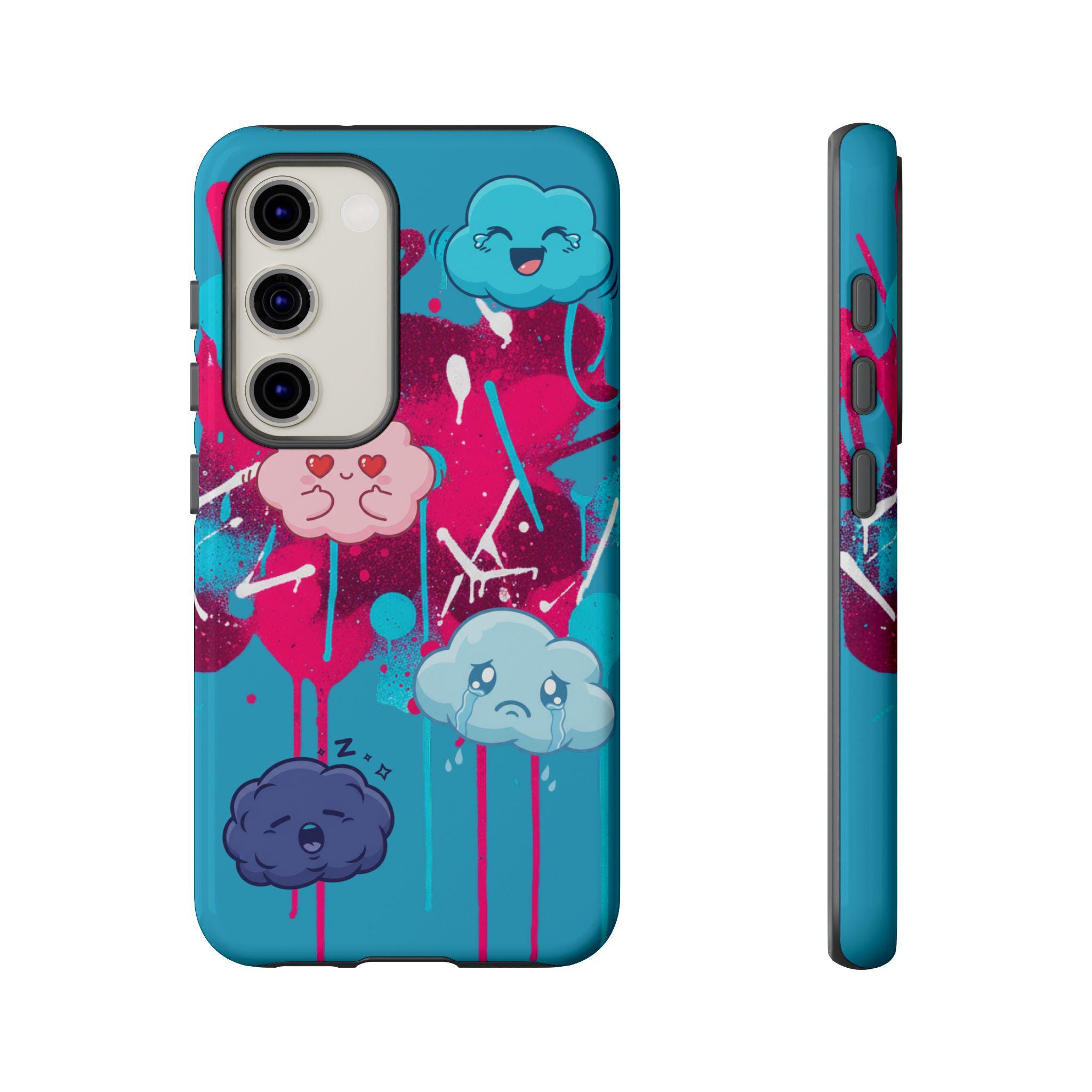 A protective phone case that blends playful illustration with rugged construction. Bright turquoise and magenta splashes set the stage for four expressive, cartoon cloud characters that feel both whimsical and slightly moody — a design that brings personality to everyday use. The case is dual-layer with a tough polycarbonate shell and a shock-absorbing TPU silicone liner, giving secure drop protection while keeping ports accessible. UV-resistant inks and a choice of glossy or matte finishes keep colors vibrant outdoors, while compliance certifications ensure safe materials. This case suits someone who wants durable protection without sacrificing bold, quirky style.