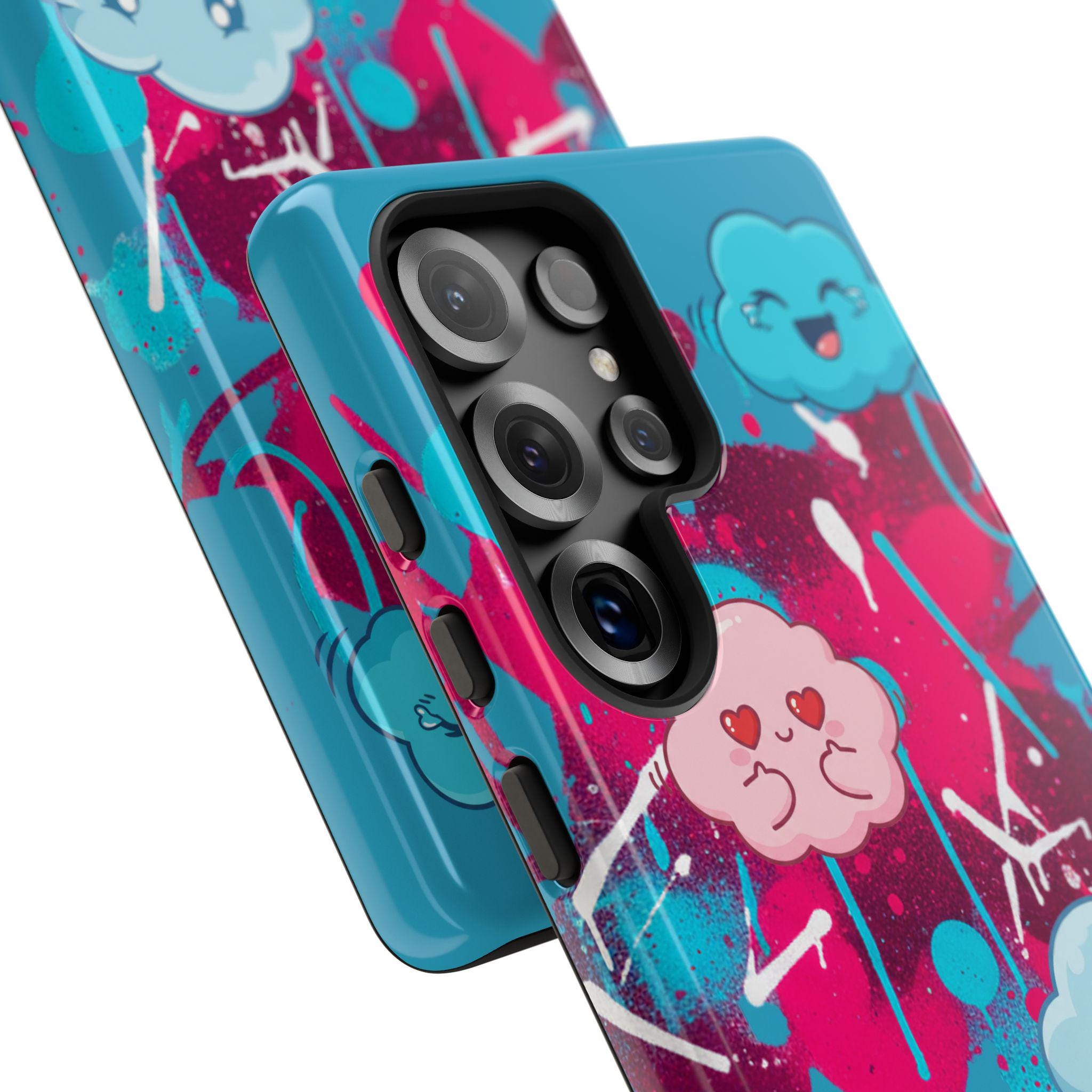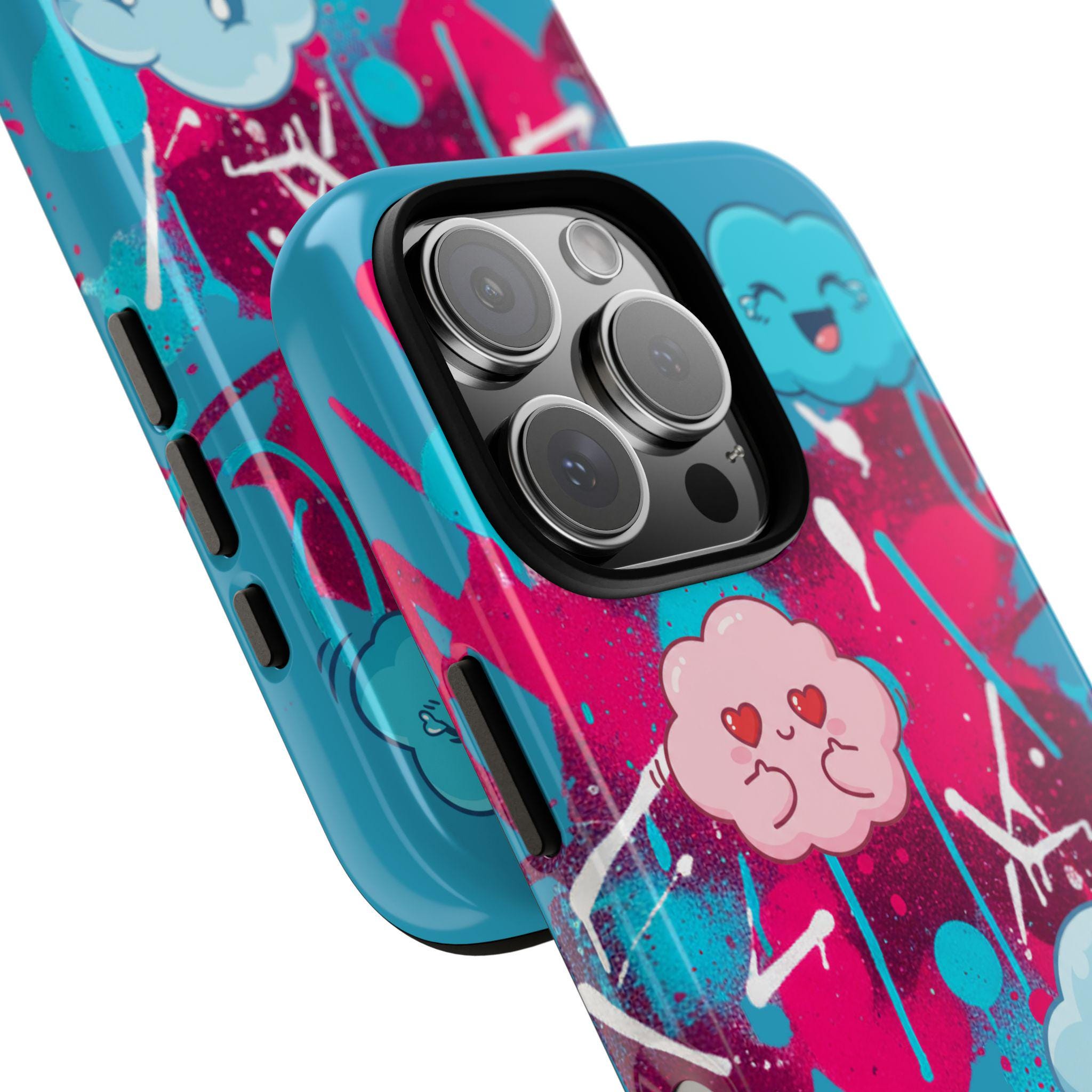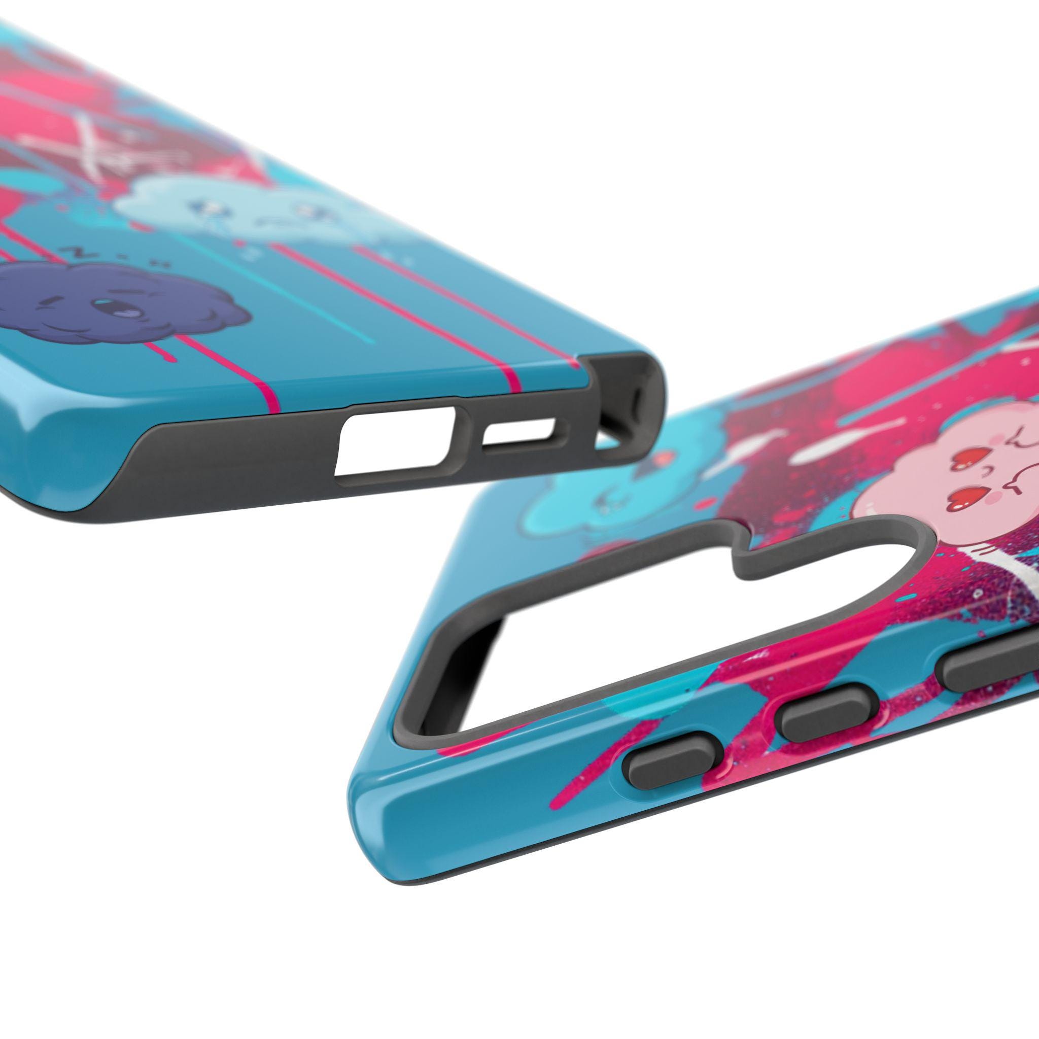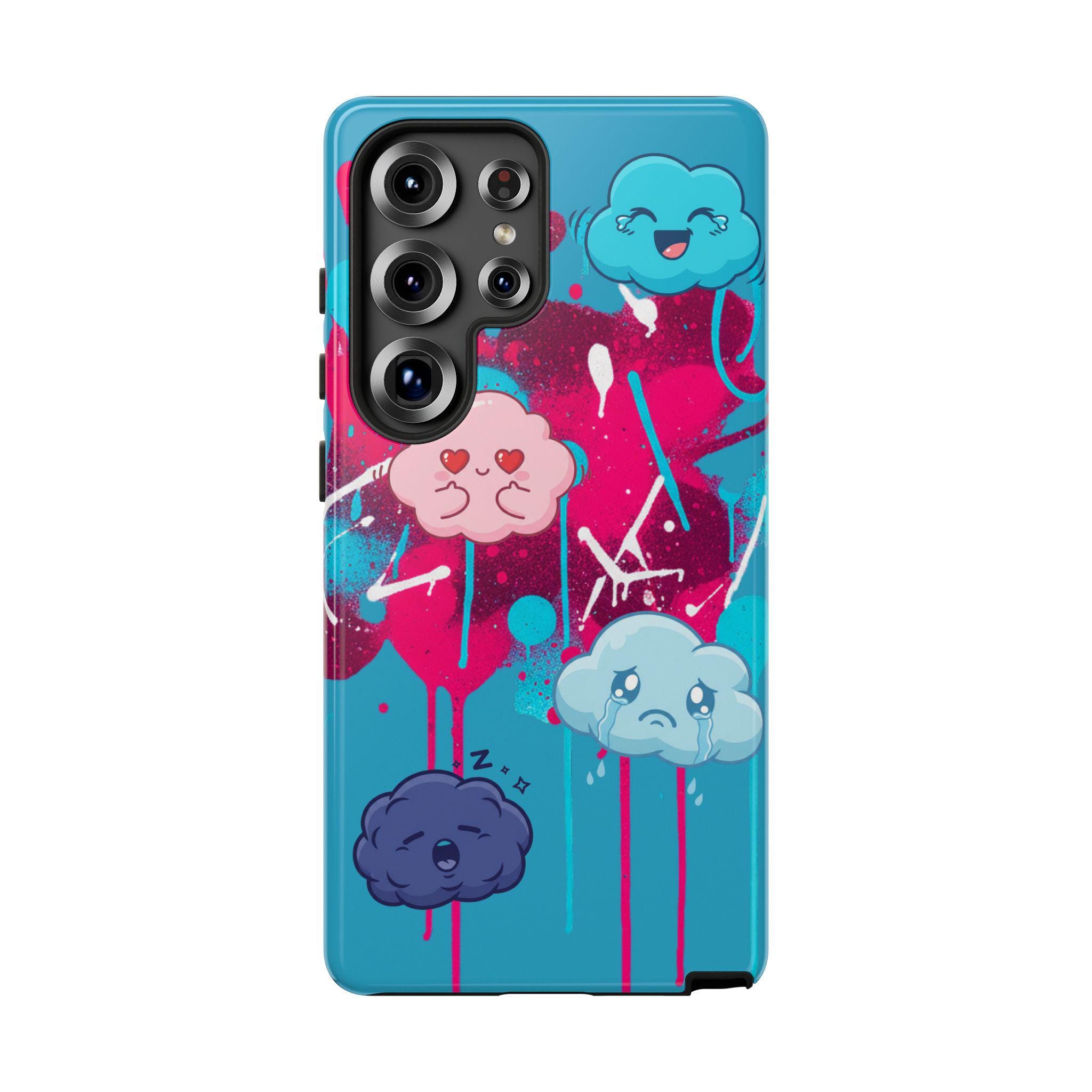 A protective phone case that blends playful illustration with rugged construction. Bright turquoise and magenta splashes set the stage for four expressive, cartoon cloud characters that feel both whimsical and slightly moody — a design that brings personality to everyday use. The case is dual-layer with a tough polycarbonate shell and a shock-absorbing TPU silicone liner, giving secure drop protection while keeping ports accessible. UV-resistant inks and a choice of glossy or matte finishes keep colors vibrant outdoors, while compliance certifications ensure safe materials. This case suits someone who wants durable protection without sacrificing bold, quirky style.