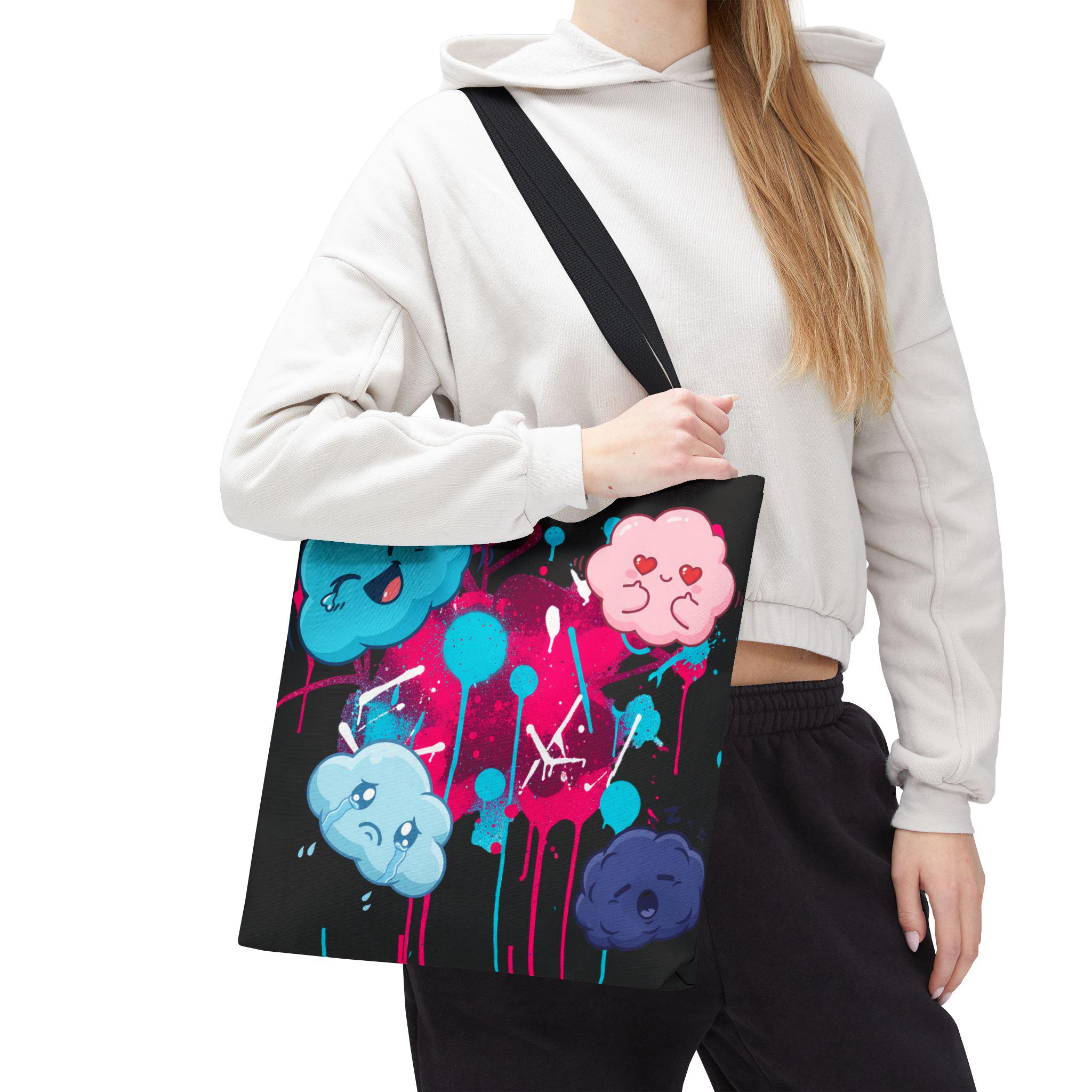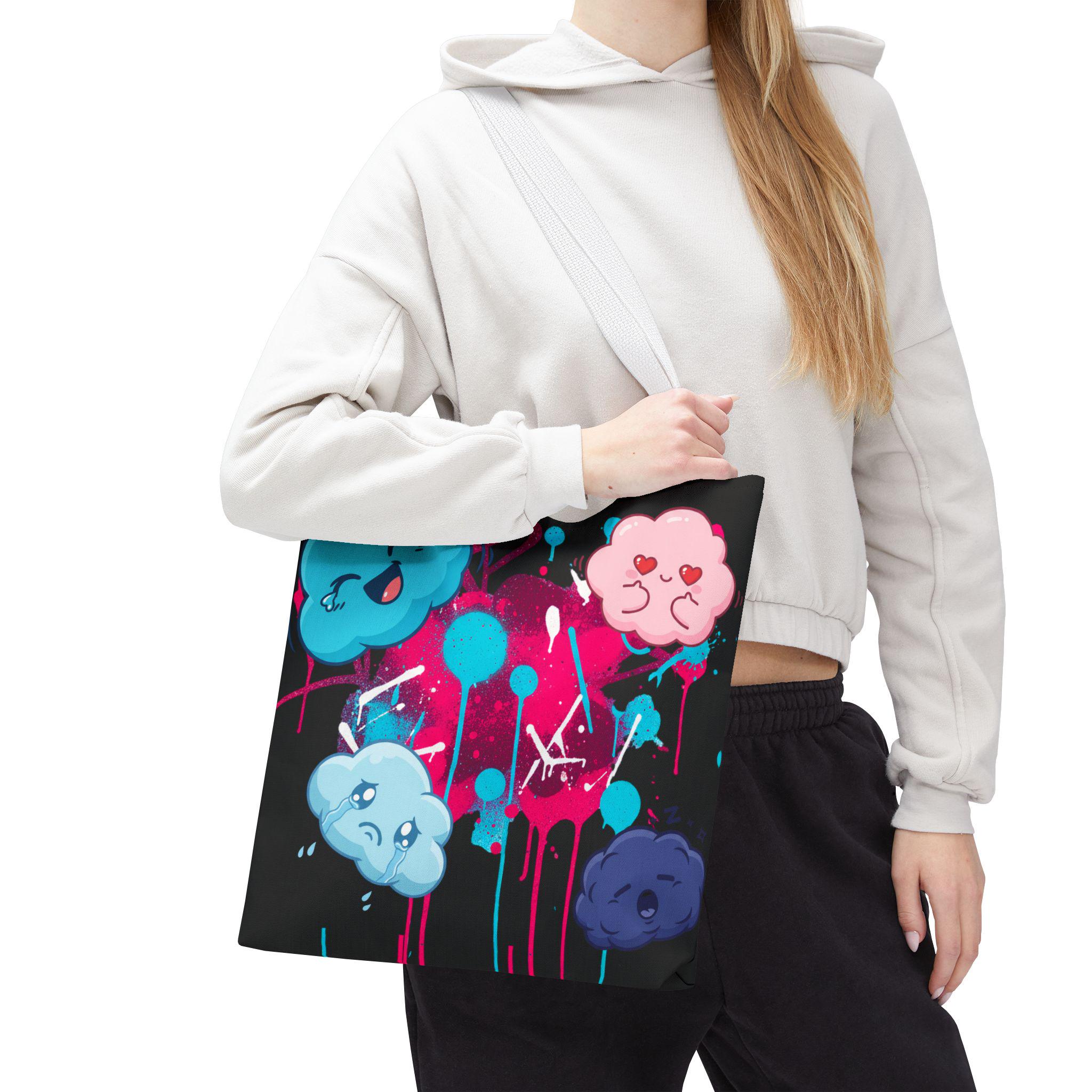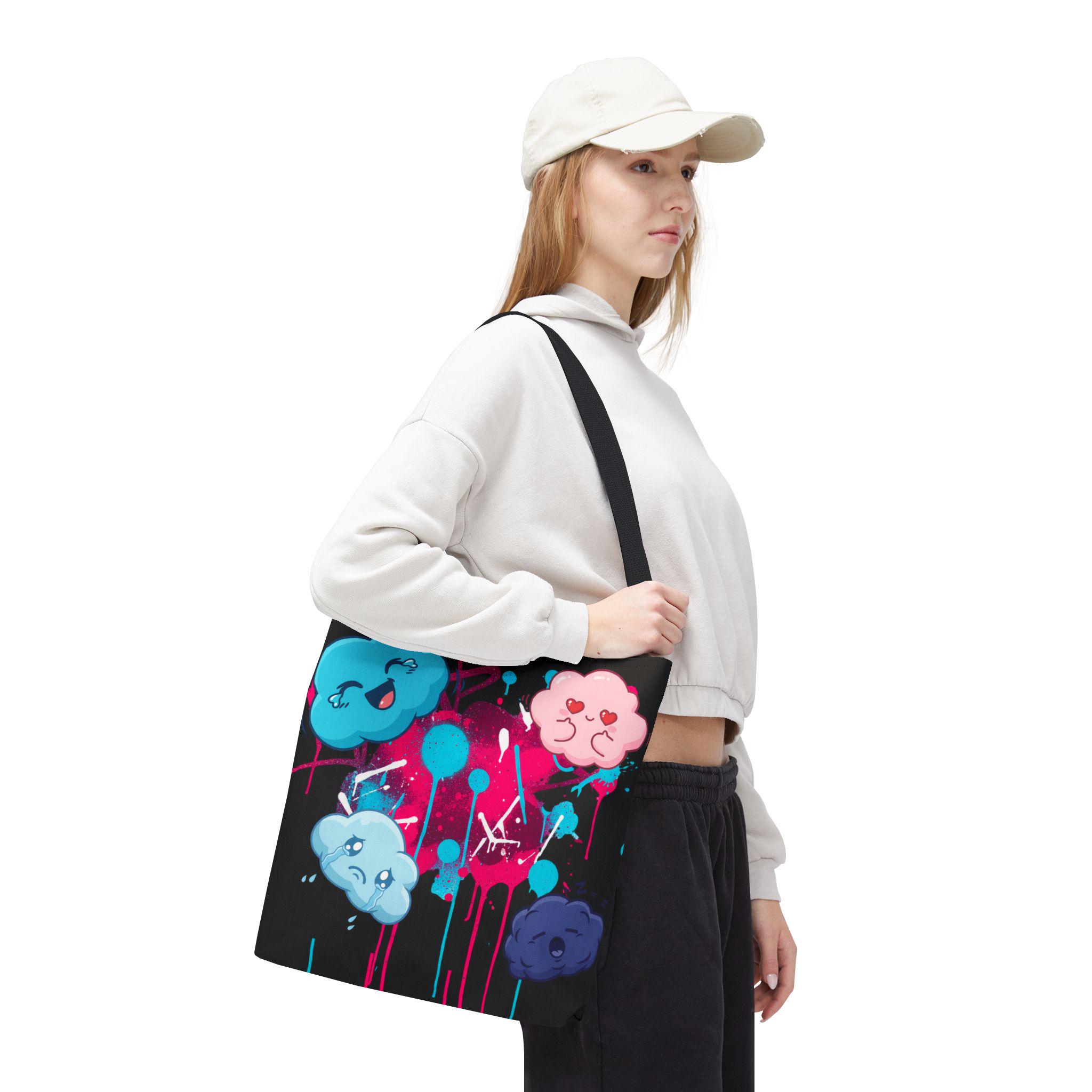 Bright, playful tote designed to carry color and cheer wherever you go. Soft cotton handles and a durable polyester body make it comfortable to carry and tough enough for daily use—groceries, sketchbooks, or a weekend market run. The print features bubbly, emotive cloud characters and splashes of paint on a vivid pink background, bringing a whimsical, street-art energy to errands, classes, and creative meetups. Boxed corners expand capacity so the bag keeps its shape and holds more than it looks. Choose handle colors to match your style and enjoy a light, quick-drying fabric that stands up to everyday life.
