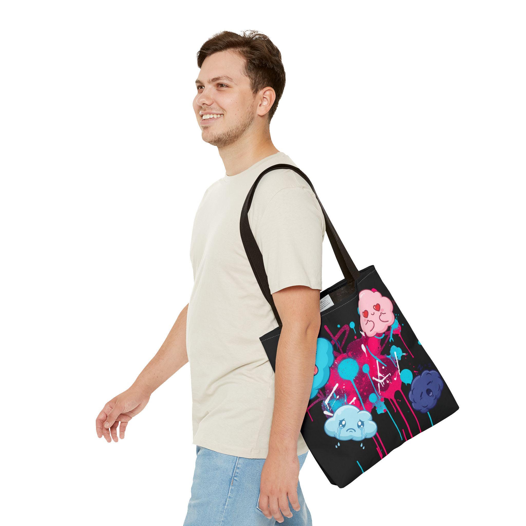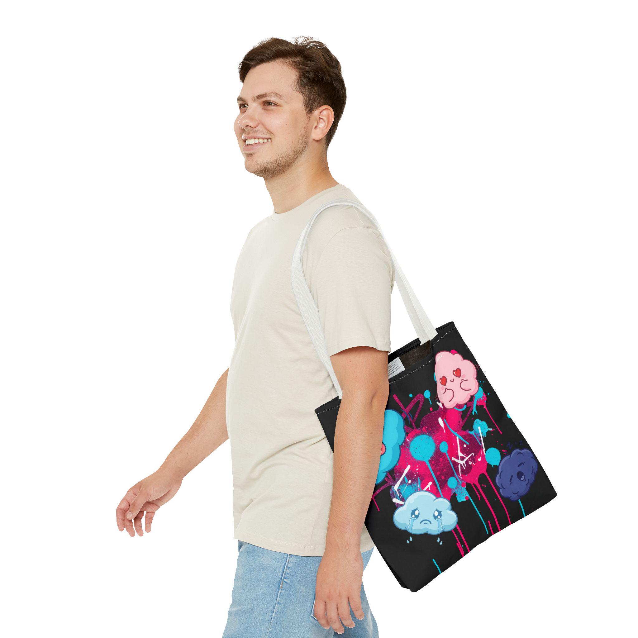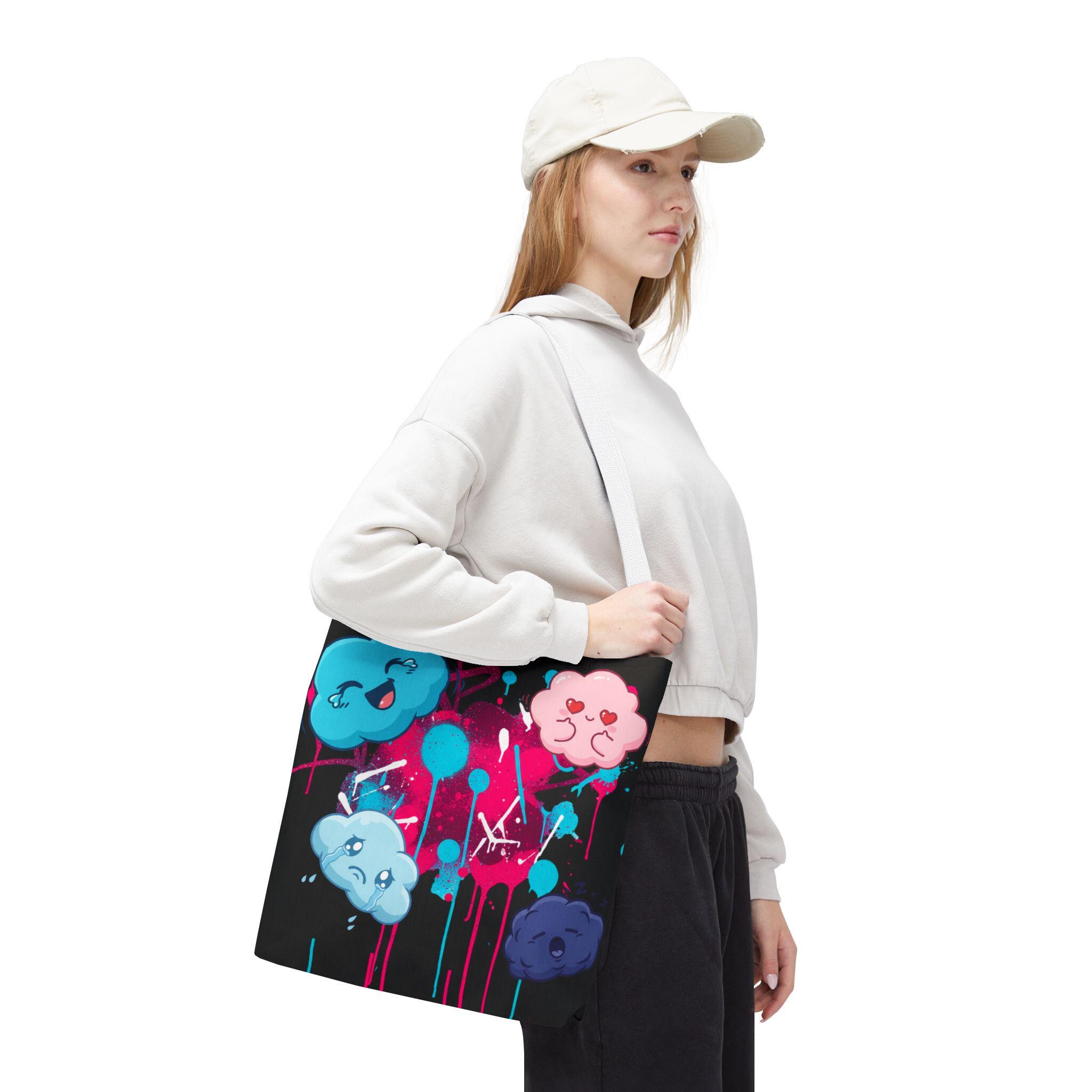 Bright, playful tote designed to carry color and cheer wherever you go. Soft cotton handles and a durable polyester body make it comfortable to carry and tough enough for daily use—groceries, sketchbooks, or a weekend market run. The print features bubbly, emotive cloud characters and splashes of paint on a vivid pink background, bringing a whimsical, street-art energy to errands, classes, and creative meetups. Boxed corners expand capacity so the bag keeps its shape and holds more than it looks. Choose handle colors to match your style and enjoy a light, quick-drying fabric that stands up to everyday life.