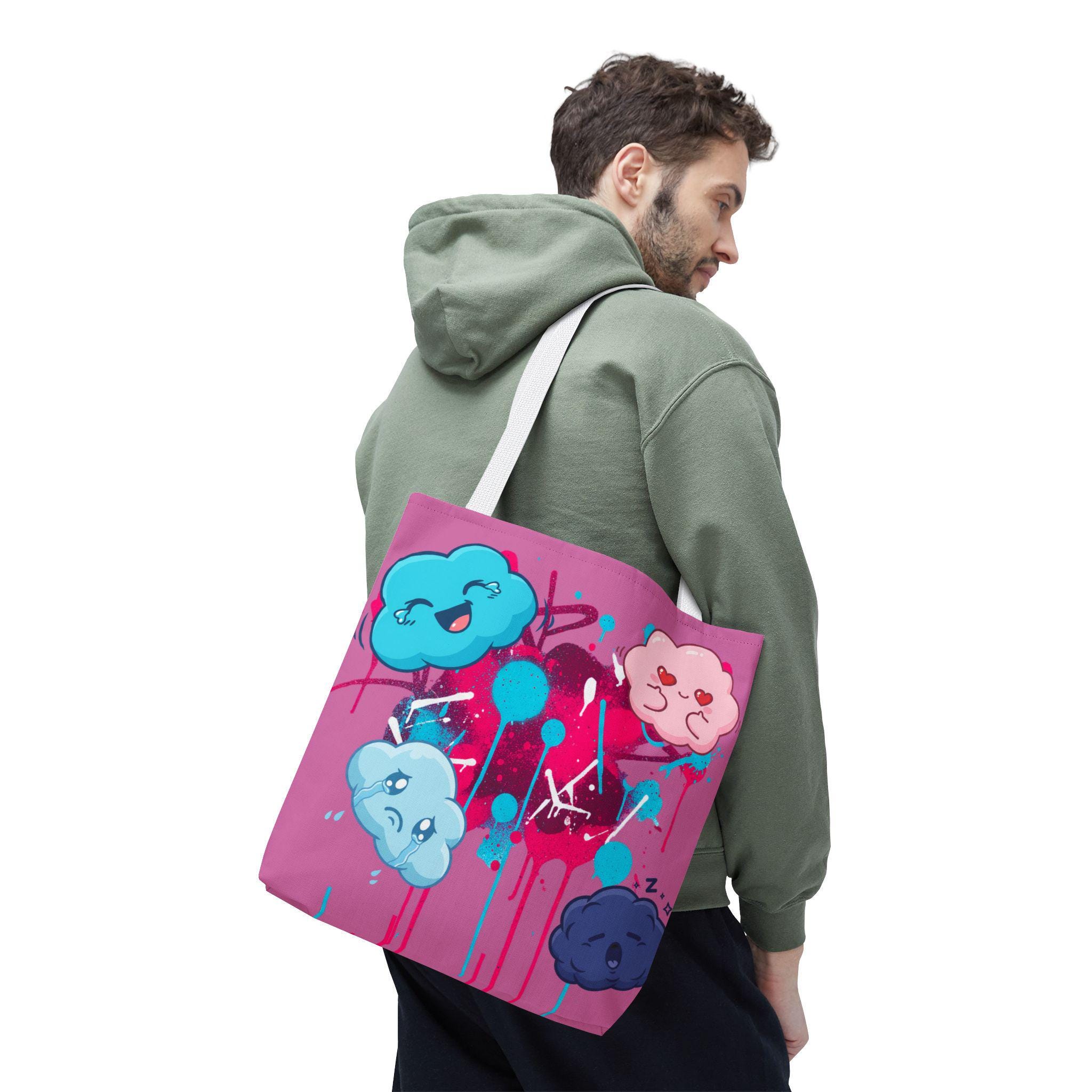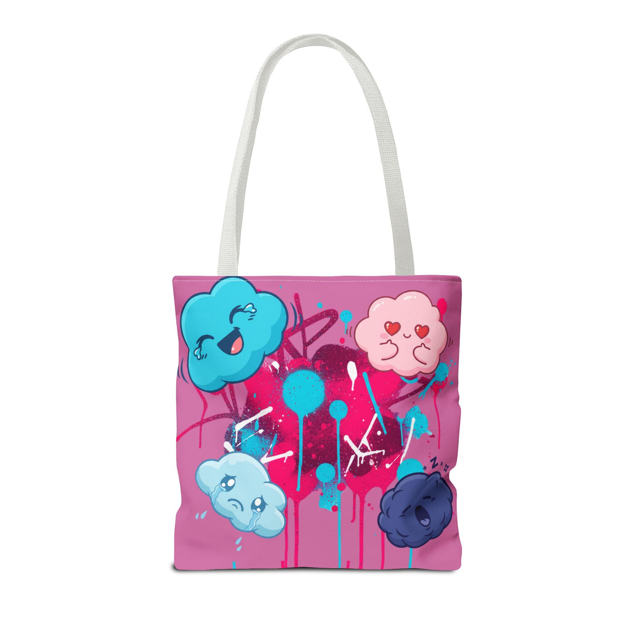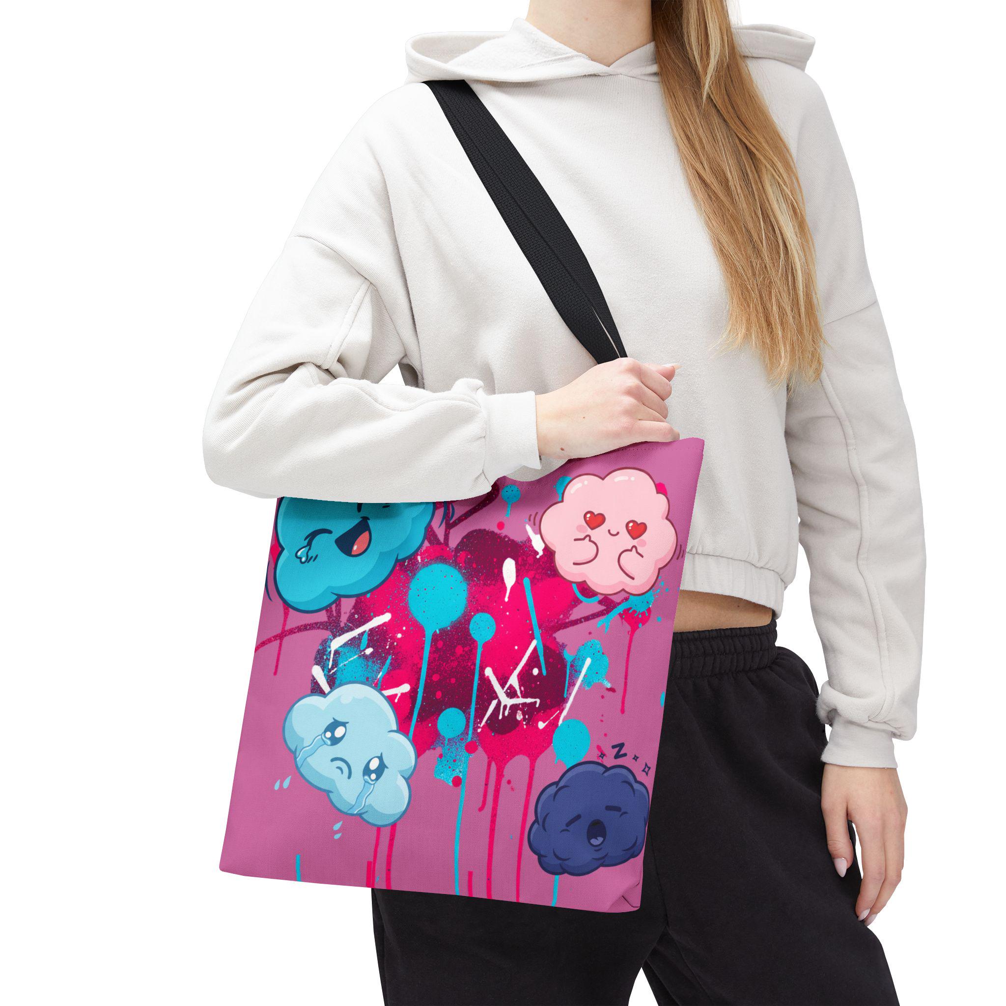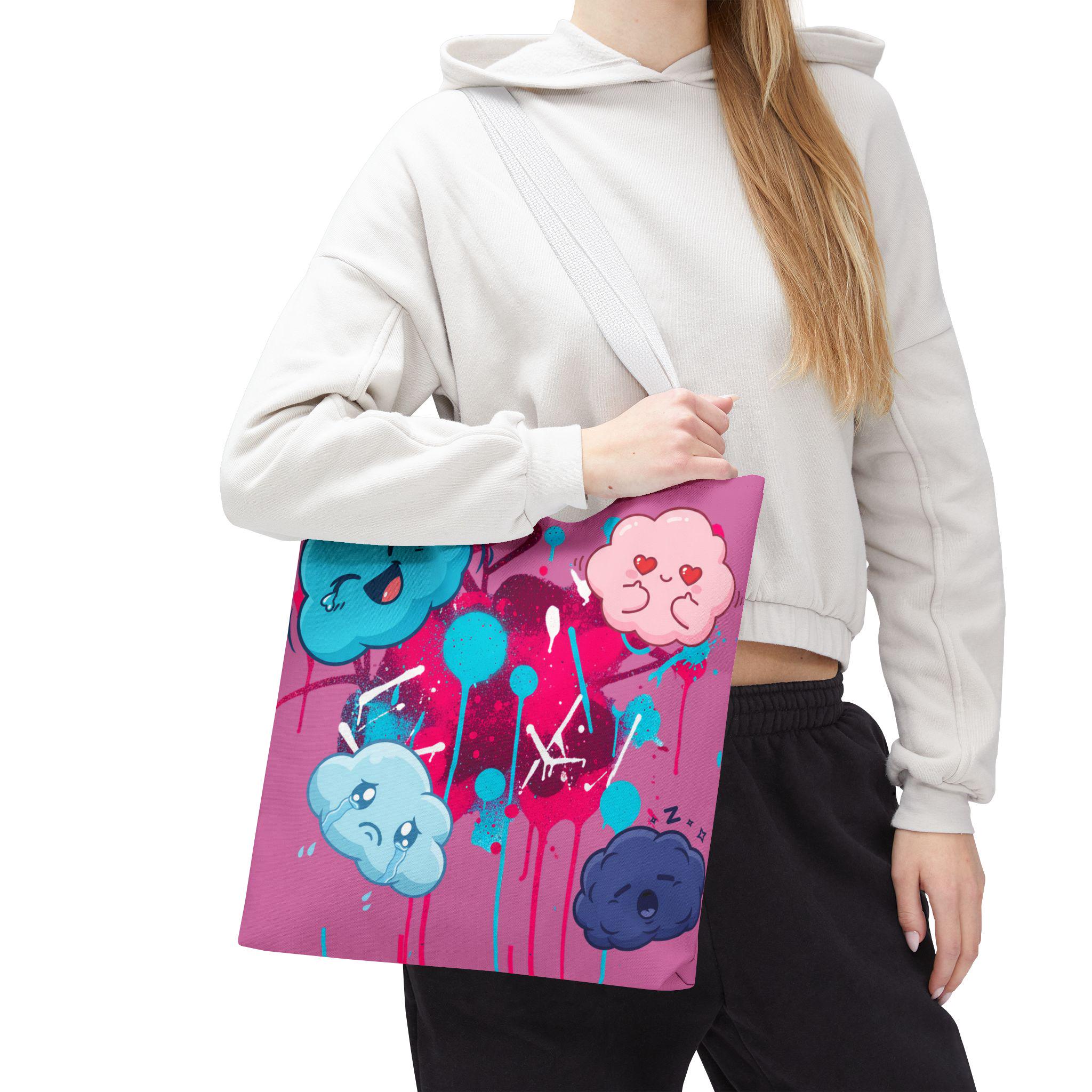Bright, playful tote designed to carry color and cheer wherever you go. Soft cotton handles and a durable polyester body make it comfortable to carry and tough enough for daily use—groceries, sketchbooks, or a weekend market run. The print features bubbly, emotive cloud characters and splashes of paint on a vivid pink background, bringing a whimsical, street-art energy to errands, classes, and creative meetups. Boxed corners expand capacity so the bag keeps its shape and holds more than it looks. Choose handle colors to match your style and enjoy a light, quick-drying fabric that stands up to everyday life.