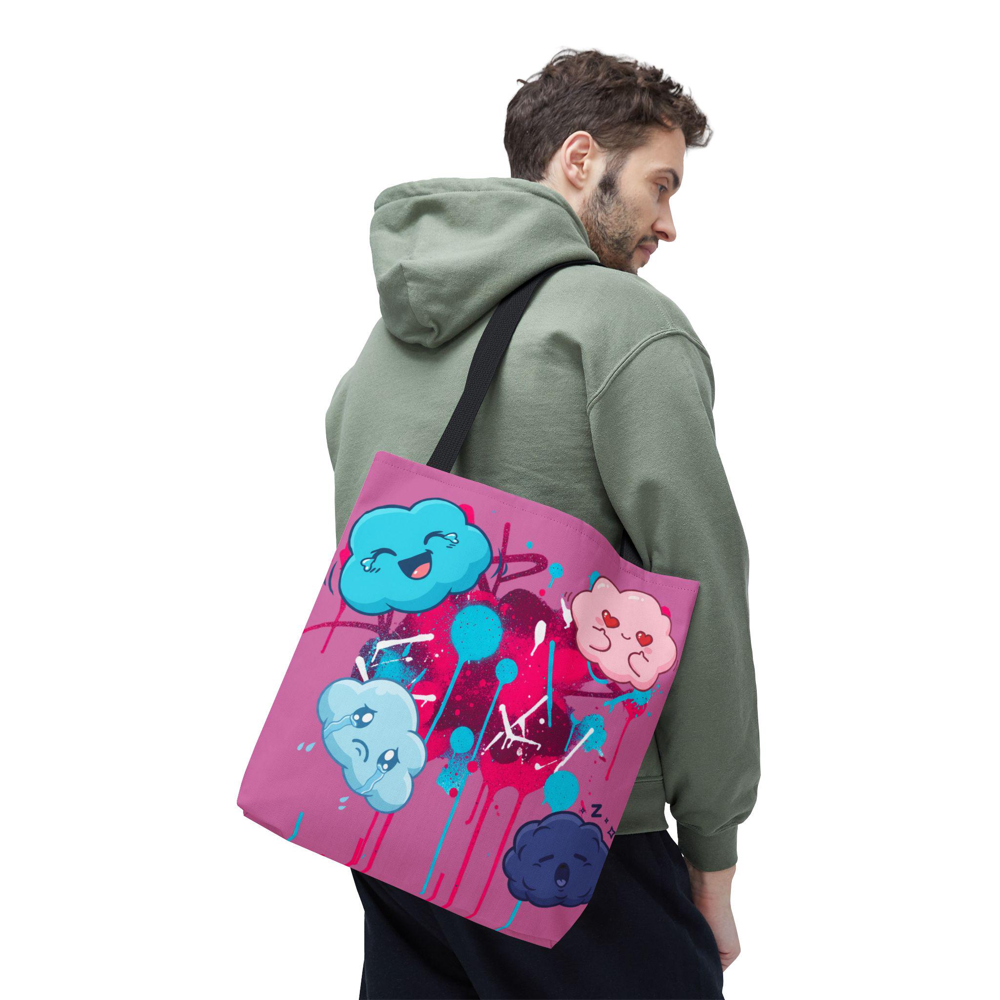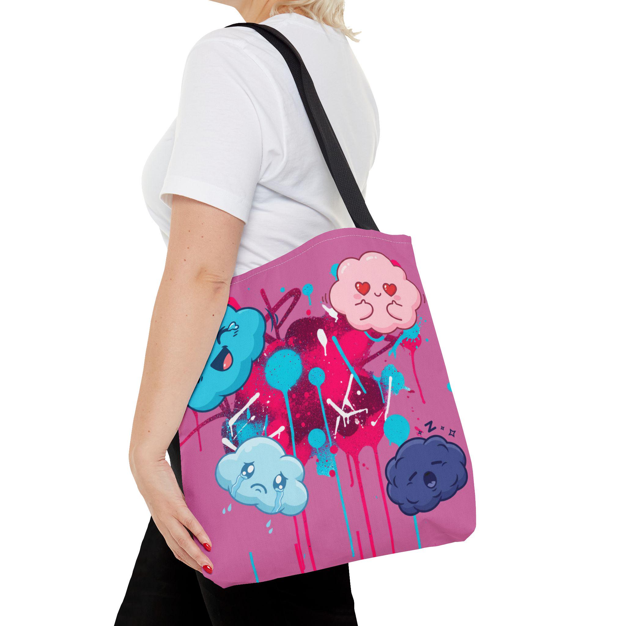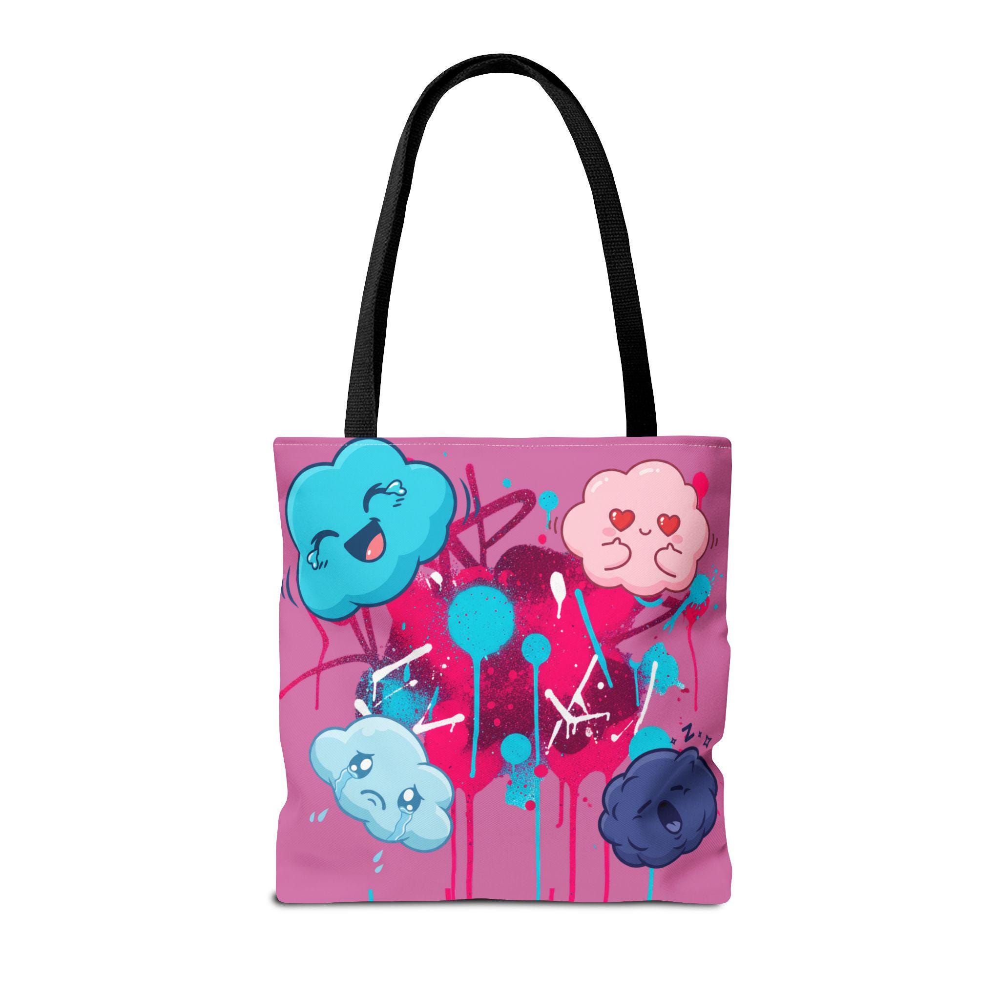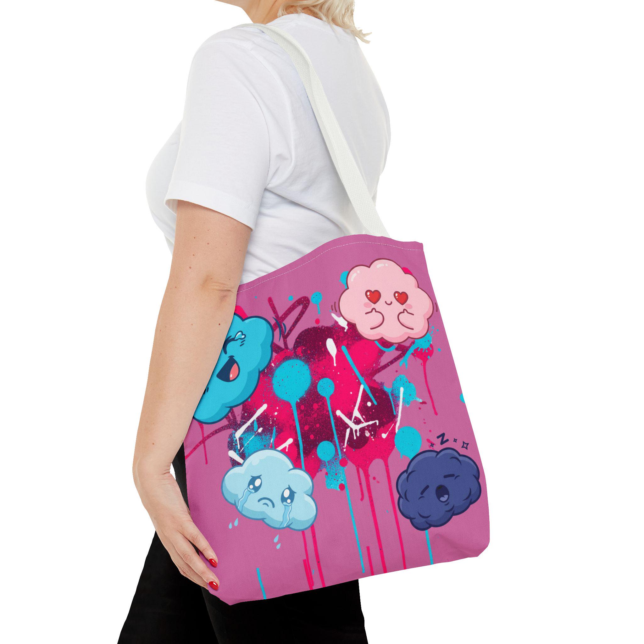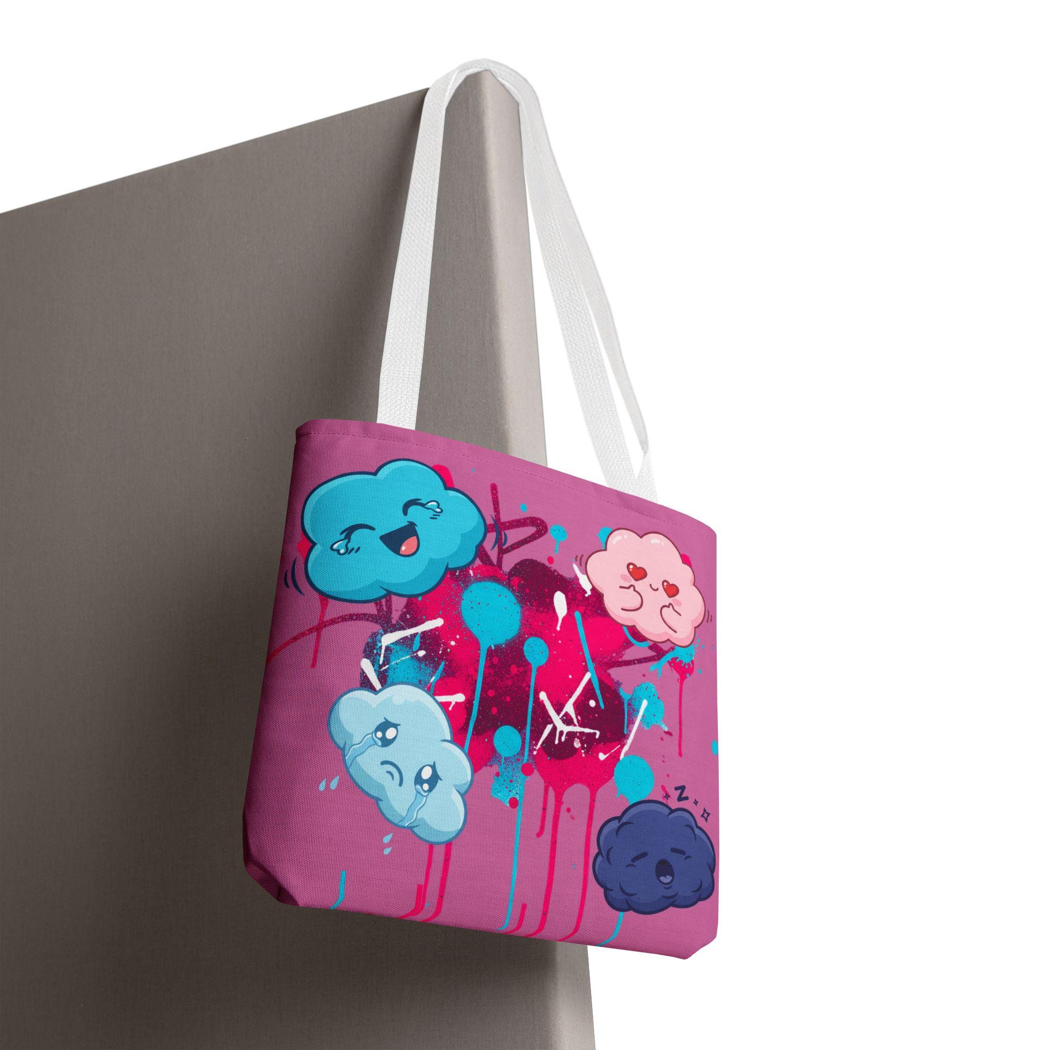 Bright, playful tote designed to carry color and cheer wherever you go. Soft cotton handles and a durable polyester body make it comfortable to carry and tough enough for daily use—groceries, sketchbooks, or a weekend market run. The print features bubbly, emotive cloud characters and splashes of paint on a vivid pink background, bringing a whimsical, street-art energy to errands, classes, and creative meetups. Boxed corners expand capacity so the bag keeps its shape and holds more than it looks. Choose handle colors to match your style and enjoy a light, quick-drying fabric that stands up to everyday life.