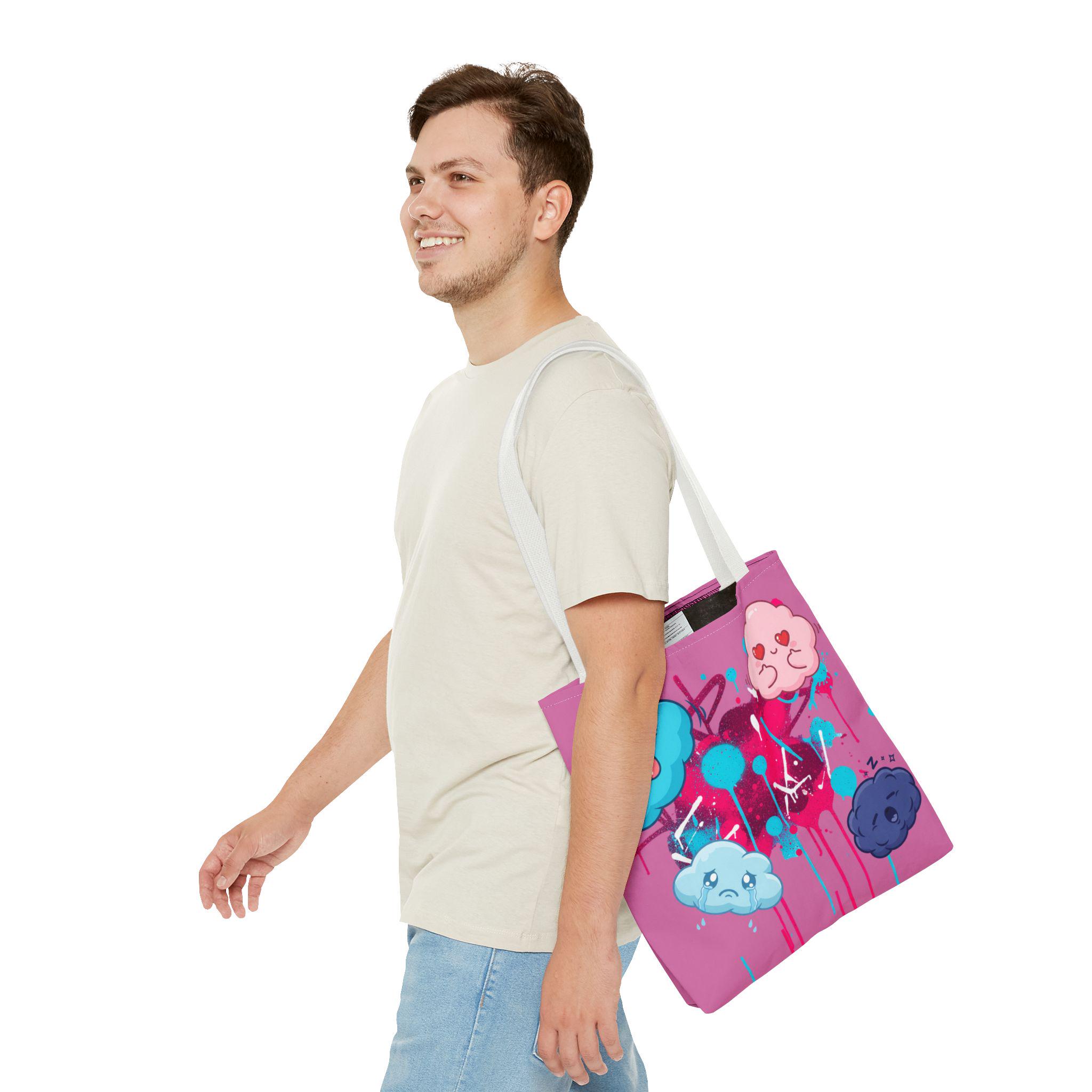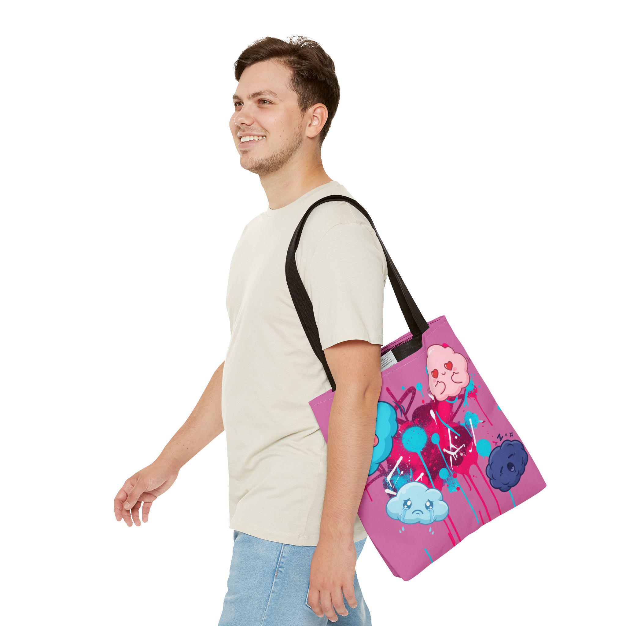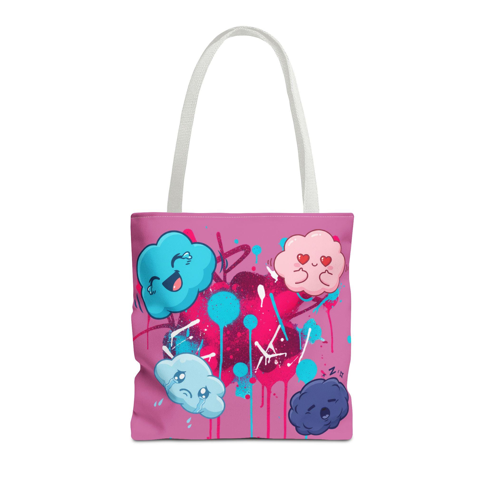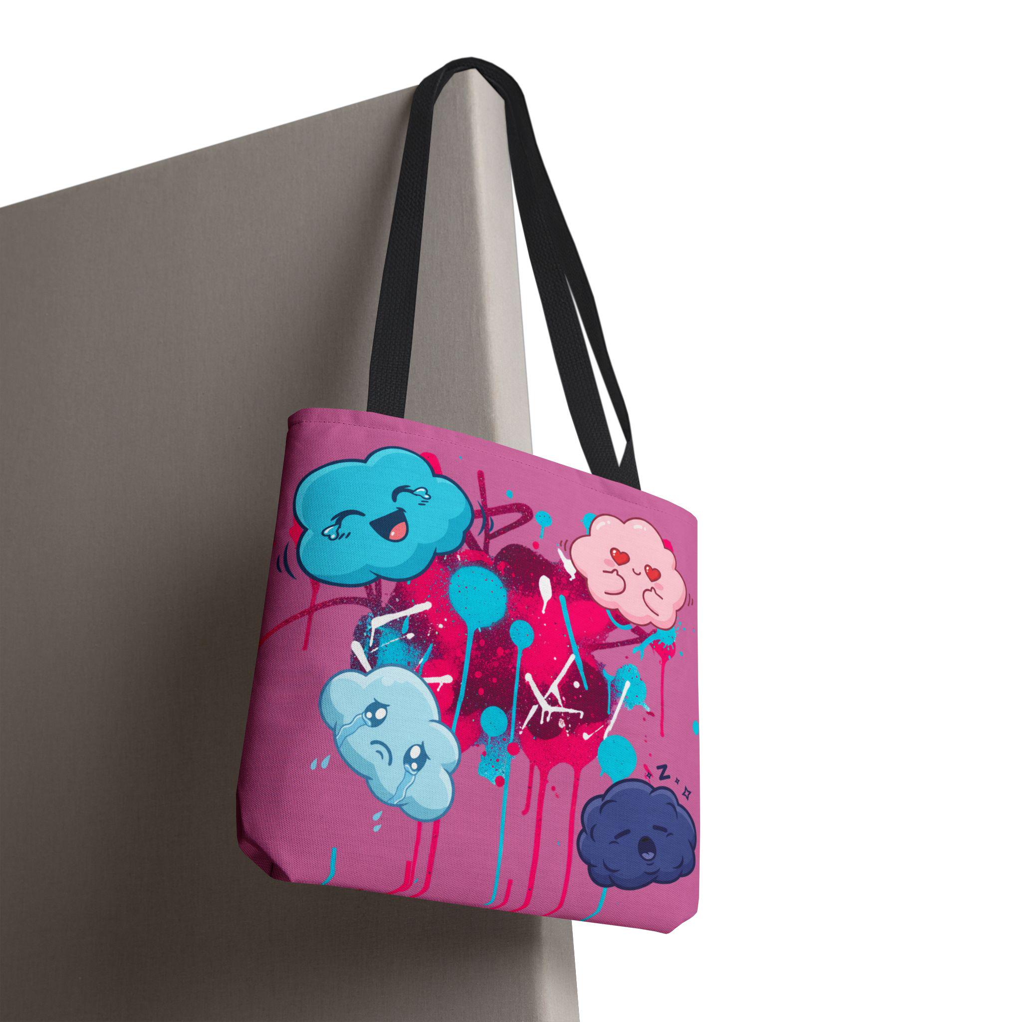 Bright, playful tote designed to carry color and cheer wherever you go. Soft cotton handles and a durable polyester body make it comfortable to carry and tough enough for daily use—groceries, sketchbooks, or a weekend market run. The print features bubbly, emotive cloud characters and splashes of paint on a vivid pink background, bringing a whimsical, street-art energy to errands, classes, and creative meetups. Boxed corners expand capacity so the bag keeps its shape and holds more than it looks. Choose handle colors to match your style and enjoy a light, quick-drying fabric that stands up to everyday life.