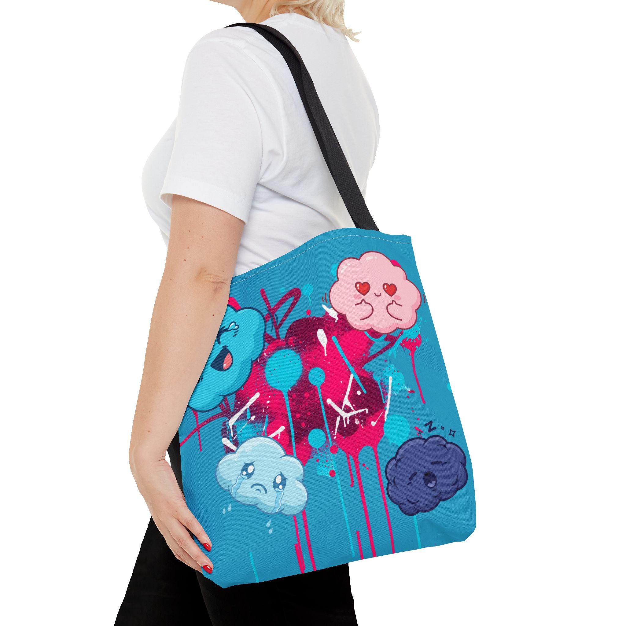 Bright, playful tote designed to carry color and cheer wherever you go. Soft cotton handles and a durable polyester body make it comfortable to carry and tough enough for daily use—groceries, sketchbooks, or a weekend market run. The print features bubbly, emotive cloud characters and splashes of paint on a vivid pink background, bringing a whimsical, street-art energy to errands, classes, and creative meetups. Boxed corners expand capacity so the bag keeps its shape and holds more than it looks. Choose handle colors to match your style and enjoy a light, quick-drying fabric that stands up to everyday life.