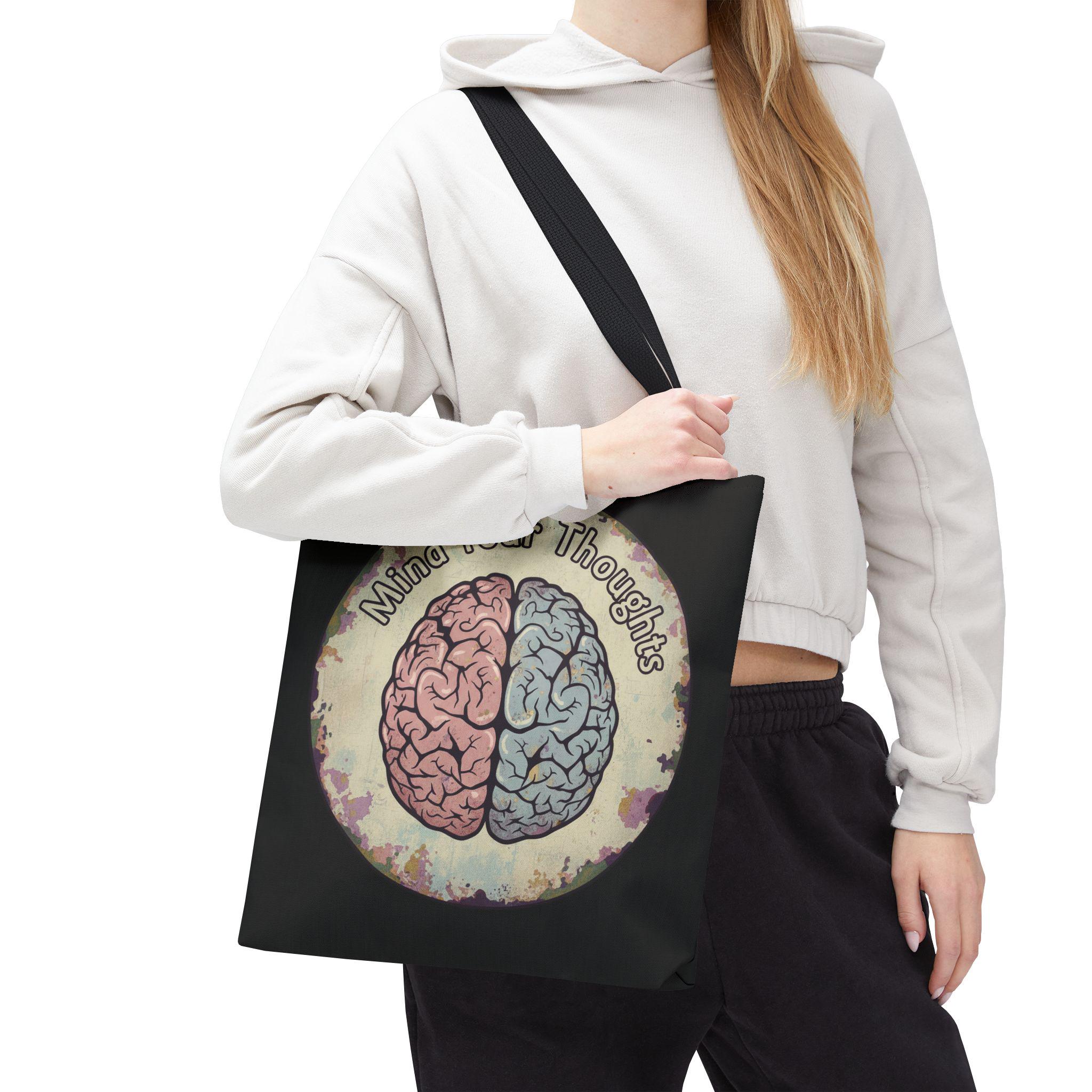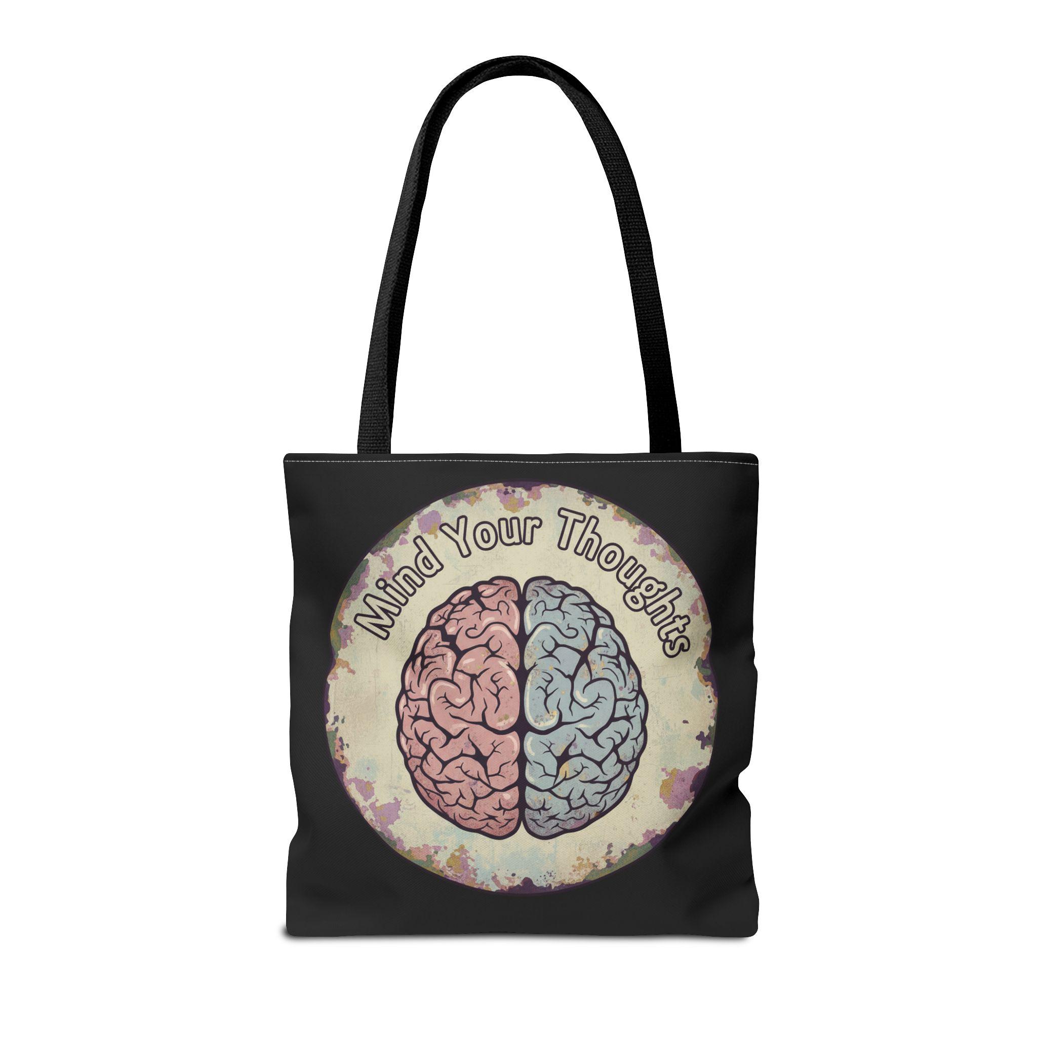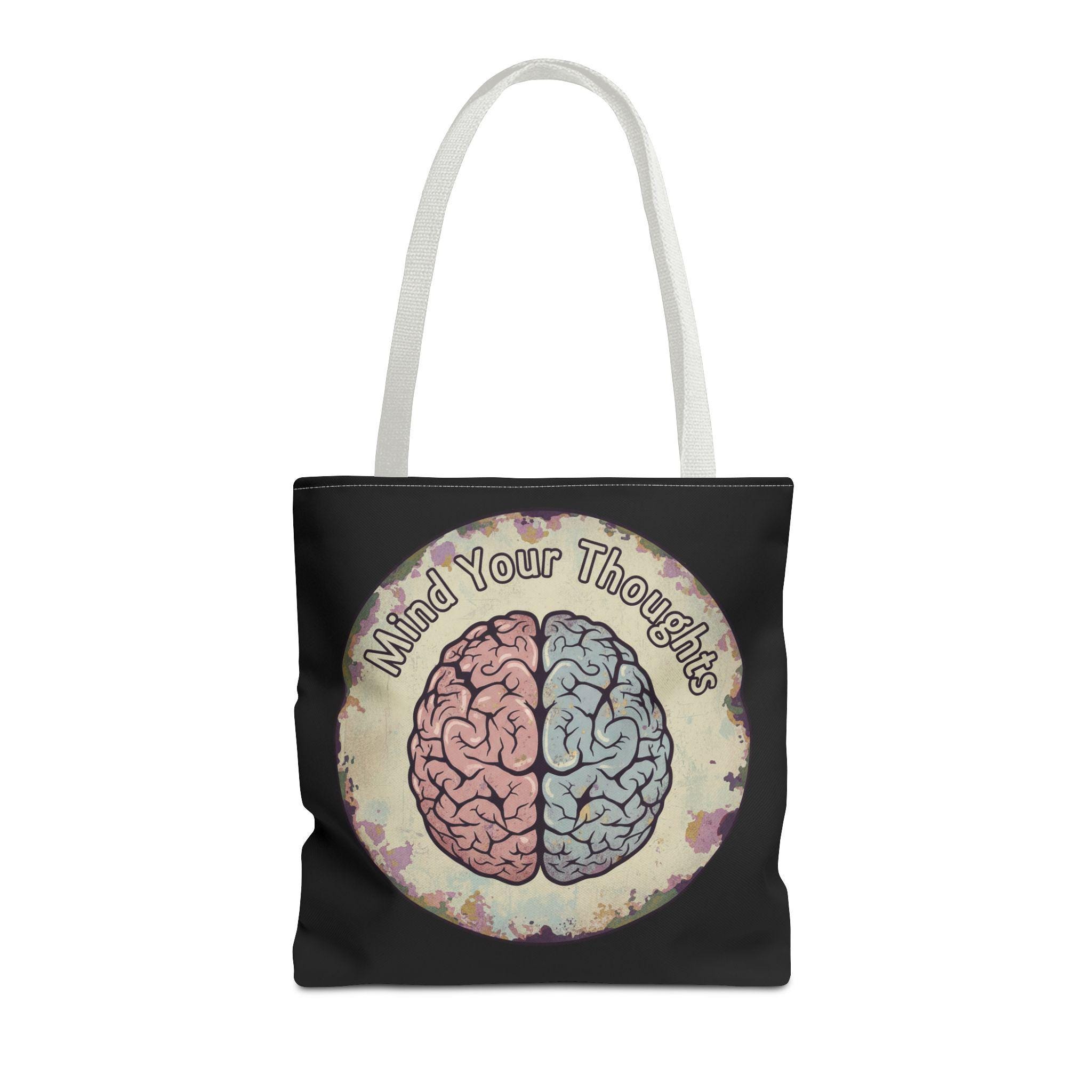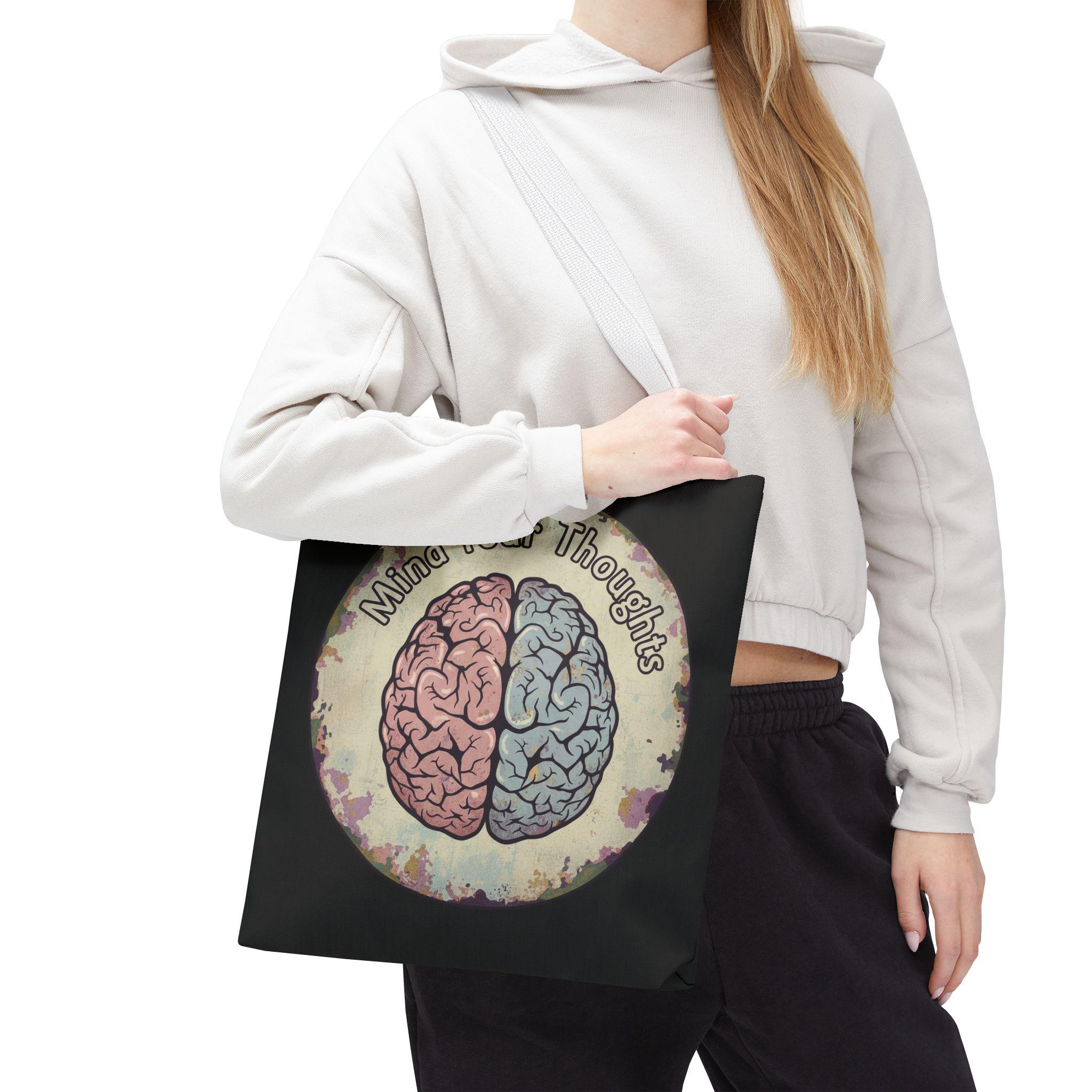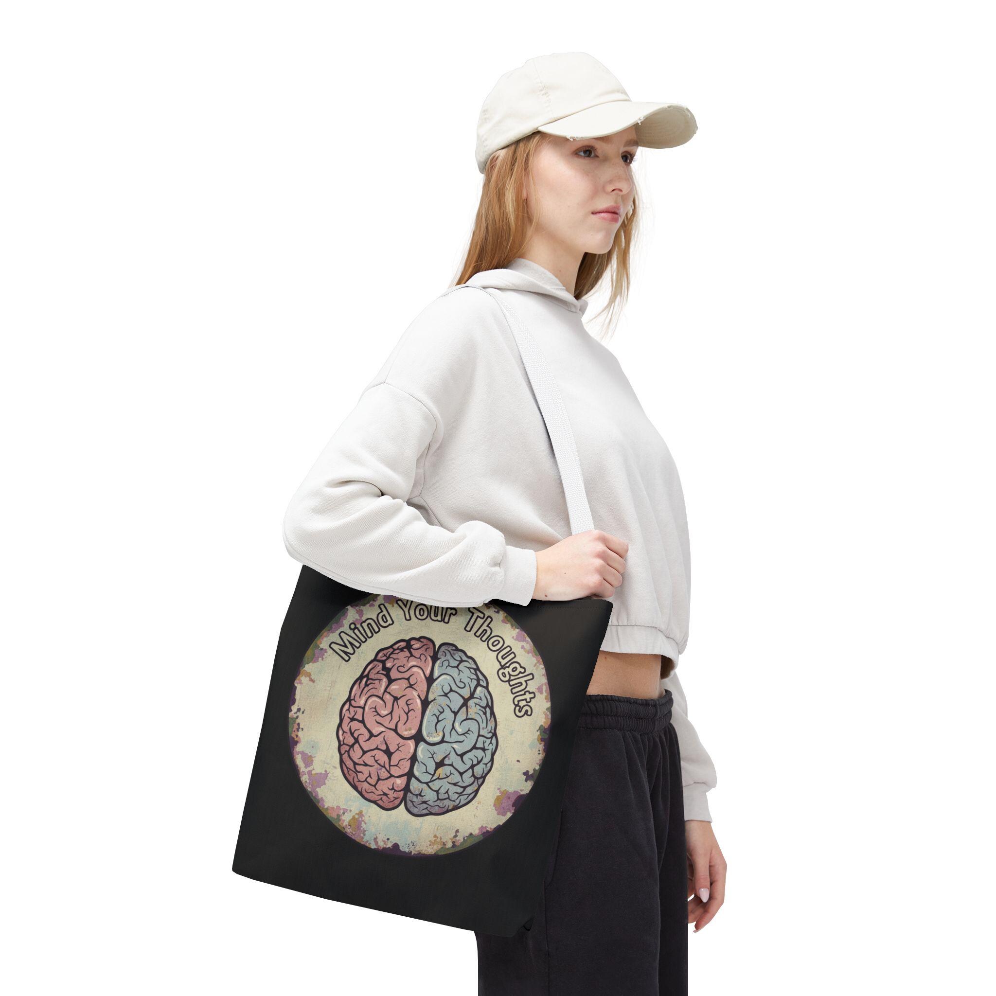 Carry a thoughtful reminder wherever you go. This roomy polyester tote features a hand-drawn-style brain split into warm and cool halves with the phrase “Mind Your Thoughts” circling above. The muted, watercolor-like background and black body give it a slightly vintage, introspective vibe—great for carrying journals, groceries, or the small tools of a creative life. It feels sturdy at the shoulder, holds its shape, and becomes a quiet conversation starter when you walk into a café or class.