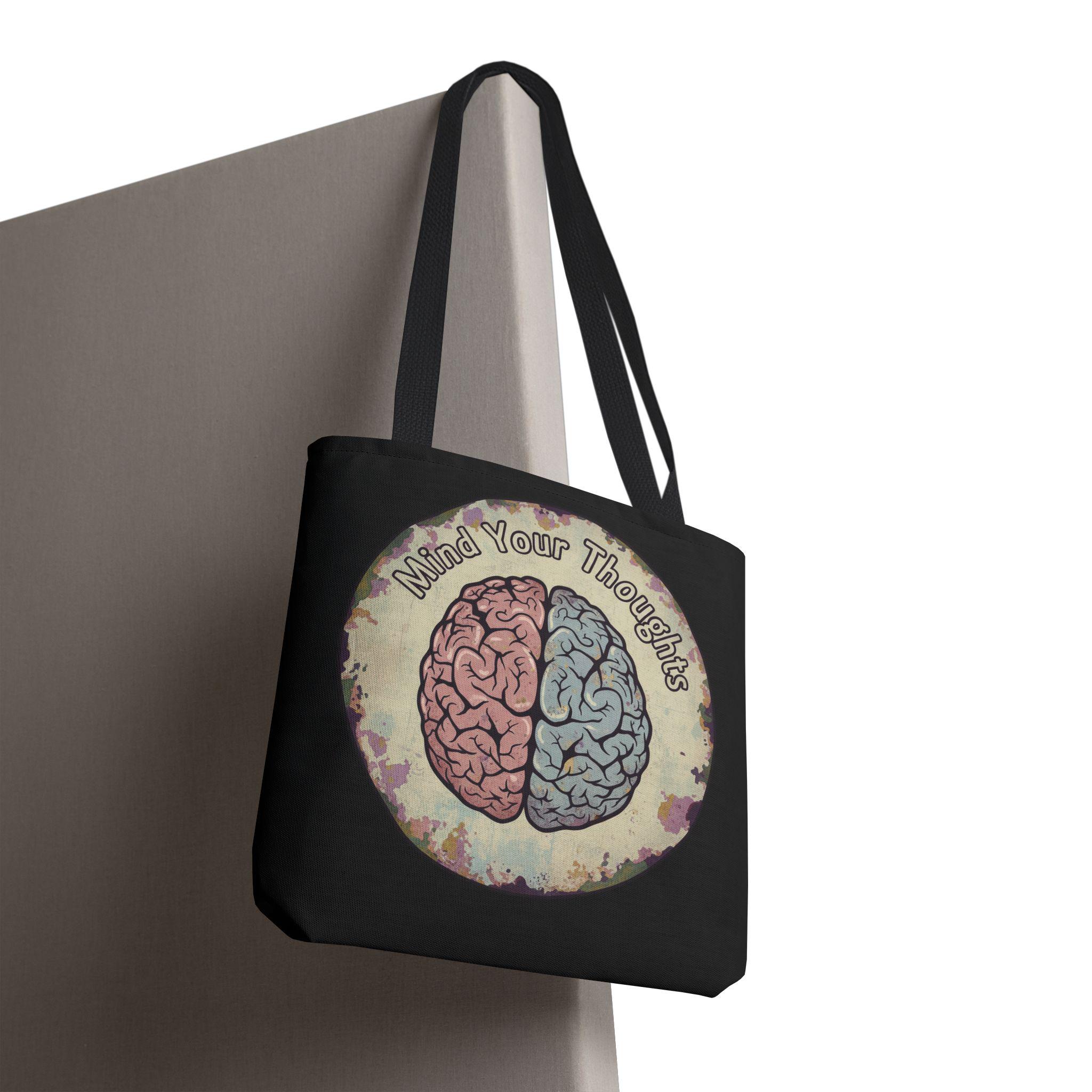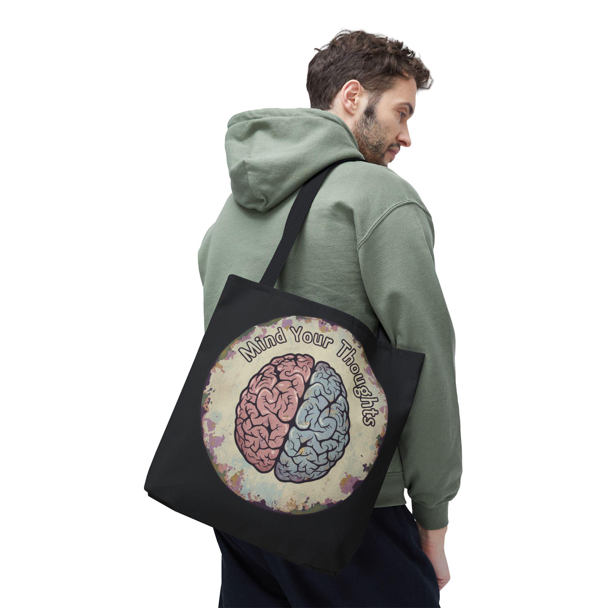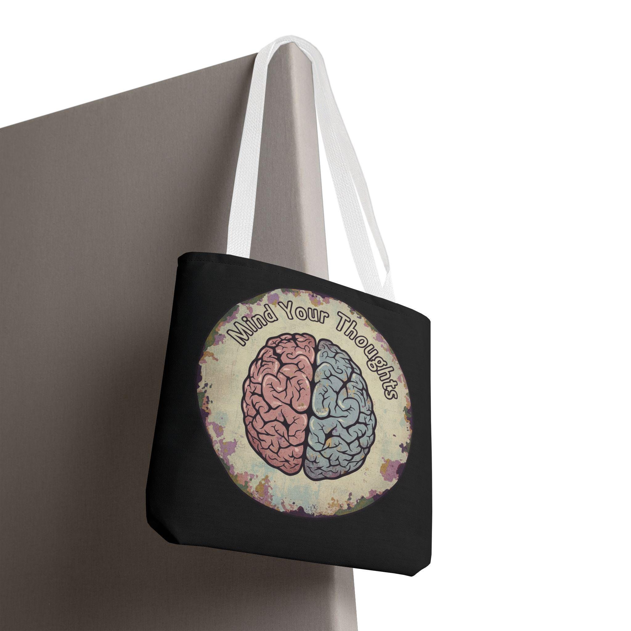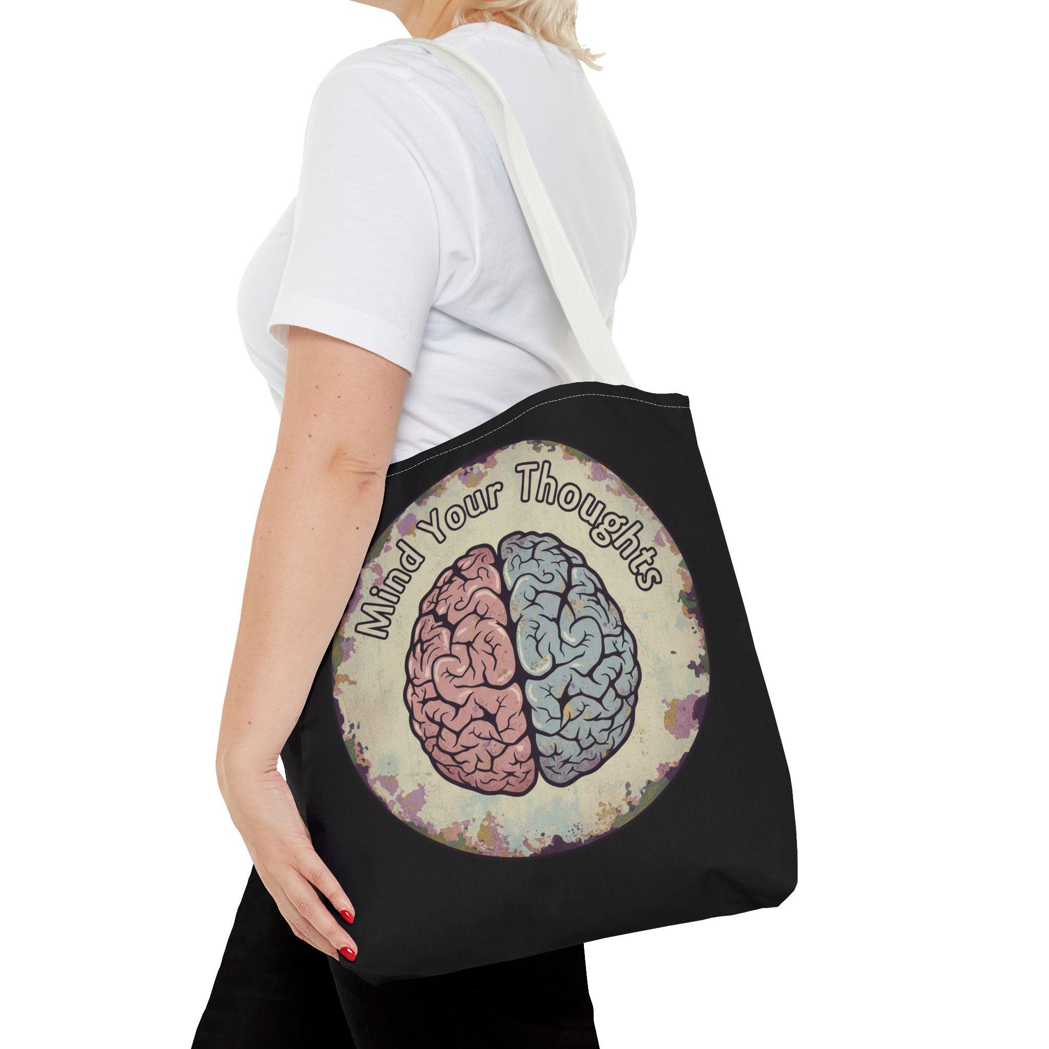 Carry a thoughtful reminder wherever you go. This roomy polyester tote features a hand-drawn-style brain split into warm and cool halves with the phrase “Mind Your Thoughts” circling above. The muted, watercolor-like background and black body give it a slightly vintage, introspective vibe—great for carrying journals, groceries, or the small tools of a creative life. It feels sturdy at the shoulder, holds its shape, and becomes a quiet conversation starter when you walk into a café or class.