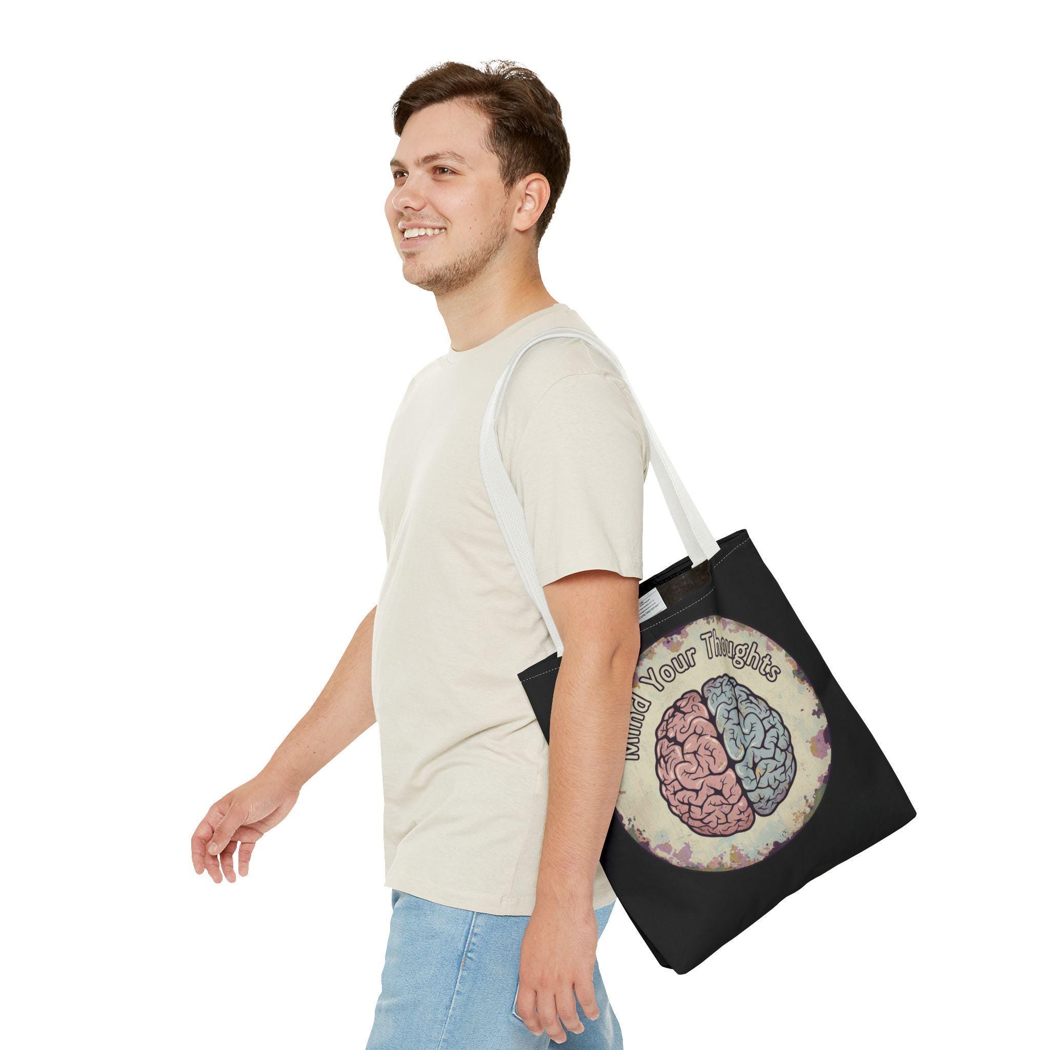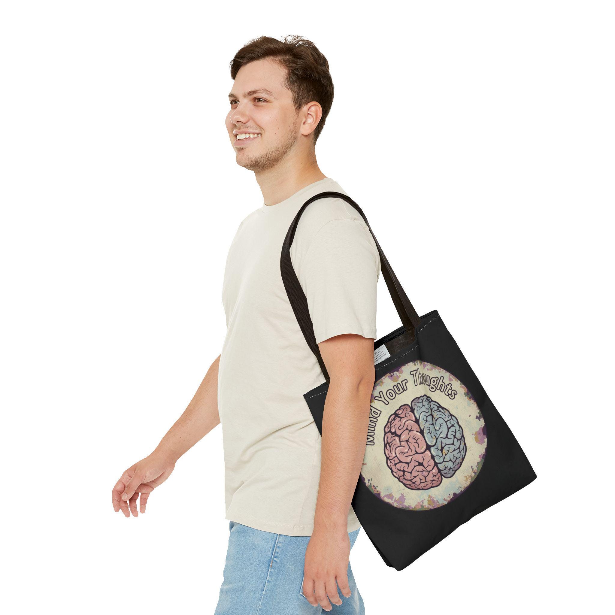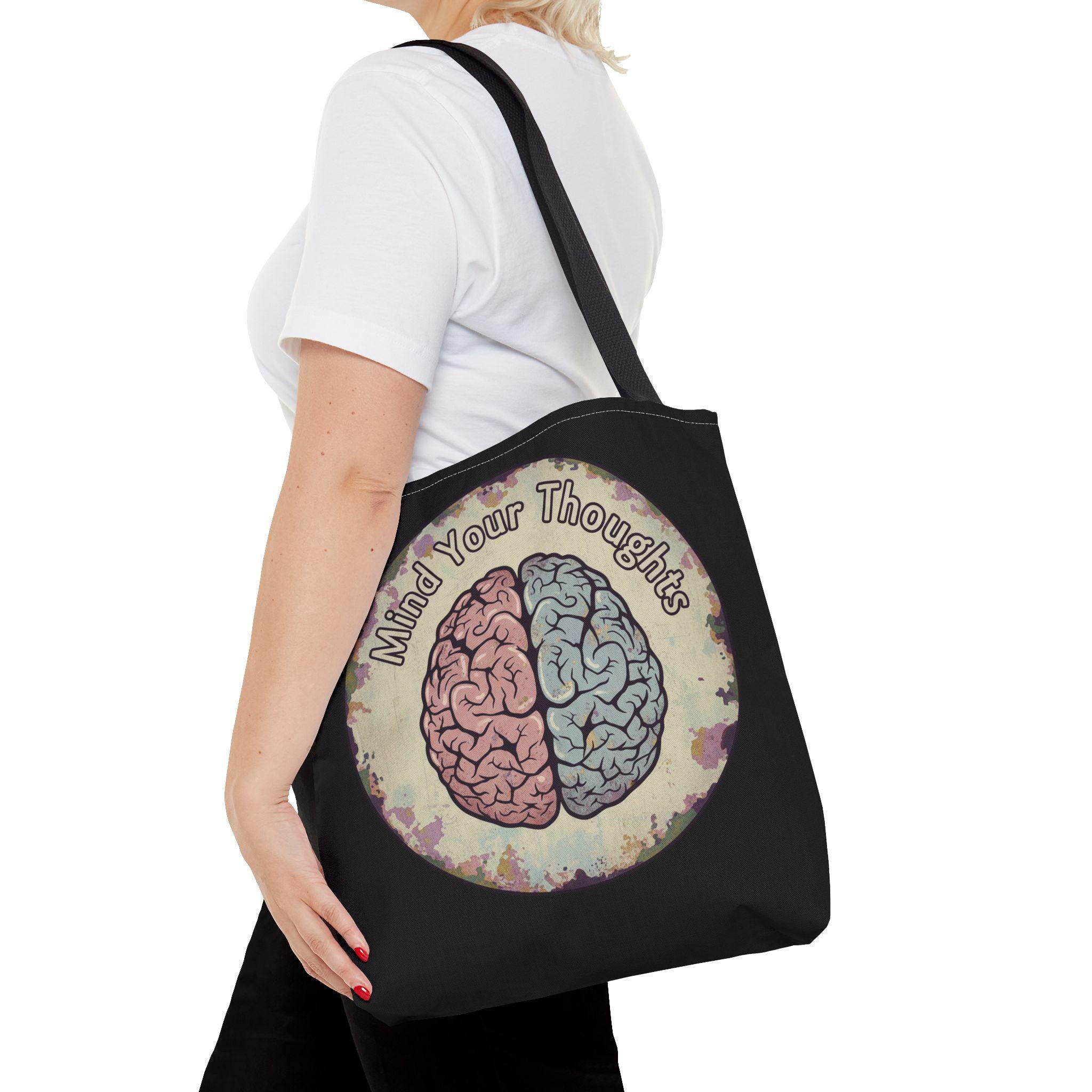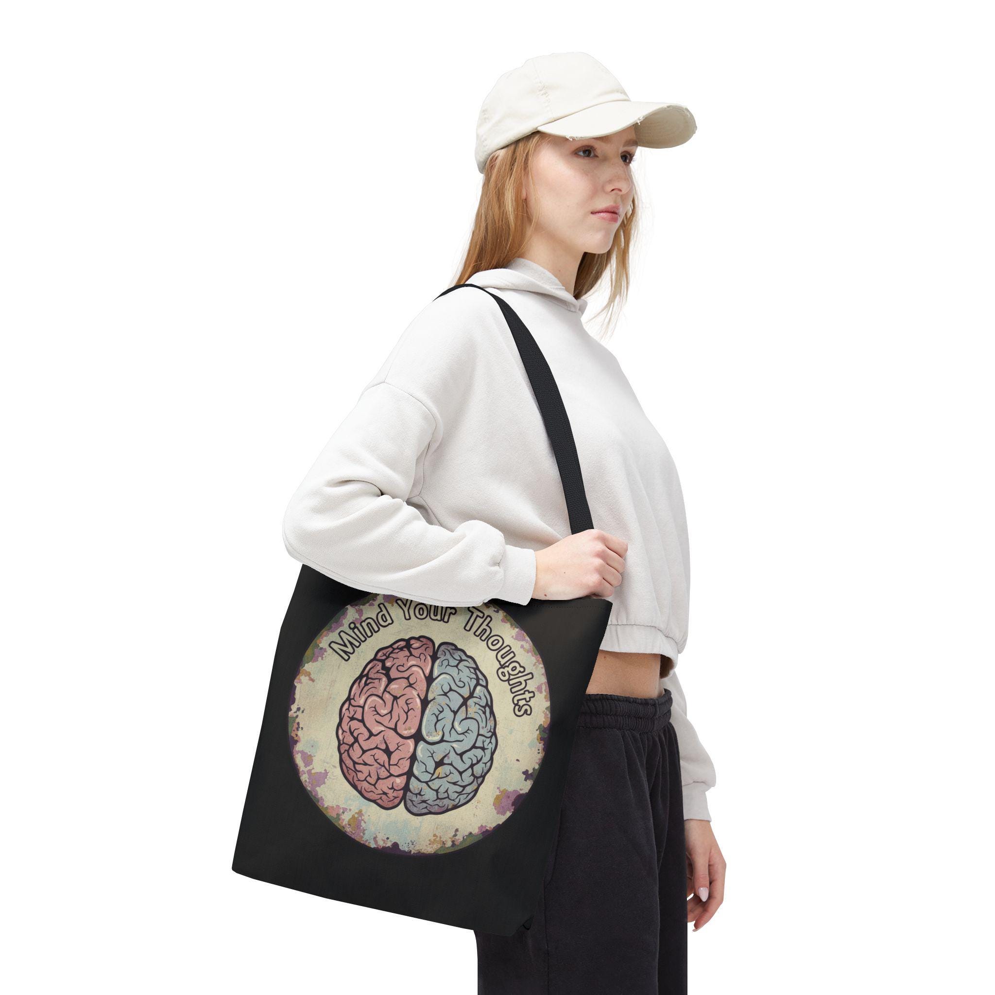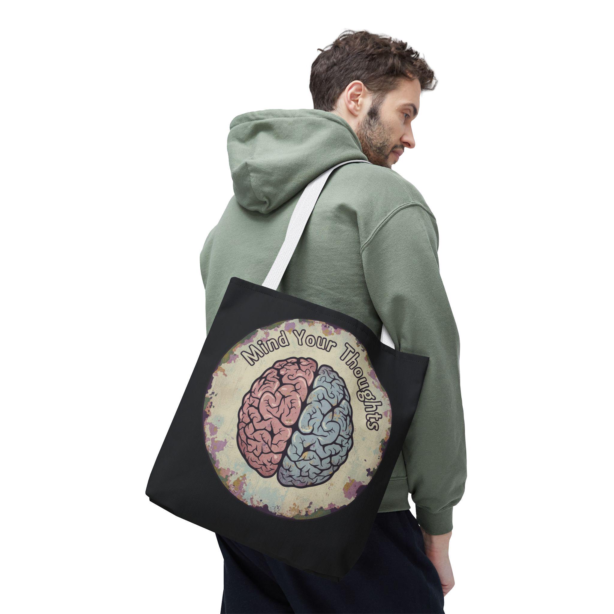 Carry a thoughtful reminder wherever you go. This roomy polyester tote features a hand-drawn-style brain split into warm and cool halves with the phrase “Mind Your Thoughts” circling above. The muted, watercolor-like background and black body give it a slightly vintage, introspective vibe—great for carrying journals, groceries, or the small tools of a creative life. It feels sturdy at the shoulder, holds its shape, and becomes a quiet conversation starter when you walk into a café or class.