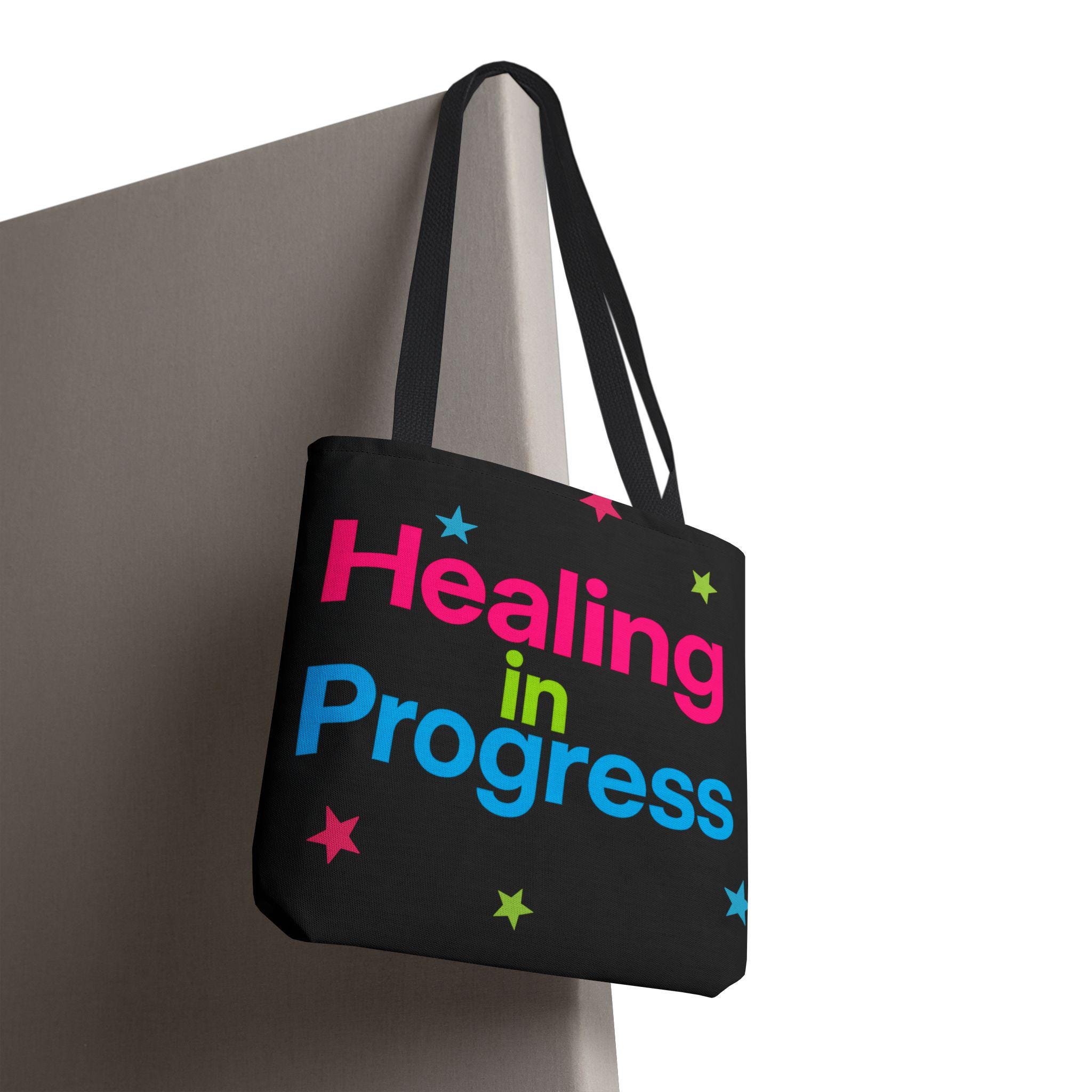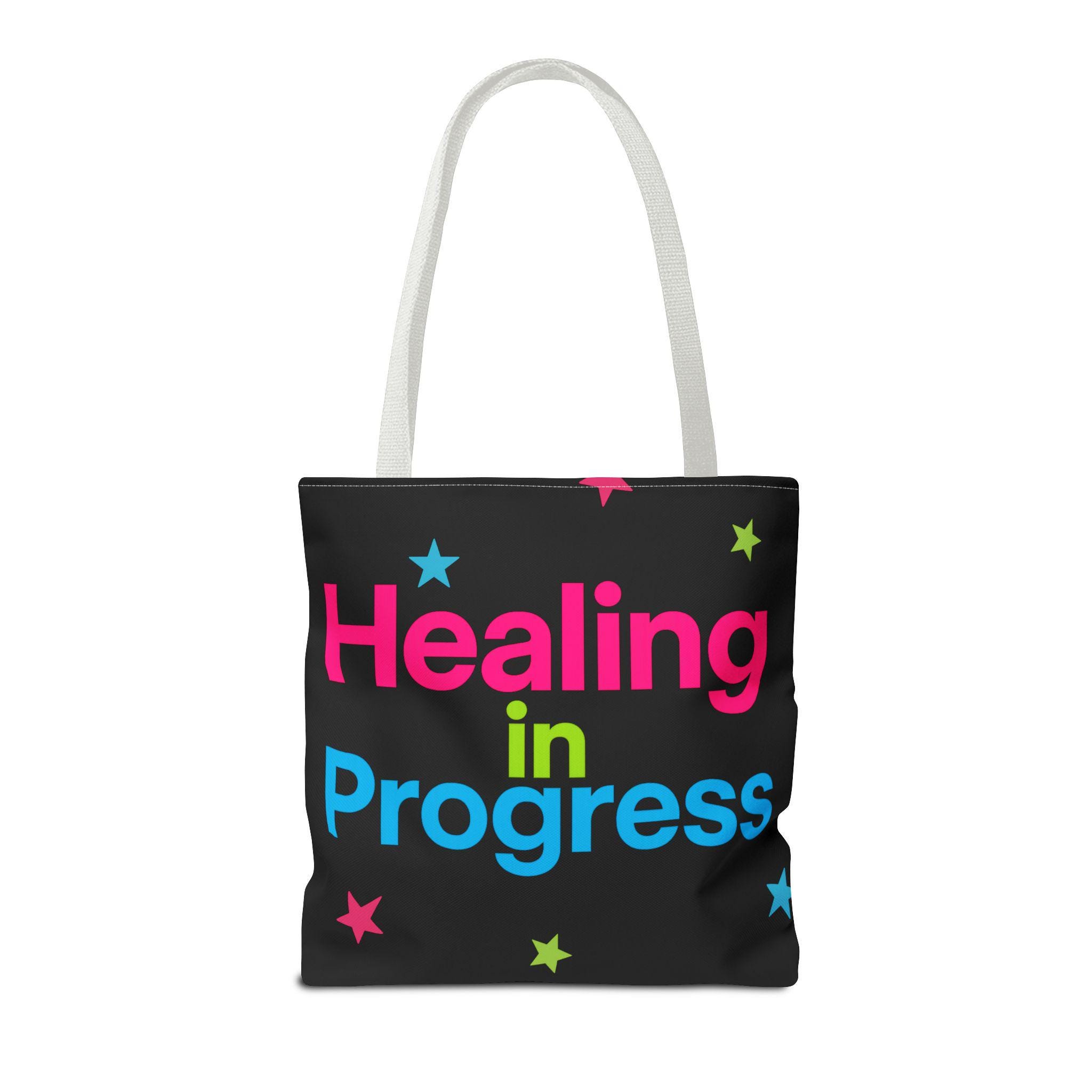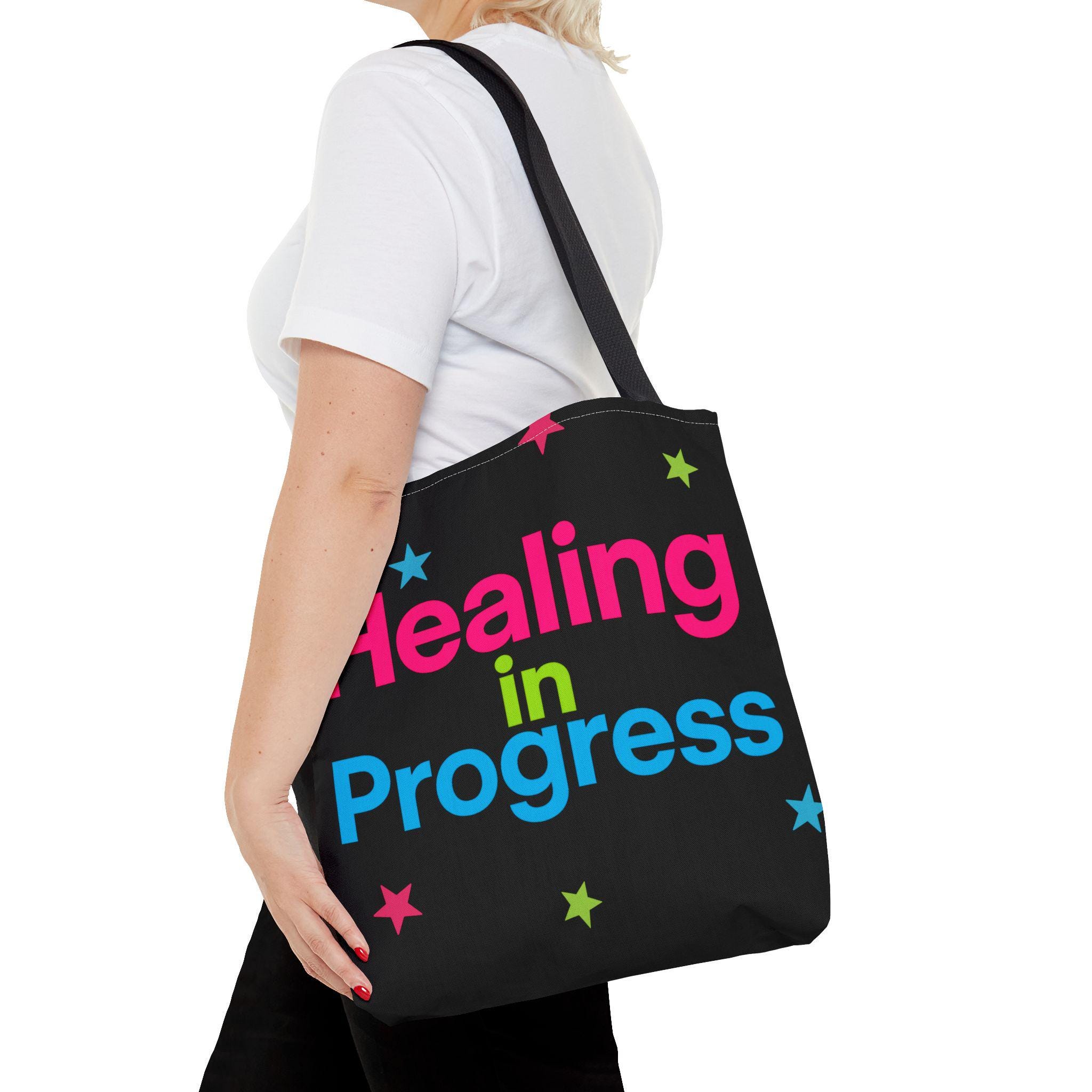 Carry a quiet declaration of growth with this bold, everyday tote. The black canvas lets the neon lettering — bright pink, electric blue, and lime green — pop with hopeful energy. Scattered stars add a playful, gentle touch, turning a practical bag into a small statement of resilience and self-care. Spacious boxed corners and a single large compartment hold a journal, water bottle, knitting project, or clinic essentials, while reinforced handles stand up to daily wear. It’s the kind of bag someone reaches for on appointments, walks, or slow Sundays when small wins matter.