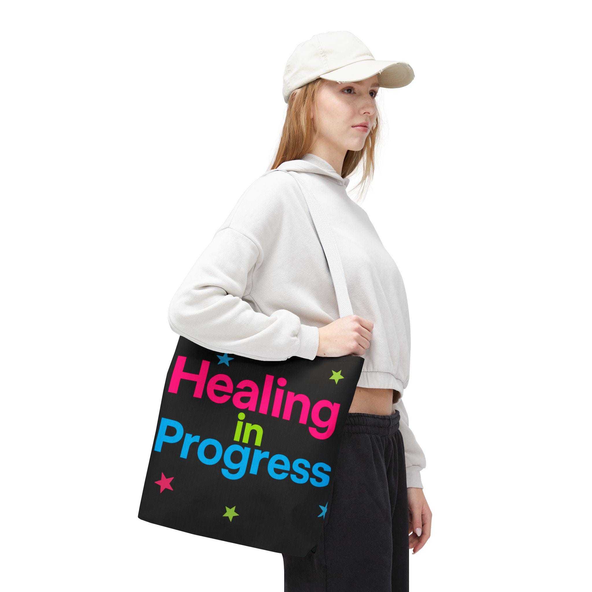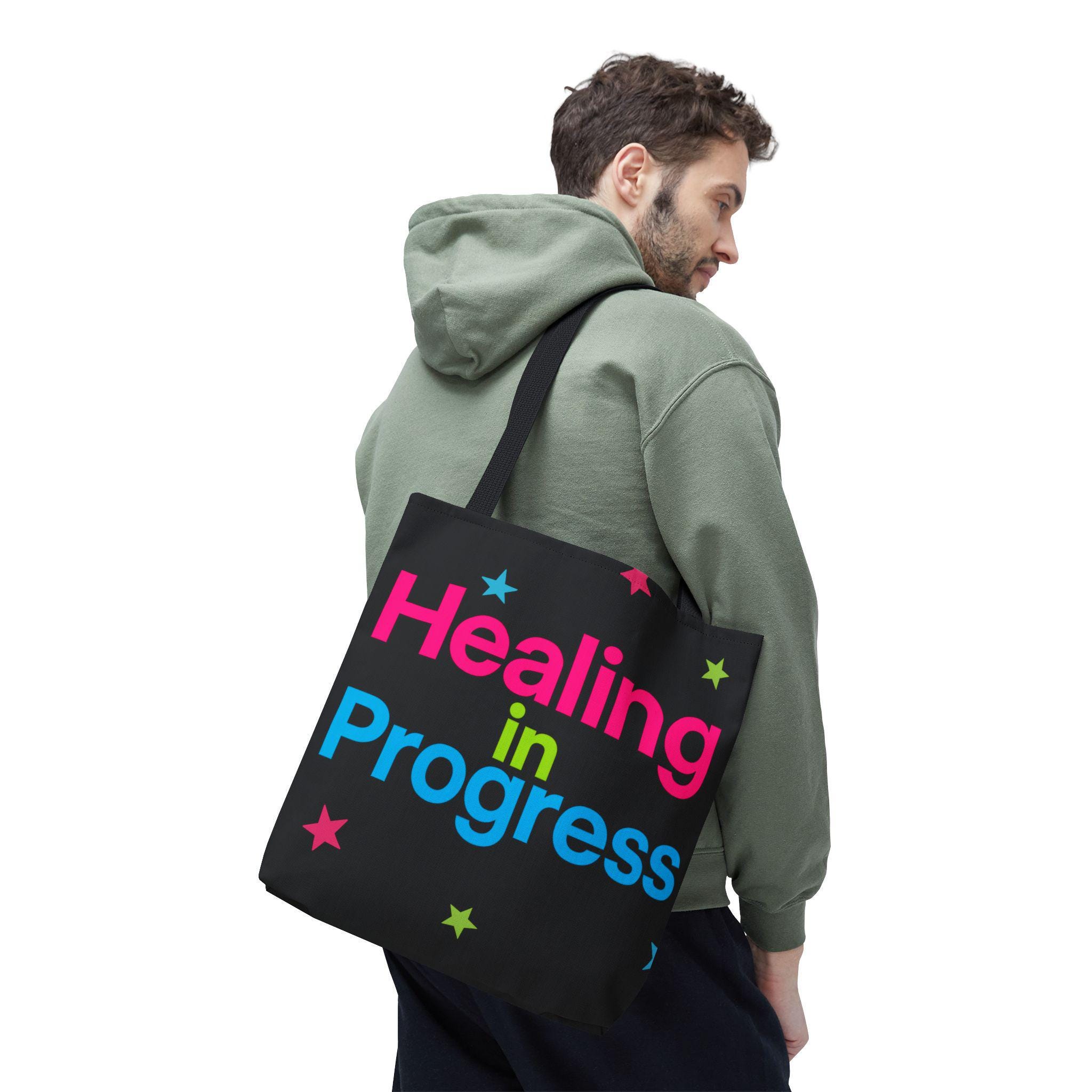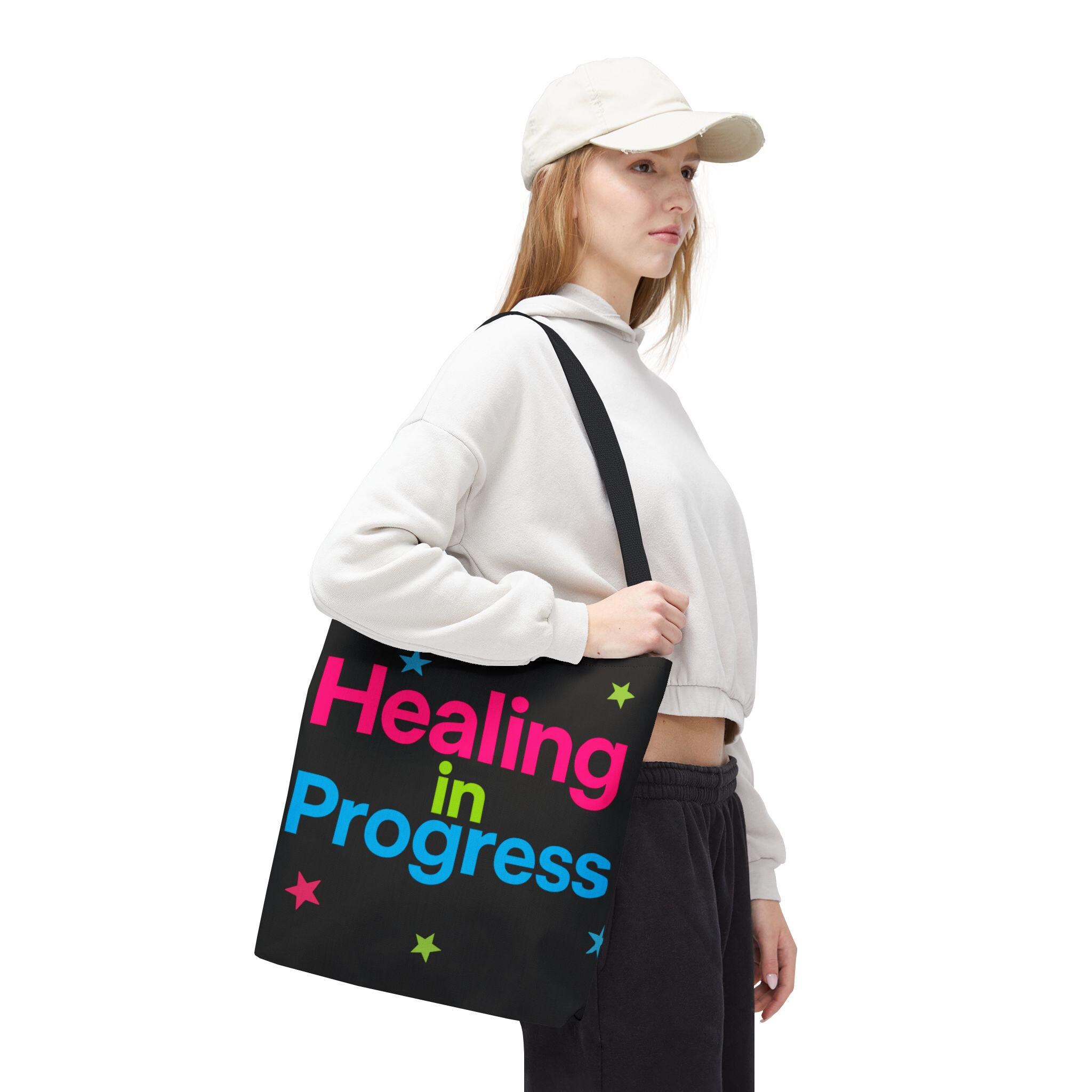 Carry a quiet declaration of growth with this bold, everyday tote. The black canvas lets the neon lettering — bright pink, electric blue, and lime green — pop with hopeful energy. Scattered stars add a playful, gentle touch, turning a practical bag into a small statement of resilience and self-care. Spacious boxed corners and a single large compartment hold a journal, water bottle, knitting project, or clinic essentials, while reinforced handles stand up to daily wear. It’s the kind of bag someone reaches for on appointments, walks, or slow Sundays when small wins matter.