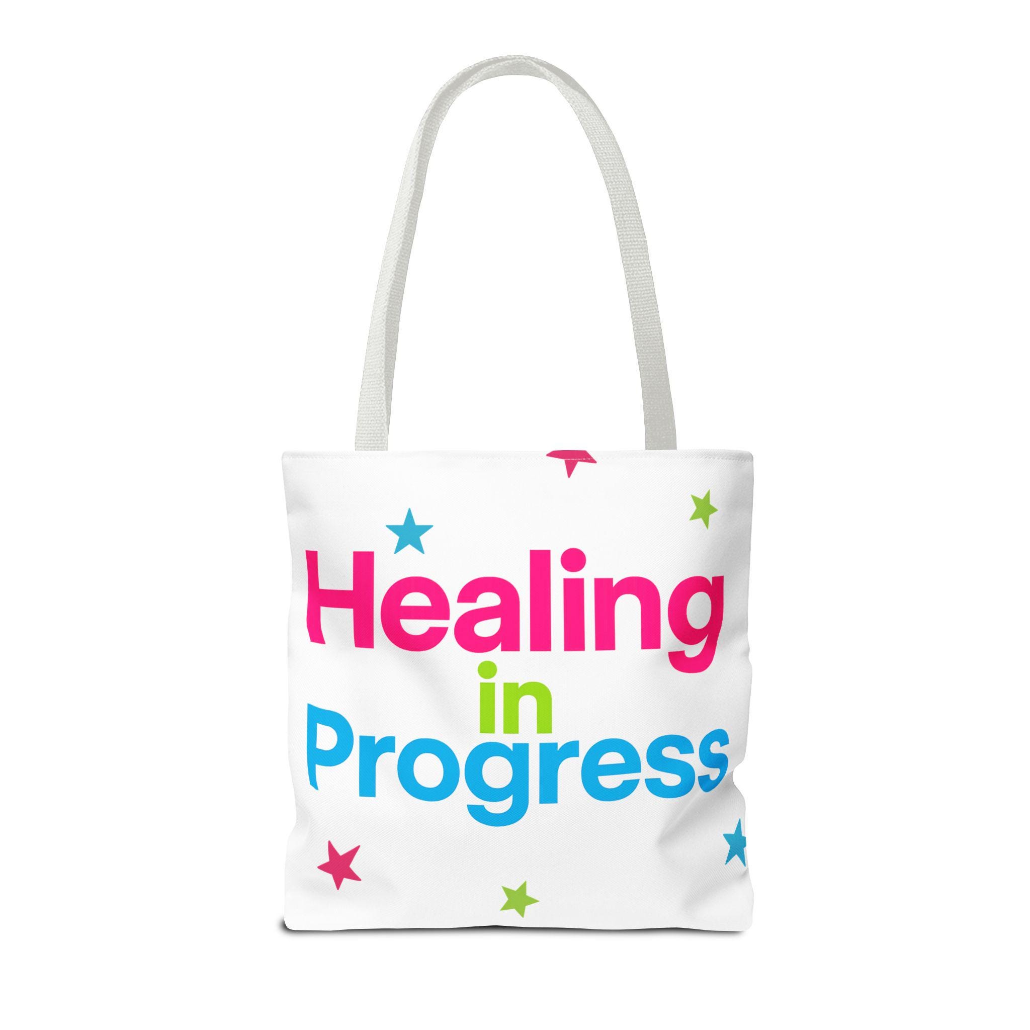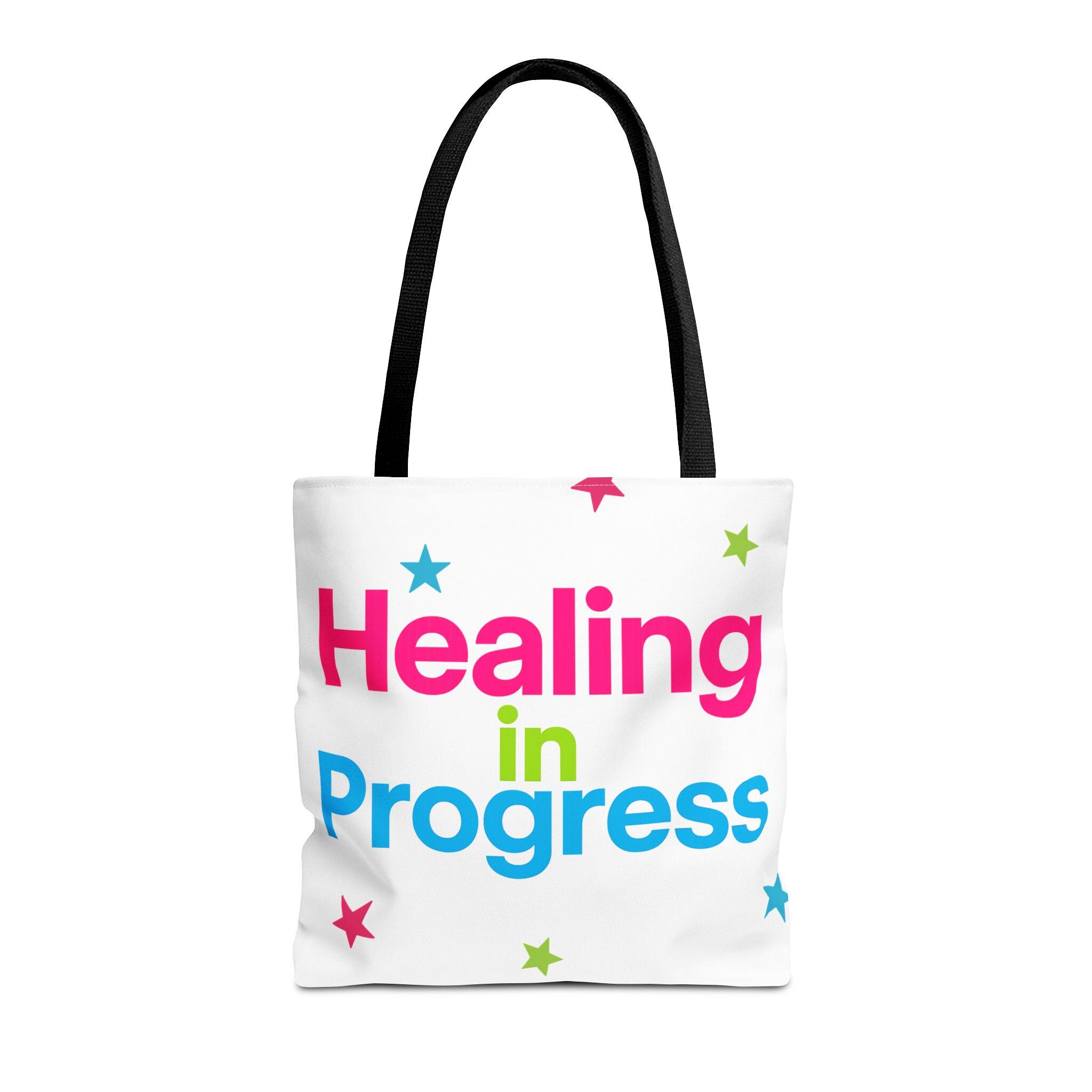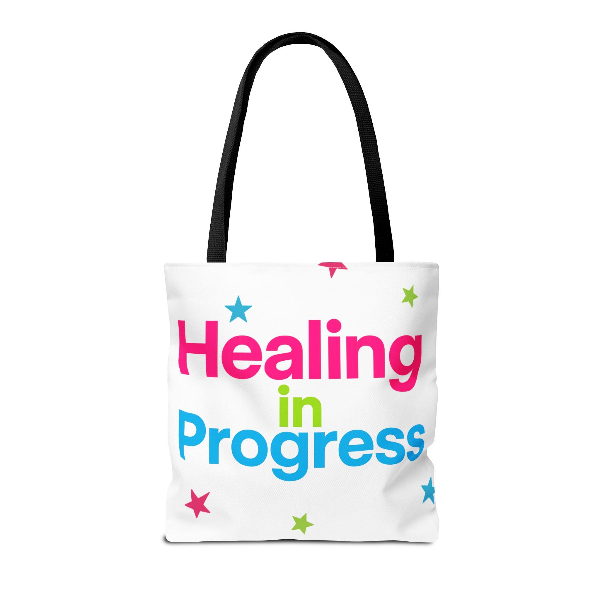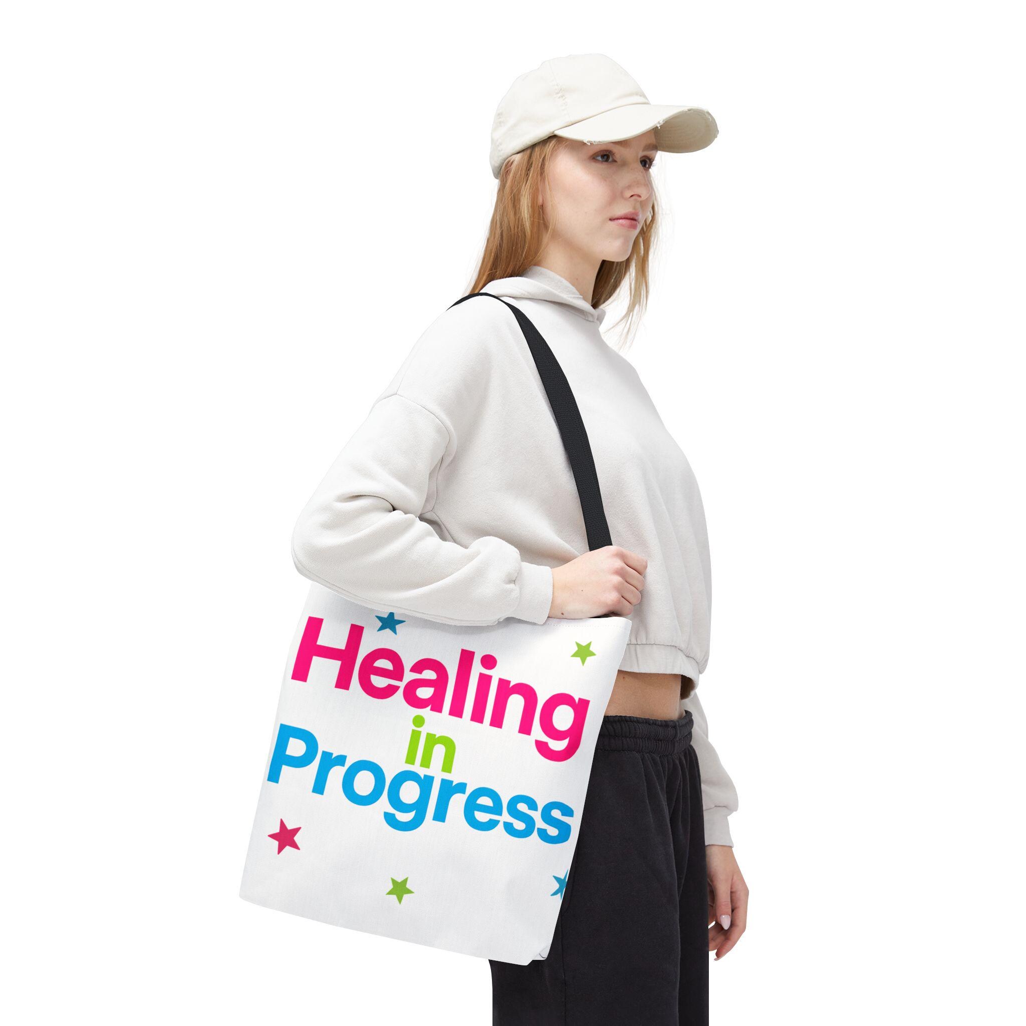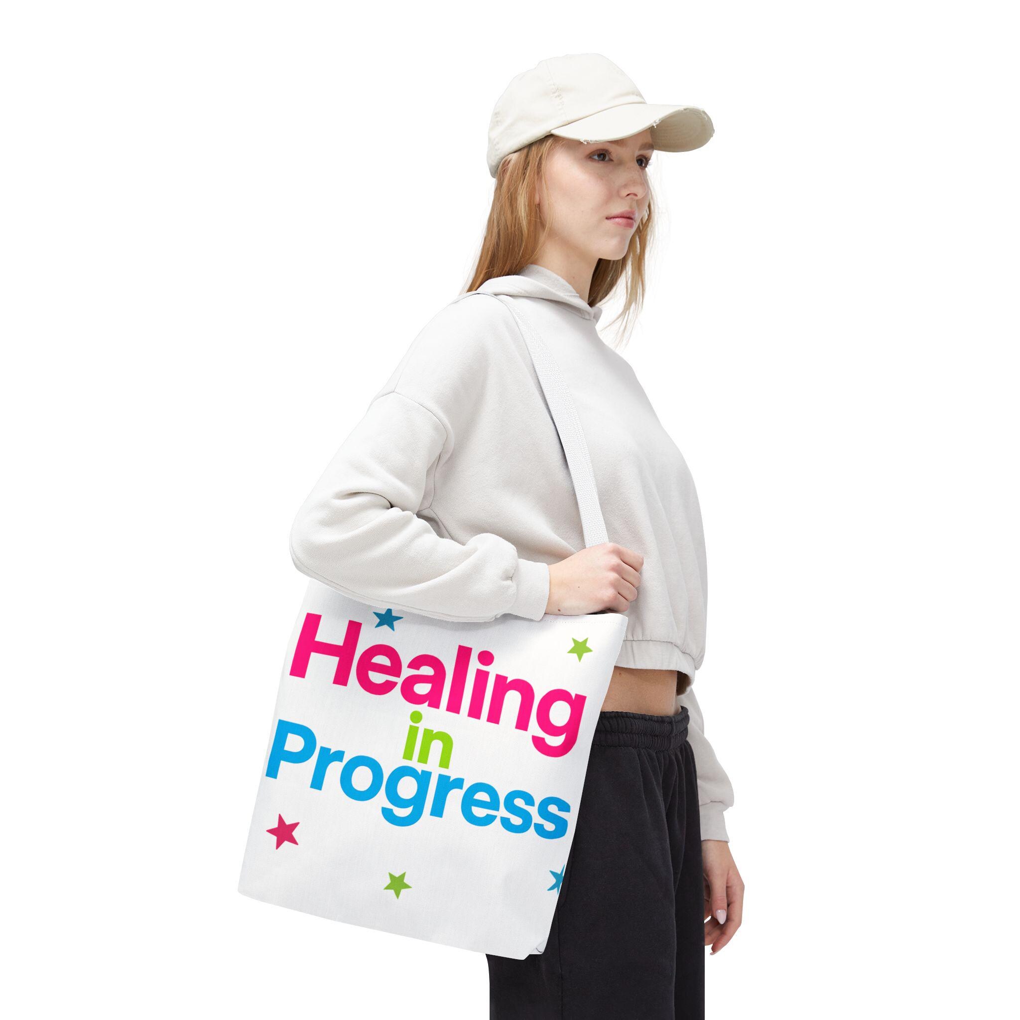 Carry a quiet declaration of growth with this bold, everyday tote. The black canvas lets the neon lettering — bright pink, electric blue, and lime green — pop with hopeful energy. Scattered stars add a playful, gentle touch, turning a practical bag into a small statement of resilience and self-care. Spacious boxed corners and a single large compartment hold a journal, water bottle, knitting project, or clinic essentials, while reinforced handles stand up to daily wear. It’s the kind of bag someone reaches for on appointments, walks, or slow Sundays when small wins matter.