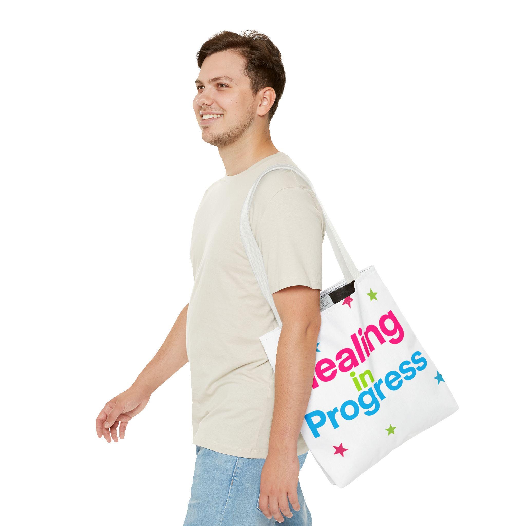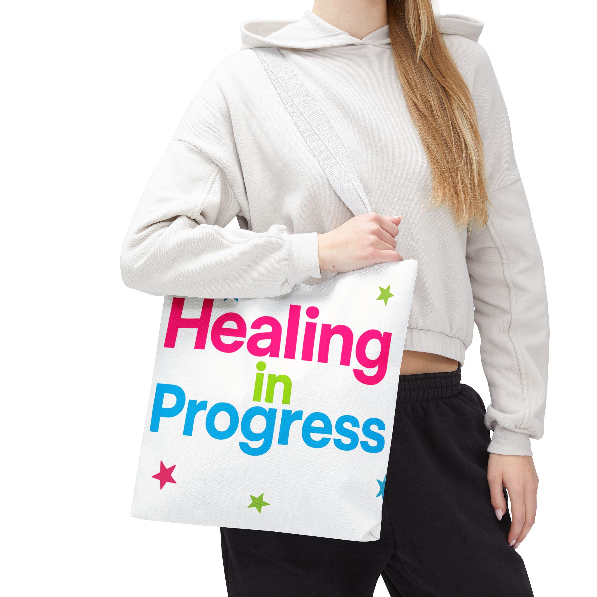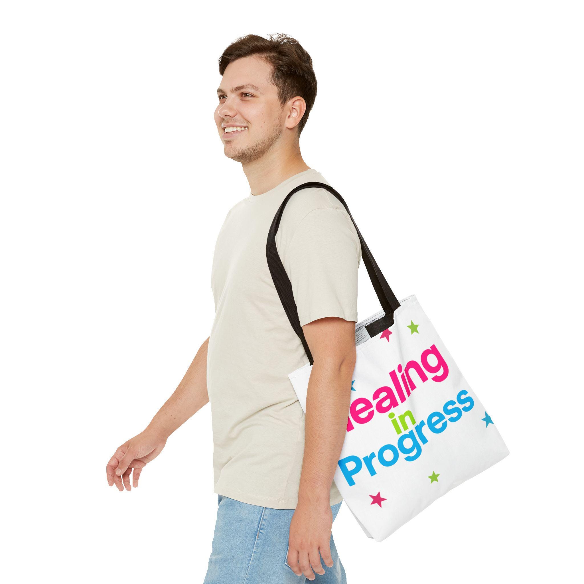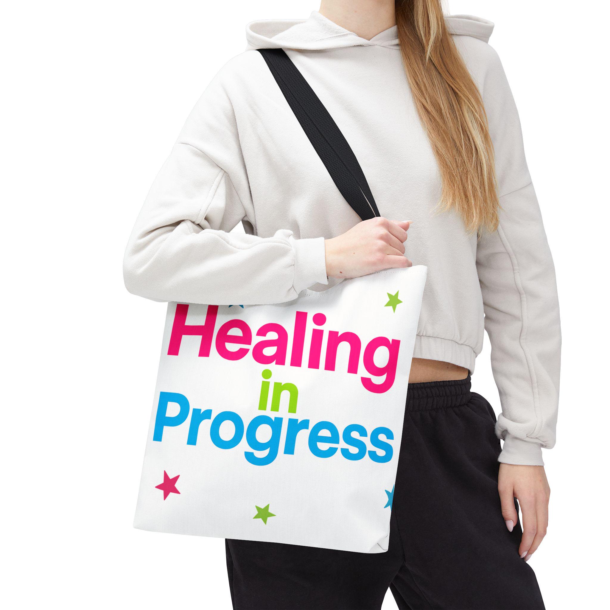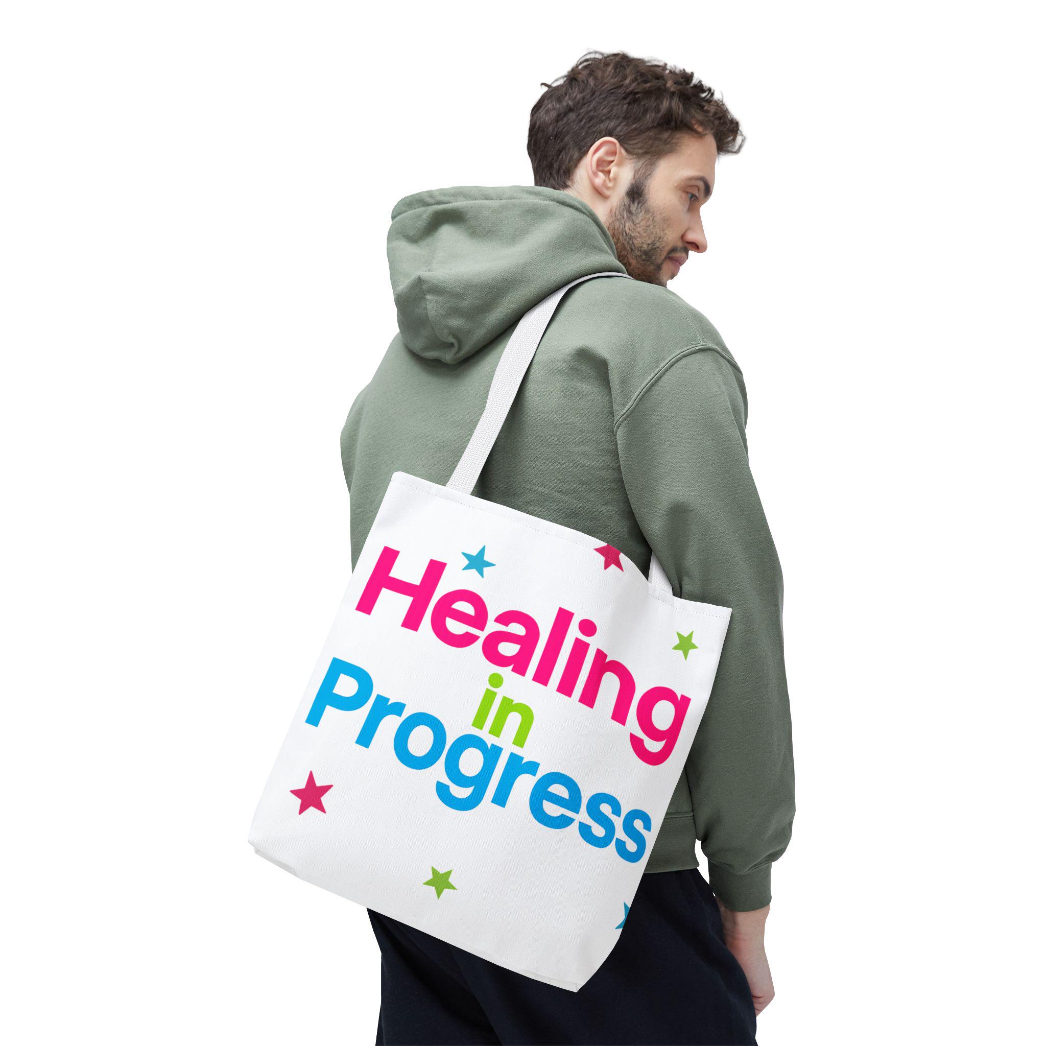 Carry a quiet declaration of growth with this bold, everyday tote. The black canvas lets the neon lettering — bright pink, electric blue, and lime green — pop with hopeful energy. Scattered stars add a playful, gentle touch, turning a practical bag into a small statement of resilience and self-care. Spacious boxed corners and a single large compartment hold a journal, water bottle, knitting project, or clinic essentials, while reinforced handles stand up to daily wear. It’s the kind of bag someone reaches for on appointments, walks, or slow Sundays when small wins matter.