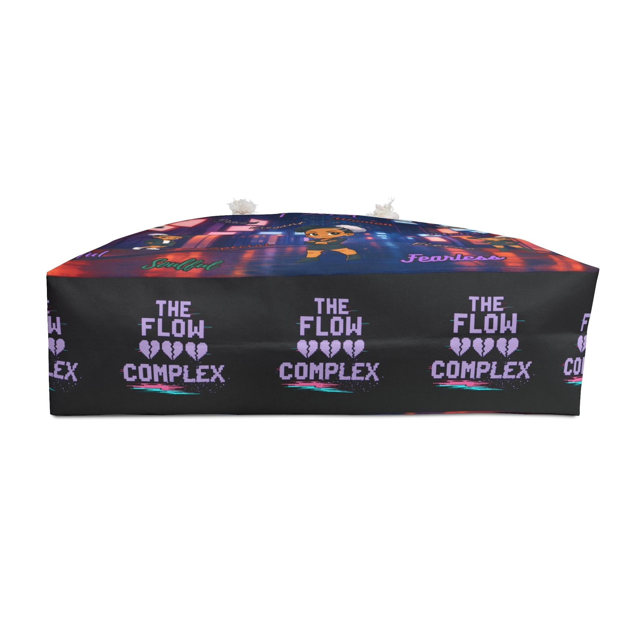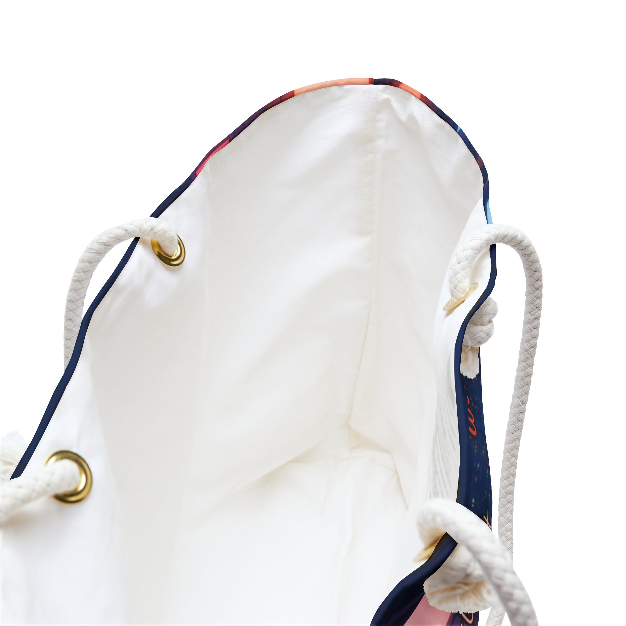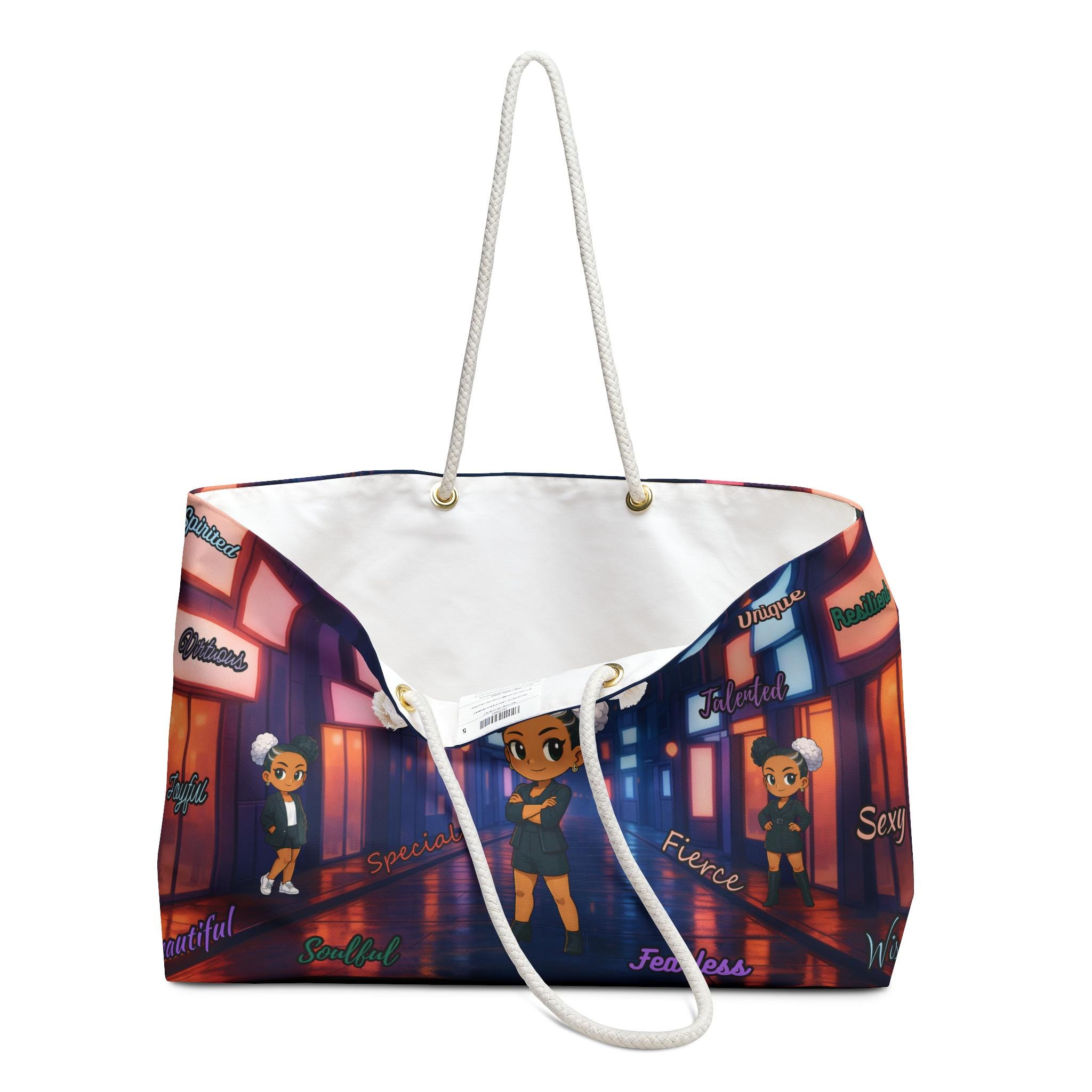 This roomy weekender bag carries more than belongings — it carries confidence. The vibrant city-at-night print surrounds a bold central character and uplifting affirmations, turning every errand, overnight trip, or studio visit into a little statement of self-worth. Soft cream rope handles sit comfortably over the shoulder while the T-bottom shape gives structure and keeps essentials upright. Inside, a smooth cream sheeting lining protects contents and makes packing simple. Lightweight, wrinkle-resistant spun polyester keeps the colorful artwork crisp, whether you’re heading to a weekend market, a night rehearsal, or a sunrise train.