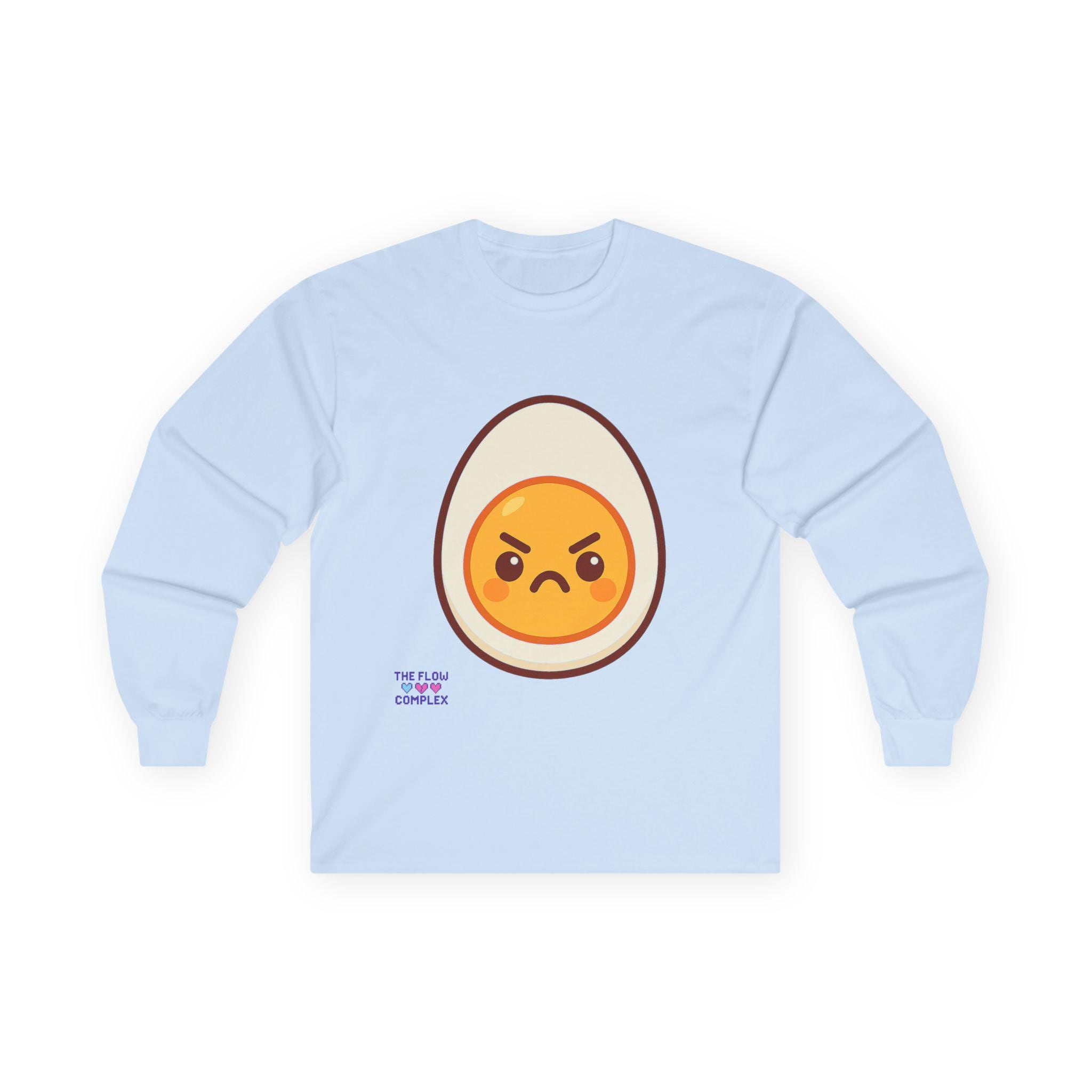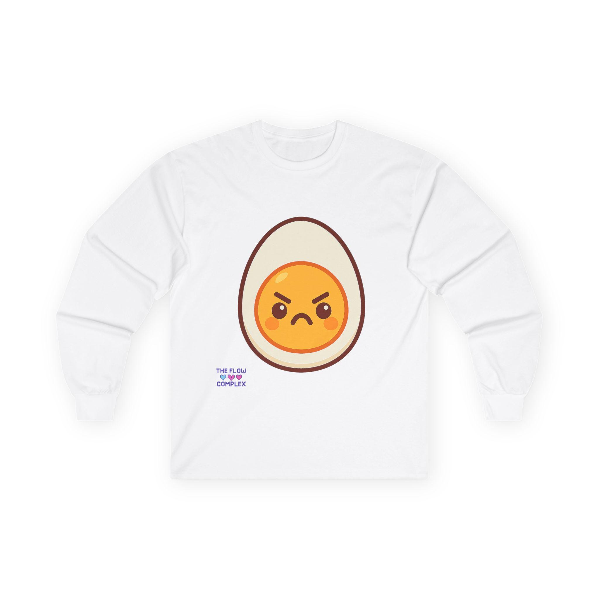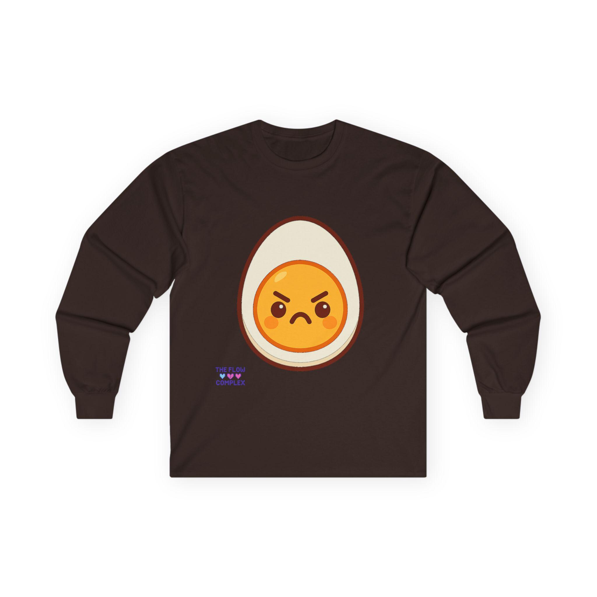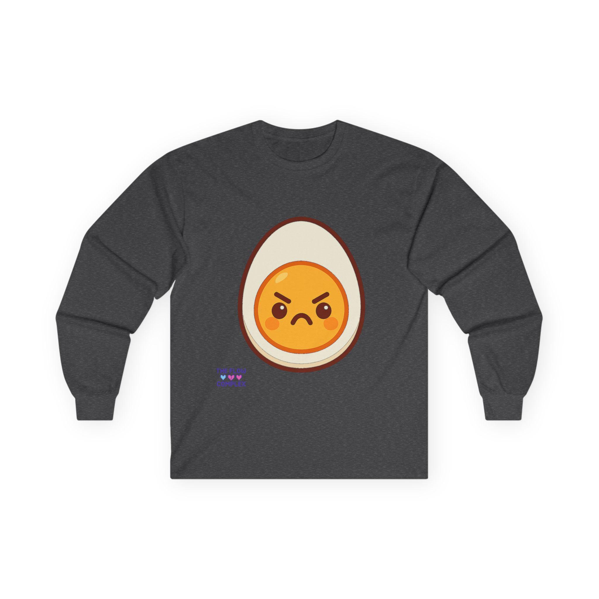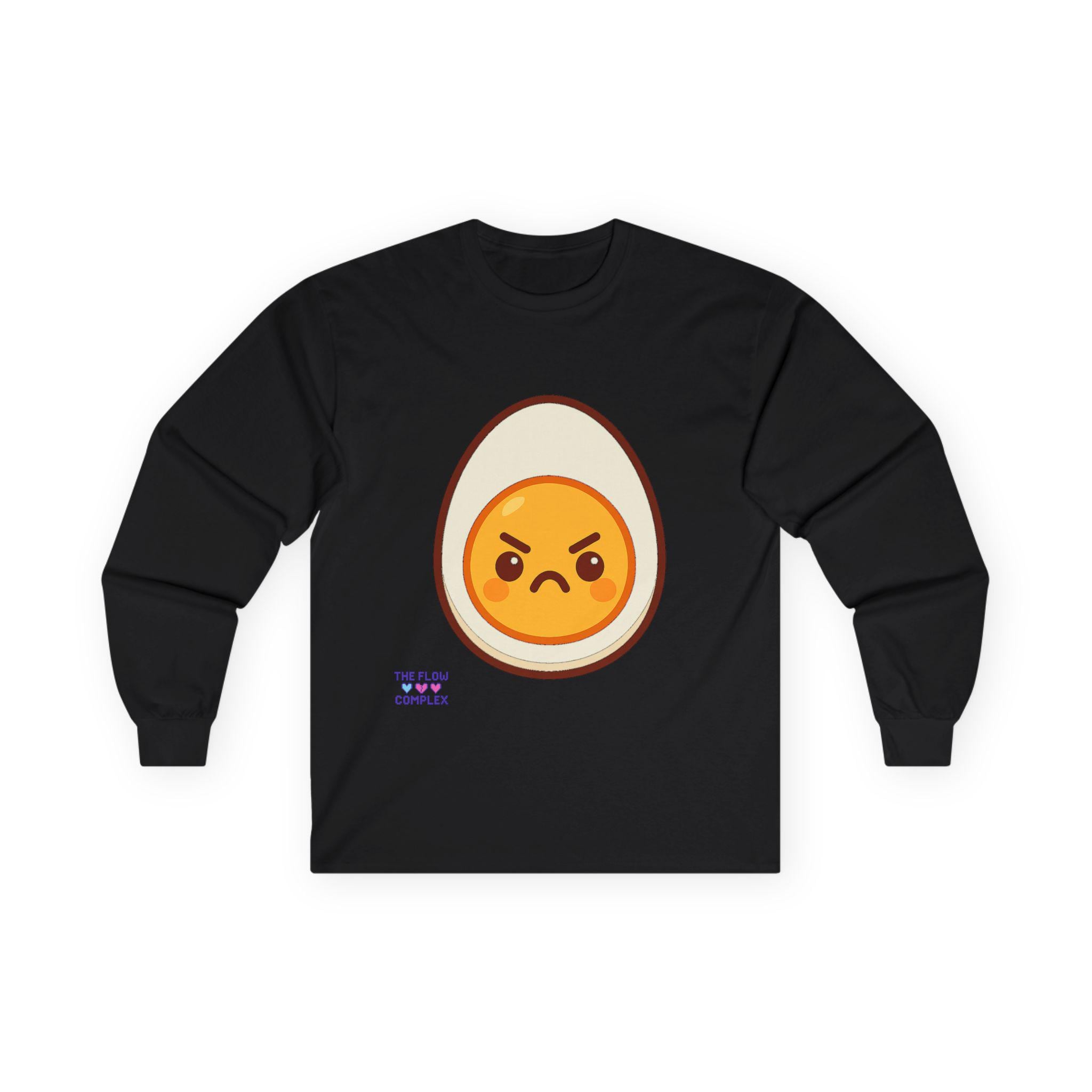 This long sleeve tee brings a playful, slightly rebellious energy to everyday wear. A bold, cartoon-style egg with an emphatic, grumpy expression sits front and center, turning a simple black shirt into a statement piece that says you don’t take every morning too seriously. The heavier, vintage-feel cotton drapes cleanly and the ribbed cuffs frame the sleeves, keeping the look tidy while the tubular knit construction gives a smooth, seam-free silhouette. Wear it on laid-back mornings, casual meetups, or when you want to add a bit of humor to a chill night in — it reads like an inside joke for people who appreciate small, quirky design details and comfort that lasts.
