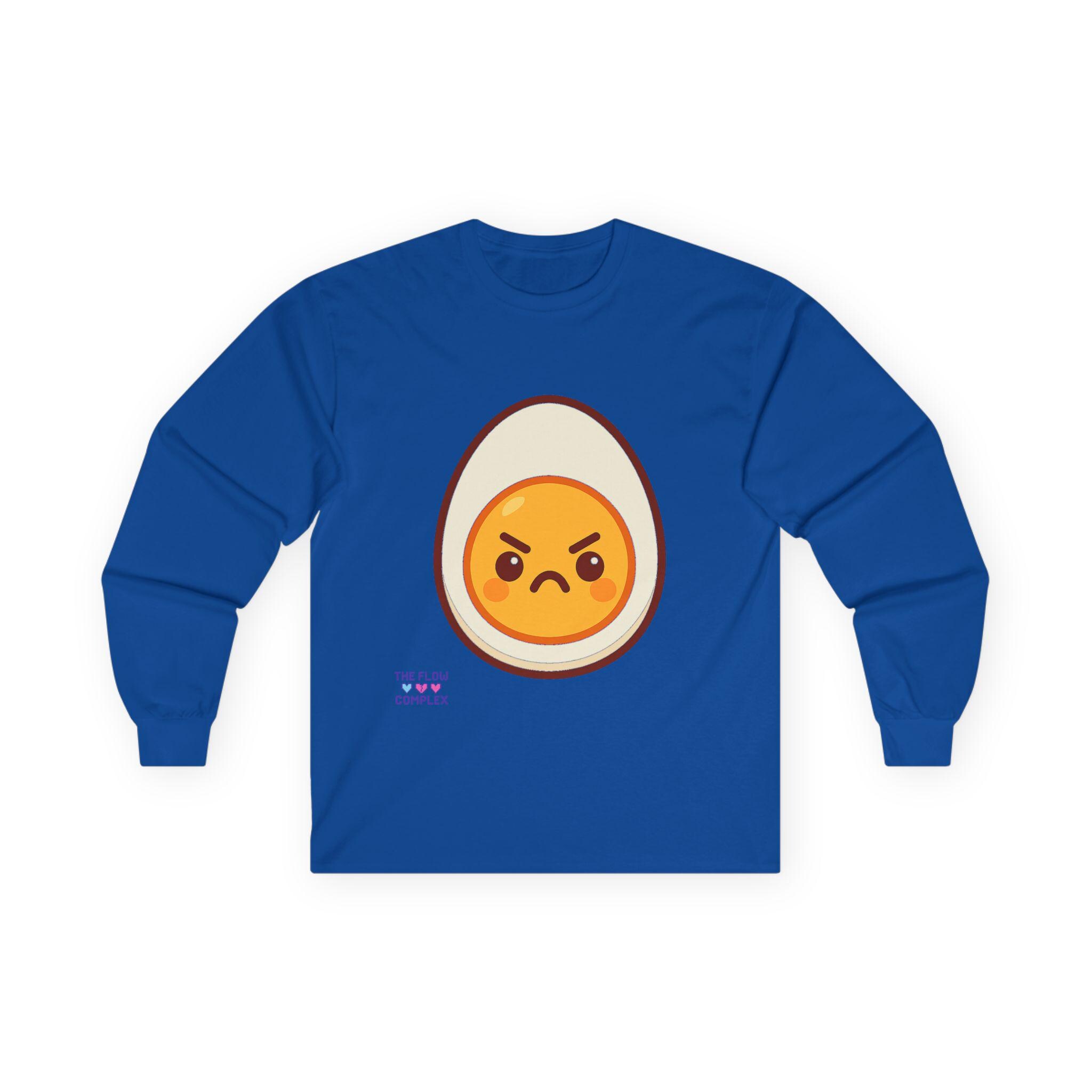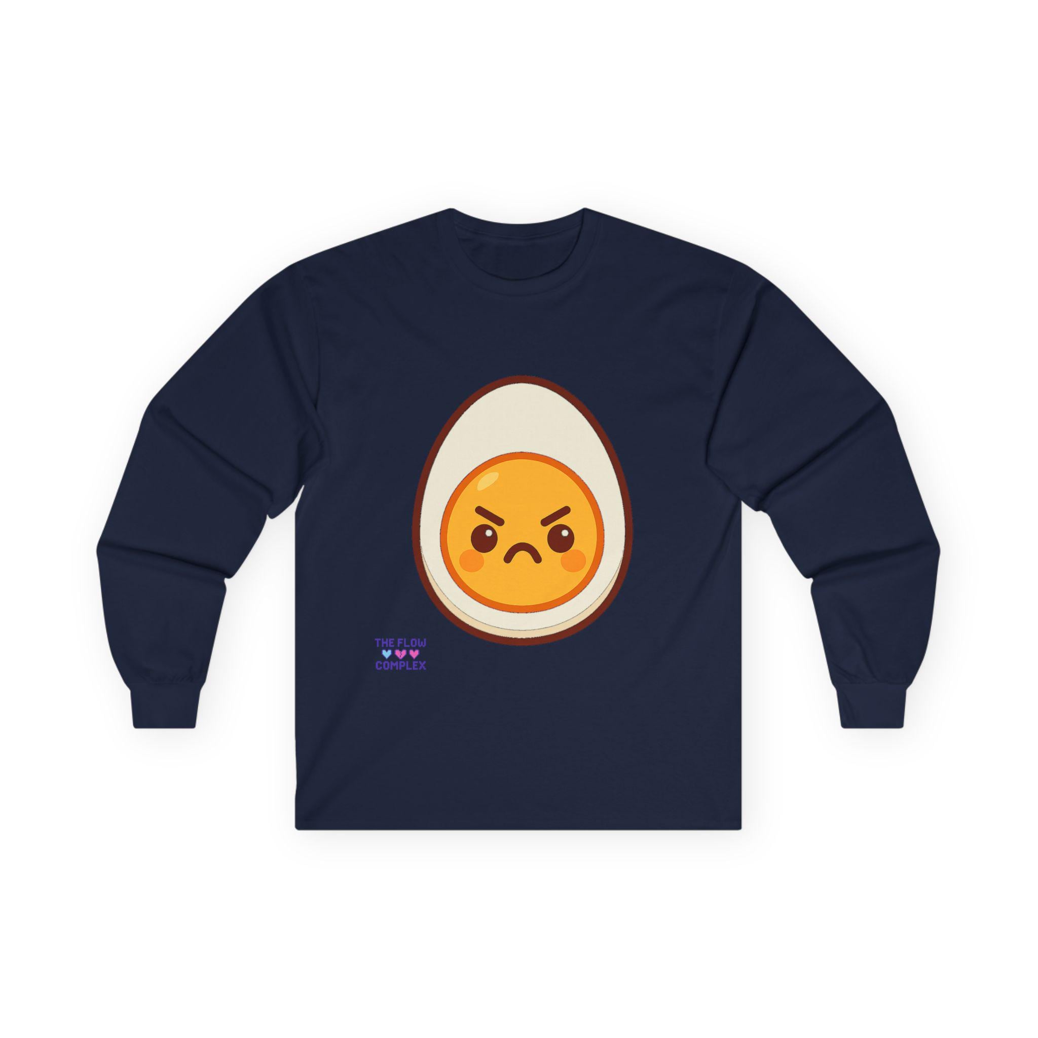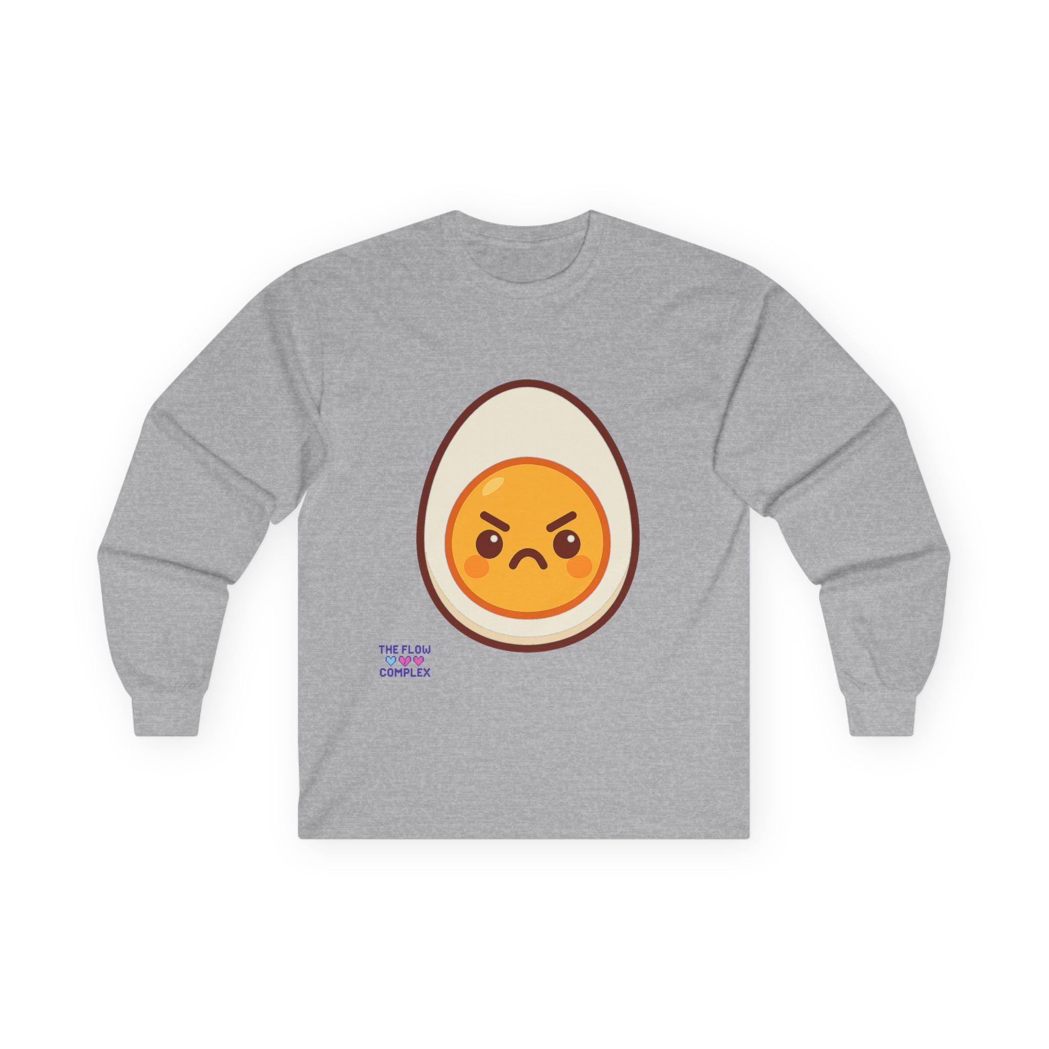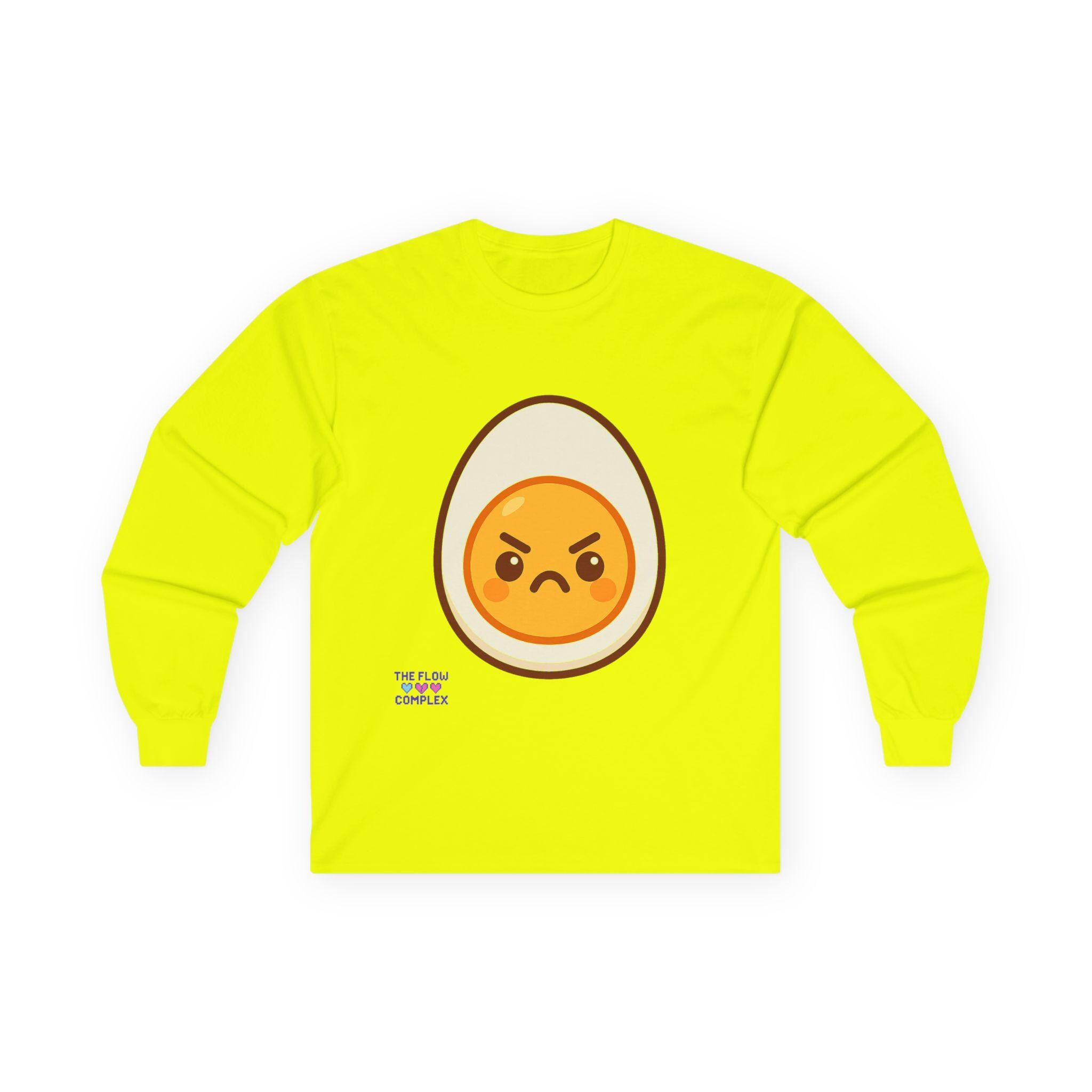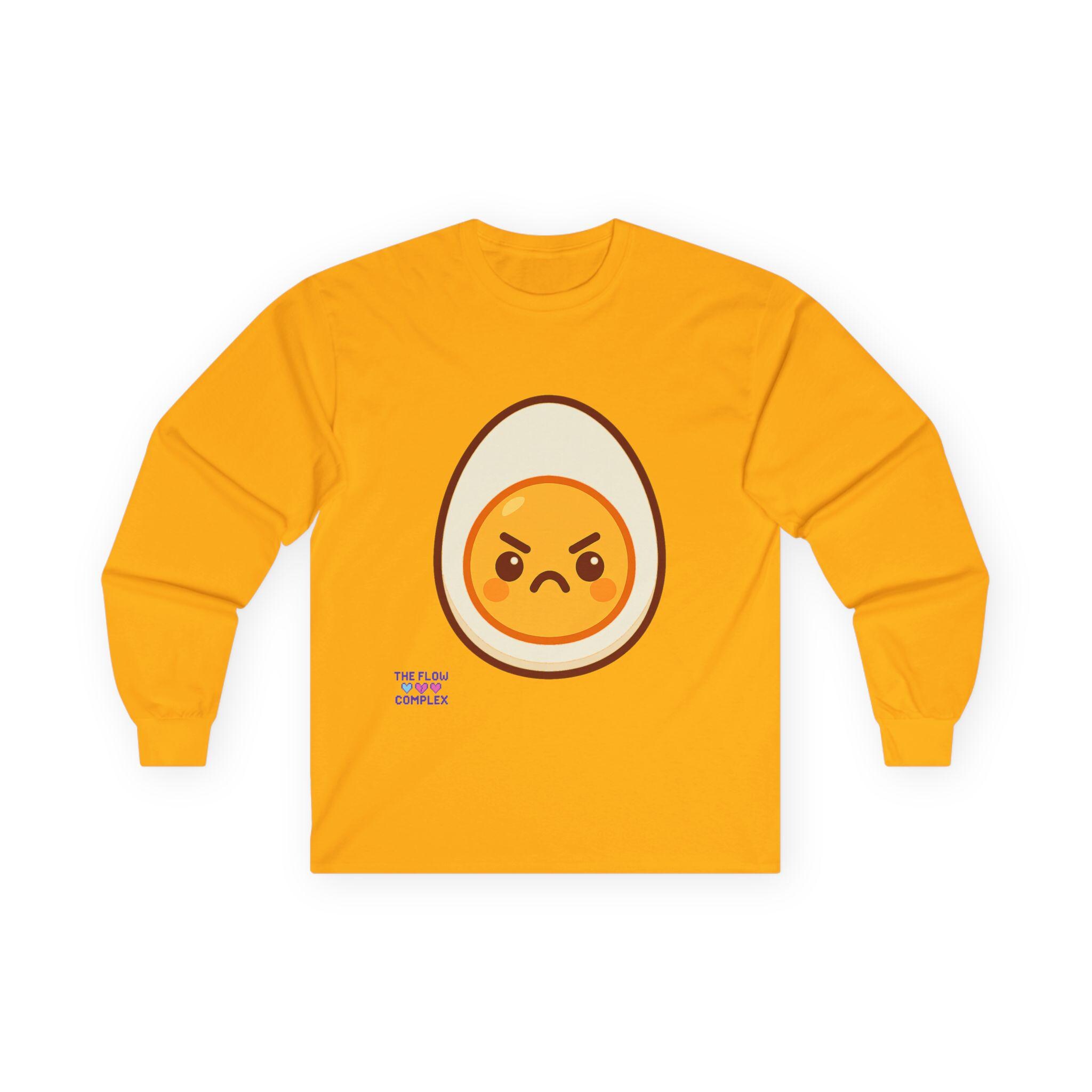 This long sleeve tee brings a playful, slightly rebellious energy to everyday wear. A bold, cartoon-style egg with an emphatic, grumpy expression sits front and center, turning a simple black shirt into a statement piece that says you don’t take every morning too seriously. The heavier, vintage-feel cotton drapes cleanly and the ribbed cuffs frame the sleeves, keeping the look tidy while the tubular knit construction gives a smooth, seam-free silhouette. Wear it on laid-back mornings, casual meetups, or when you want to add a bit of humor to a chill night in — it reads like an inside joke for people who appreciate small, quirky design details and comfort that lasts.