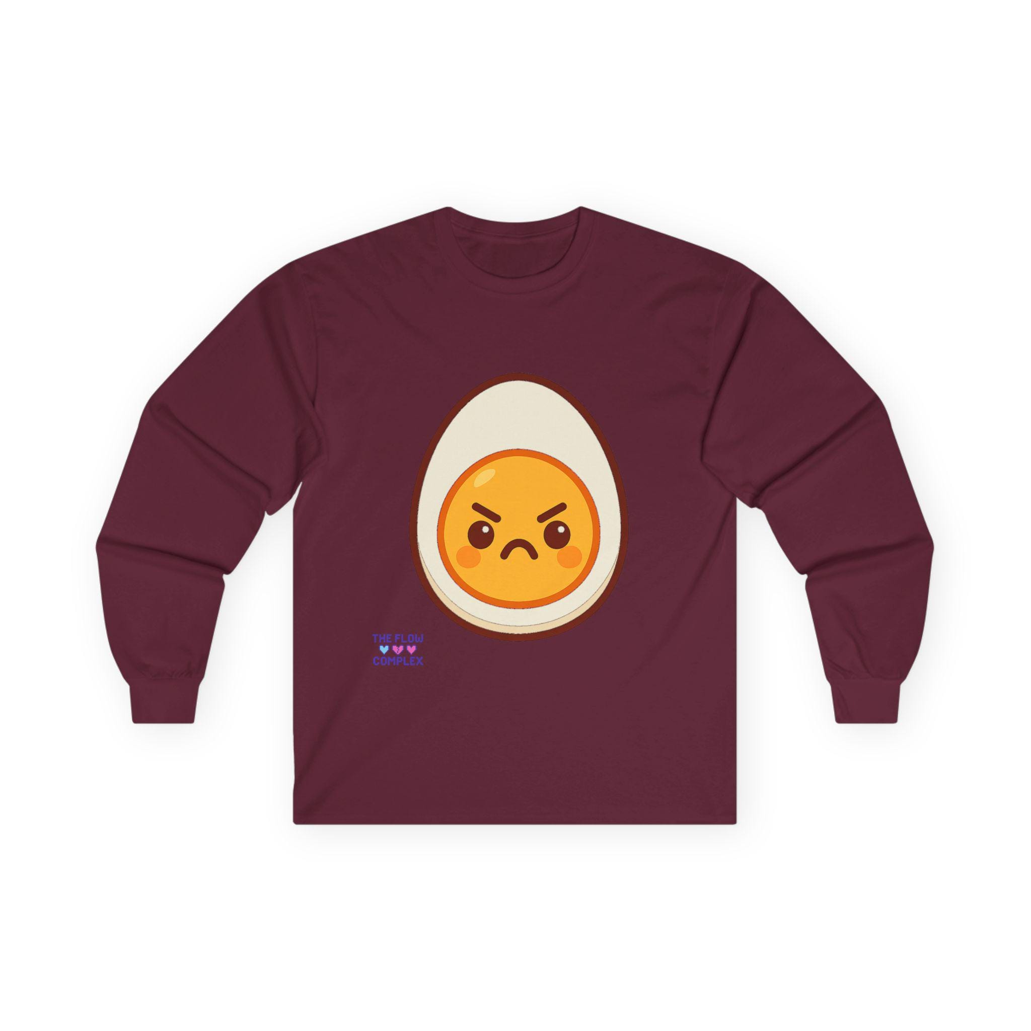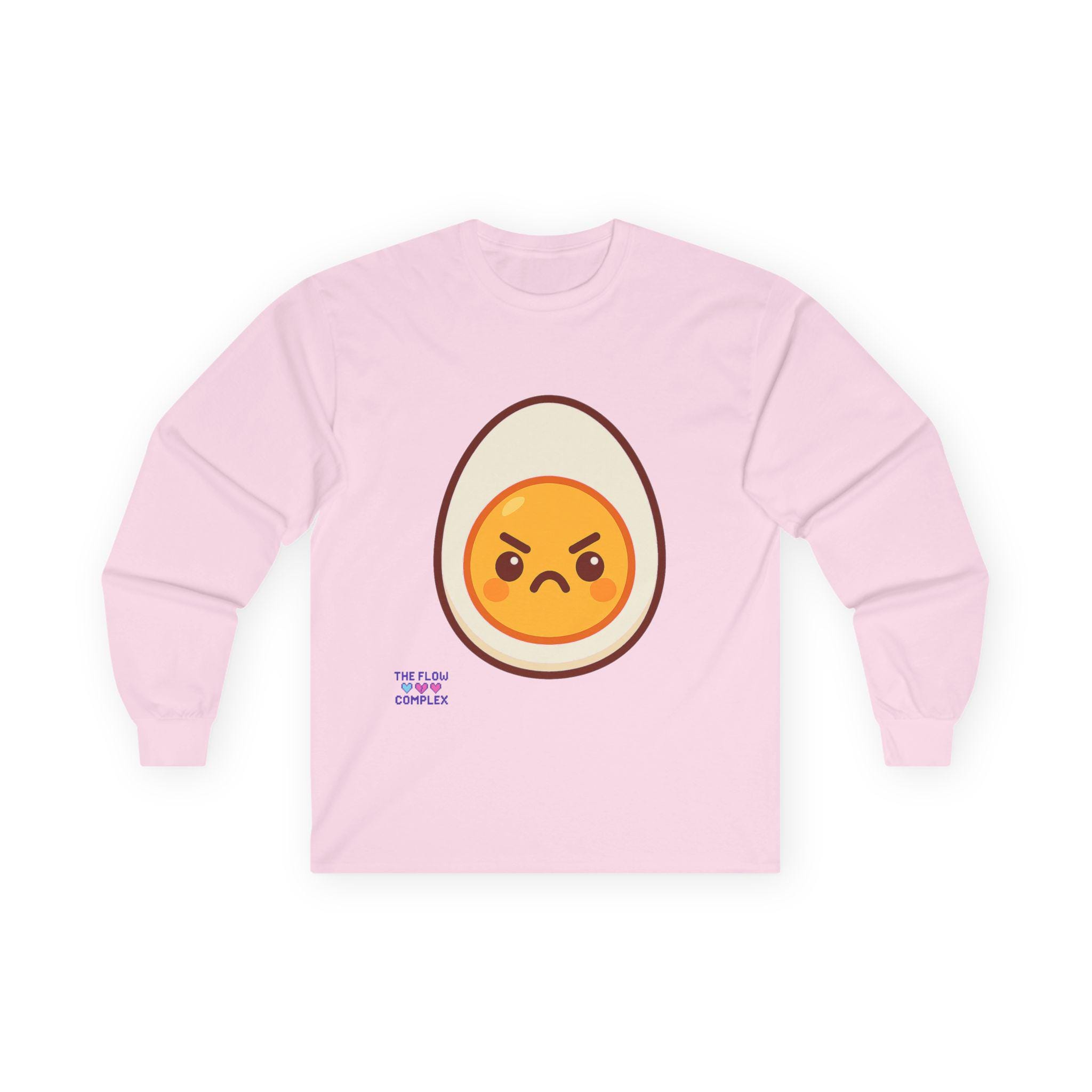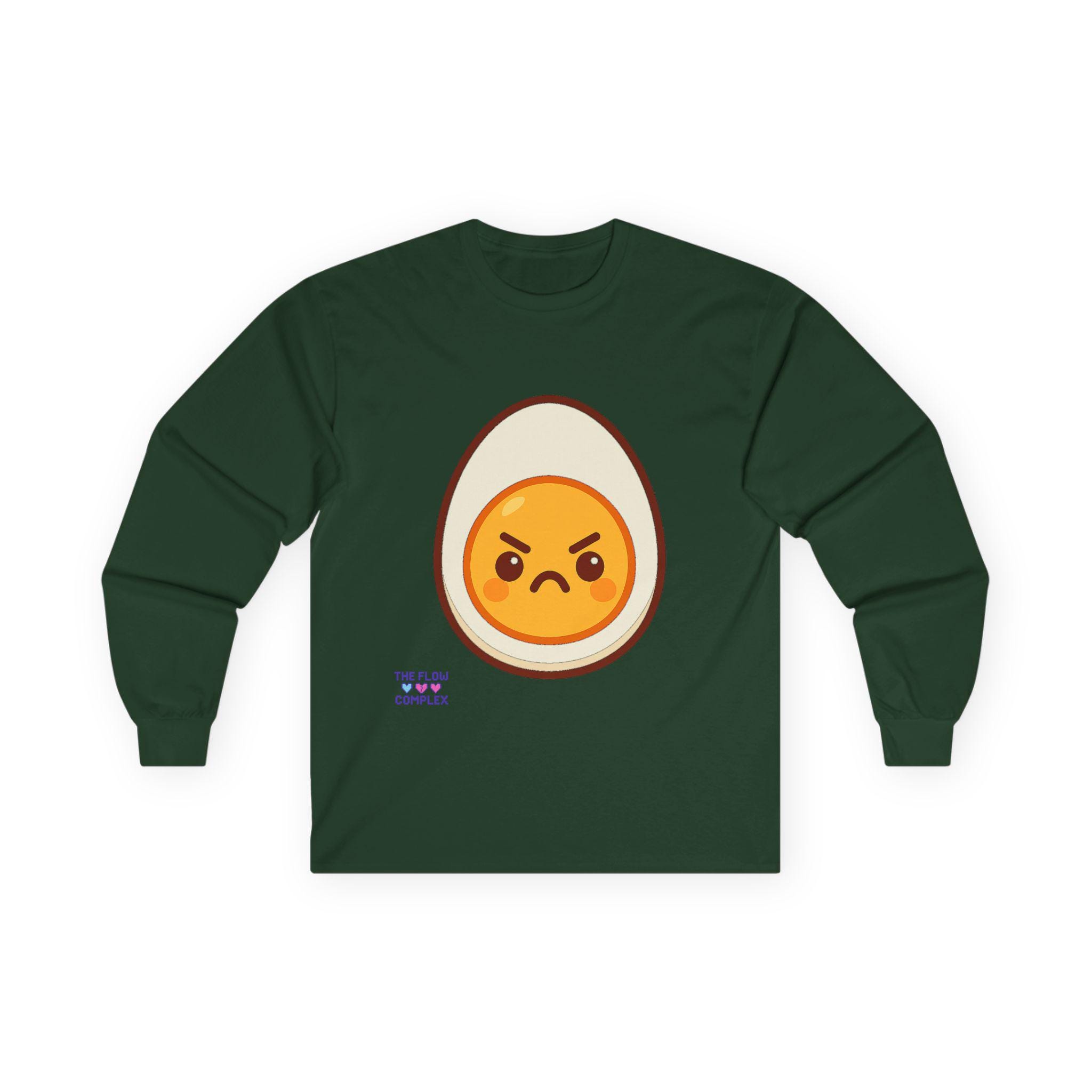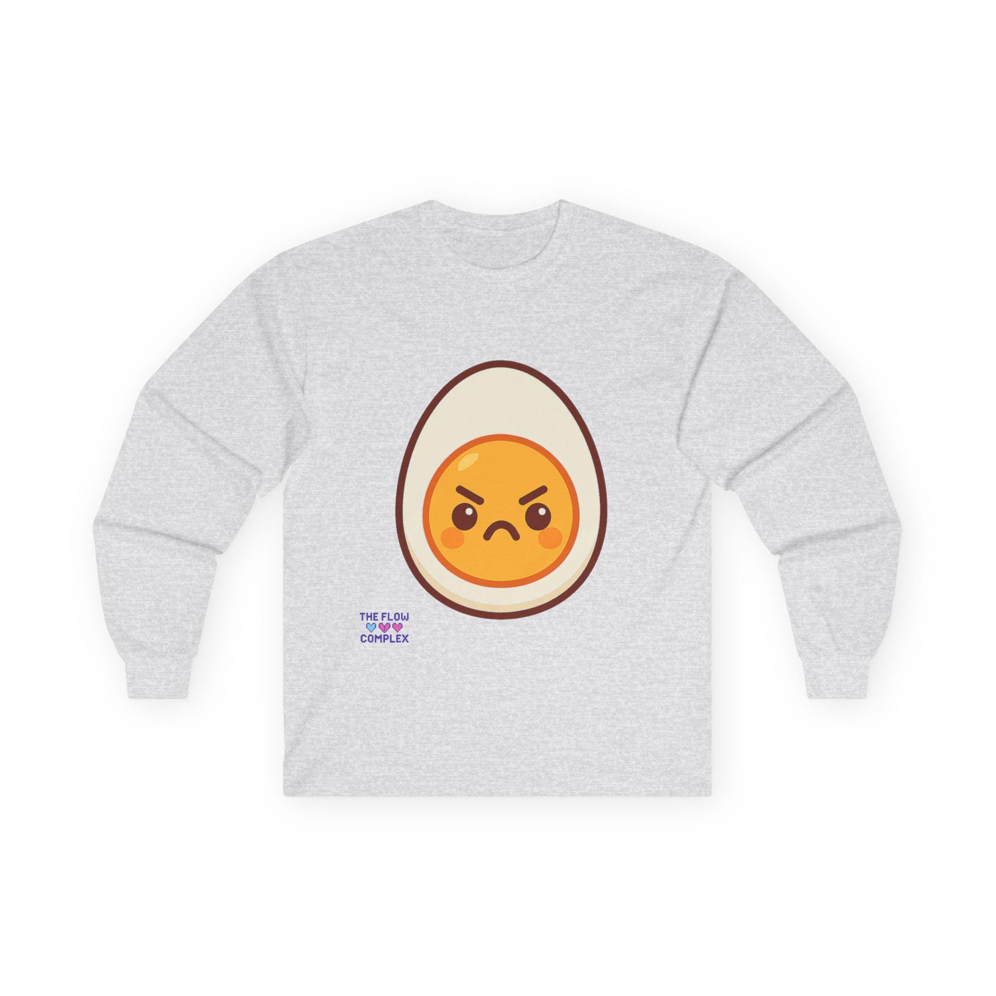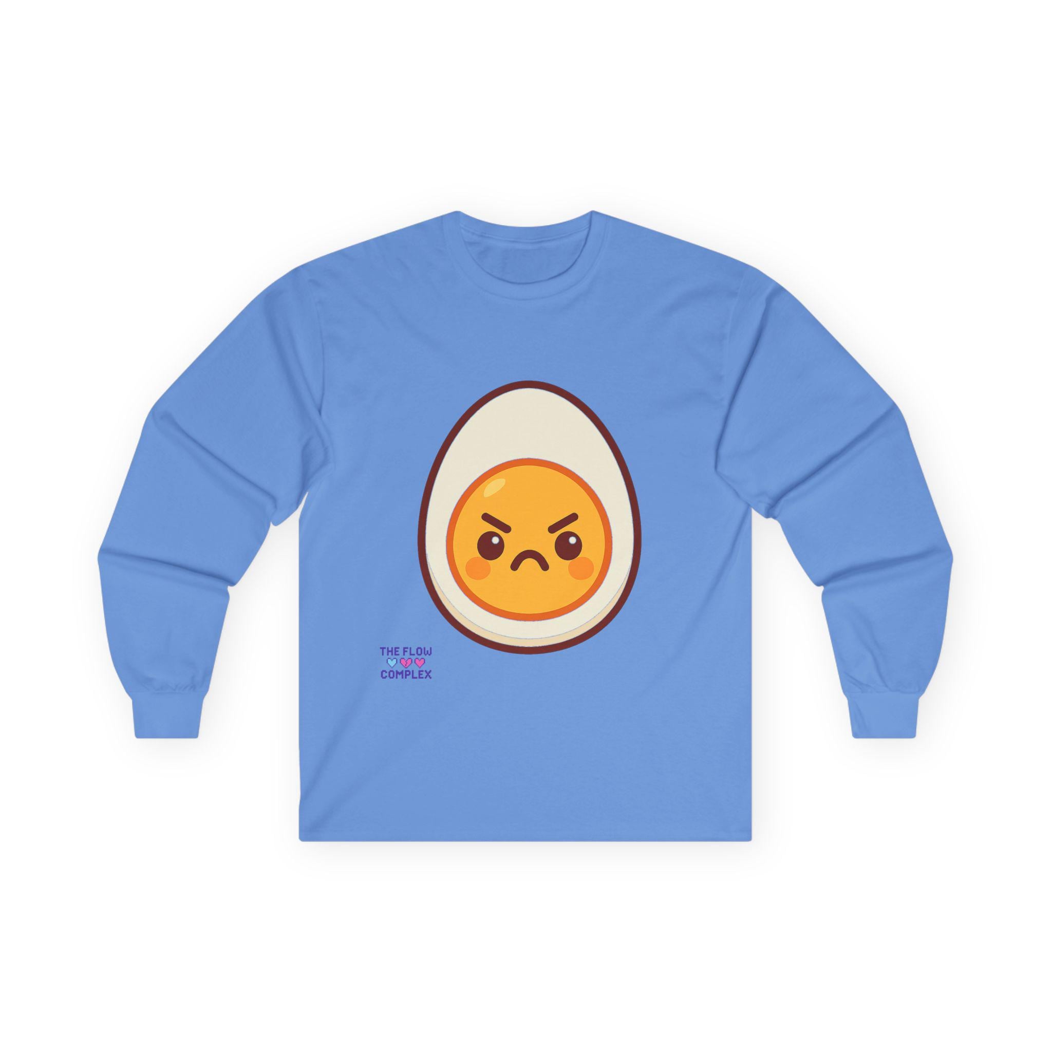 This long sleeve tee brings a playful, slightly rebellious energy to everyday wear. A bold, cartoon-style egg with an emphatic, grumpy expression sits front and center, turning a simple black shirt into a statement piece that says you don’t take every morning too seriously. The heavier, vintage-feel cotton drapes cleanly and the ribbed cuffs frame the sleeves, keeping the look tidy while the tubular knit construction gives a smooth, seam-free silhouette. Wear it on laid-back mornings, casual meetups, or when you want to add a bit of humor to a chill night in — it reads like an inside joke for people who appreciate small, quirky design details and comfort that lasts.