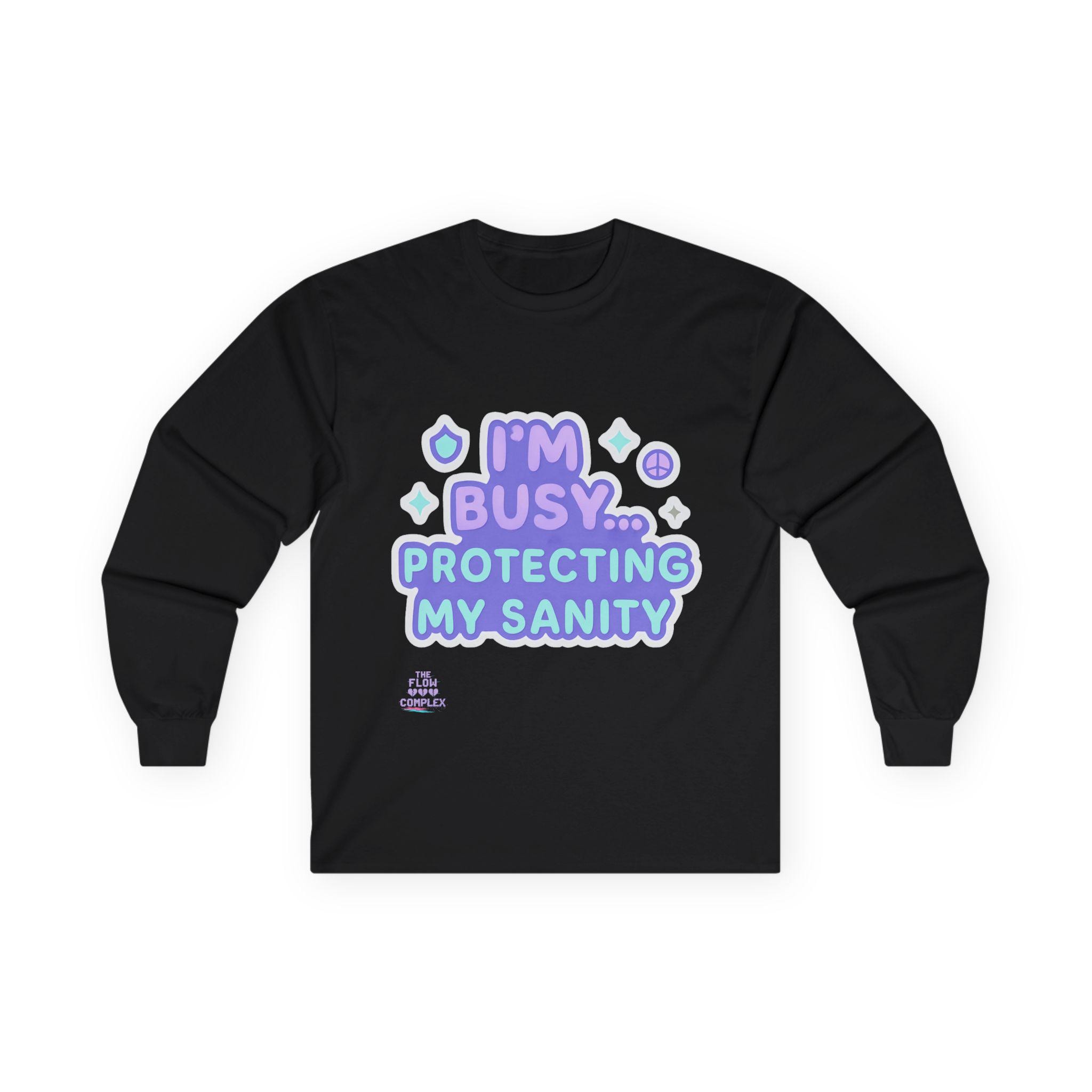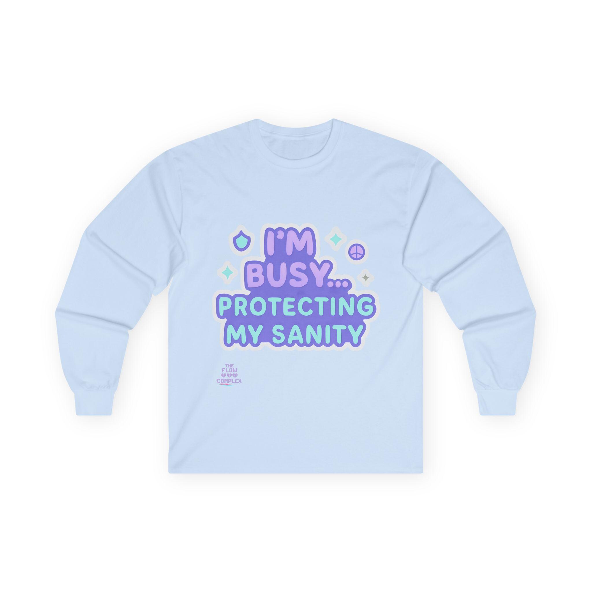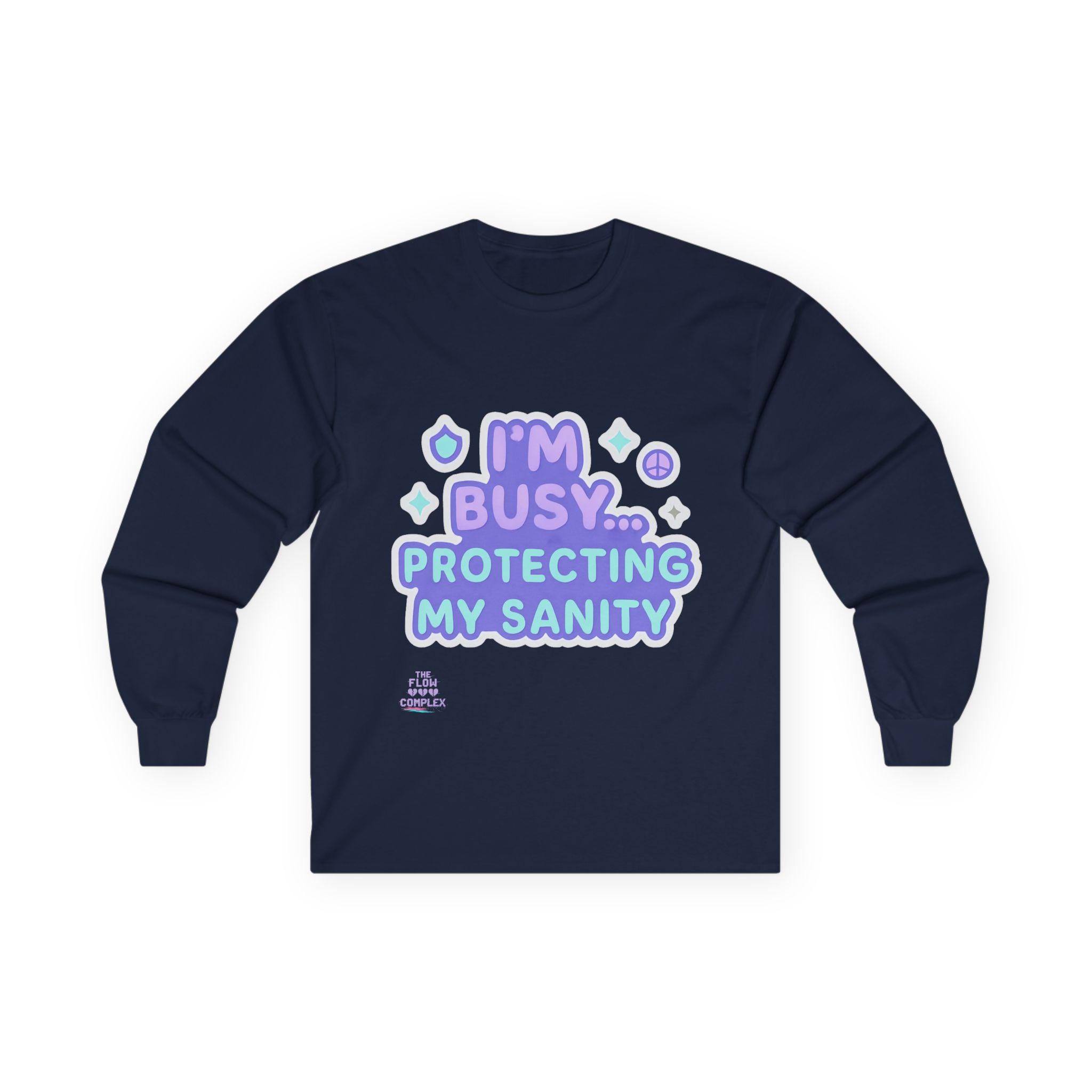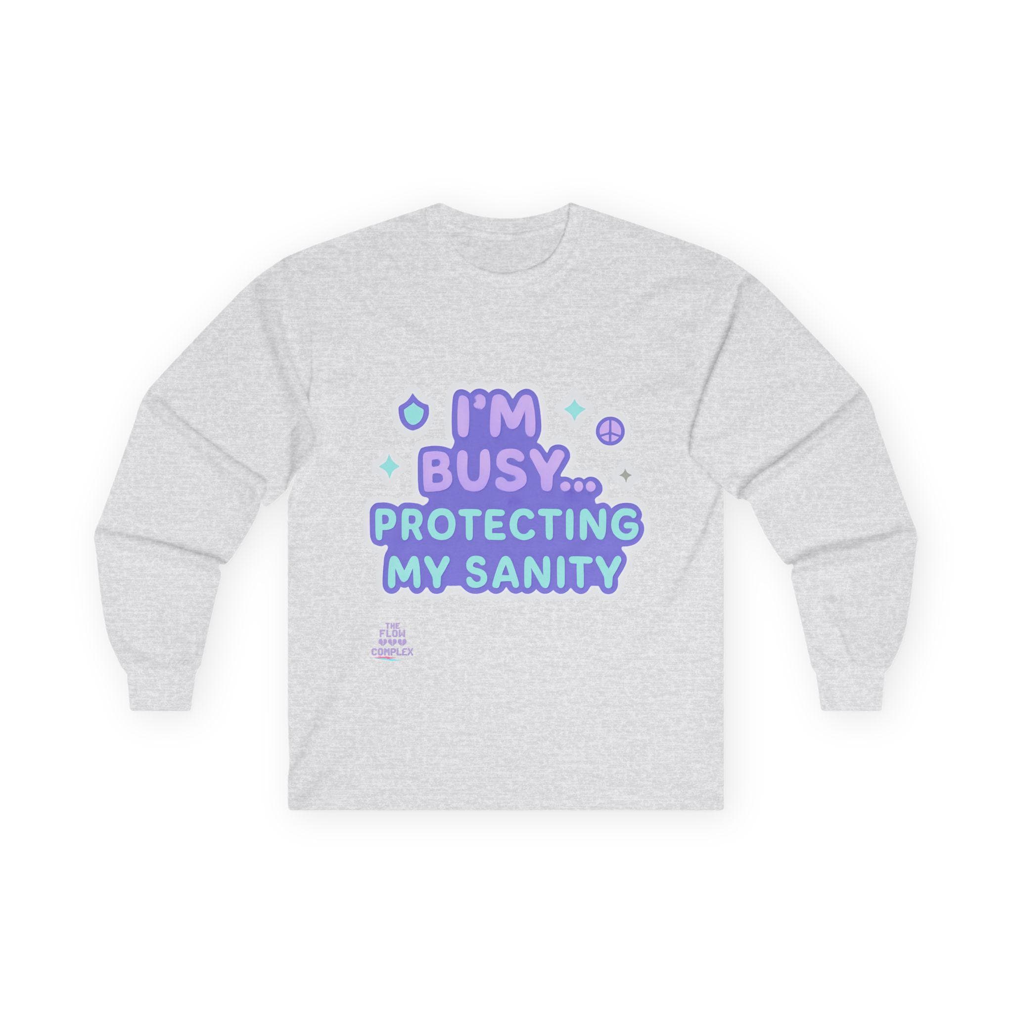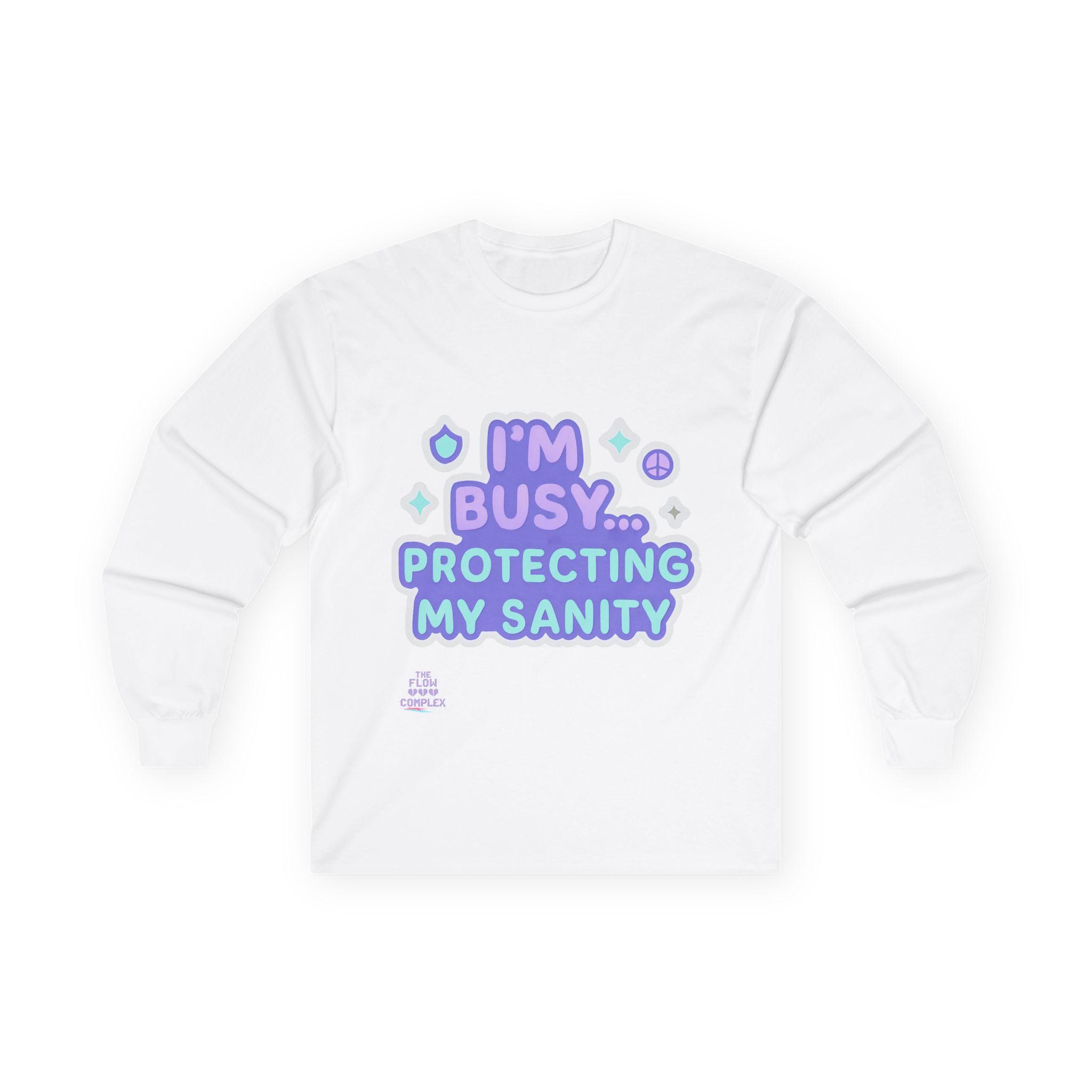 Soft, vintage-feel long sleeve printed tee that speaks with a wink and a boundary. The shirt’s pastel, playful lettering reads “I’m busy… protecting my sanity,” framed by tiny stars and symbols. It feels like a cozy shrug against the world — roomy but structured, with a heavier cotton hand that settles in like an old friend. Wear it on slow mornings, during therapy homework, or when you need a clear-but-gentle signal to others. The tubular knit and shoulder tape keep the silhouette clean and long-lasting, while the ribbed collar holds shape through many washes. Choose this for moments when you want to prioritize calm without sacrificing personality.