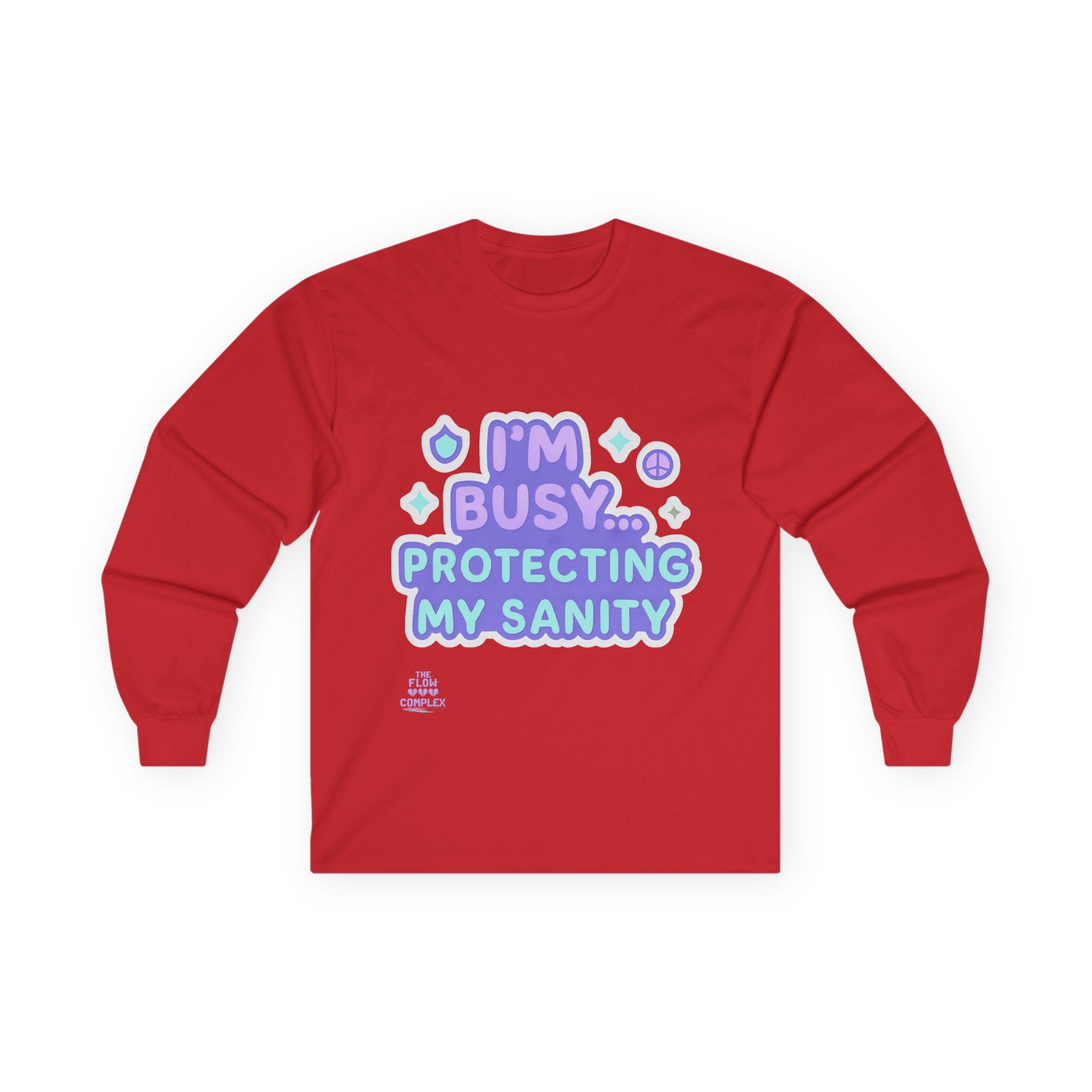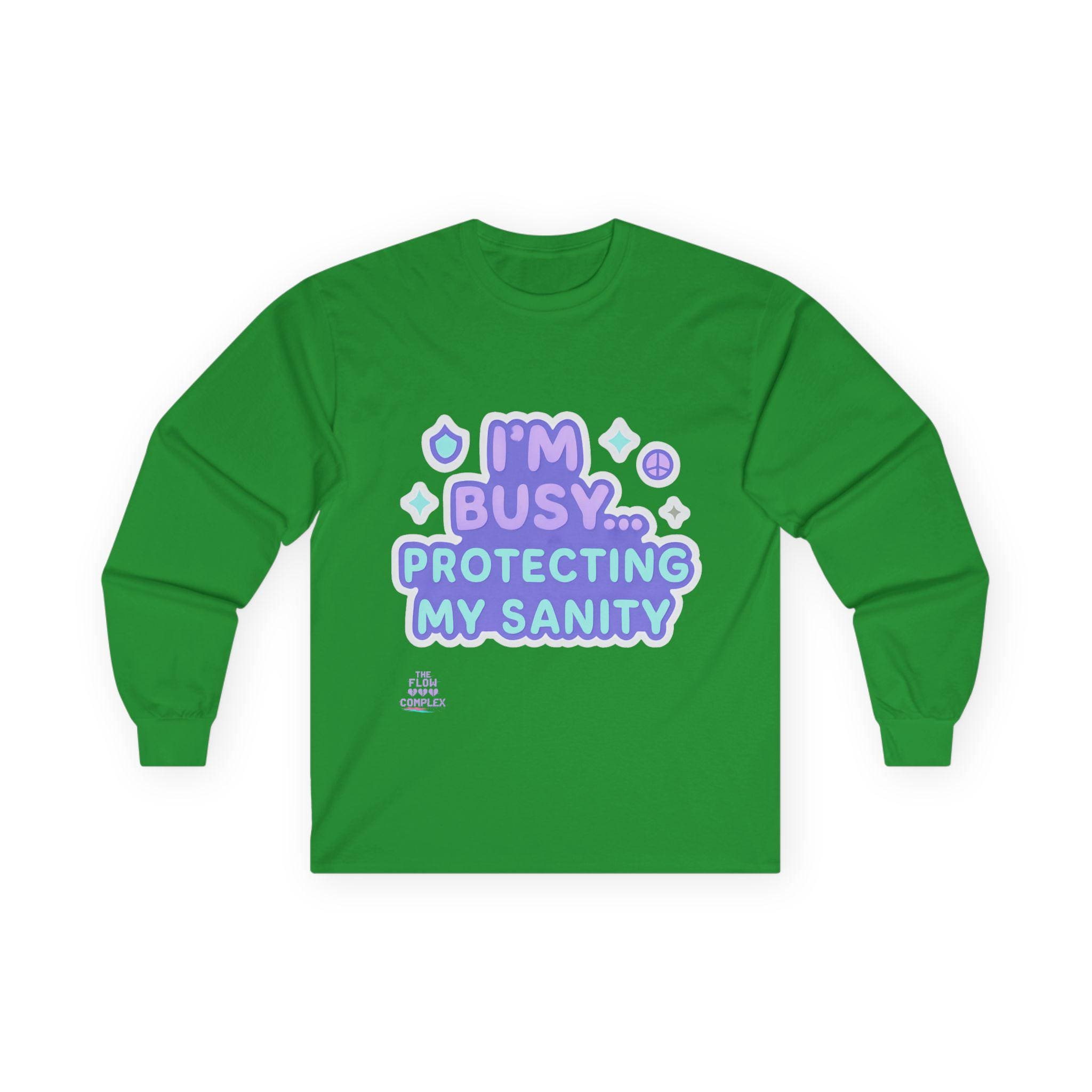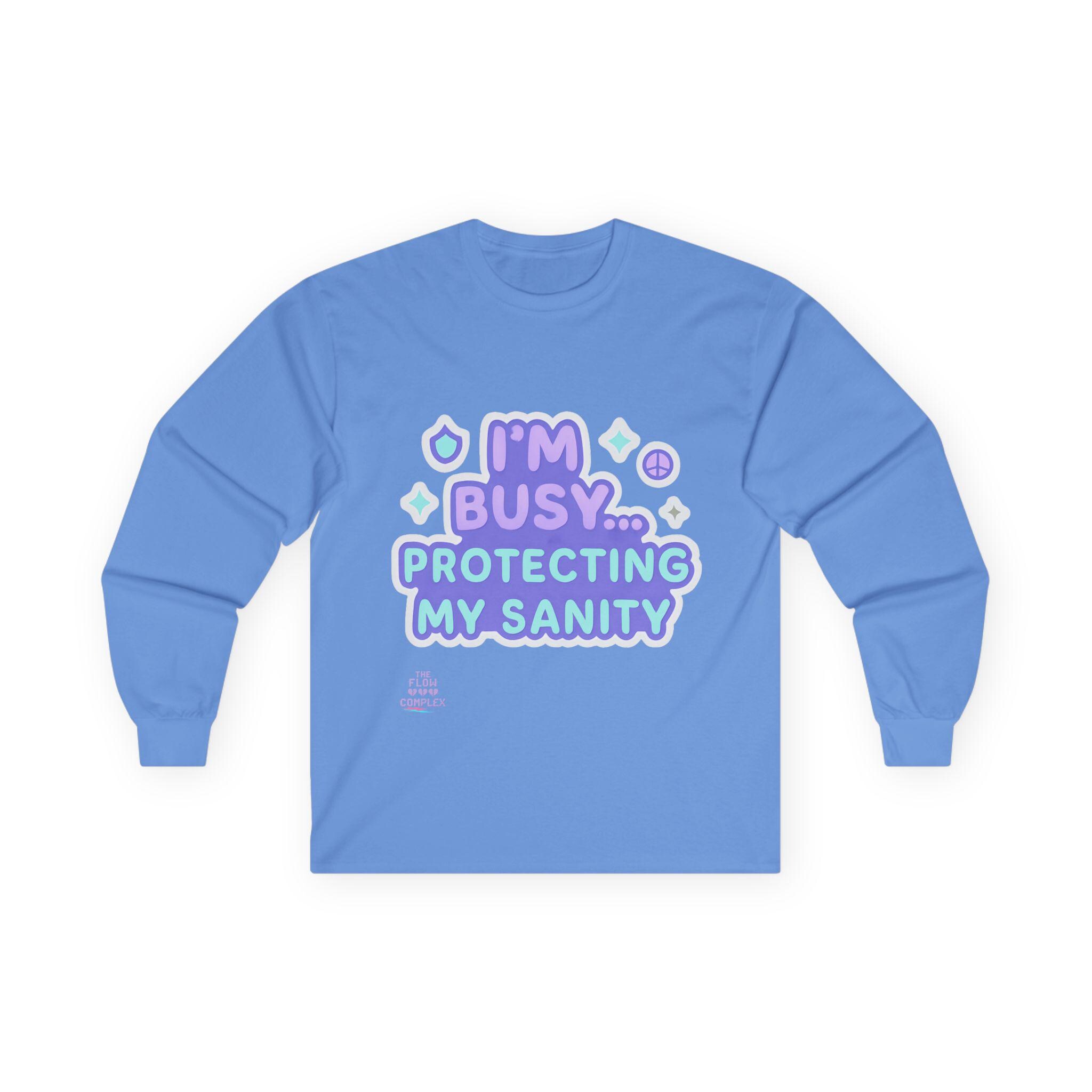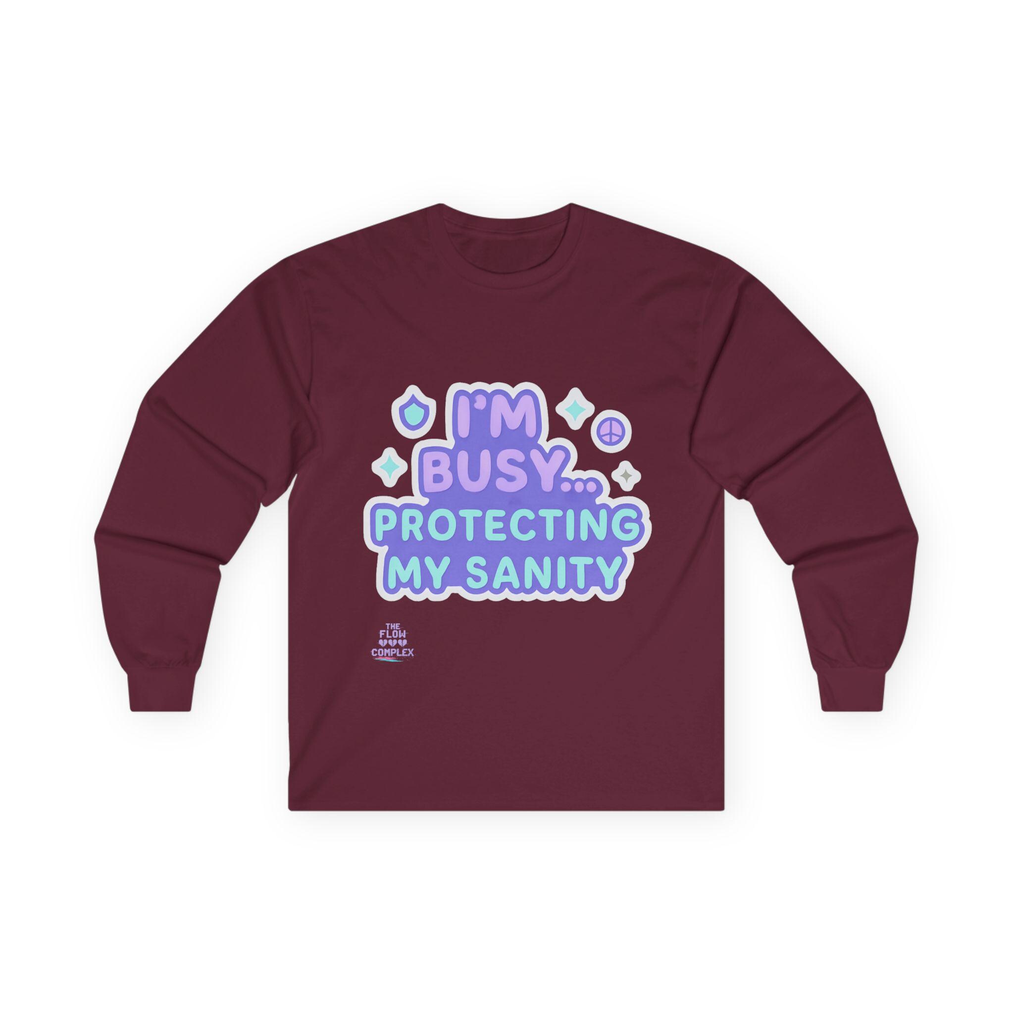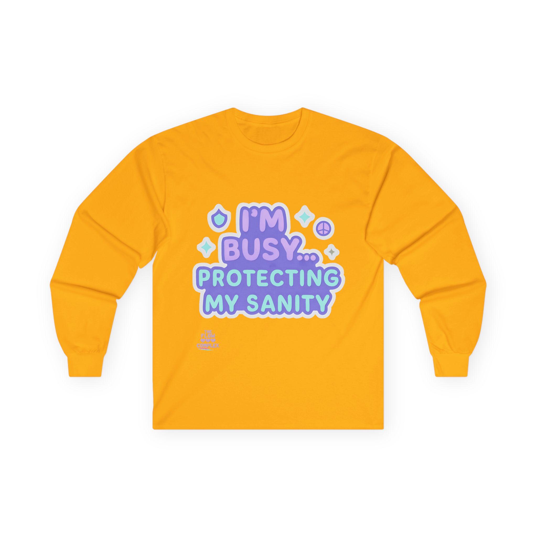 Soft, vintage-feel long sleeve printed tee that speaks with a wink and a boundary. The shirt’s pastel, playful lettering reads “I’m busy… protecting my sanity,” framed by tiny stars and symbols. It feels like a cozy shrug against the world — roomy but structured, with a heavier cotton hand that settles in like an old friend. Wear it on slow mornings, during therapy homework, or when you need a clear-but-gentle signal to others. The tubular knit and shoulder tape keep the silhouette clean and long-lasting, while the ribbed collar holds shape through many washes. Choose this for moments when you want to prioritize calm without sacrificing personality.