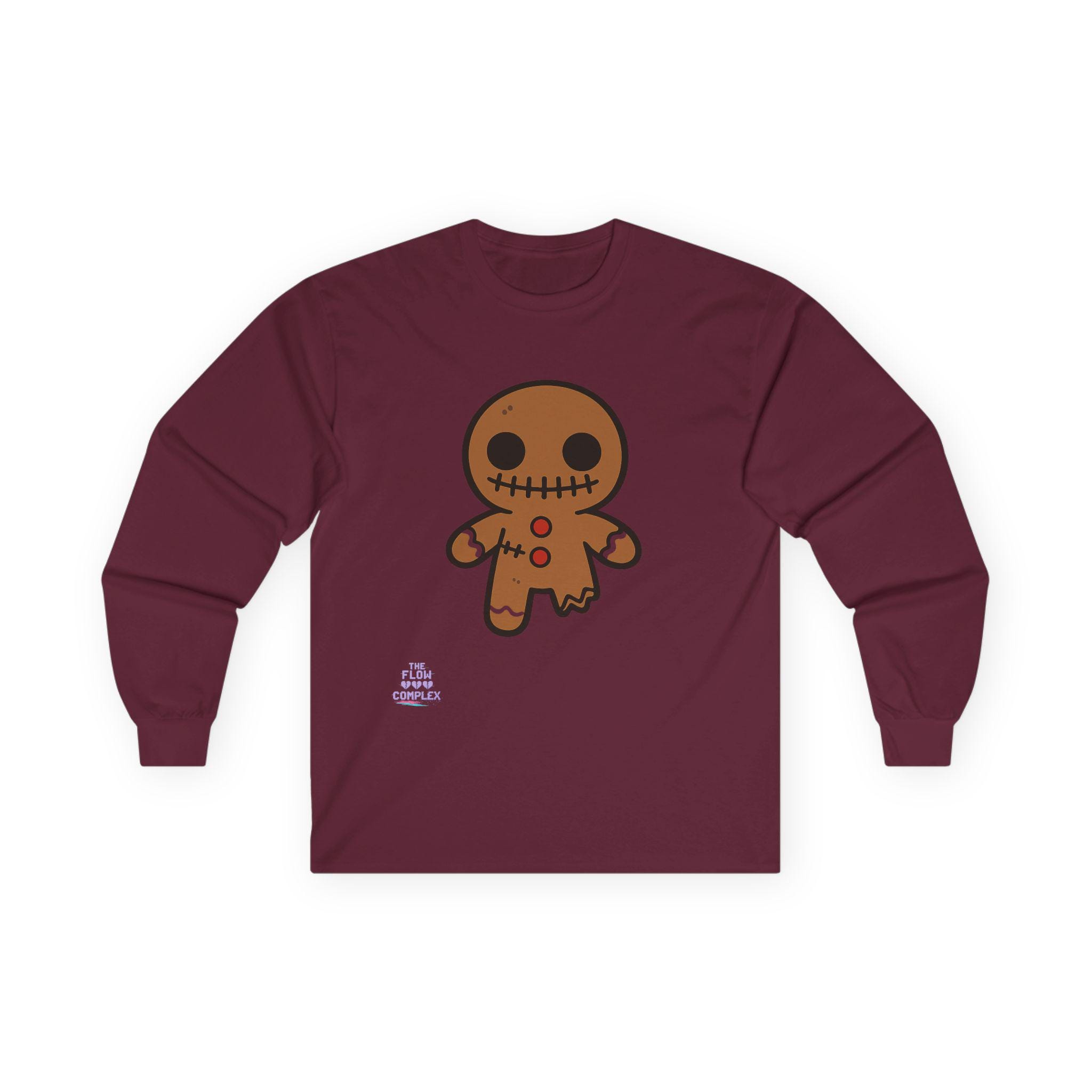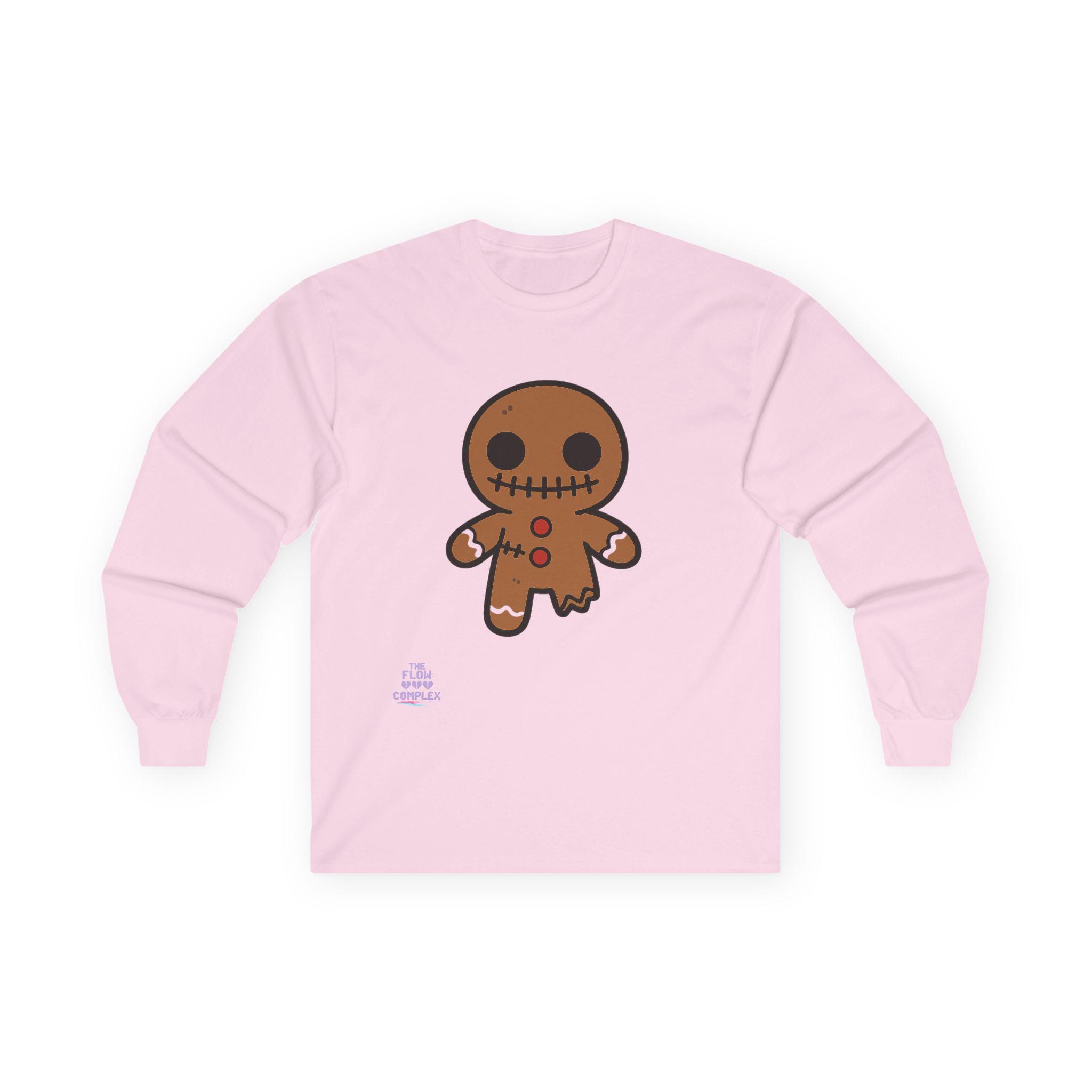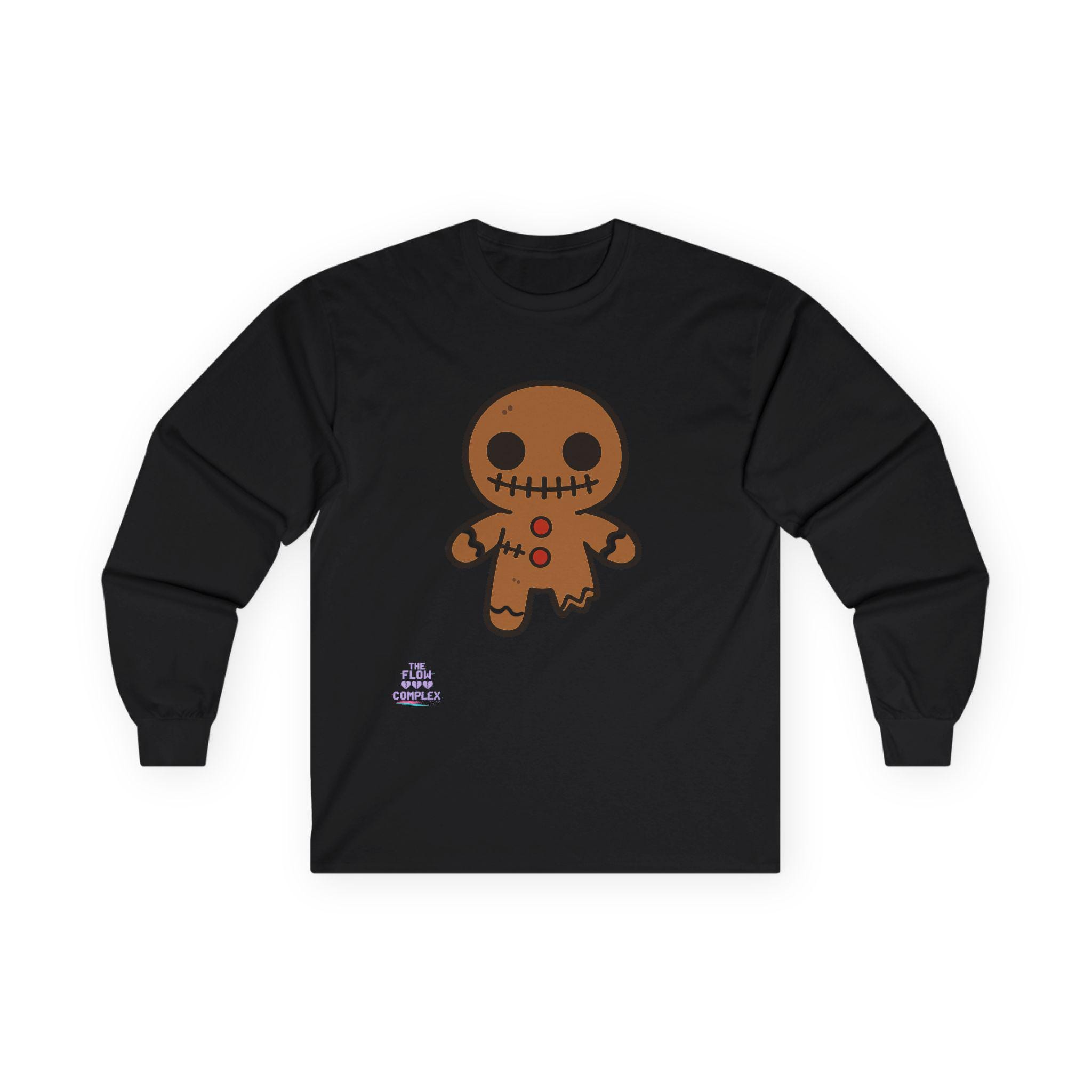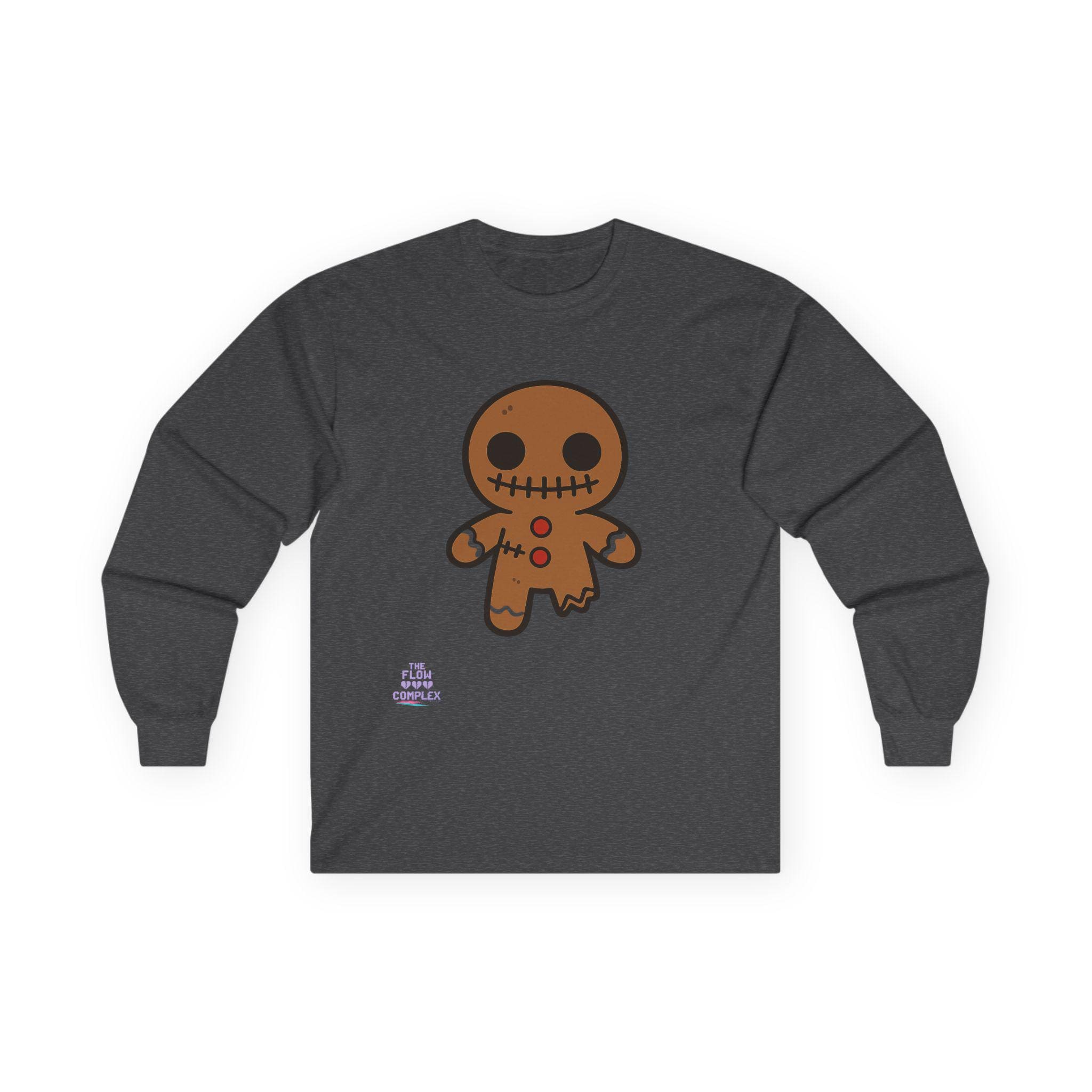 Soft, midweight long sleeve with a wink of spooky sweetness. The thicker, vintage-feel cotton holds a warm white canvas that makes the playful gingerbread character pop—stitched eyes, candy buttons, and a slightly ragged edge that feels handcrafted. Wear it on crisp mornings while sipping cider, during casual Halloween movie nights, or for cozy walks through lit neighborhoods. The tubular knit and shoulder tape keep the silhouette clean and comfortable, while the ribbed collar and cuffs hold their shape through repeat wear. It runs a bit small, so size up if you like a relaxed layer.