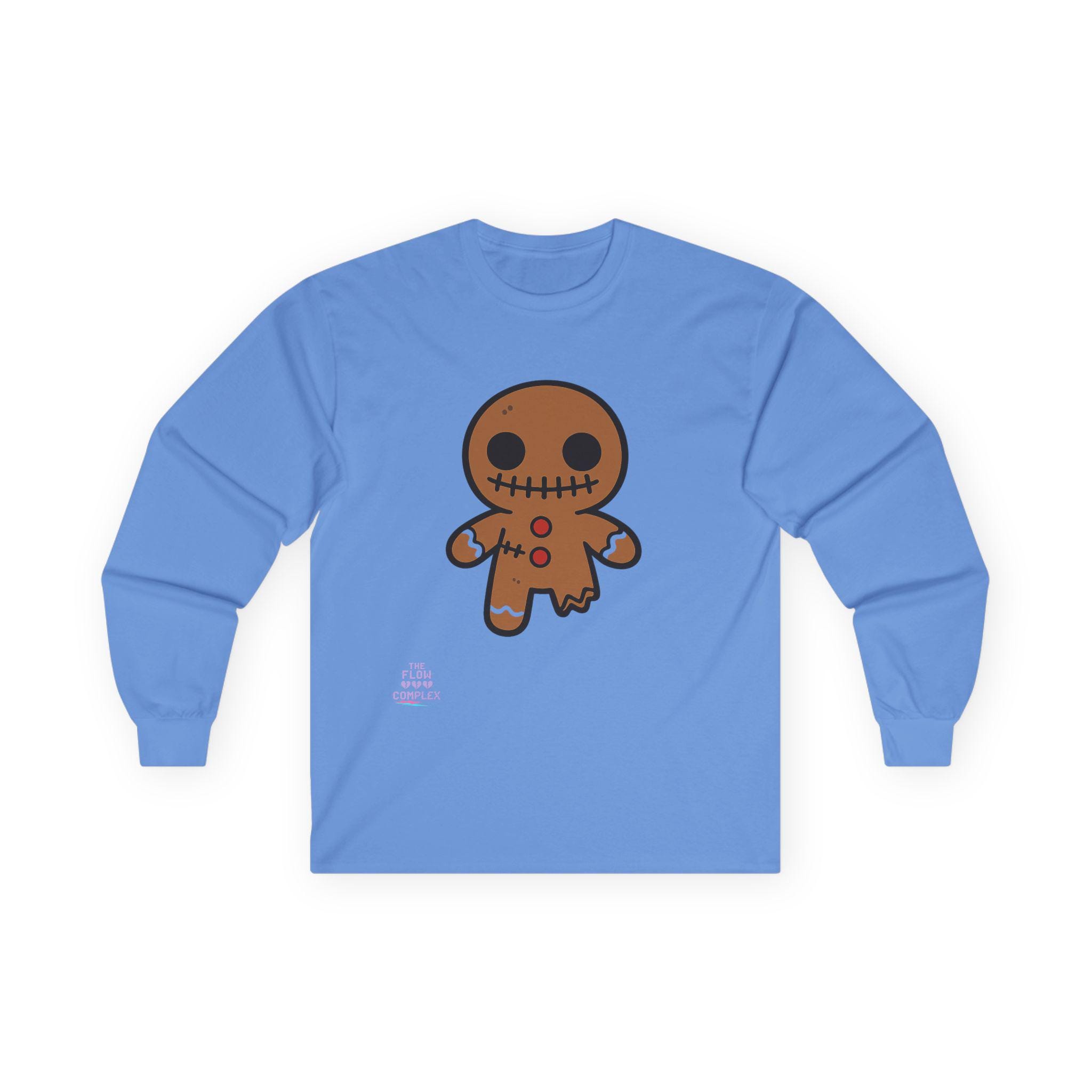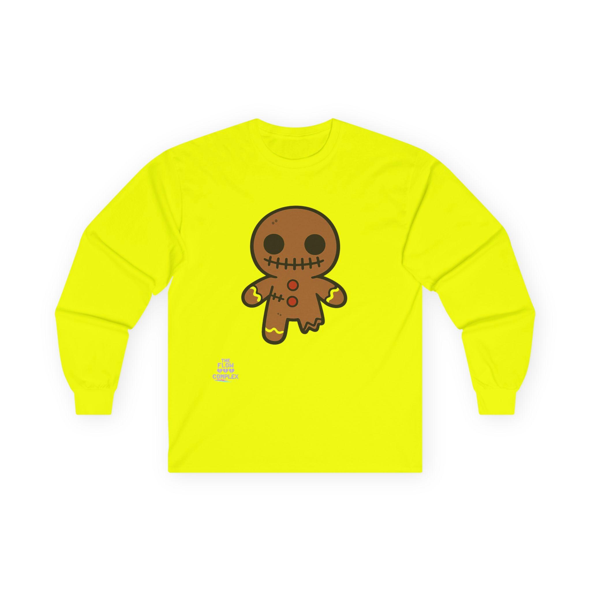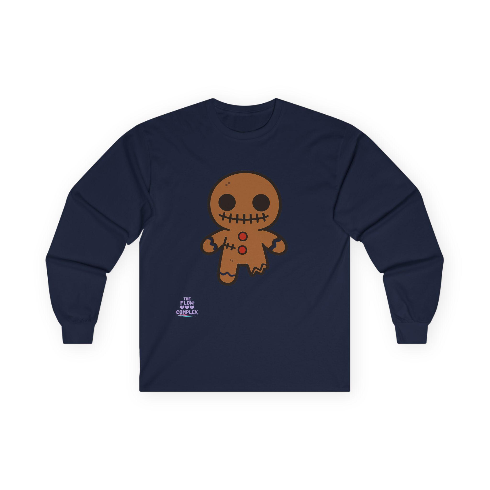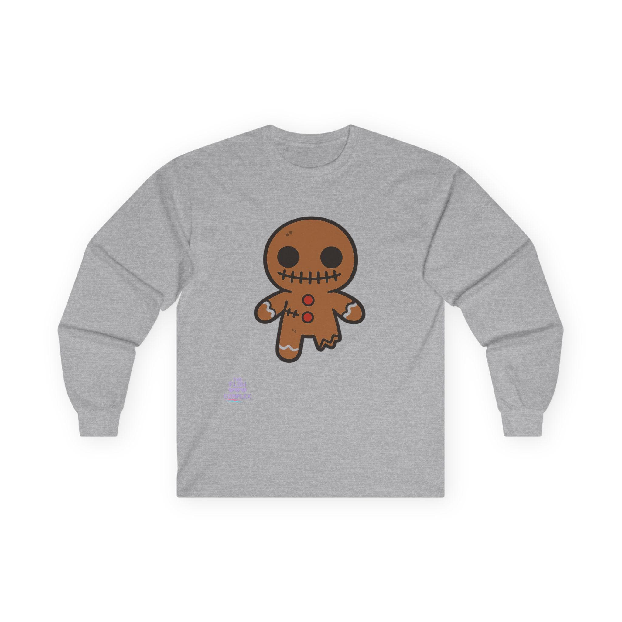 Soft, midweight long sleeve with a wink of spooky sweetness. The thicker, vintage-feel cotton holds a warm white canvas that makes the playful gingerbread character pop—stitched eyes, candy buttons, and a slightly ragged edge that feels handcrafted. Wear it on crisp mornings while sipping cider, during casual Halloween movie nights, or for cozy walks through lit neighborhoods. The tubular knit and shoulder tape keep the silhouette clean and comfortable, while the ribbed collar and cuffs hold their shape through repeat wear. It runs a bit small, so size up if you like a relaxed layer.