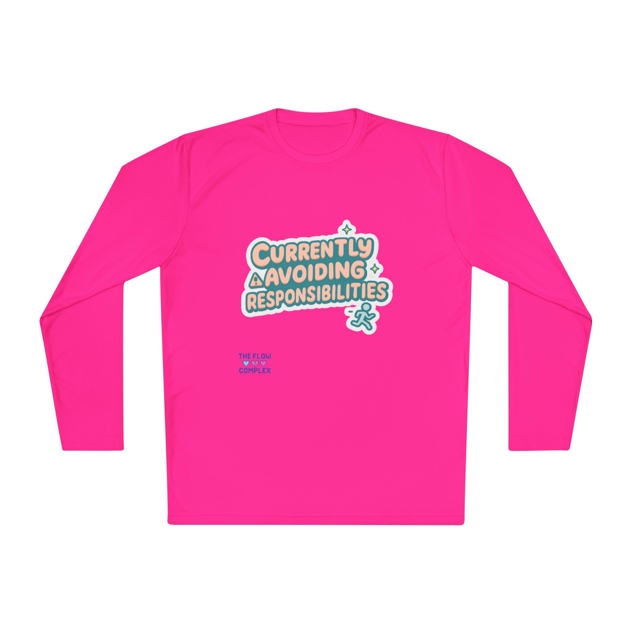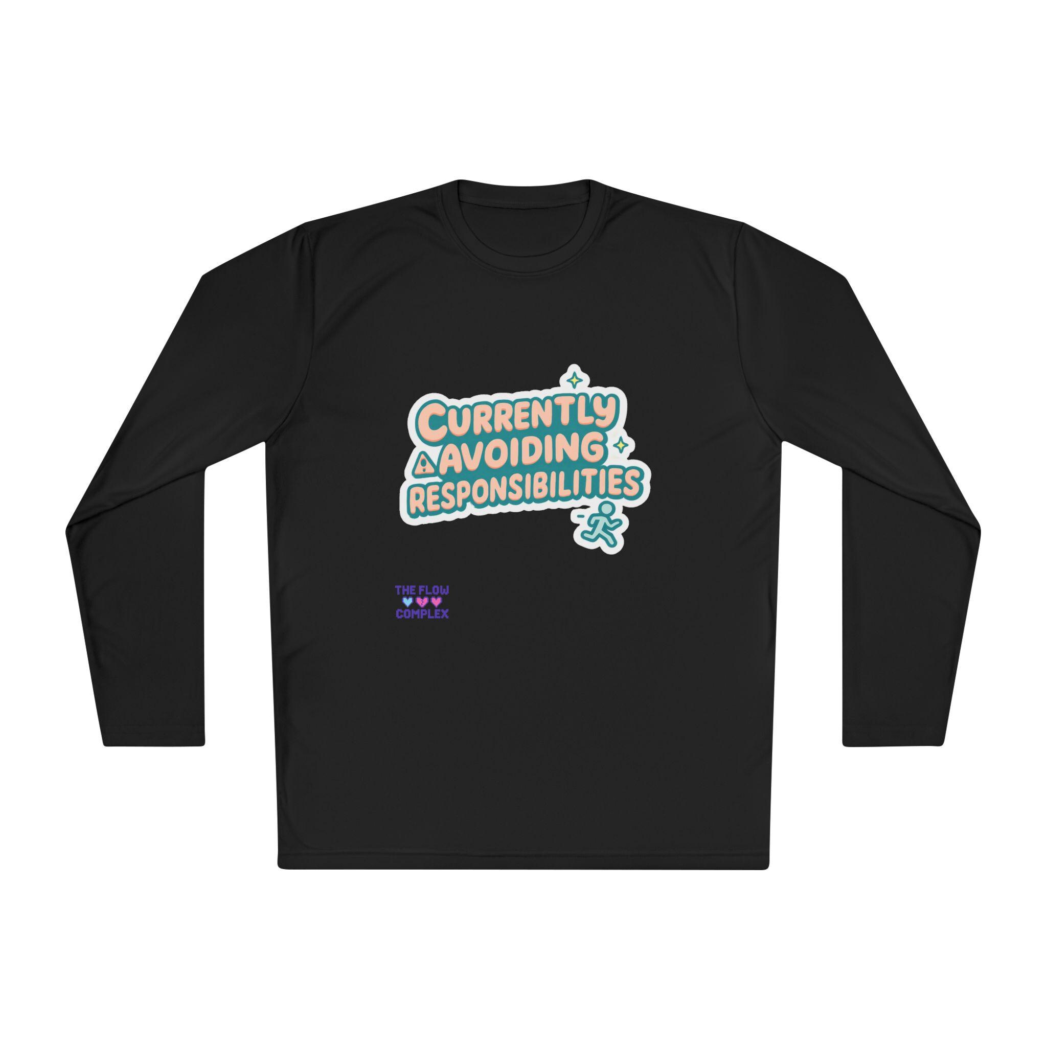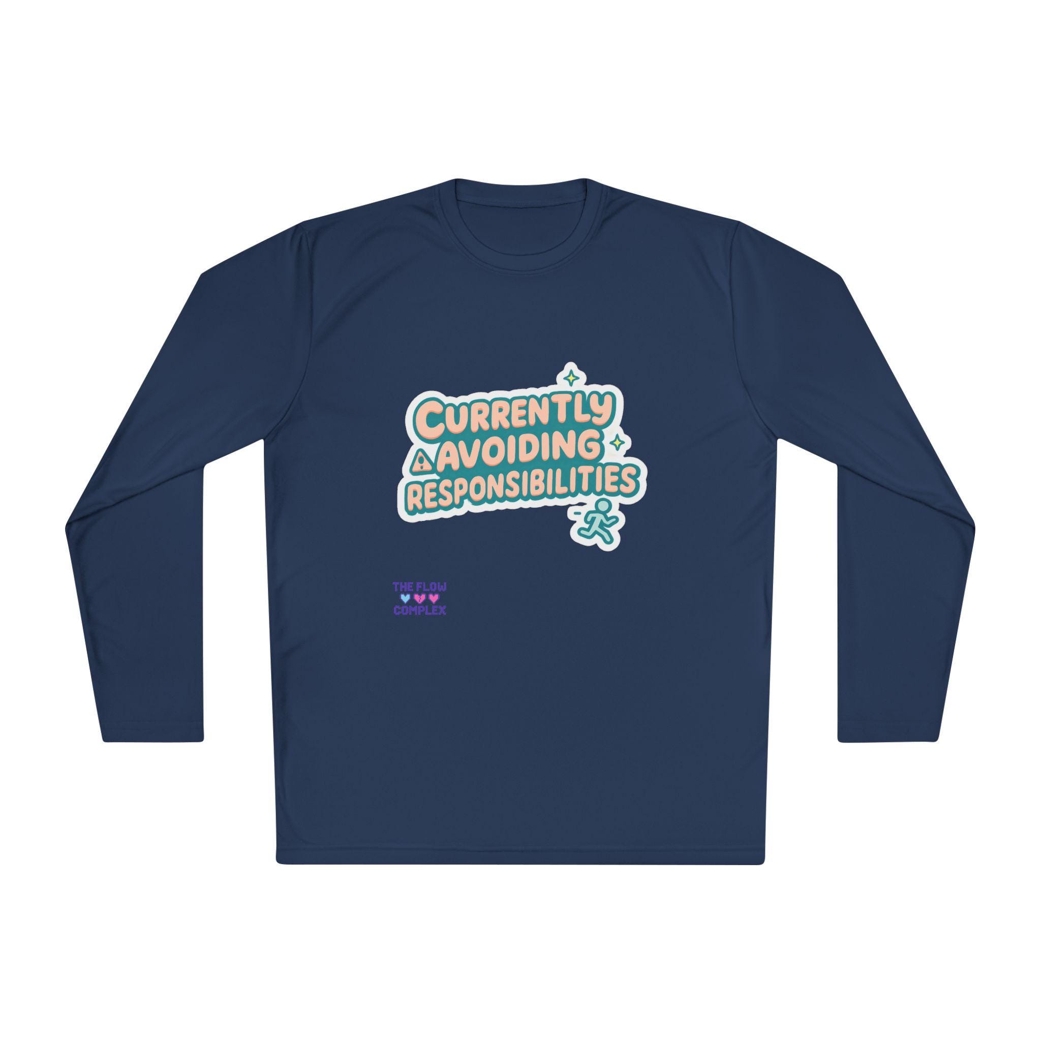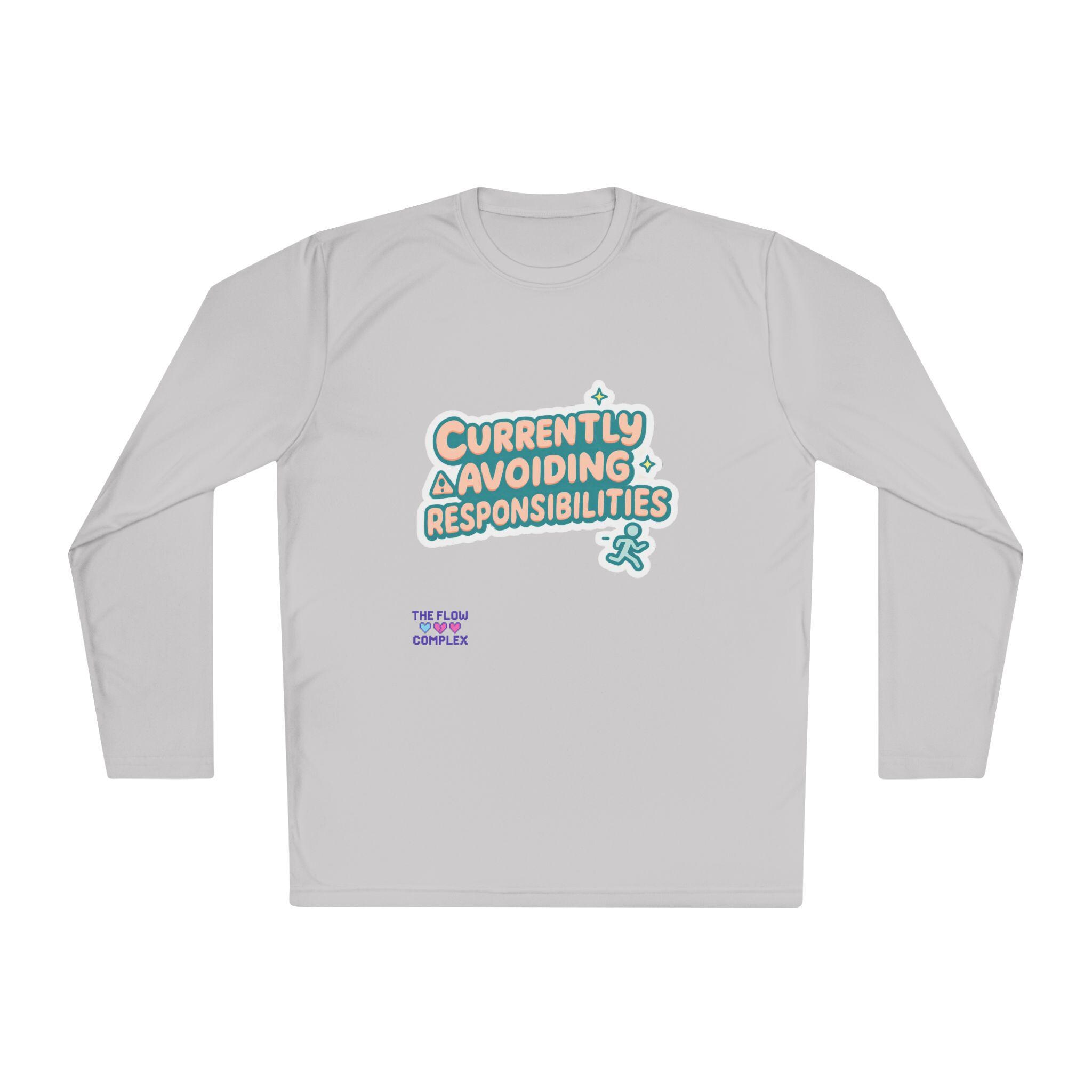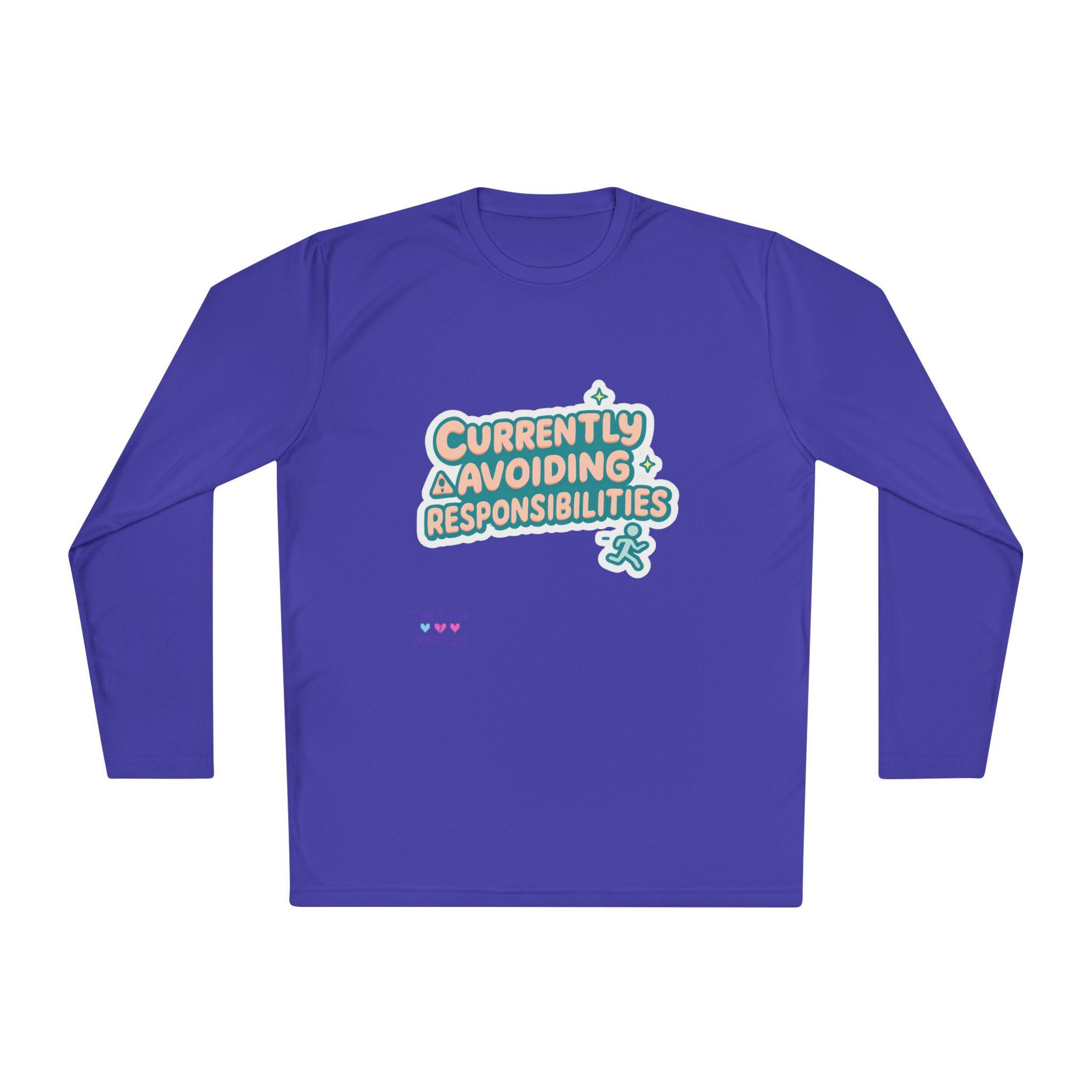 Lightweight long sleeve made for days when you’d rather dodge emails than answer them. The graphic reads “Currently Avoiding Responsibilities” in playful, rounded lettering with tiny stars and a small running figure—bright, tongue-in-cheek, and quietly rebellious. Wear it when you need breathable coverage for a walk, a lazy weekend at home, or a low-key hangout where comfort and a wink of personality matter. The athletic cut keeps the silhouette clean while the extra-light, moisture-wicking polyester moves with you and dries fast. Soft to the touch and finished with a tear-away label, this shirt keeps the focus on relaxed motion and easygoing humor.