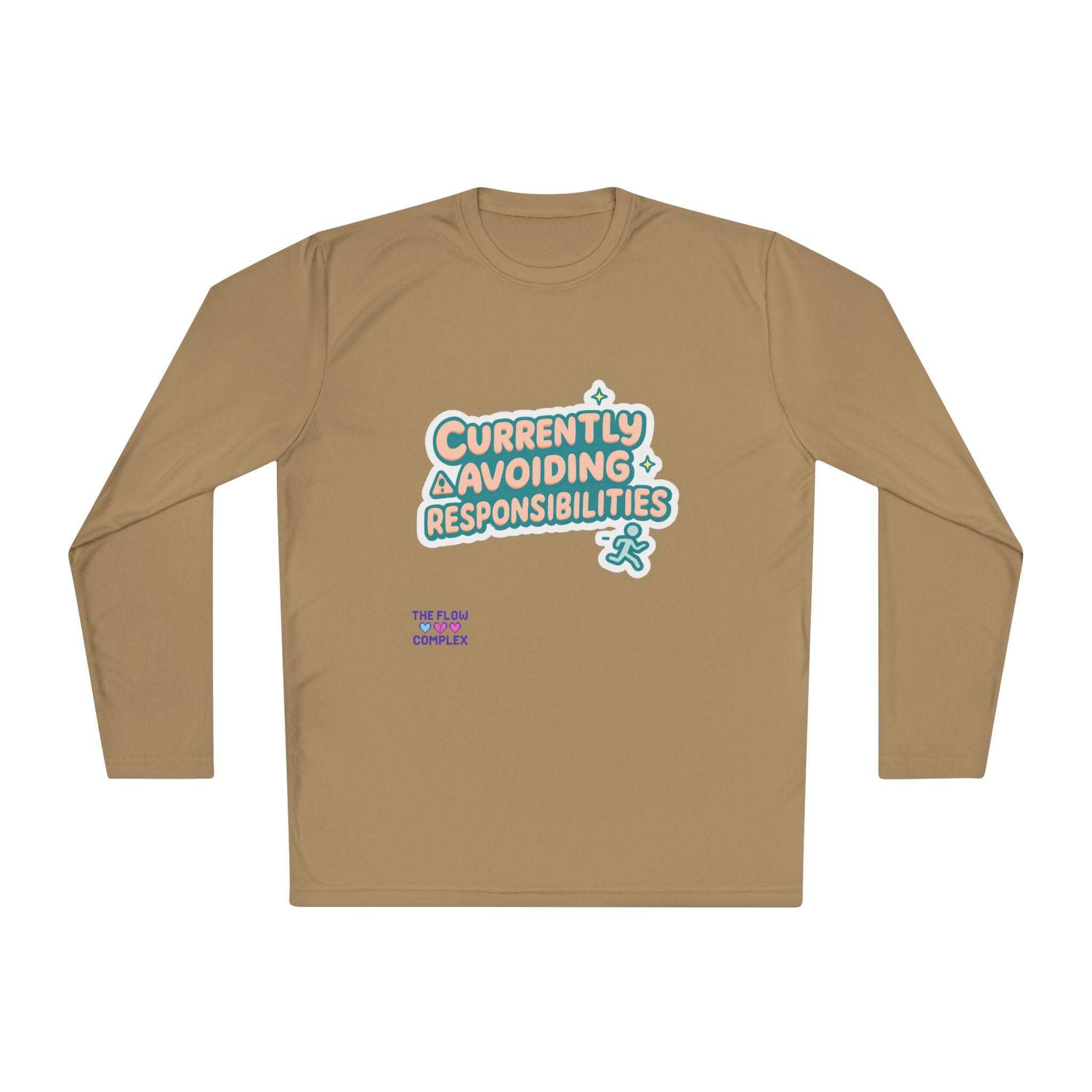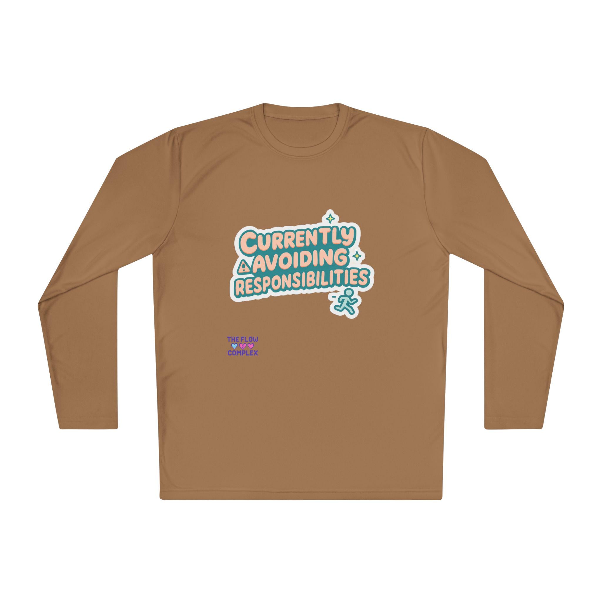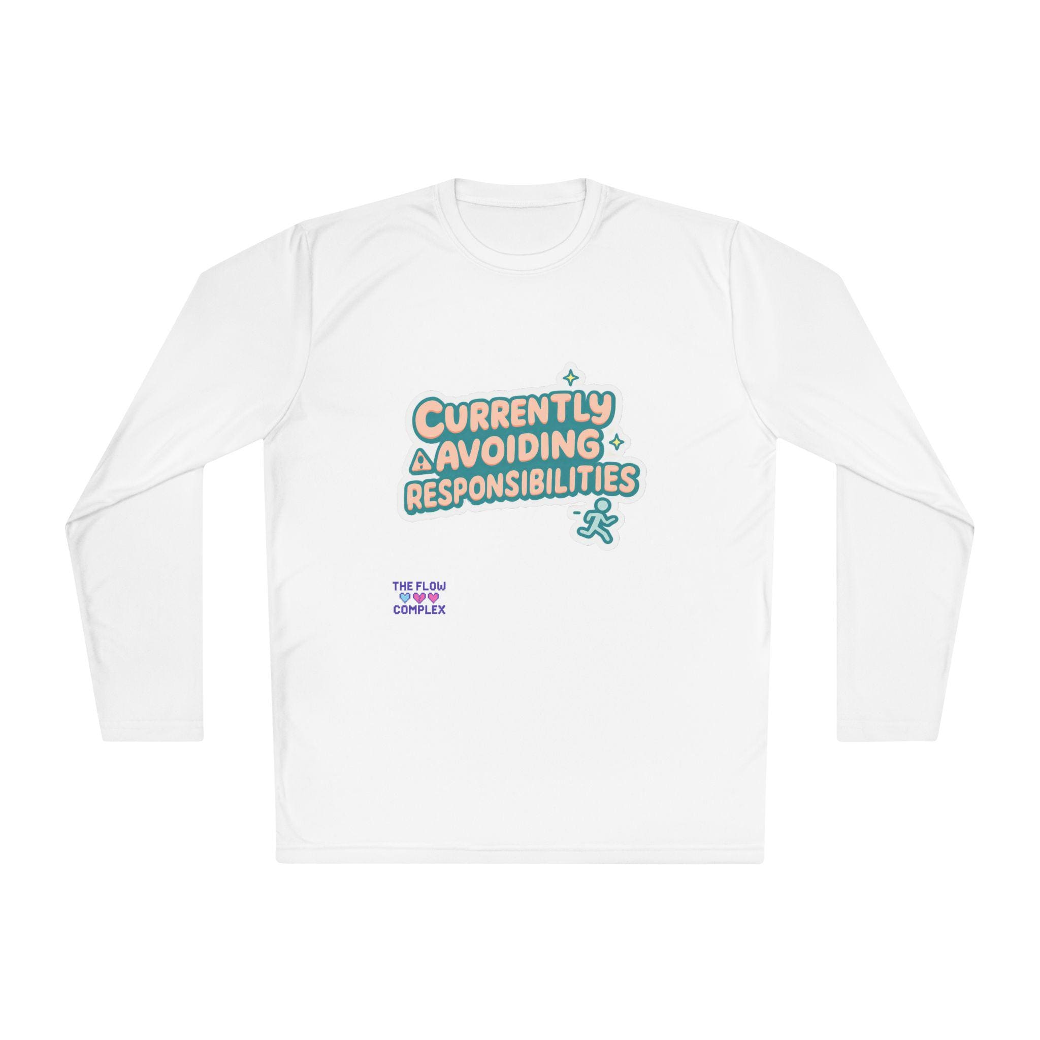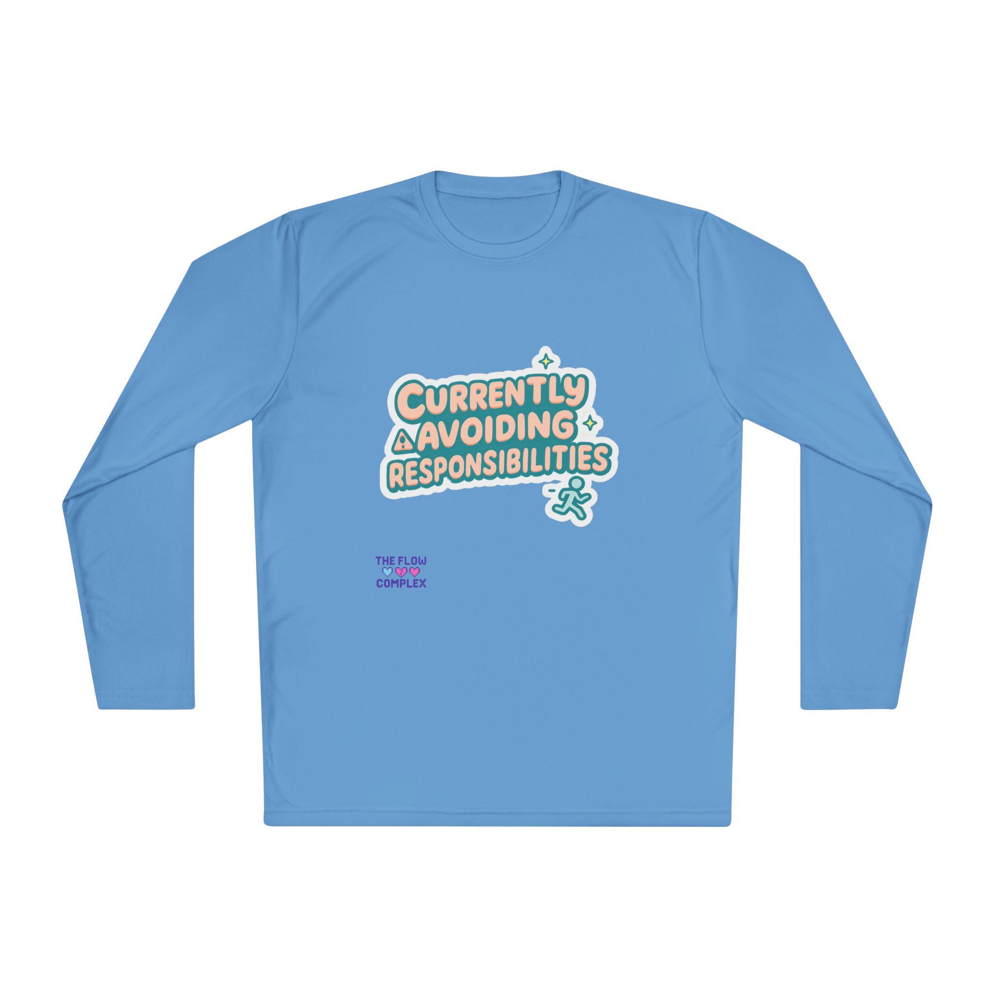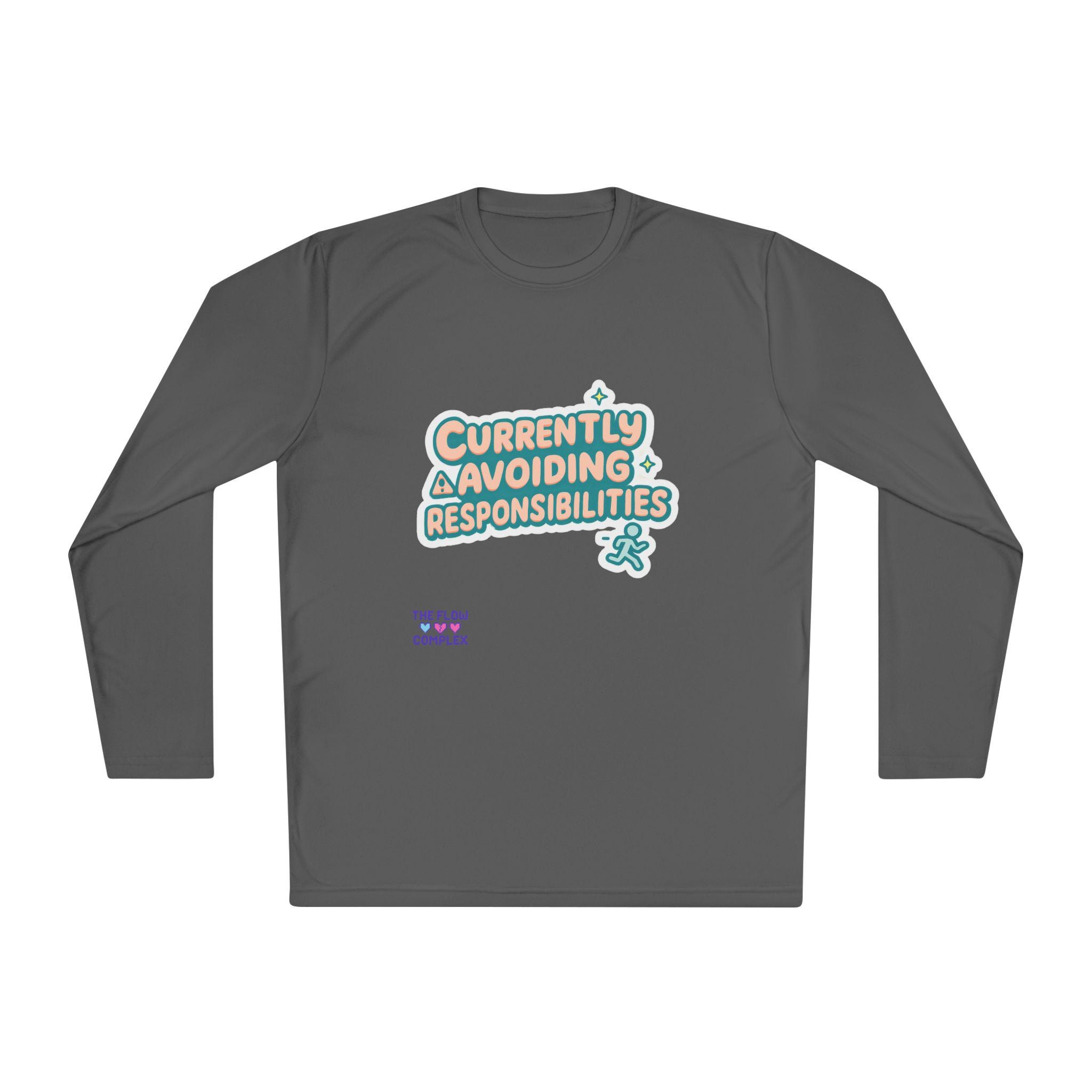Lightweight long sleeve made for days when you’d rather dodge emails than answer them. The graphic reads “Currently Avoiding Responsibilities” in playful, rounded lettering with tiny stars and a small running figure—bright, tongue-in-cheek, and quietly rebellious. Wear it when you need breathable coverage for a walk, a lazy weekend at home, or a low-key hangout where comfort and a wink of personality matter. The athletic cut keeps the silhouette clean while the extra-light, moisture-wicking polyester moves with you and dries fast. Soft to the touch and finished with a tear-away label, this shirt keeps the focus on relaxed motion and easygoing humor.