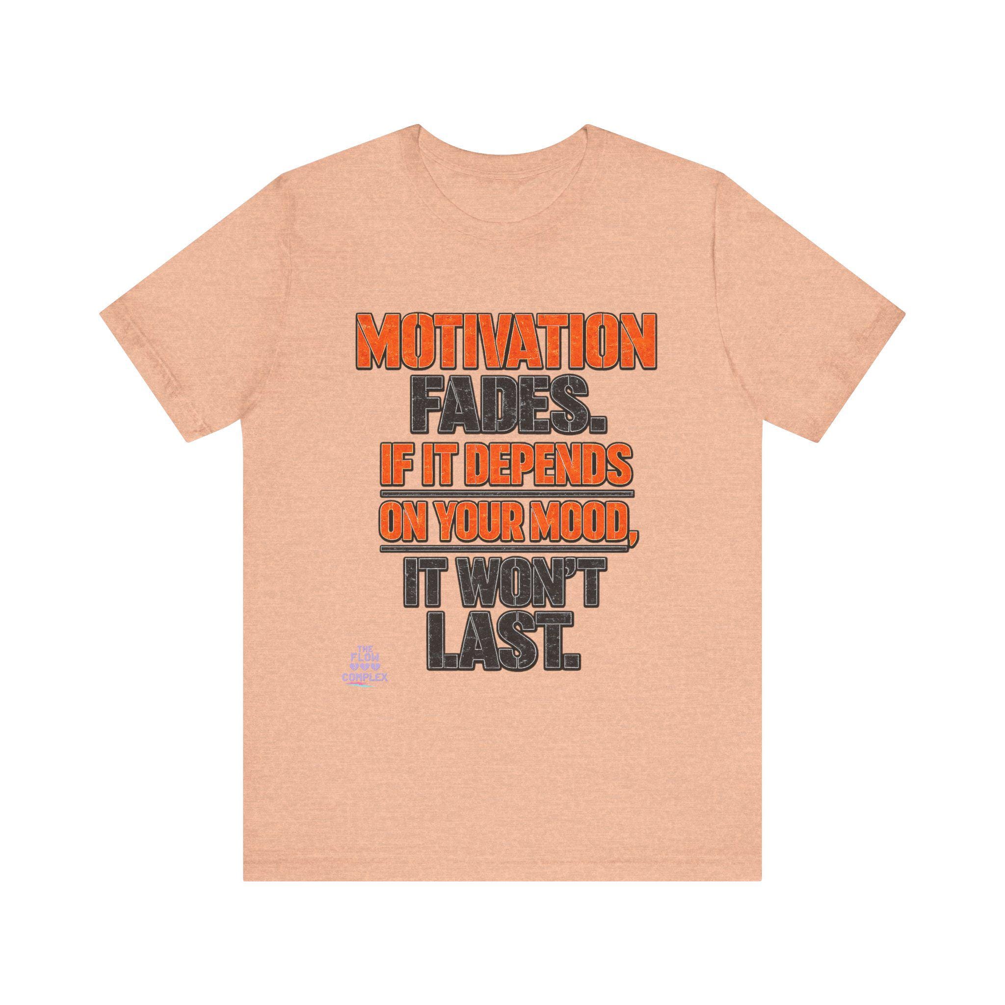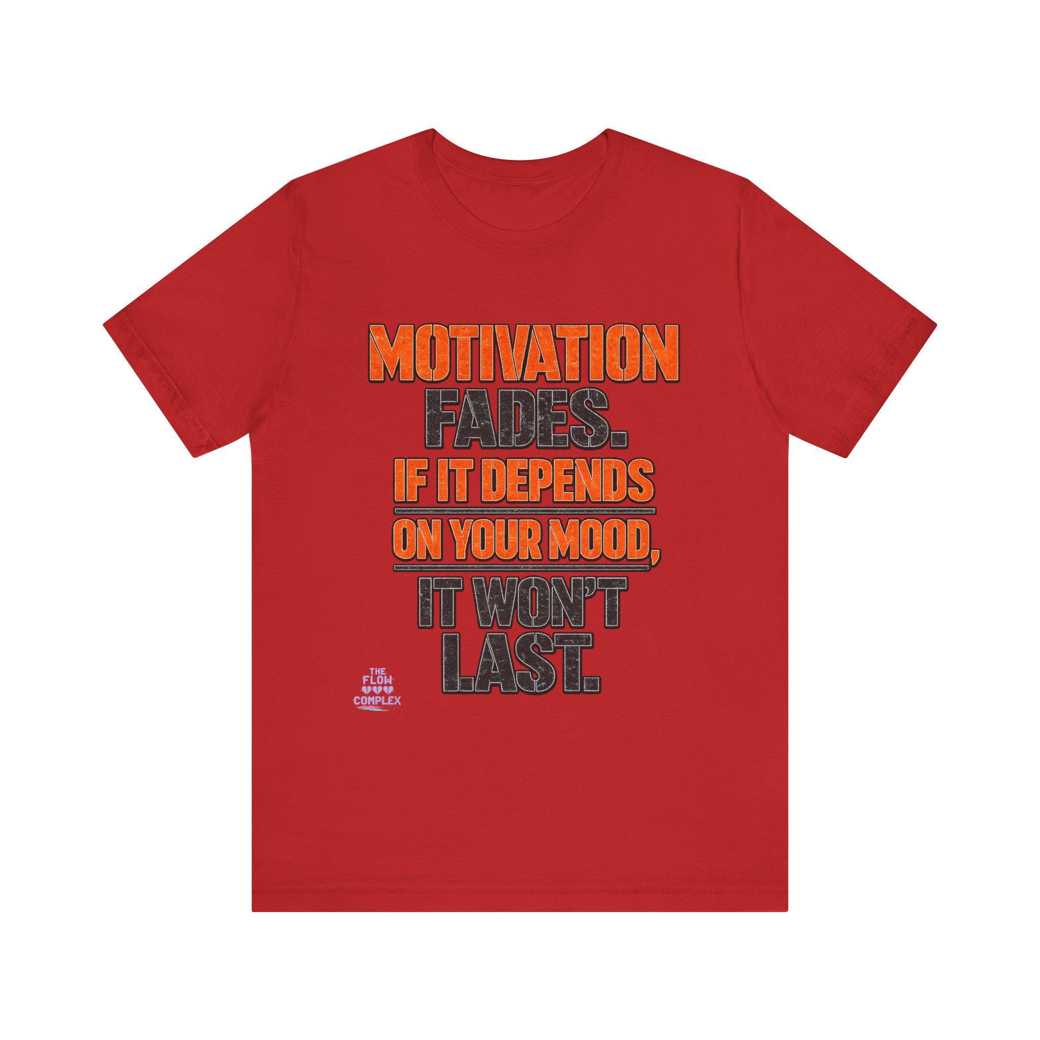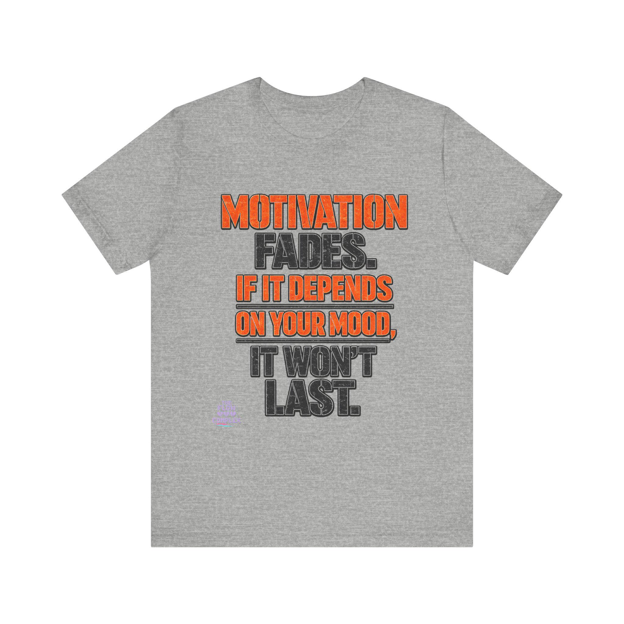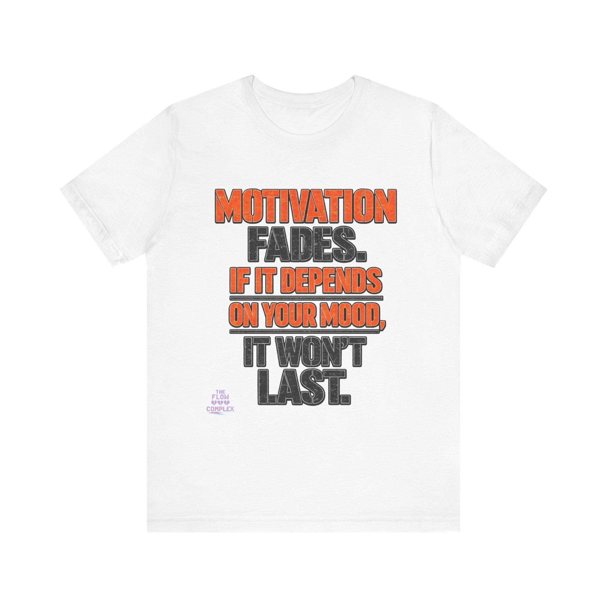 Lightweight, comfortable, and built for movement — this cotton jersey tee speaks plainly: Motivation fades. If it depends on your mood, it won't last. The bold, two-tone block lettering sits centered on a clean white field, the orange callouts drawing the eye to the hard truth while the charcoal base keeps the message grounded. Wear it to the gym, over a hoodie on weekend errands, or under a jacket when you need a reminder to rely on habit and discipline instead of fleeting feelings. The soft Airlume combed and ring-spun cotton feels gentle against skin, and the retail cut keeps the silhouette neat without feeling restrictive. Thoughtful details — ribbed knit collar, side seams, shoulder tape, and a tear-away label — add durability and comfort so this tee becomes one of your steady go-tos.
