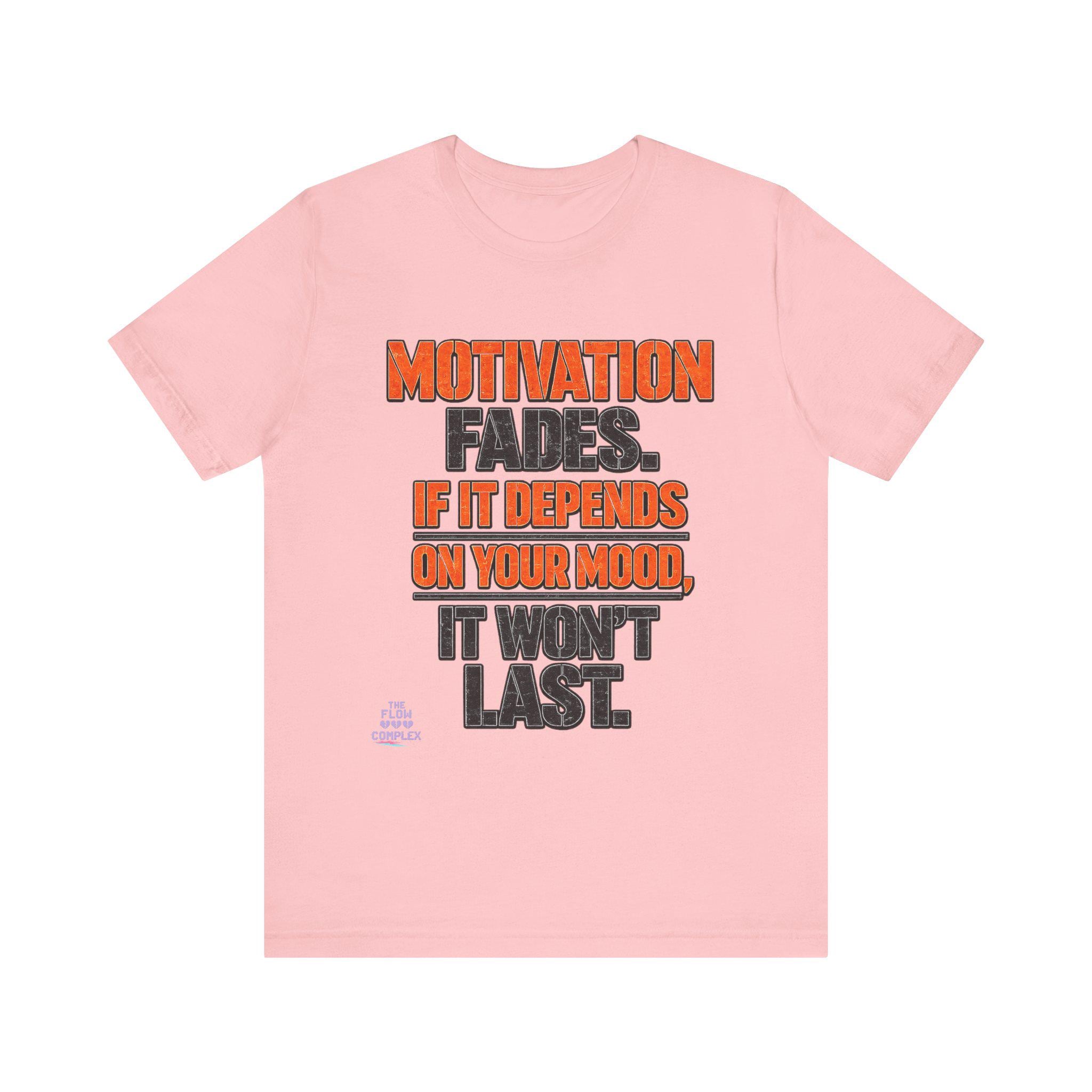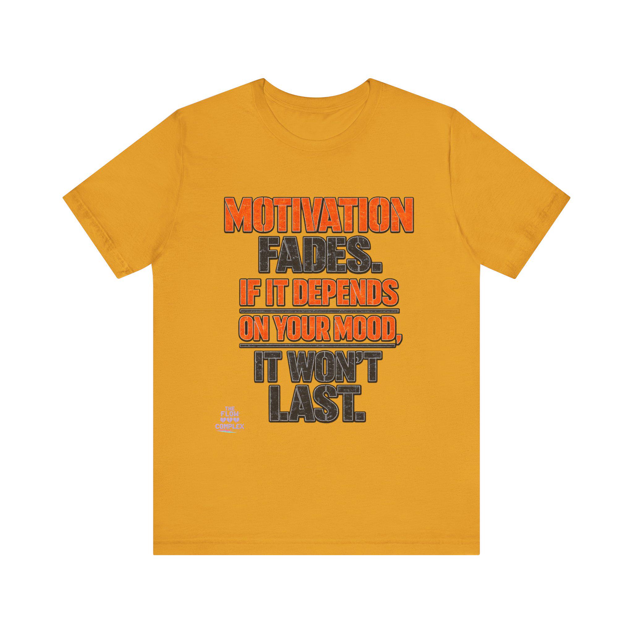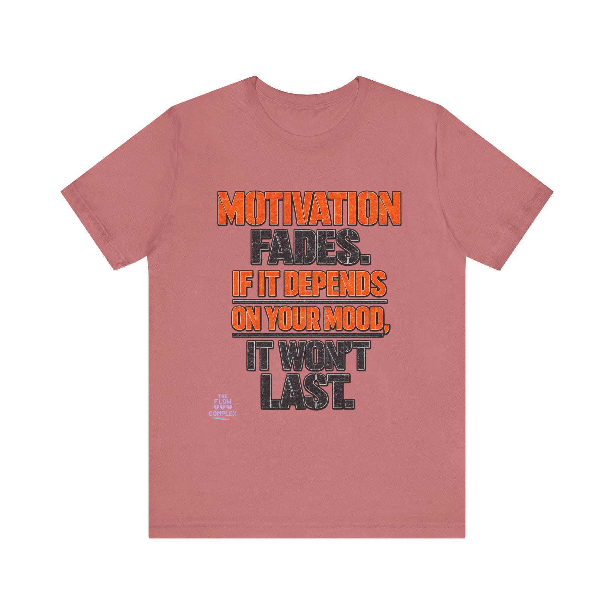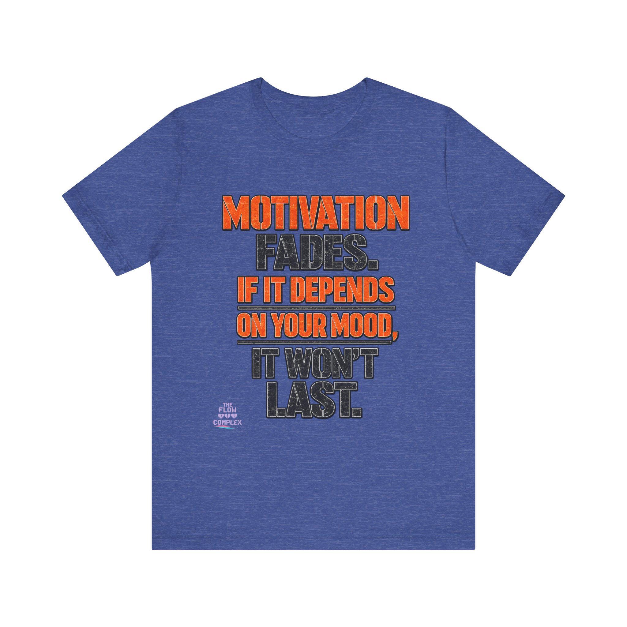 Lightweight, comfortable, and built for movement — this cotton jersey tee speaks plainly: Motivation fades. If it depends on your mood, it won't last. The bold, two-tone block lettering sits centered on a clean white field, the orange callouts drawing the eye to the hard truth while the charcoal base keeps the message grounded. Wear it to the gym, over a hoodie on weekend errands, or under a jacket when you need a reminder to rely on habit and discipline instead of fleeting feelings. The soft Airlume combed and ring-spun cotton feels gentle against skin, and the retail cut keeps the silhouette neat without feeling restrictive. Thoughtful details — ribbed knit collar, side seams, shoulder tape, and a tear-away label — add durability and comfort so this tee becomes one of your steady go-tos.