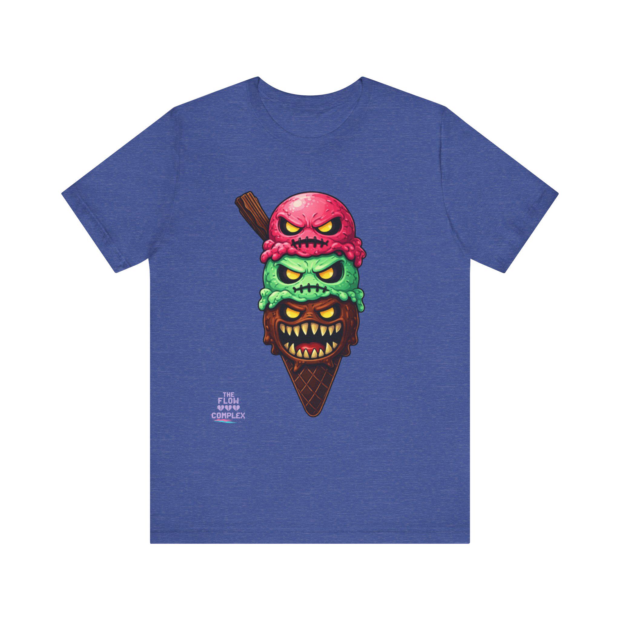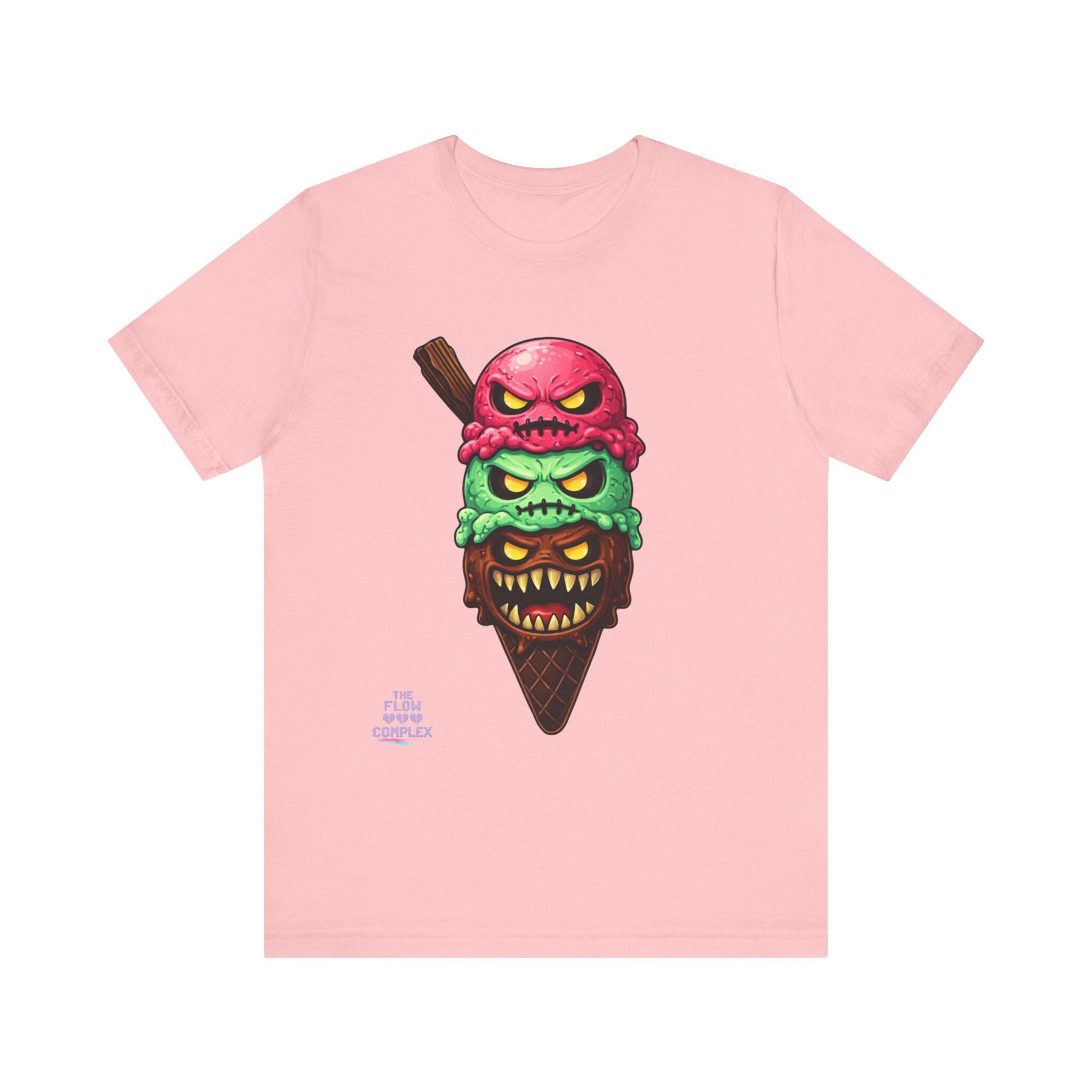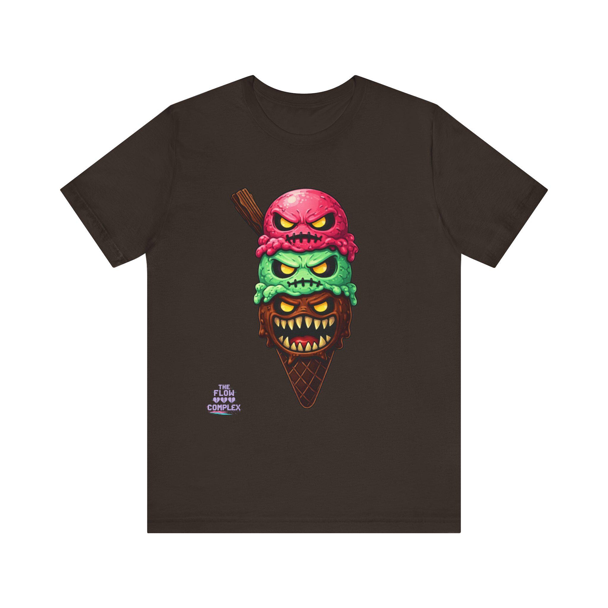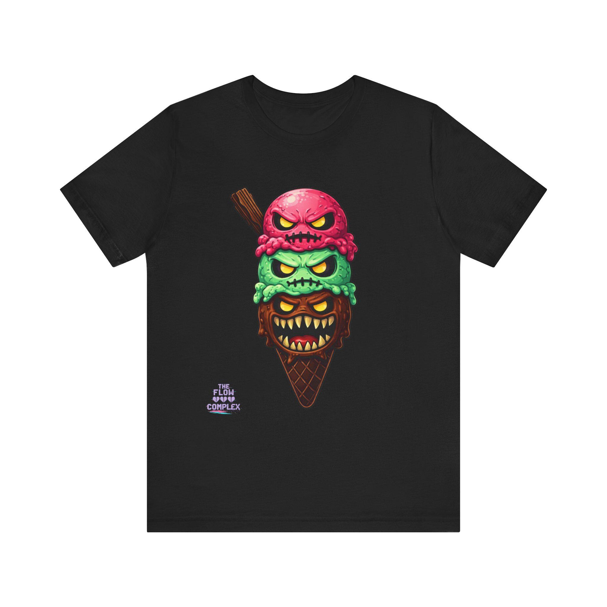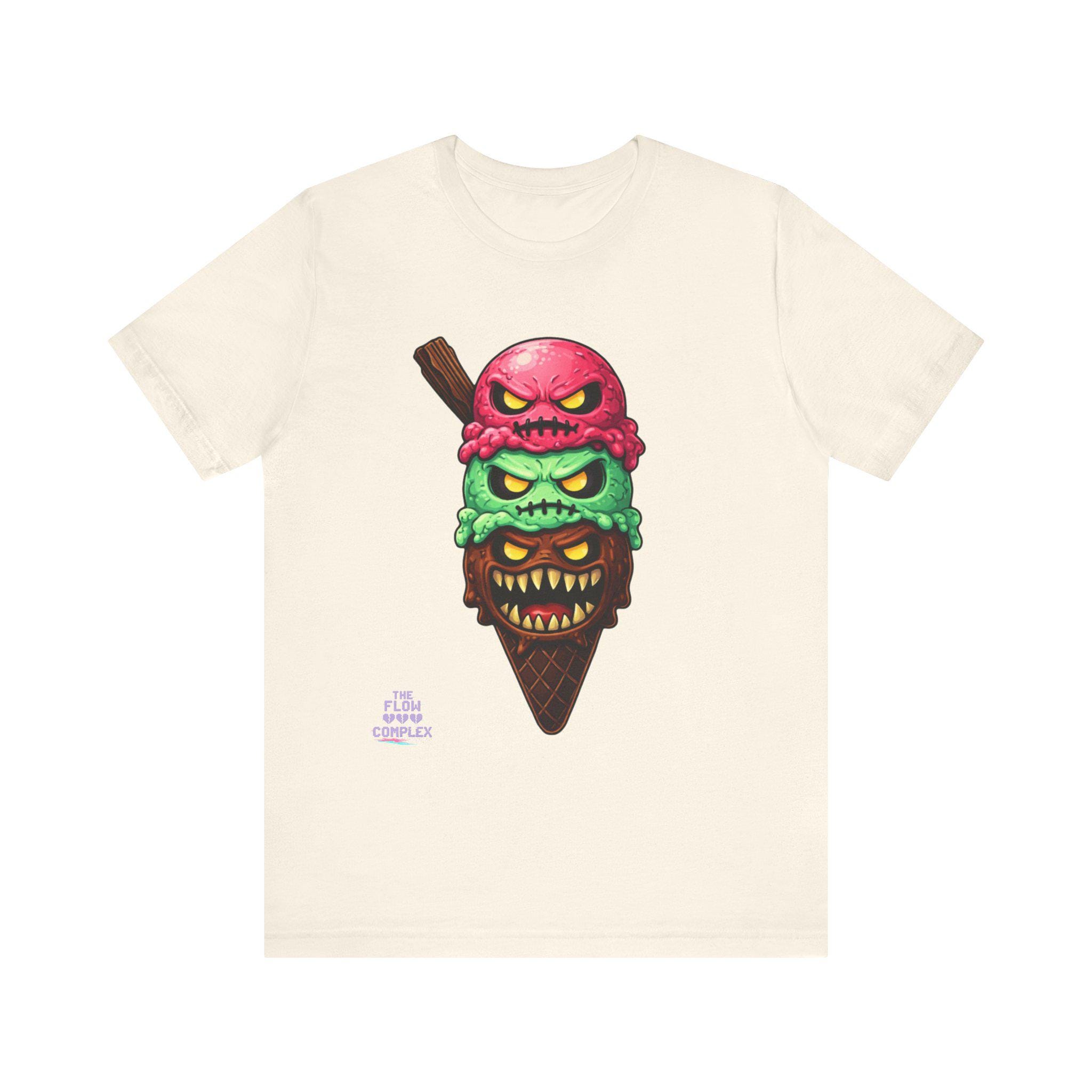 This lightweight crew tee carries a bold, slightly twisted sense of fun. At its center is an illustrated triple-scoop ice cream cone—each scoop a snarling, expressive face stacked over a crunchy waffle cone. The design blends bright, candy-like colors with edgy, comic-horror details, making the shirt feel playful and a little mischievous. Wear it when you want to add humor and attitude to a casual outfit, whether you're out at a late-night show, wandering a summer fair, or meeting friends for coffee. The soft fabric and clean neckline keep the look relaxed and easy to layer under a jacket or over a long-sleeve; the printed label and sleeve details keep the shirt feeling premium yet ready for everyday wear.