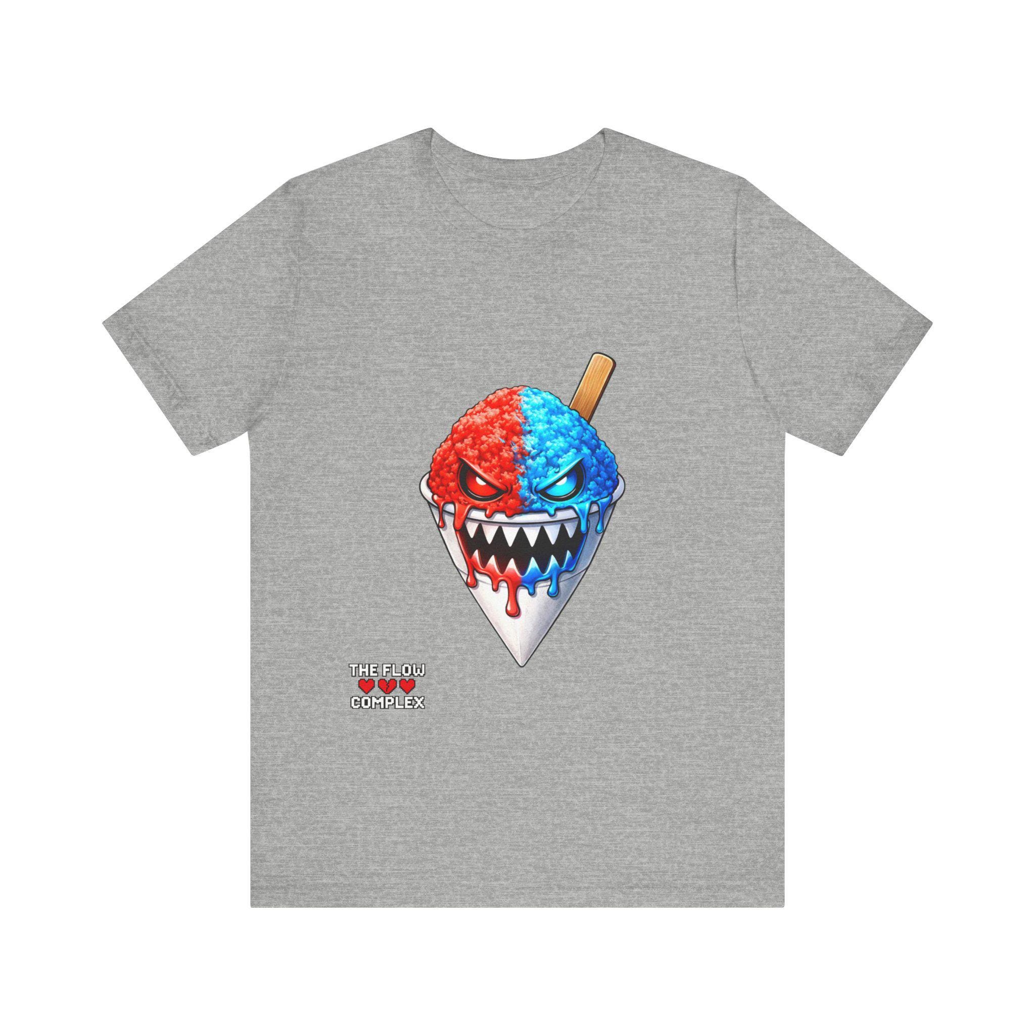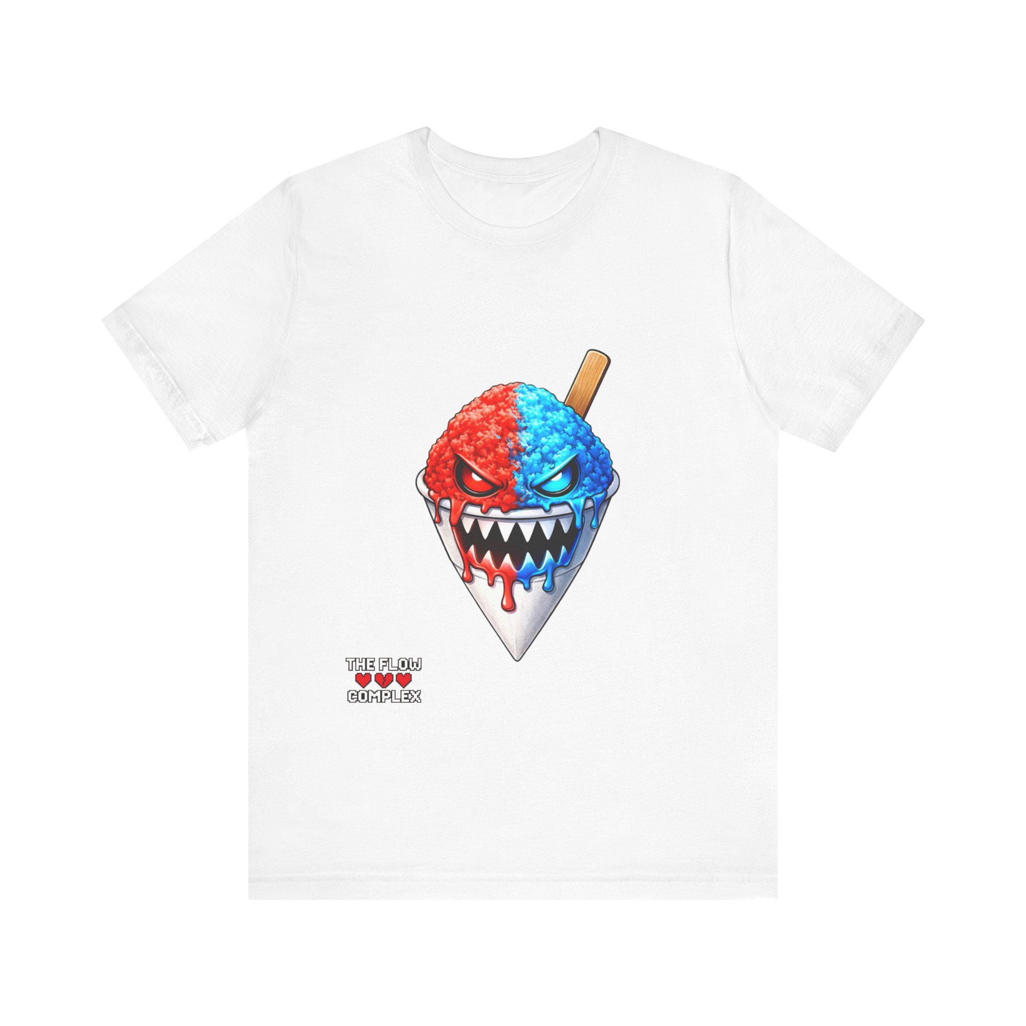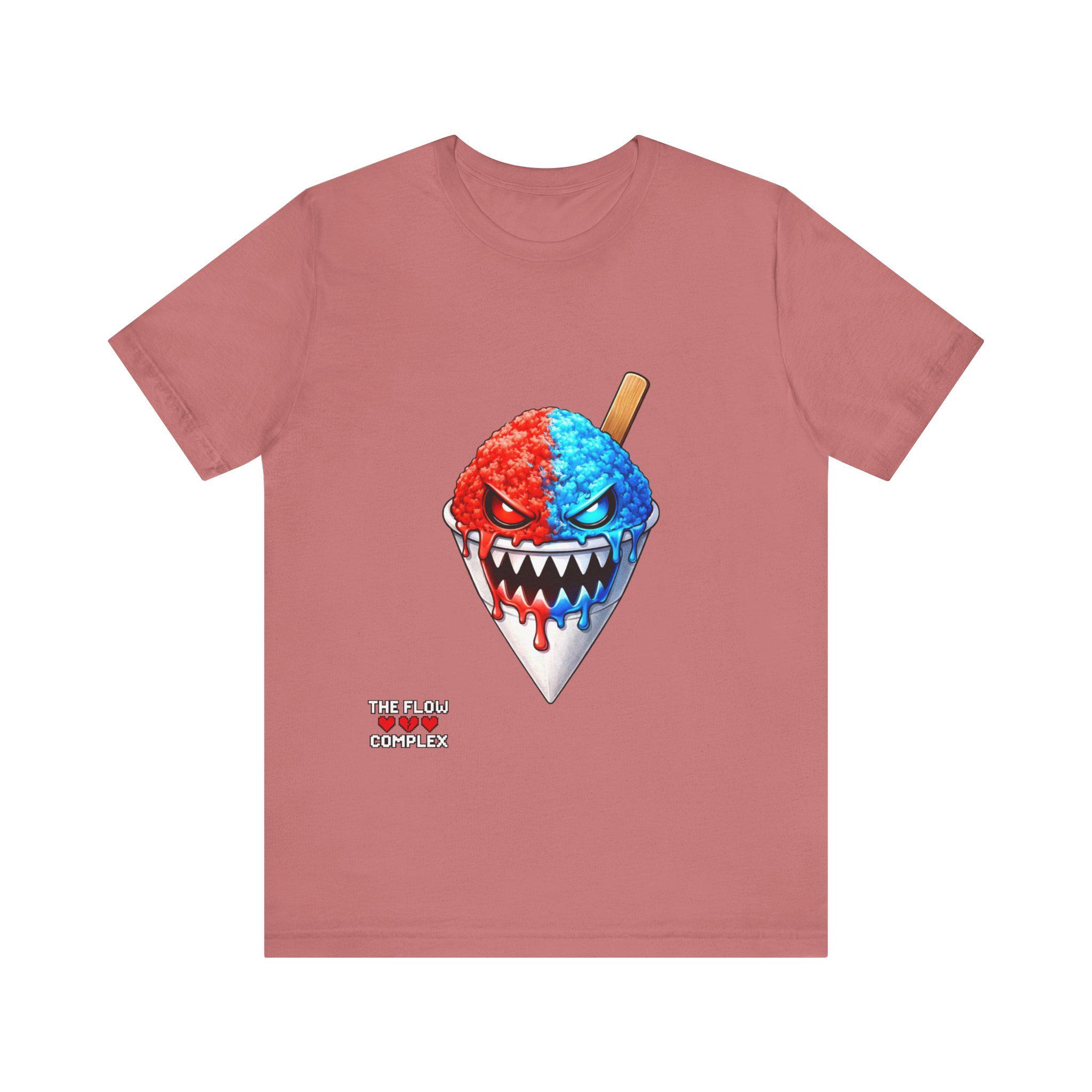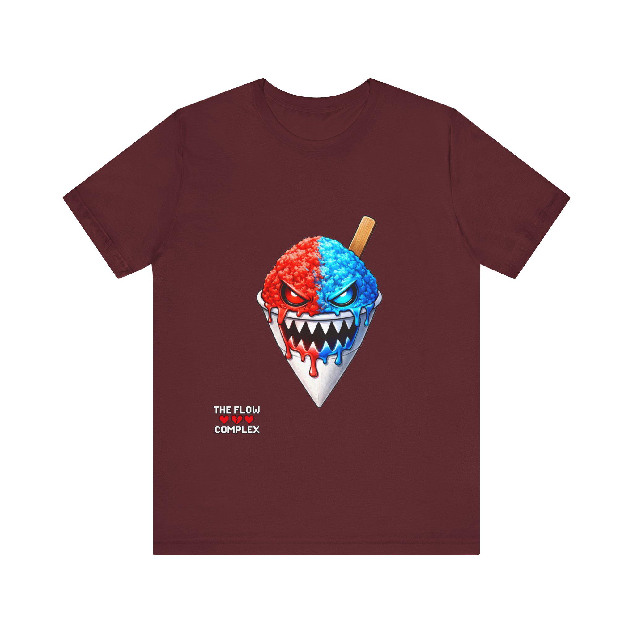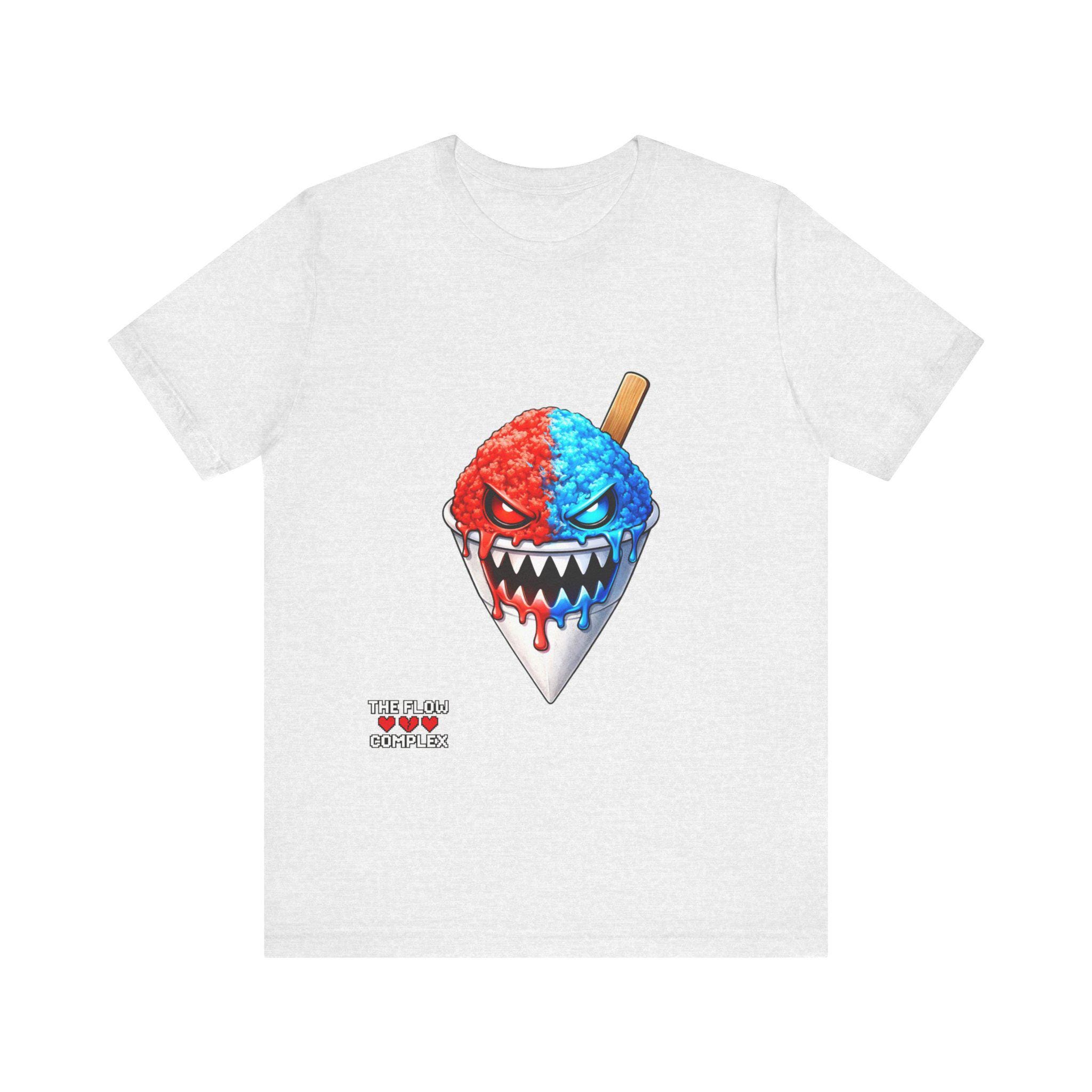 This lightweight jersey tee carries attitude and summer mischief. A bold, hand-drawn snow-cone face — split red and blue with dripping colors and jagged teeth — sits low on the front, giving the shirt a streetwise, skate-punk vibe that still feels playful. Breathable Airlume combed and ring-spun cotton keeps you cool while the retail crew neckline and side seams give structure and a modern silhouette. Wear it under a flannel, with boardshorts, or as your go-to for late-night bonfires when you want something that reads casual but has character. The printed neck and sleeve labels and tear-away tag make it comfortable against the skin, and ethically made construction adds quiet reassurance to an otherwise loud design.