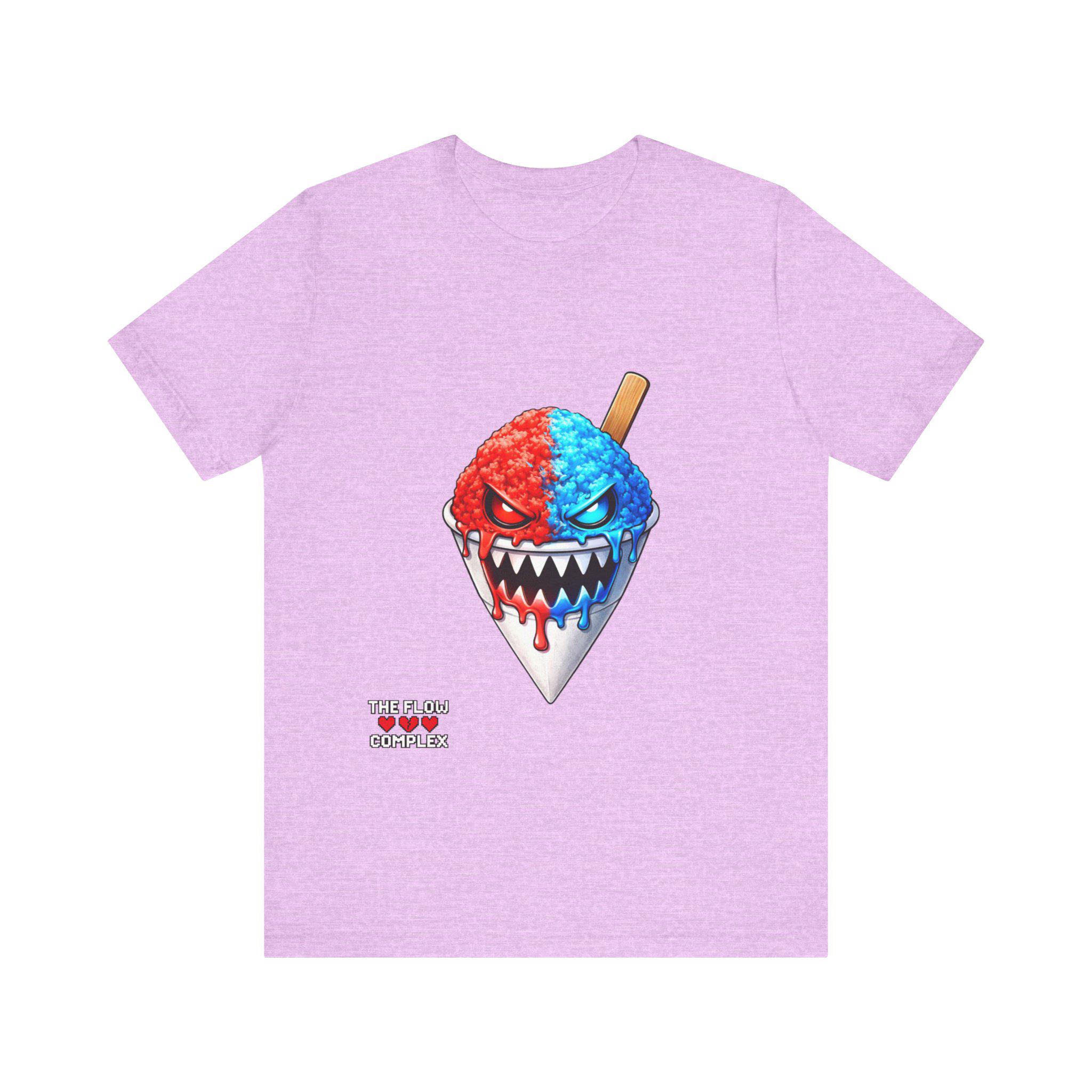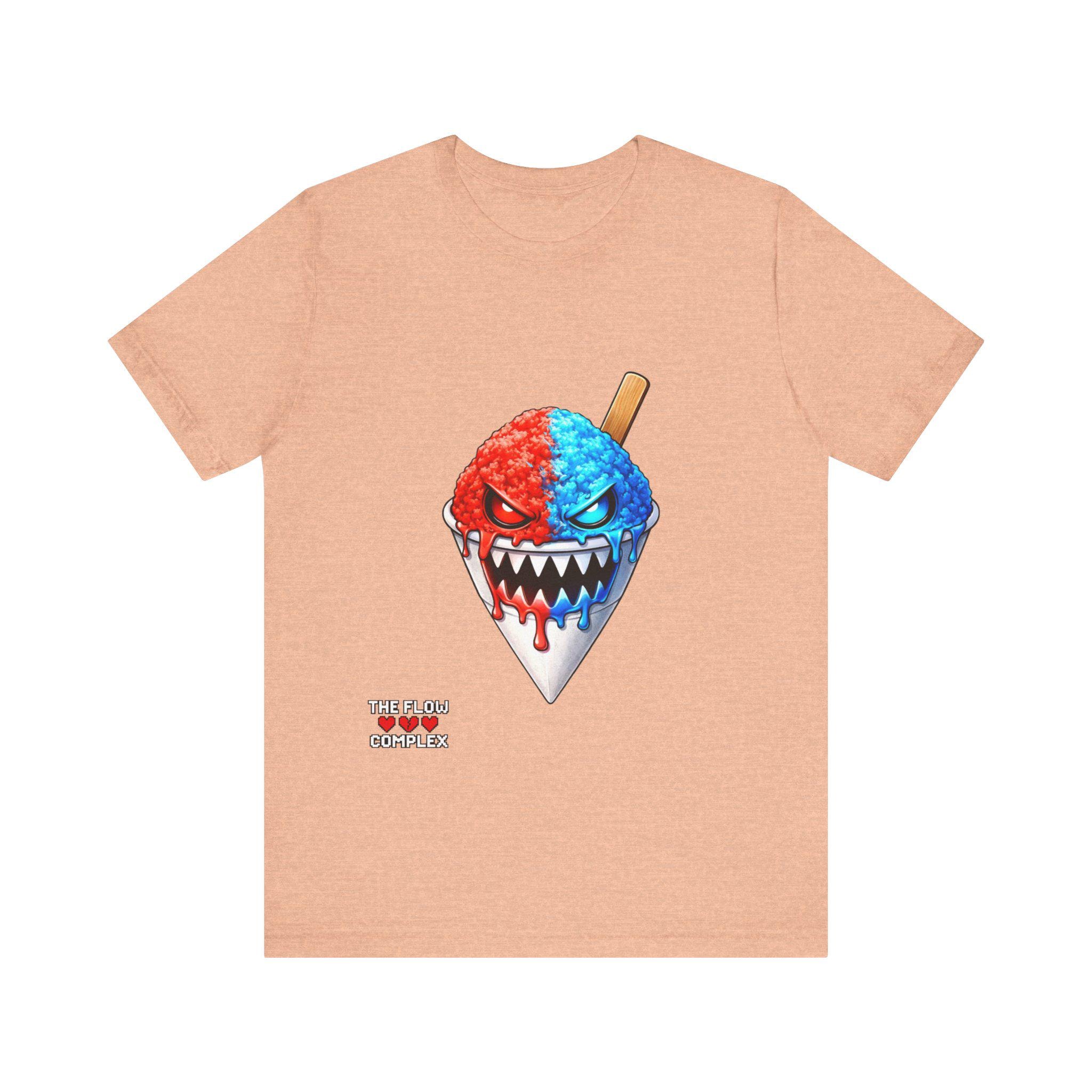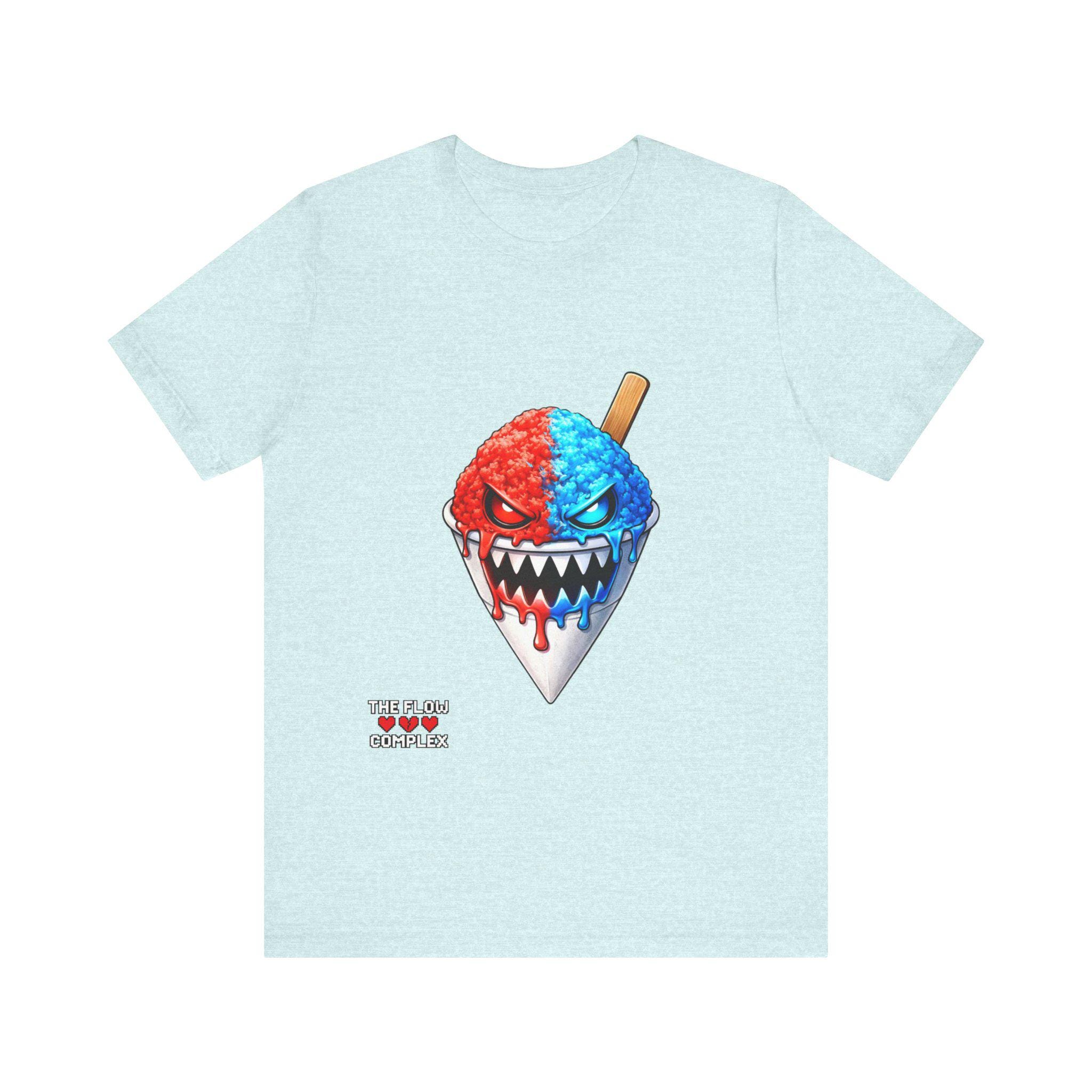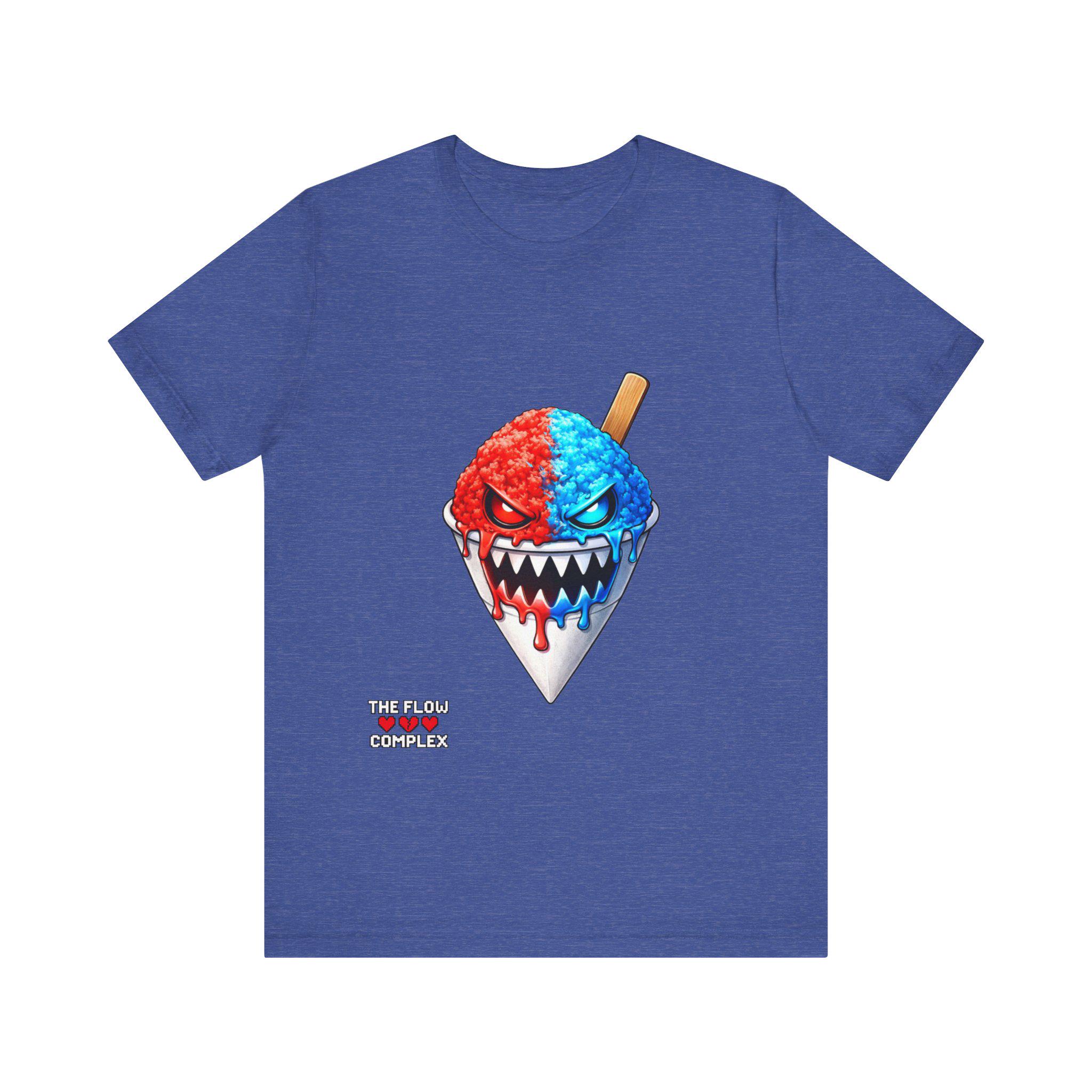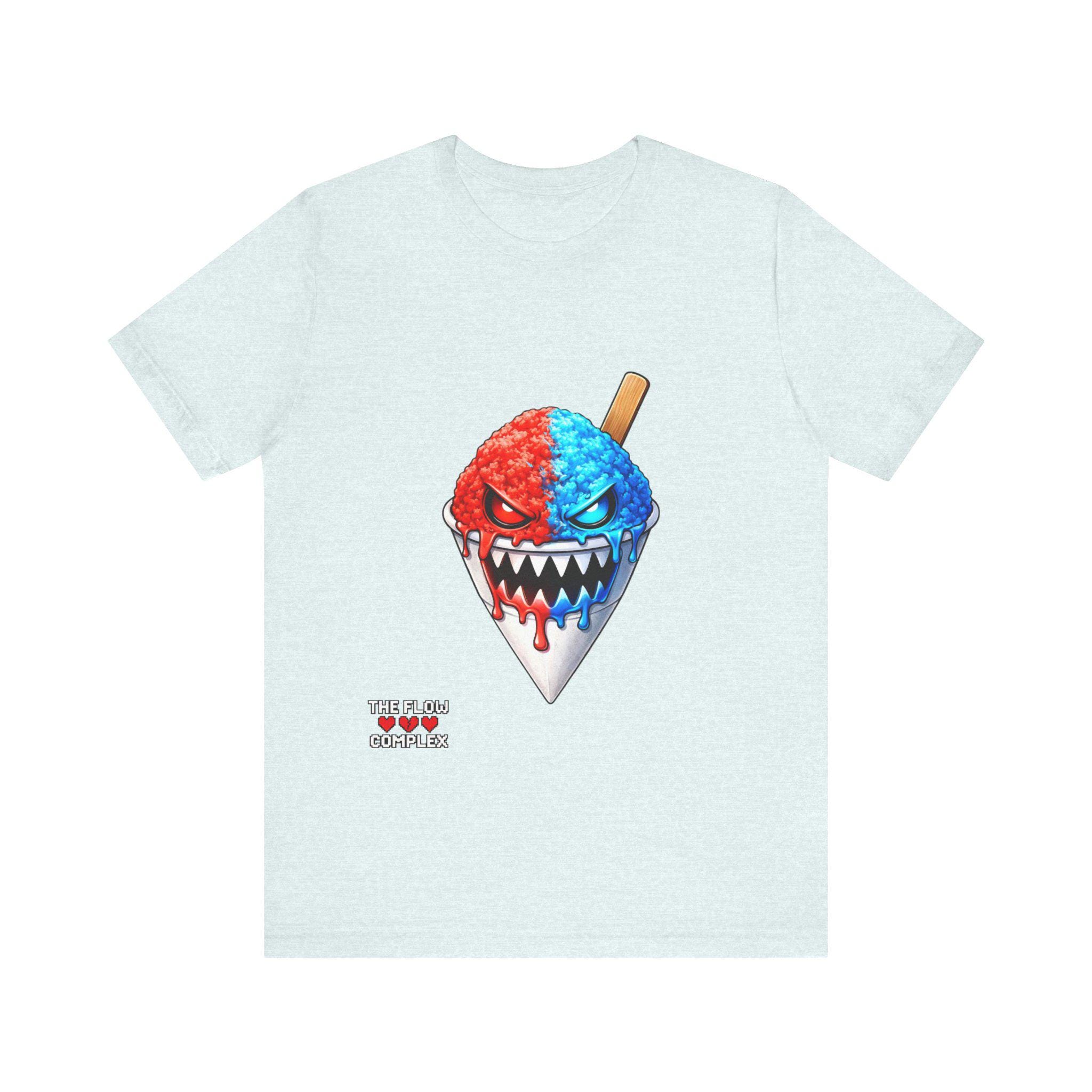 This lightweight jersey tee carries attitude and summer mischief. A bold, hand-drawn snow-cone face — split red and blue with dripping colors and jagged teeth — sits low on the front, giving the shirt a streetwise, skate-punk vibe that still feels playful. Breathable Airlume combed and ring-spun cotton keeps you cool while the retail crew neckline and side seams give structure and a modern silhouette. Wear it under a flannel, with boardshorts, or as your go-to for late-night bonfires when you want something that reads casual but has character. The printed neck and sleeve labels and tear-away tag make it comfortable against the skin, and ethically made construction adds quiet reassurance to an otherwise loud design.