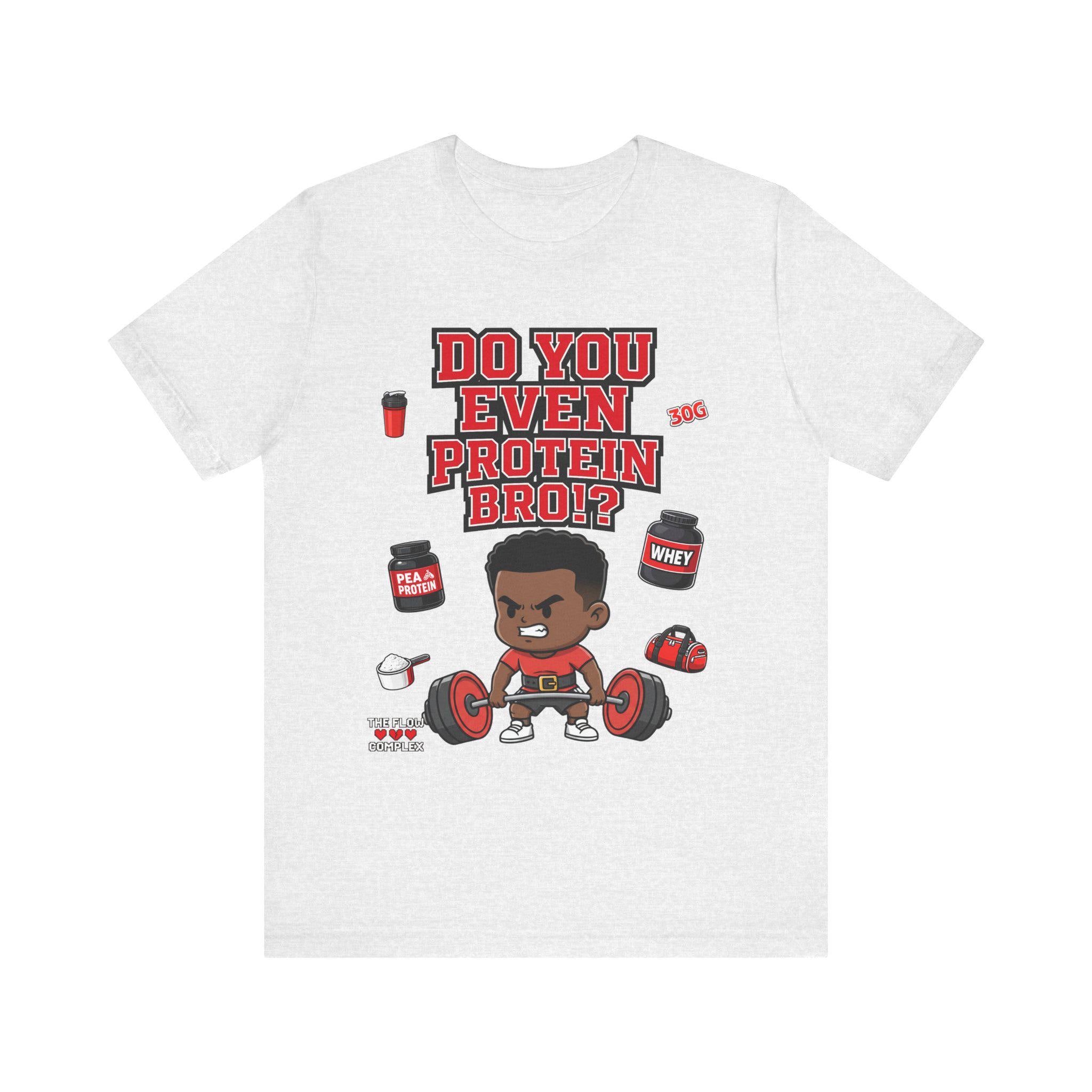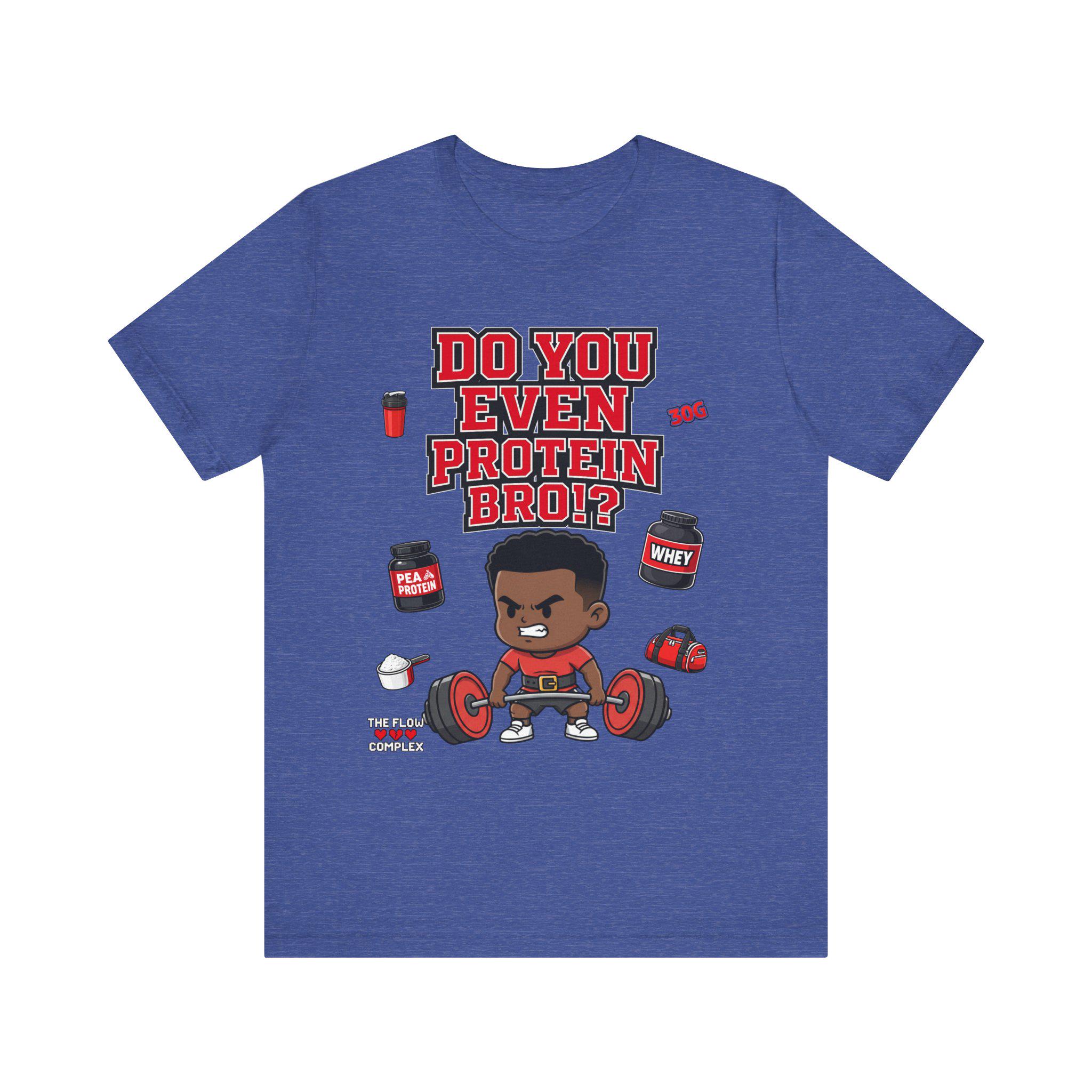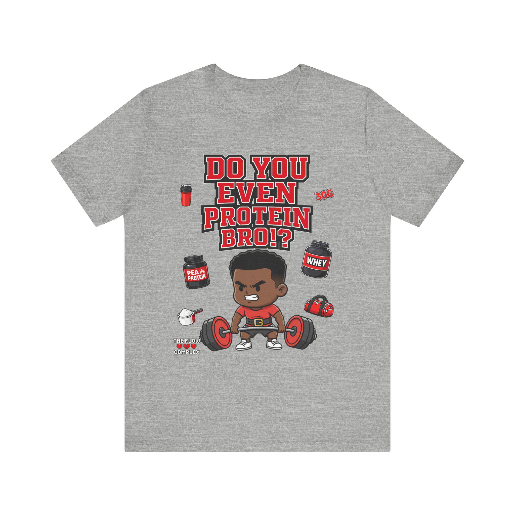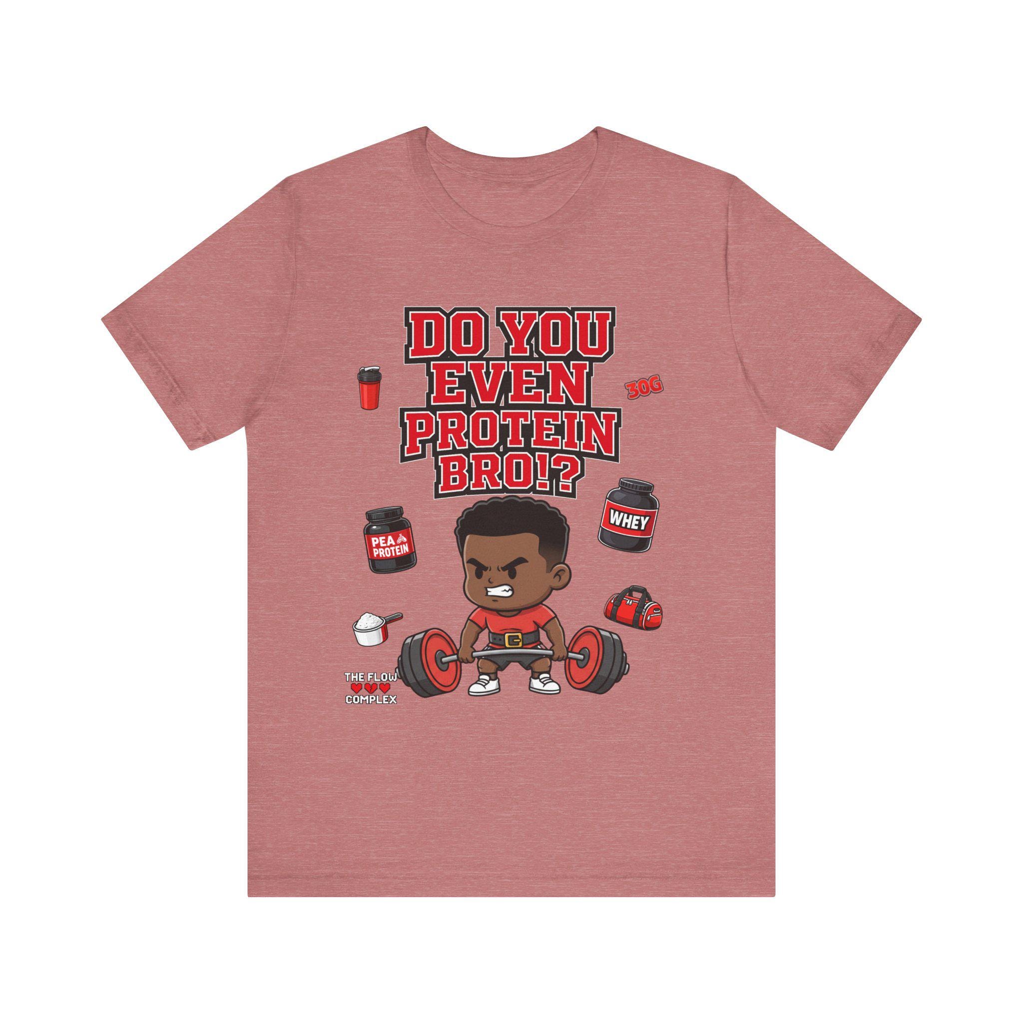 Lightweight, breathable, and built for movement—this tee brings gym humor into everyday wear. A bold, cartoon lifter stands mid-deadlift beneath the cheeky headline “DO YOU EVEN PROTEIN BRO?” surrounded by shaker cups, protein tubs, and gym accessories. The soft Airlume combed cotton feels smooth against skin and drapes cleanly for casual layering. Wear it to warm-ups, quick runs to the supplement shop, or lounging after a heavy session; it reads like an inside joke among training partners and sparks smiles from fellow lifters.