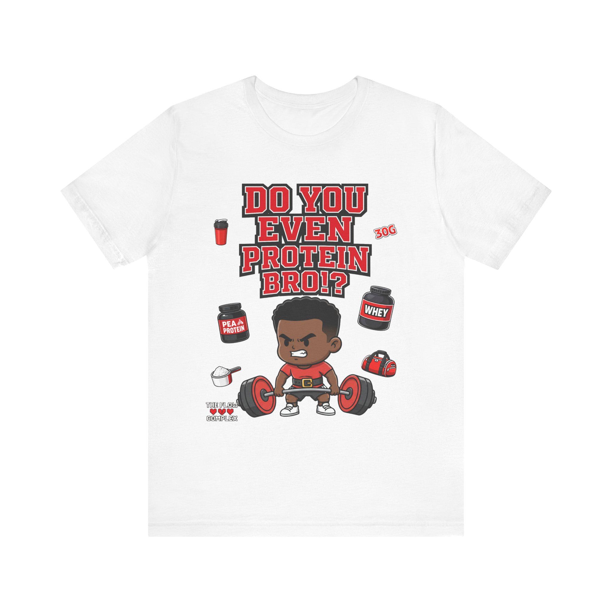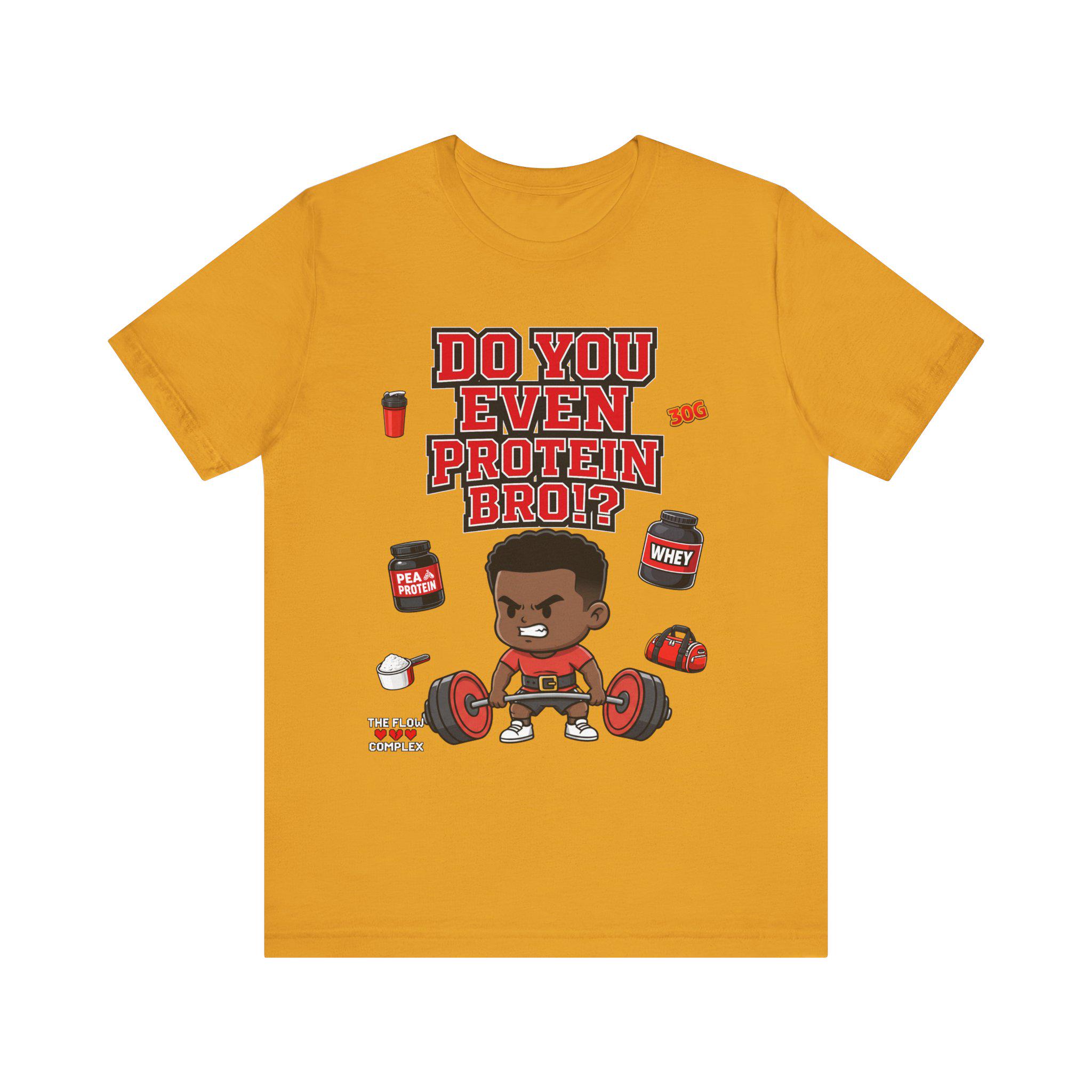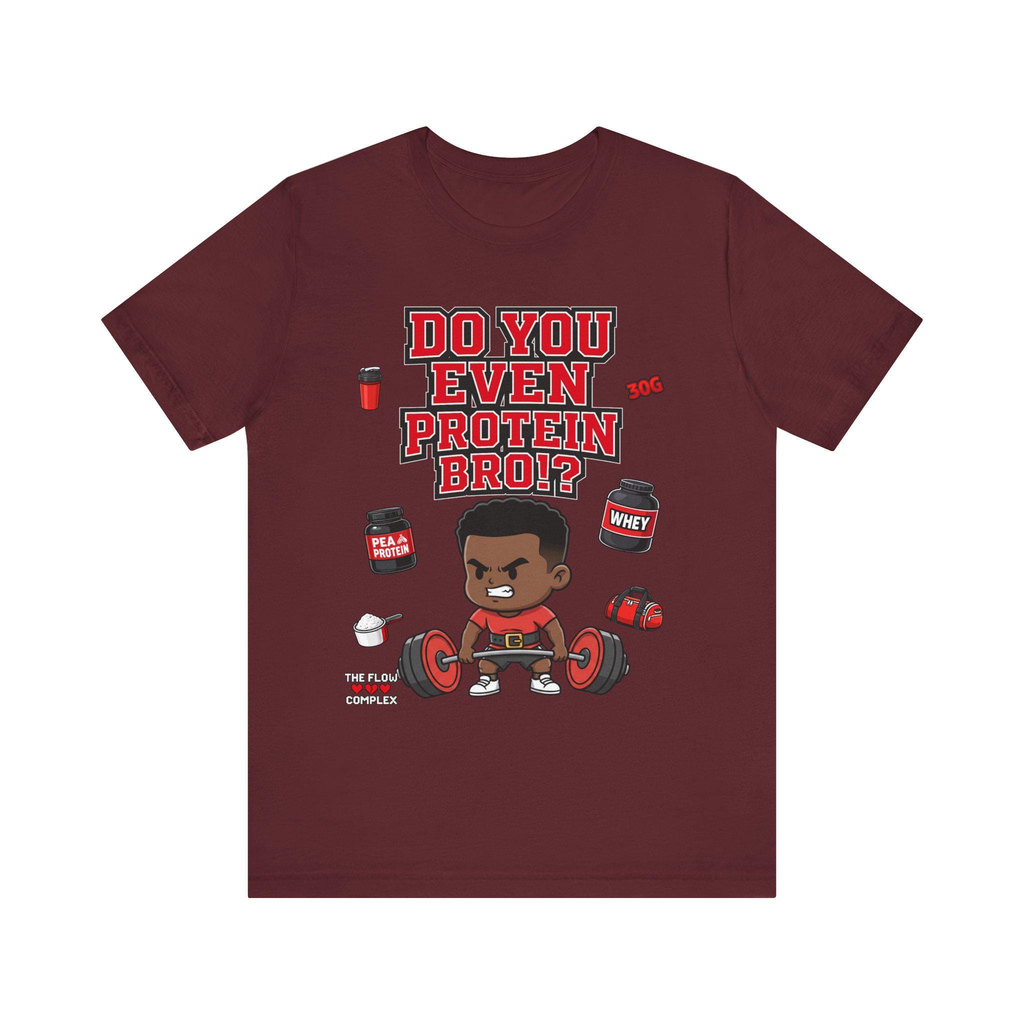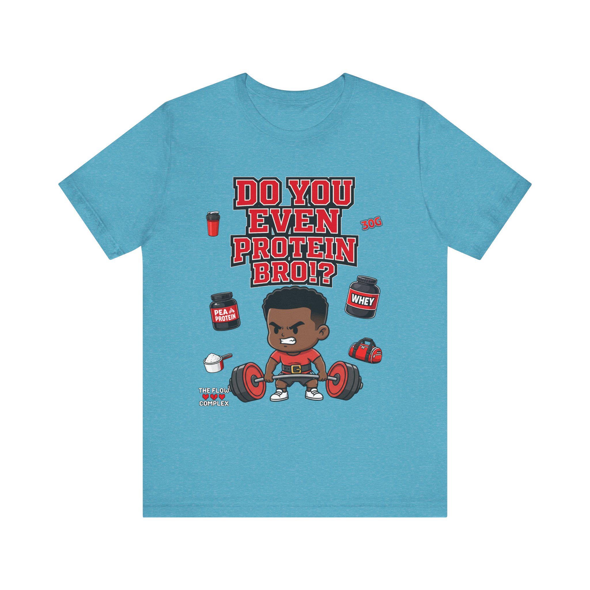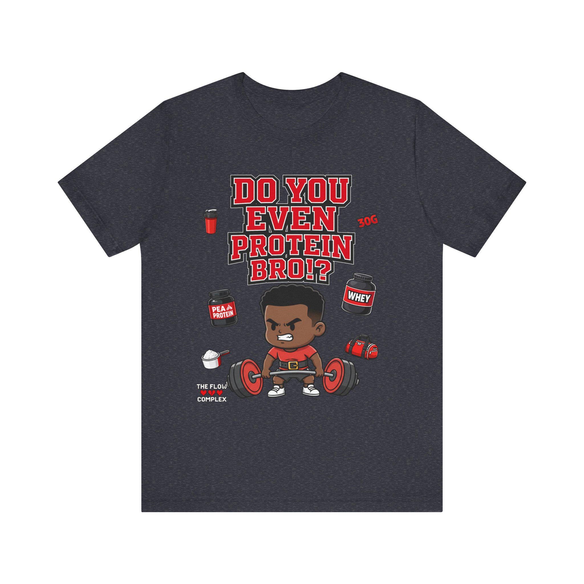 Lightweight, breathable, and built for movement—this tee brings gym humor into everyday wear. A bold, cartoon lifter stands mid-deadlift beneath the cheeky headline “DO YOU EVEN PROTEIN BRO?” surrounded by shaker cups, protein tubs, and gym accessories. The soft Airlume combed cotton feels smooth against skin and drapes cleanly for casual layering. Wear it to warm-ups, quick runs to the supplement shop, or lounging after a heavy session; it reads like an inside joke among training partners and sparks smiles from fellow lifters.