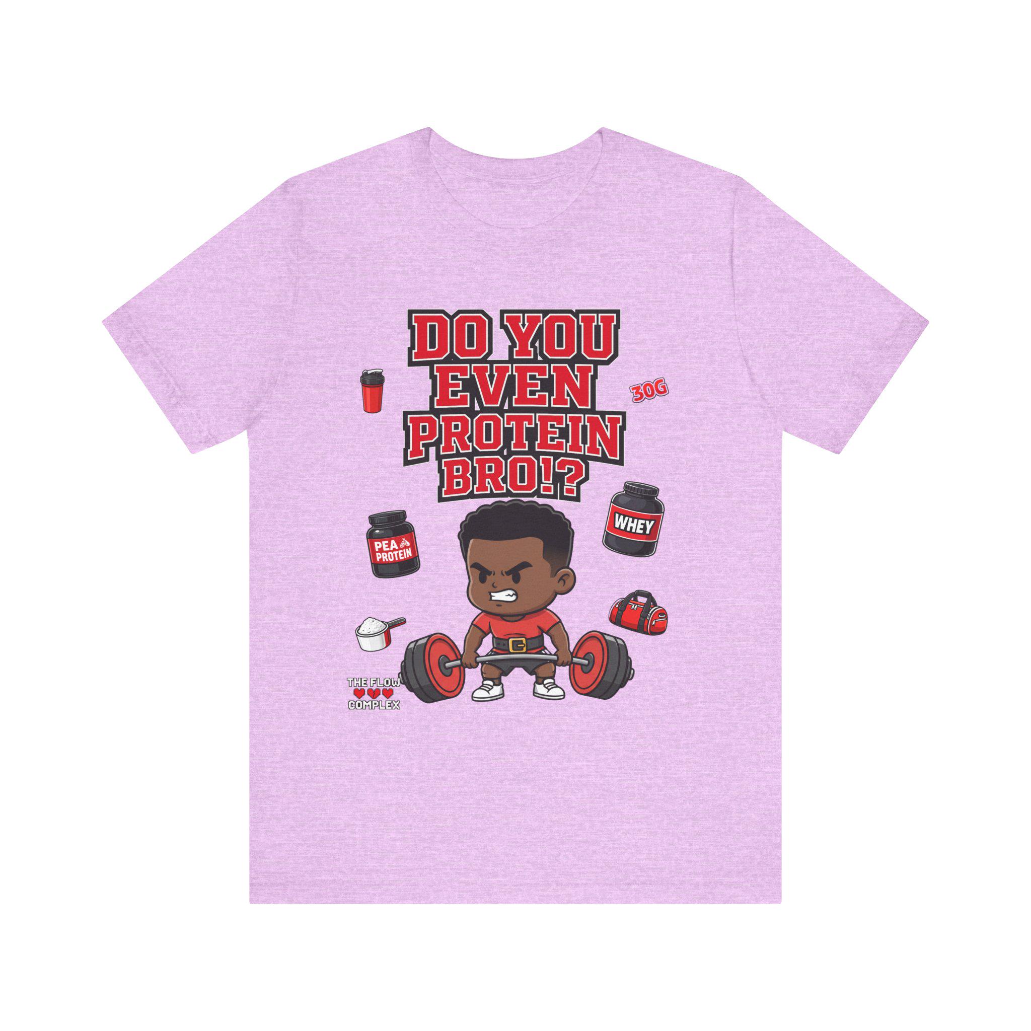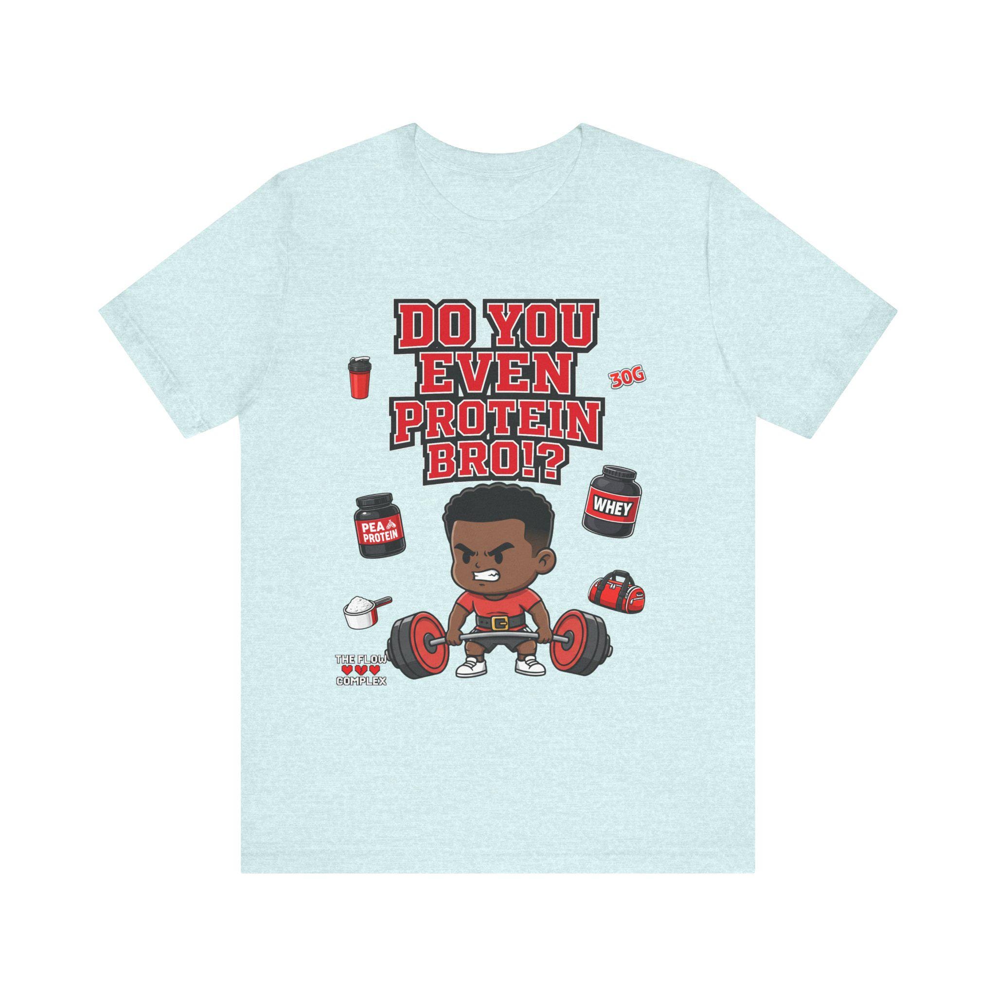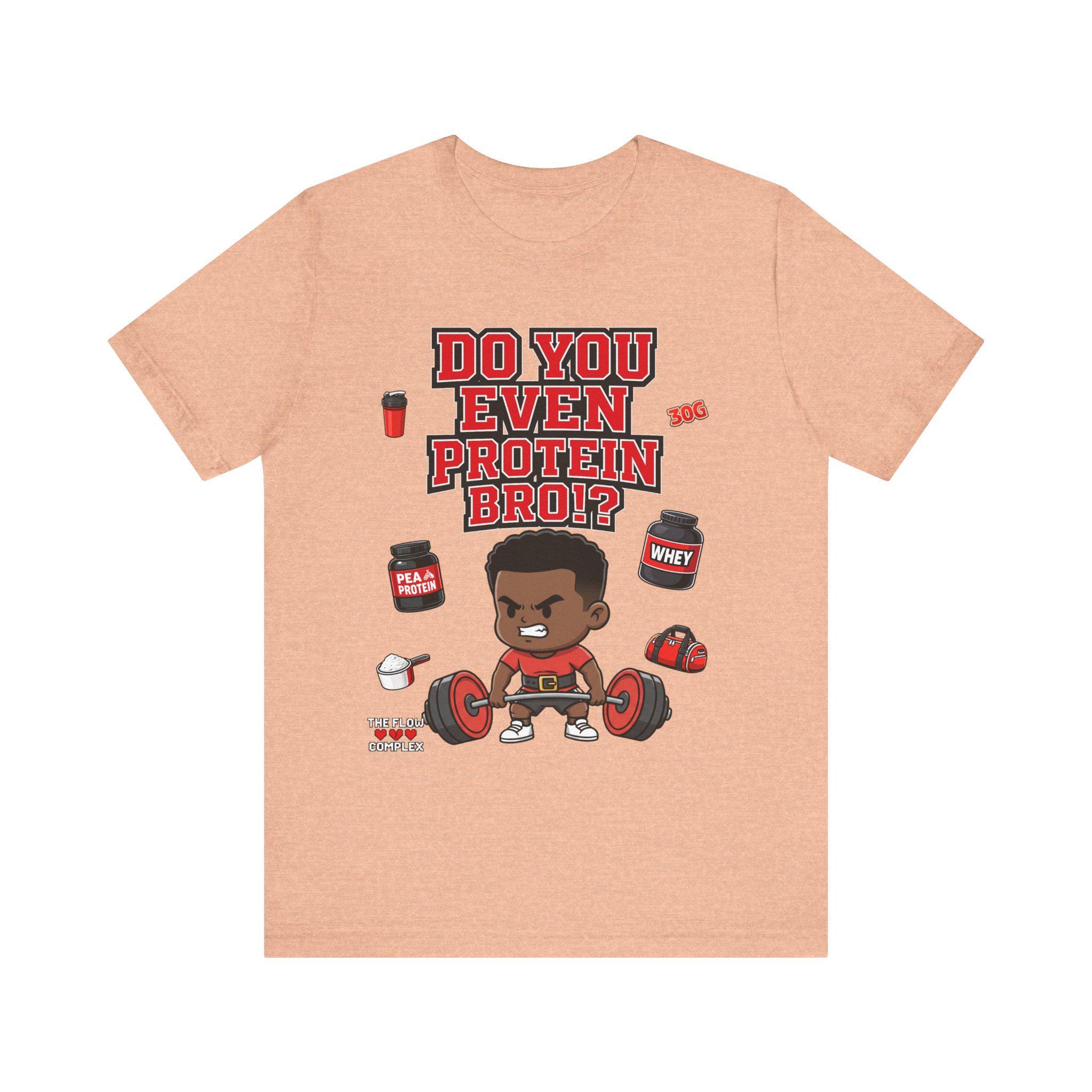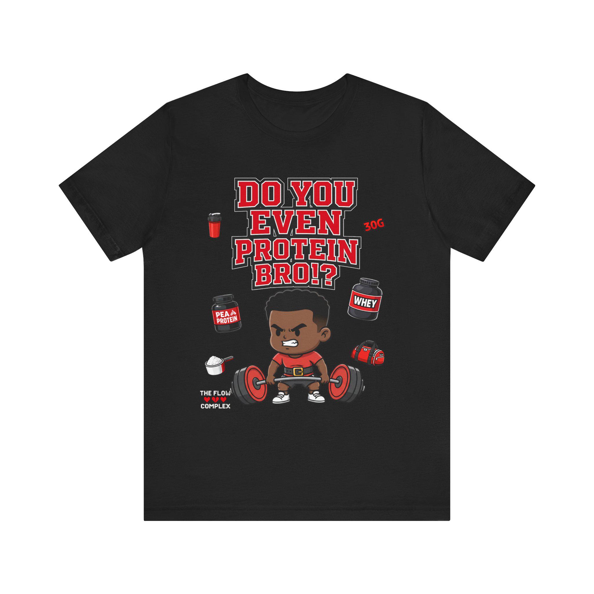 Lightweight, breathable, and built for movement—this tee brings gym humor into everyday wear. A bold, cartoon lifter stands mid-deadlift beneath the cheeky headline “DO YOU EVEN PROTEIN BRO?” surrounded by shaker cups, protein tubs, and gym accessories. The soft Airlume combed cotton feels smooth against skin and drapes cleanly for casual layering. Wear it to warm-ups, quick runs to the supplement shop, or lounging after a heavy session; it reads like an inside joke among training partners and sparks smiles from fellow lifters.